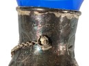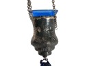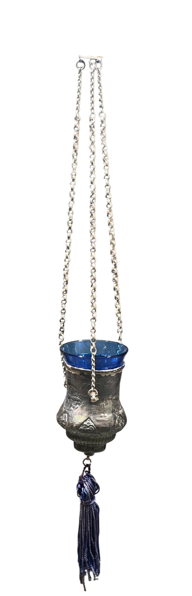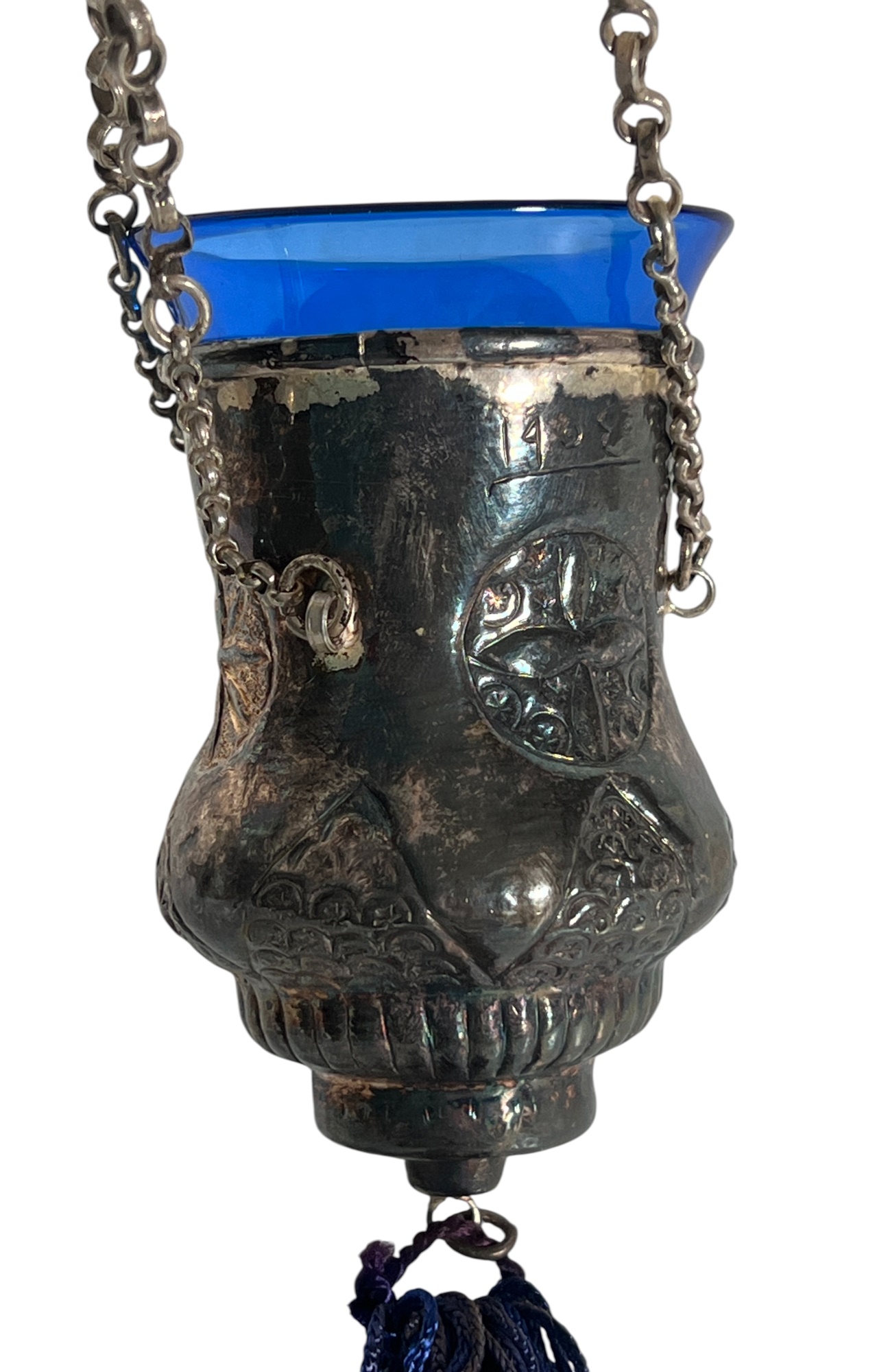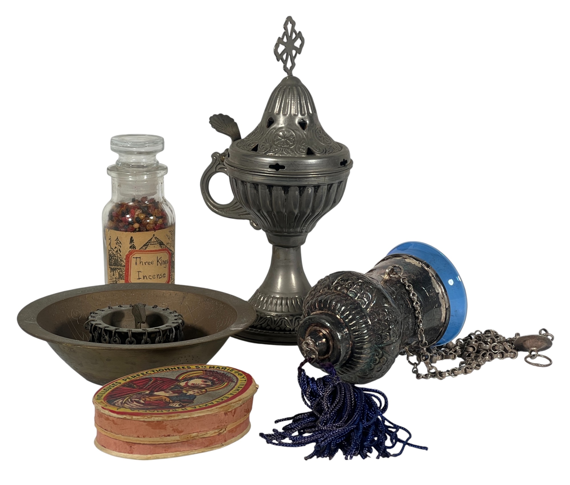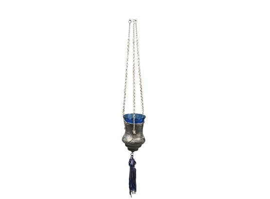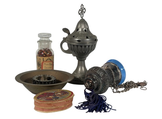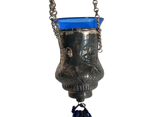 Eastern Orthodox silver tone censer, engraved silver tone hanging votive with blue glass insert, and Egyptian brass medicinal bowl. Censer 7 inches. Condition: Good. Temp No 8865