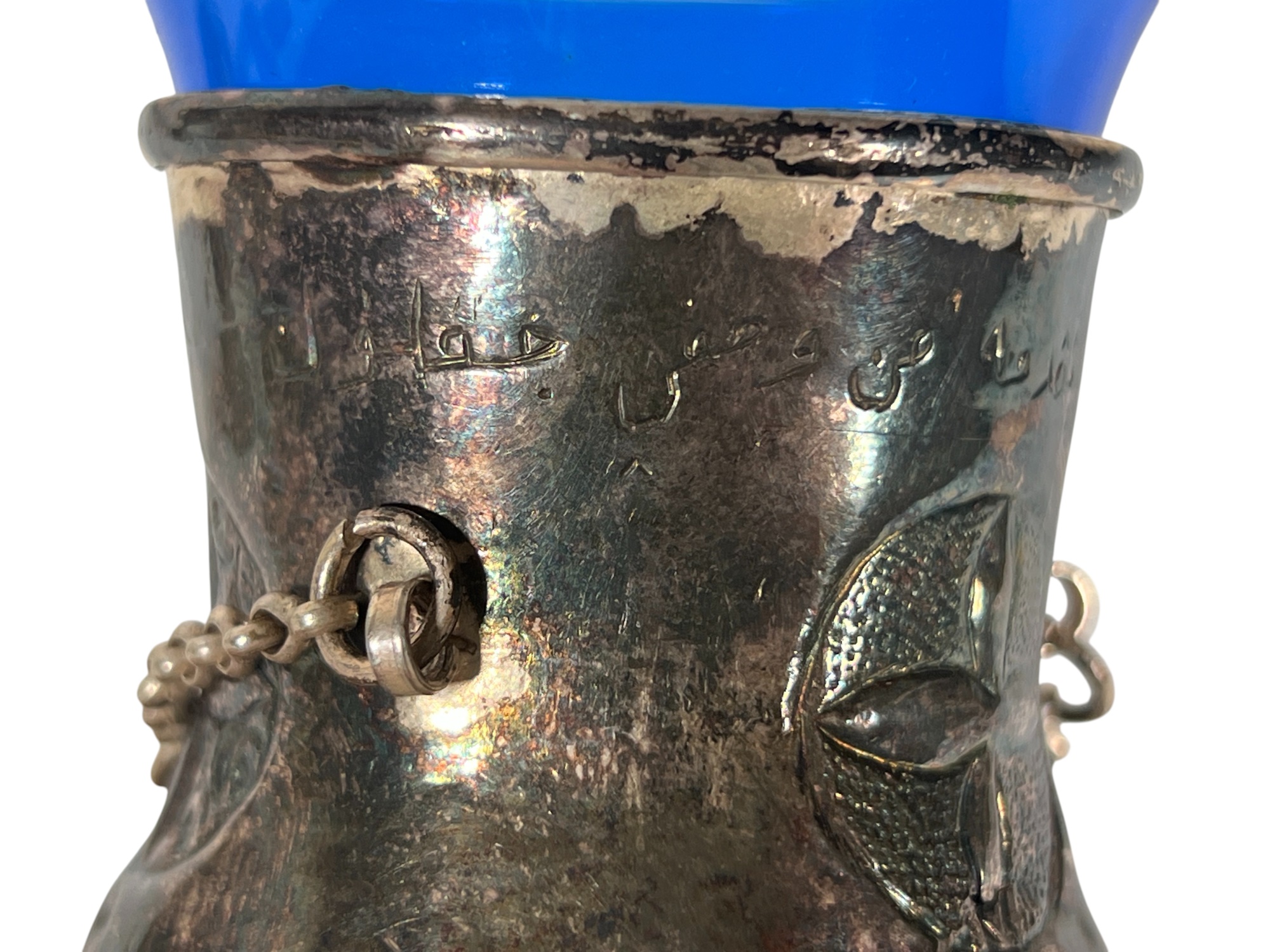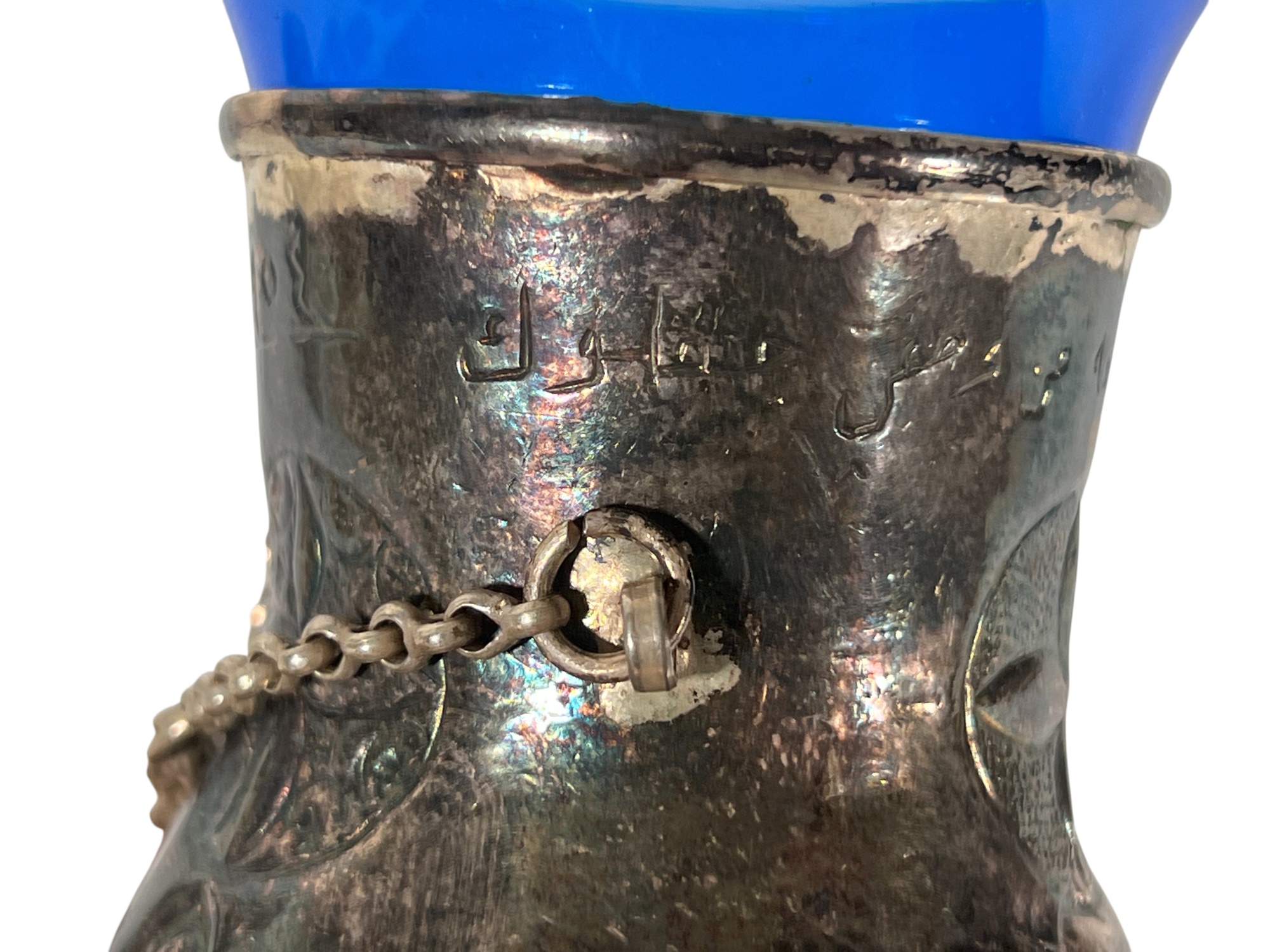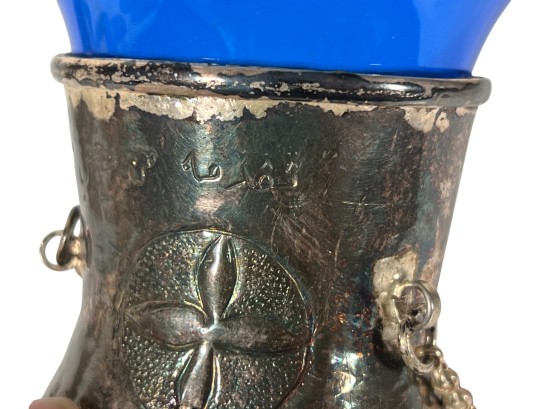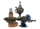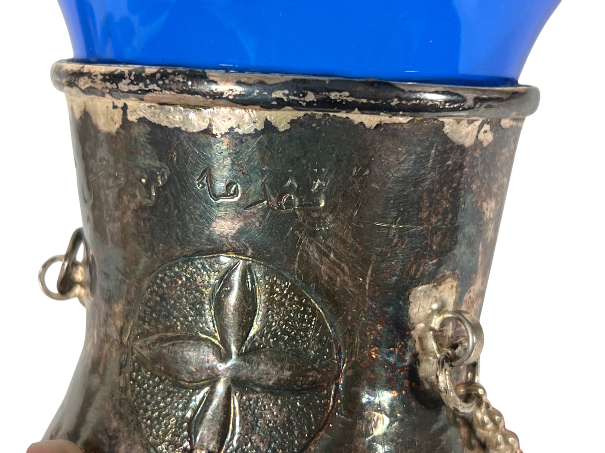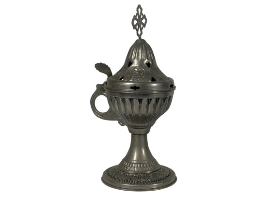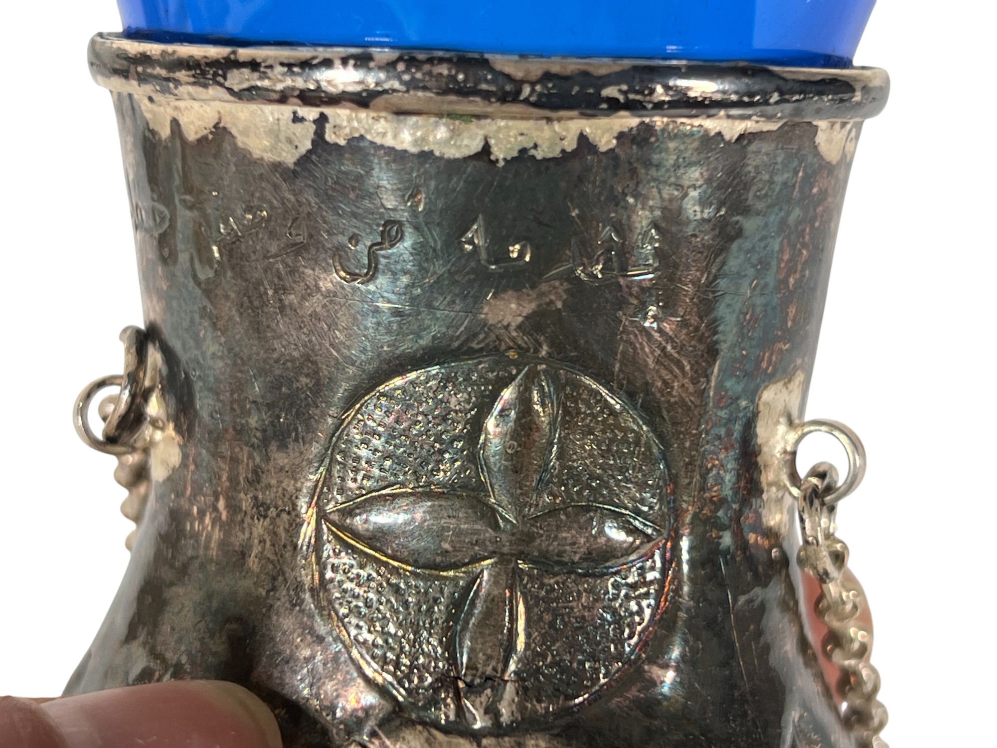 Eastern Orthodox silver tone censer, engraved silver tone hanging votive with blue glass insert, and Egyptian brass medicinal bowl. Censer 7 inches. Condition: Good. Temp No 8865