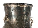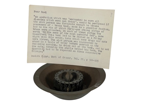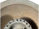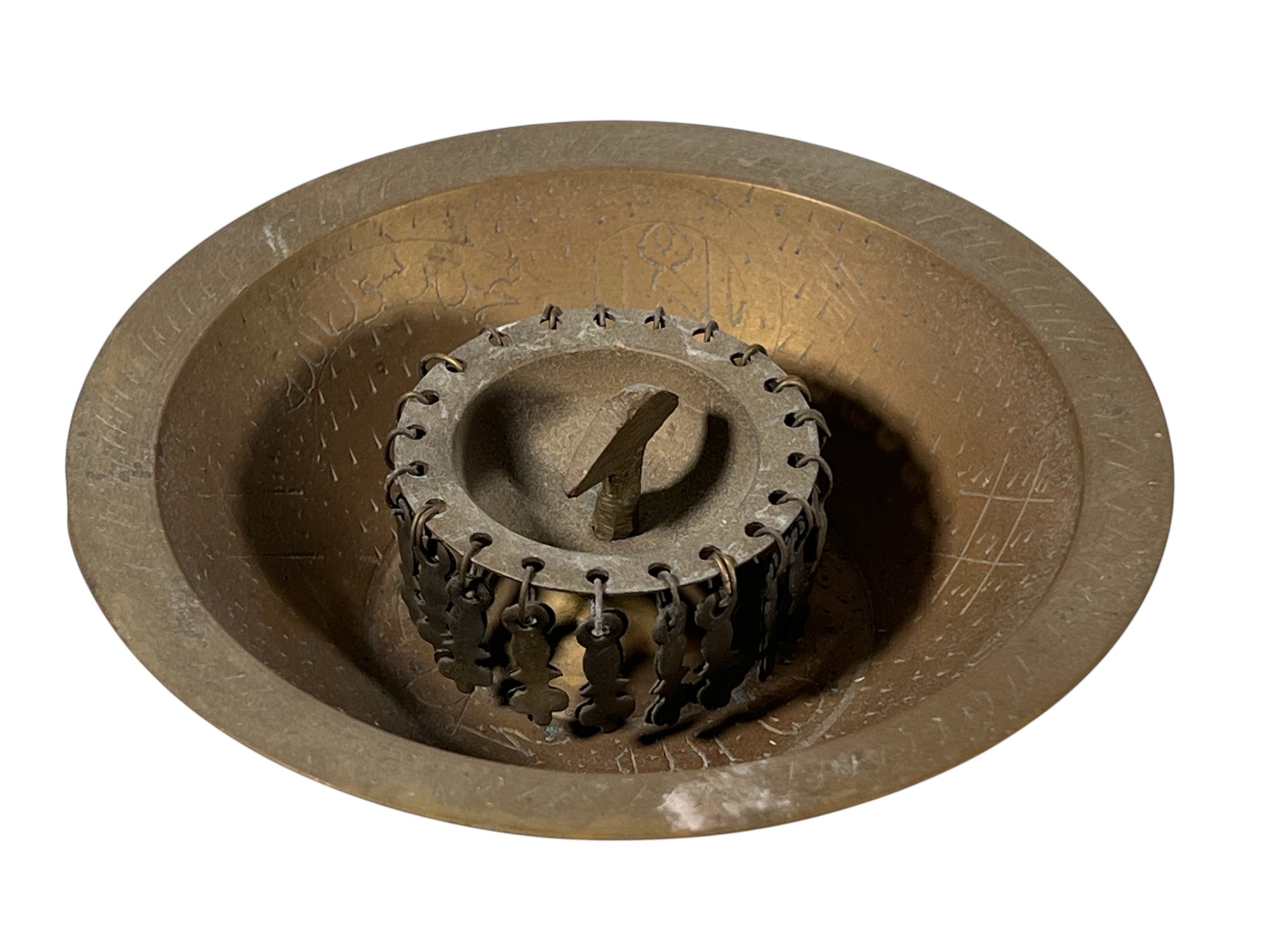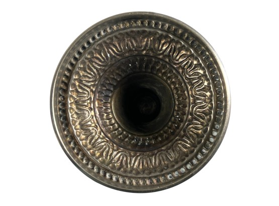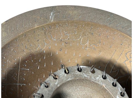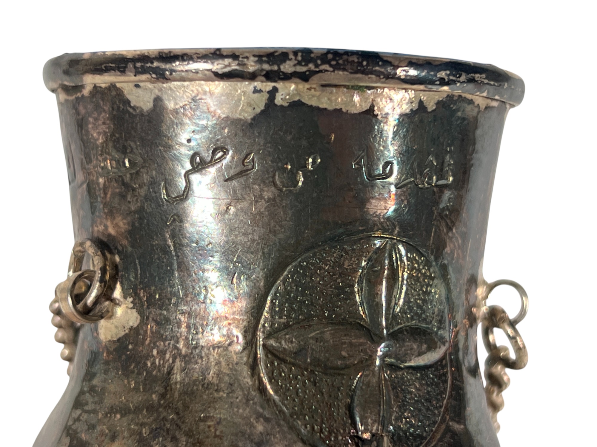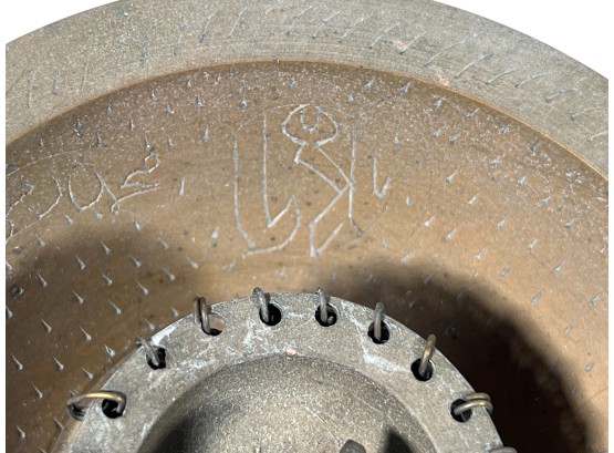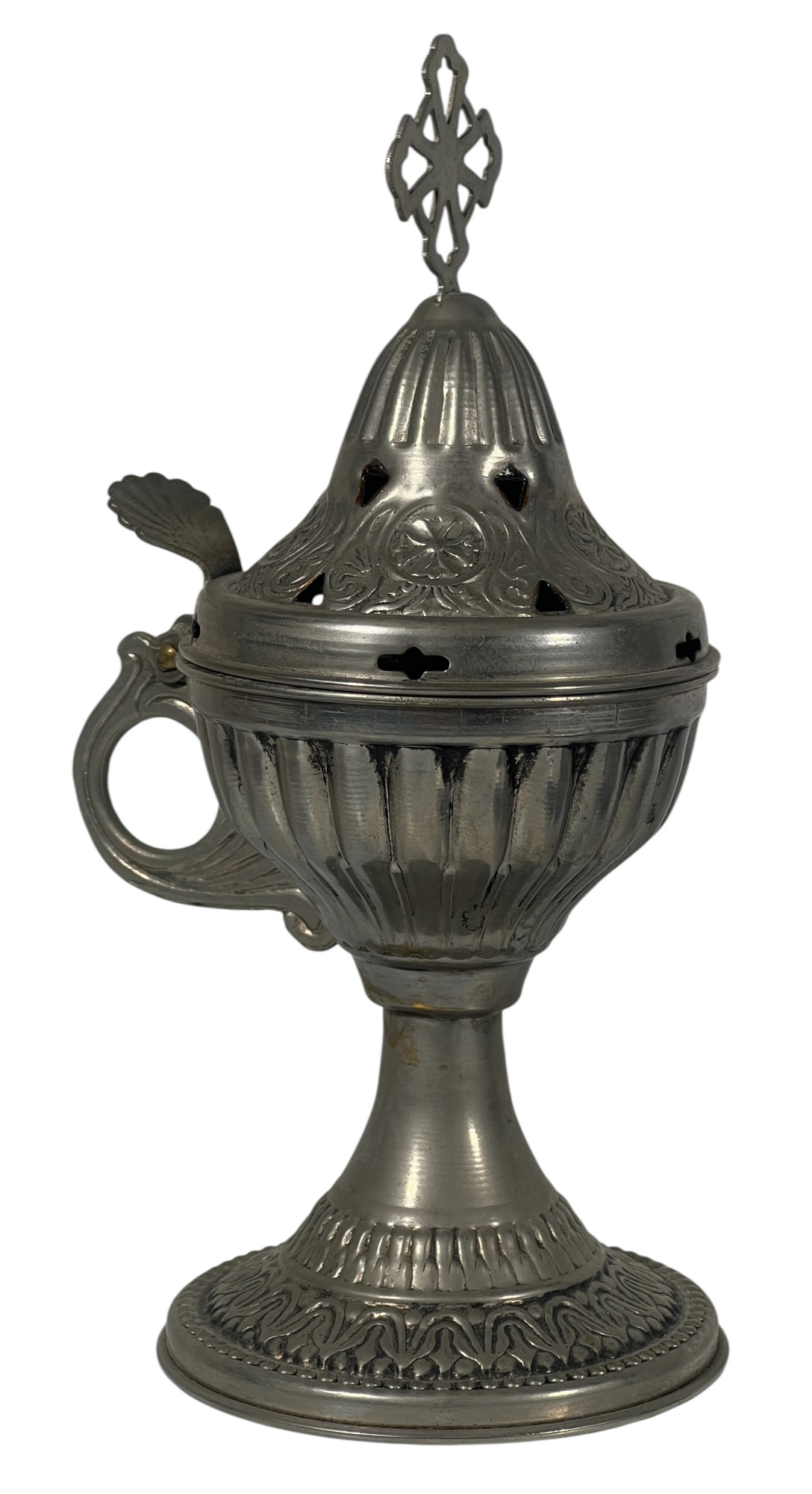 Eastern Orthodox silver tone censer, engraved silver tone hanging votive with blue glass insert, and Egyptian brass medicinal bowl. Censer 7 inches. Condition: Good. Temp No 8865