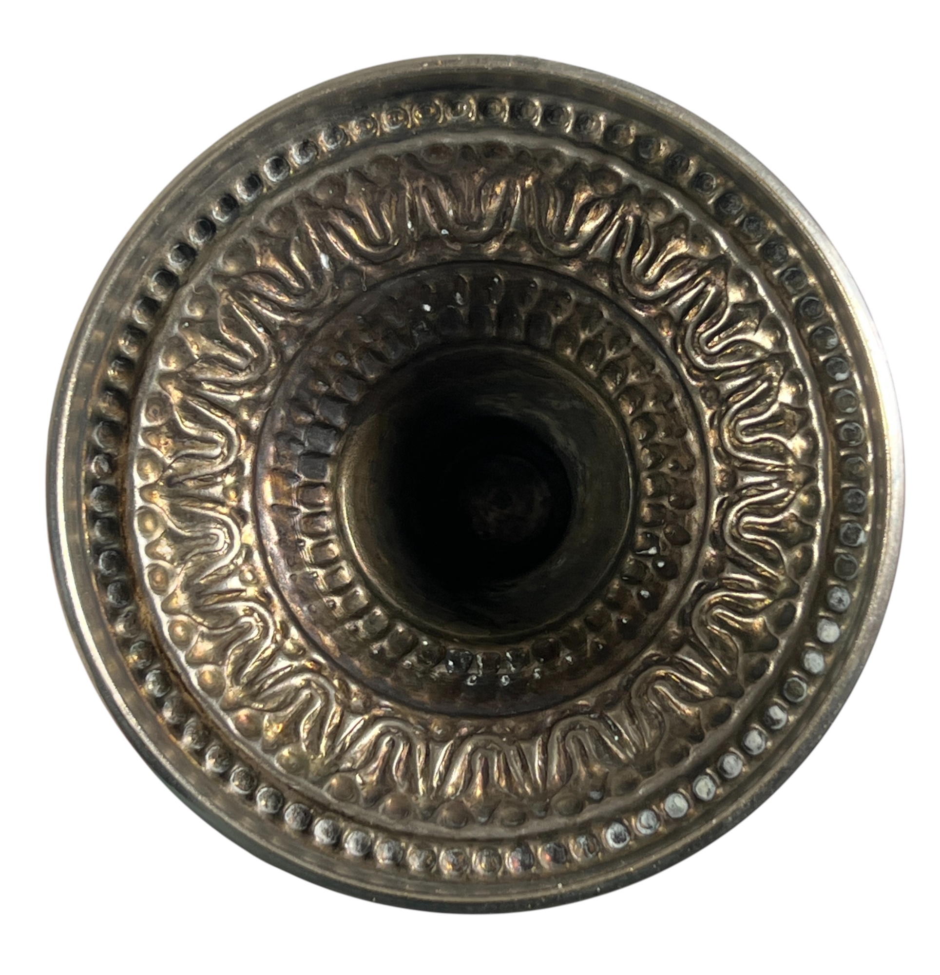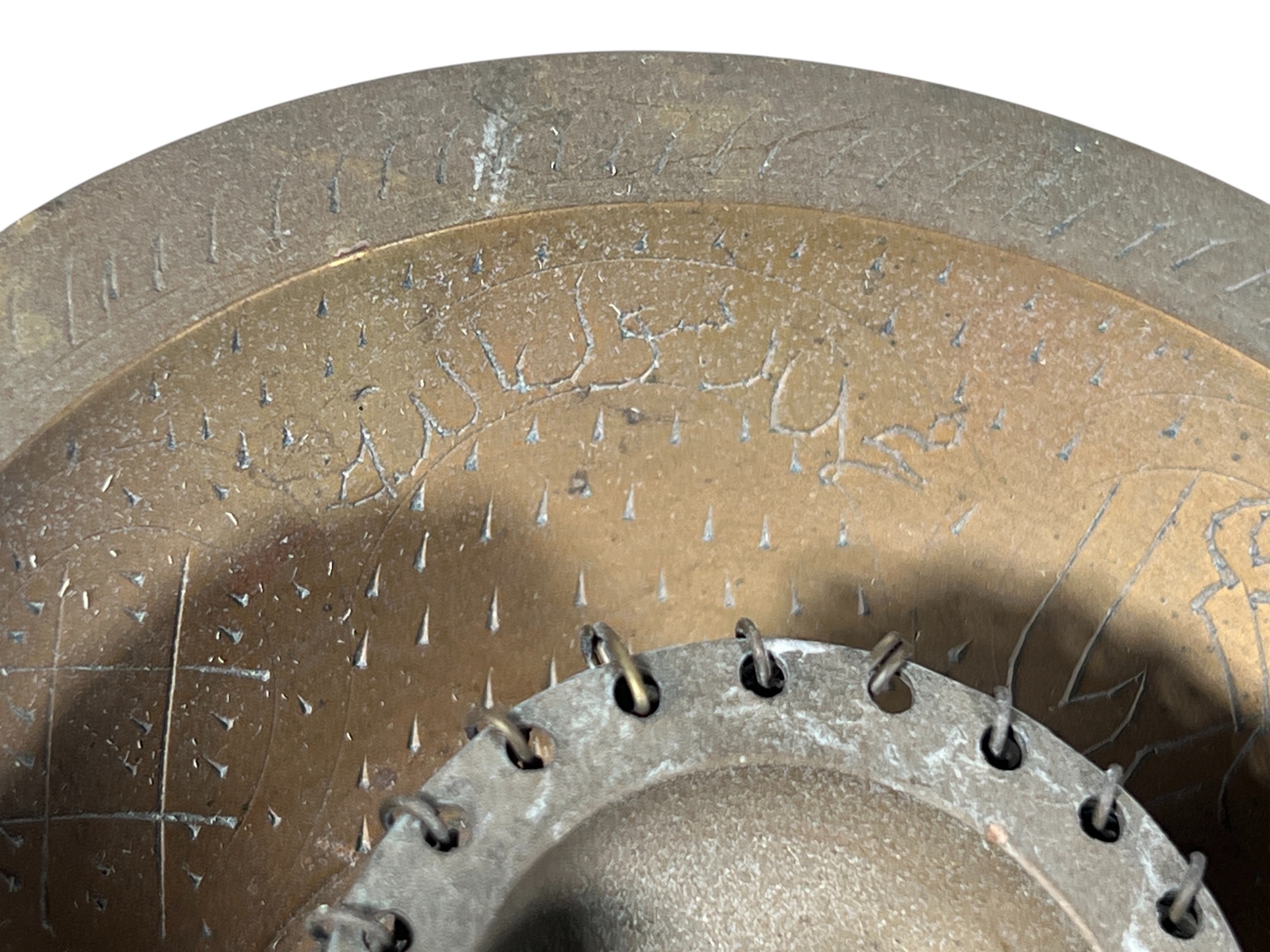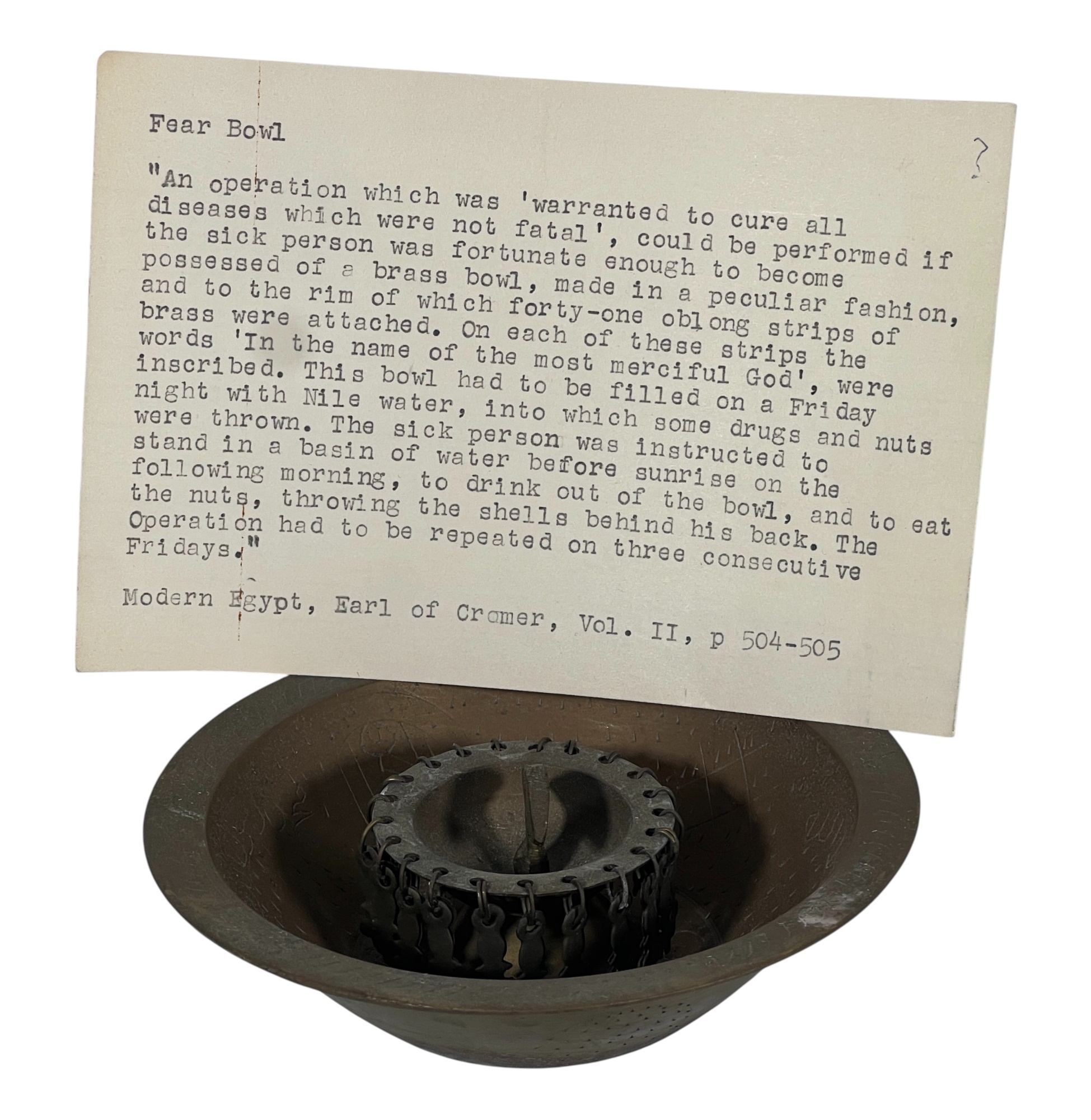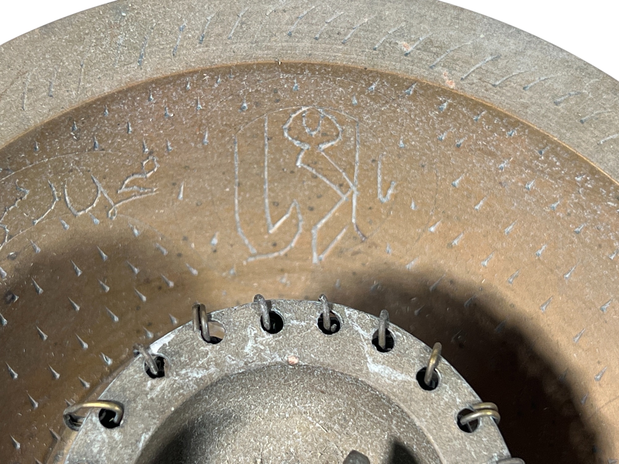 Eastern Orthodox silver tone censer, engraved silver tone hanging votive with blue glass insert, and Egyptian brass medicinal bowl. Censer 7 inches. Condition: Good. Temp No 8865