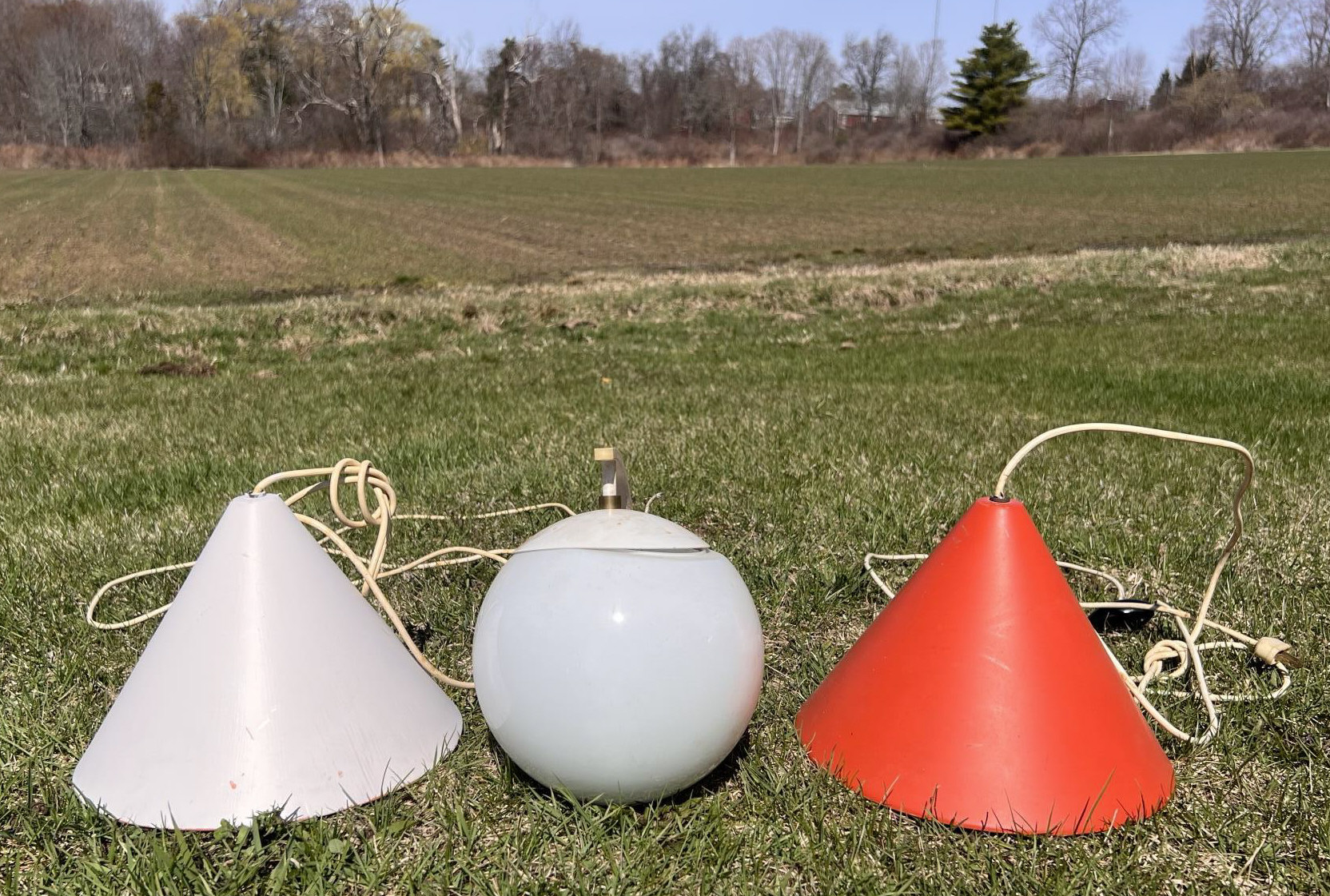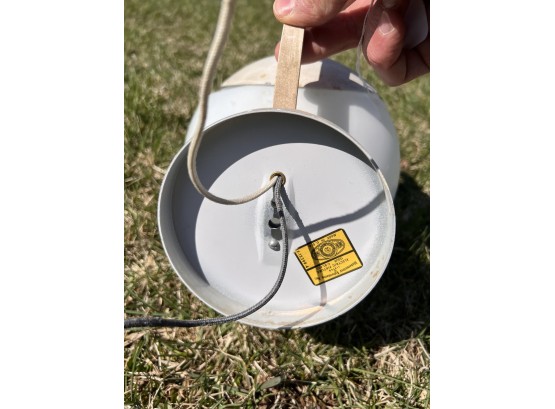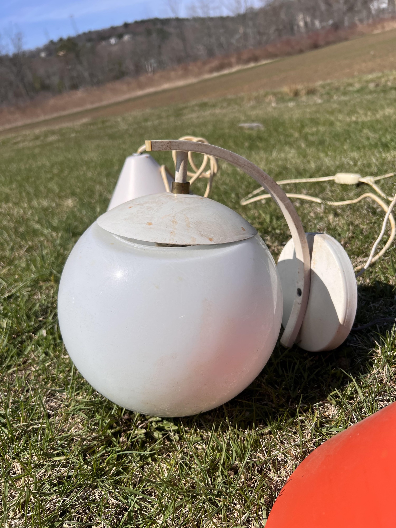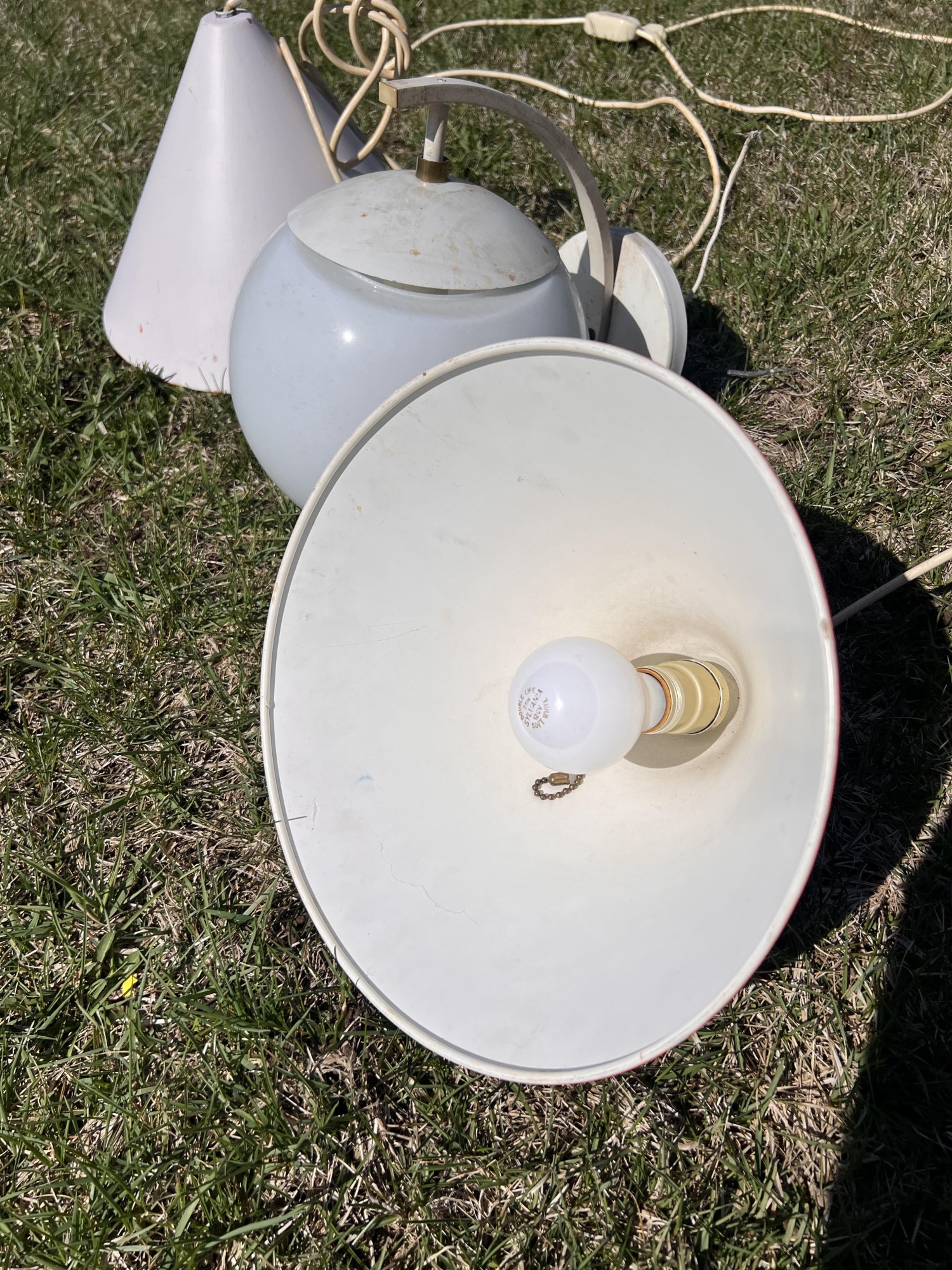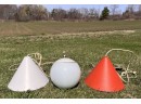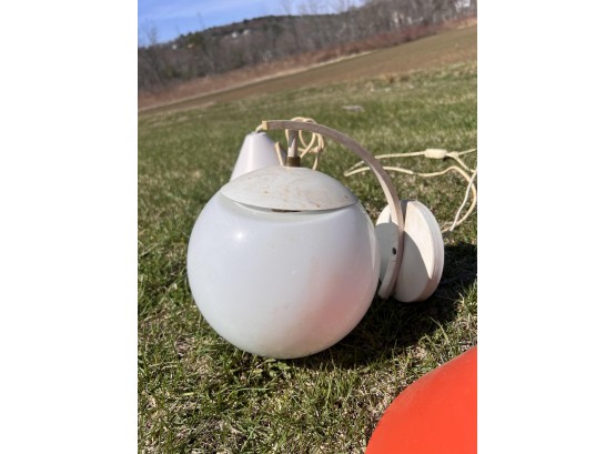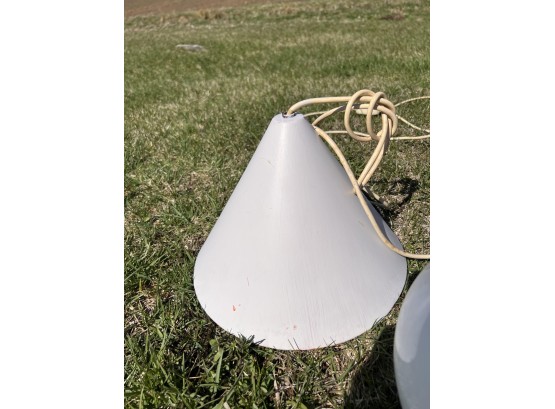 (2) hanging lights and mounted wall globe fixture. Hanging lights 10 3/4" dia Condition: Used, may need rewiring, untested Temp No 6708