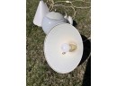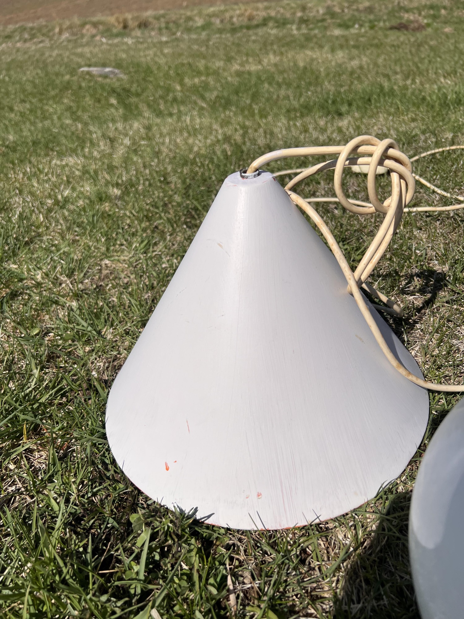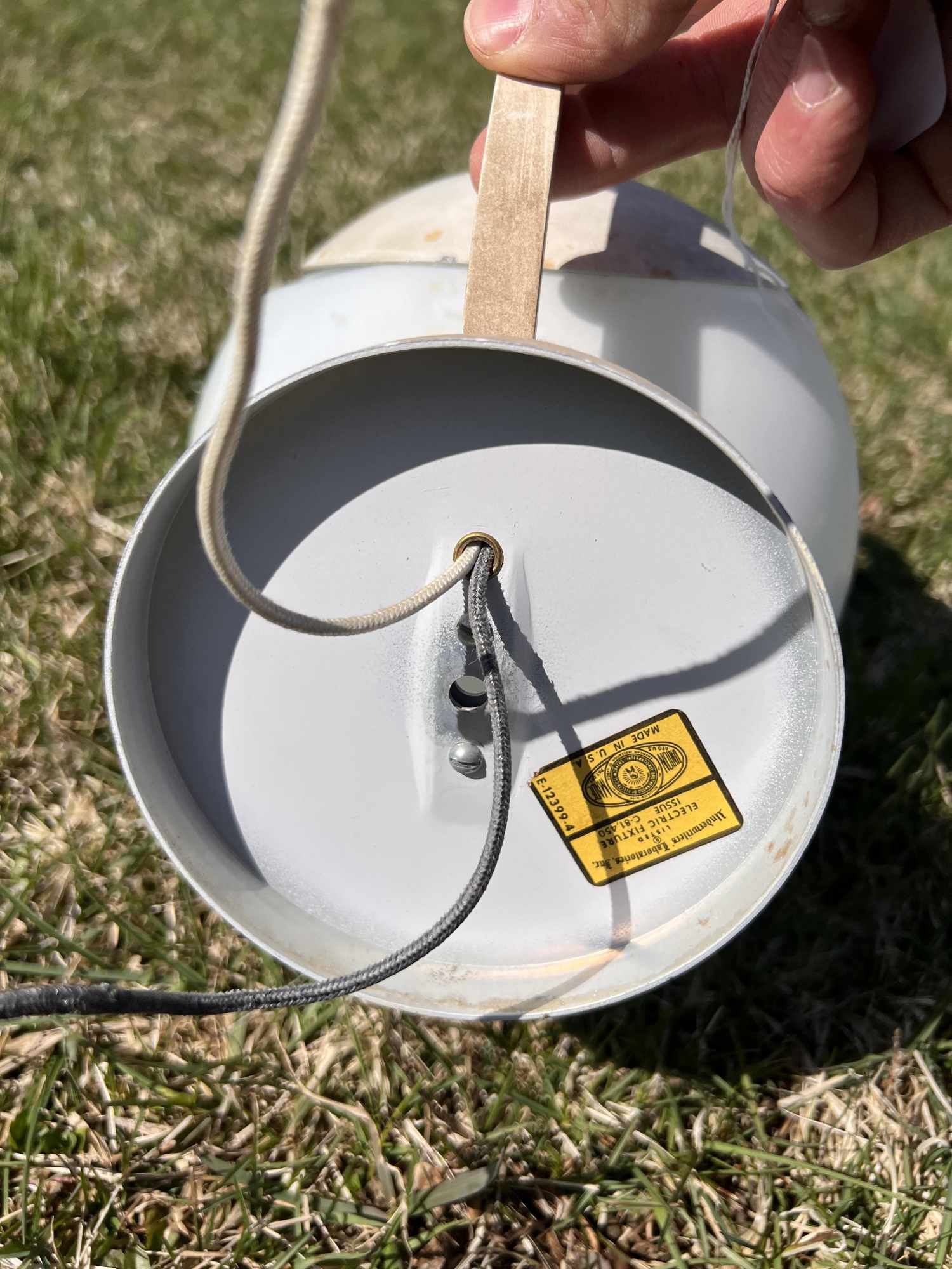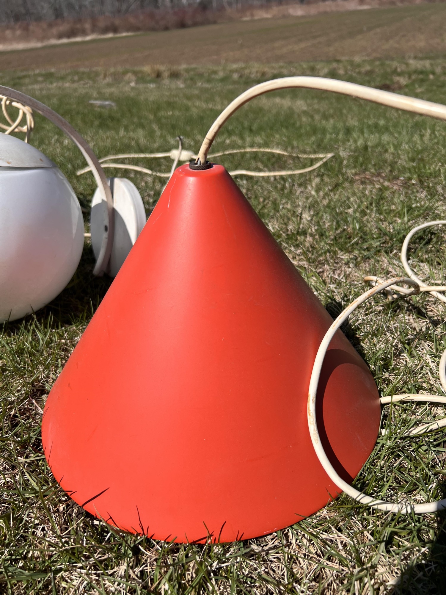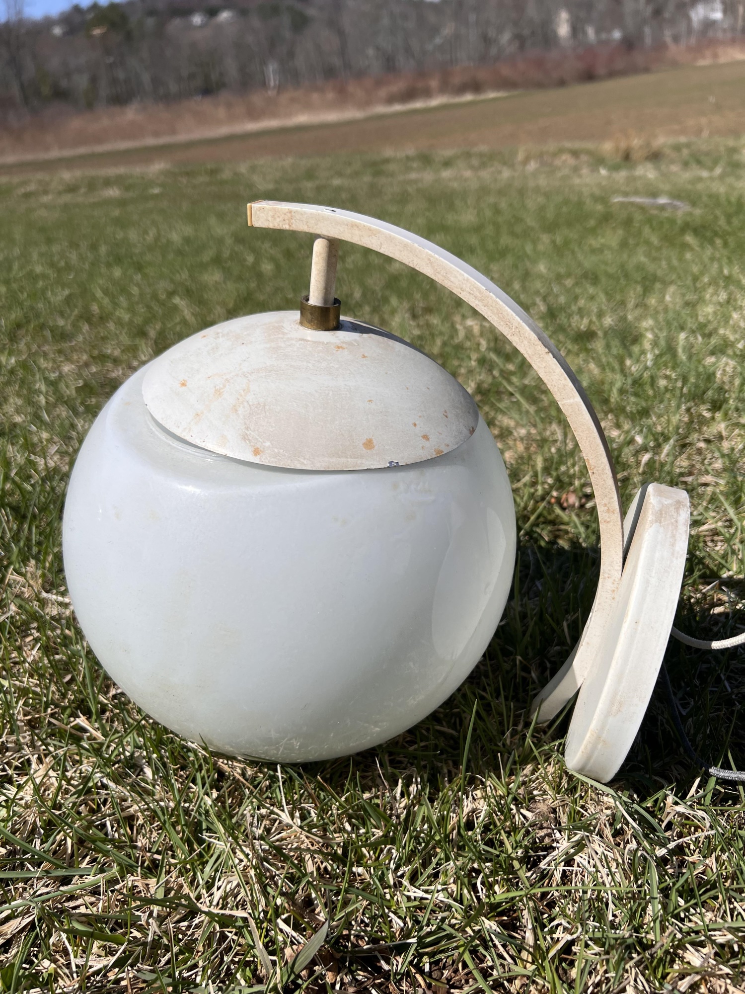 (2) hanging lights and mounted wall globe fixture. Hanging lights 10 3/4" dia Condition: Used, may need rewiring, untested Temp No 6708