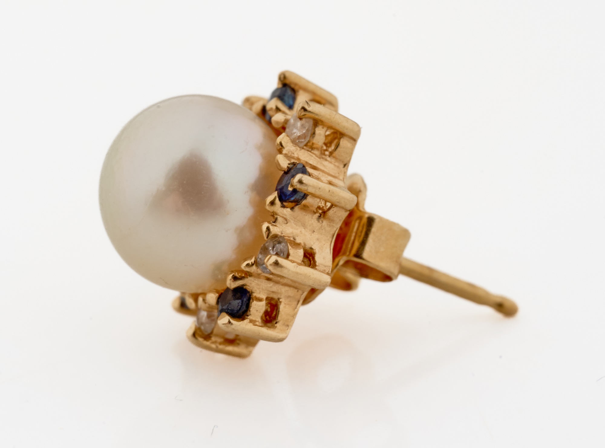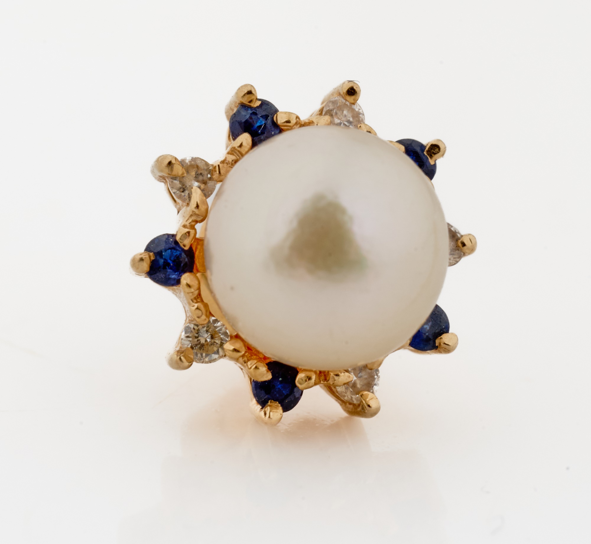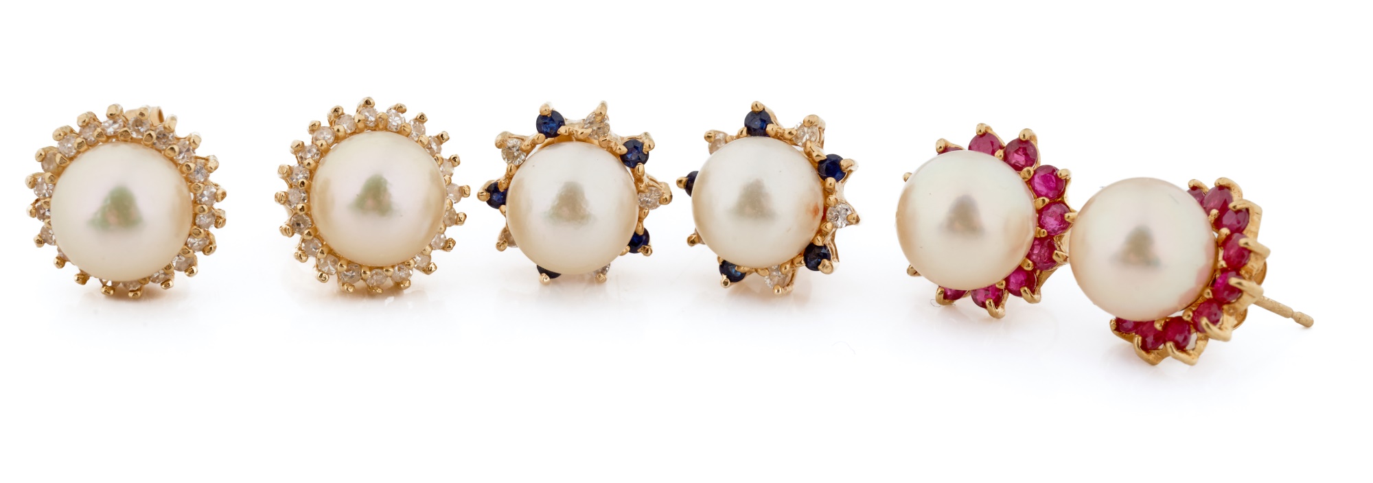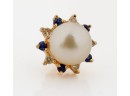 Set with melee diamonds, sapphires and rubies. Pearls 6-7mm. 5.3 dwt (gross weight) Condition: Good