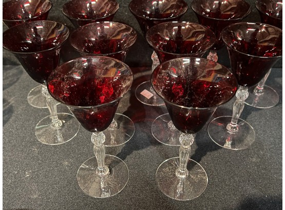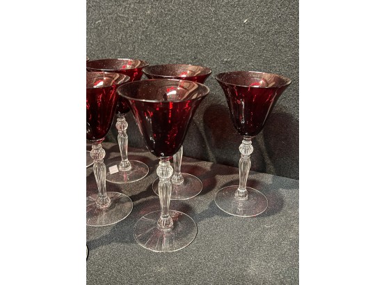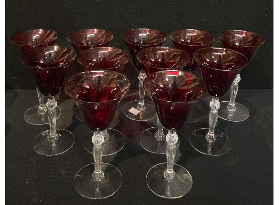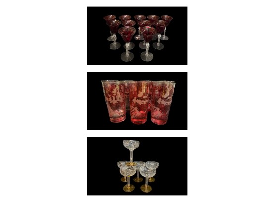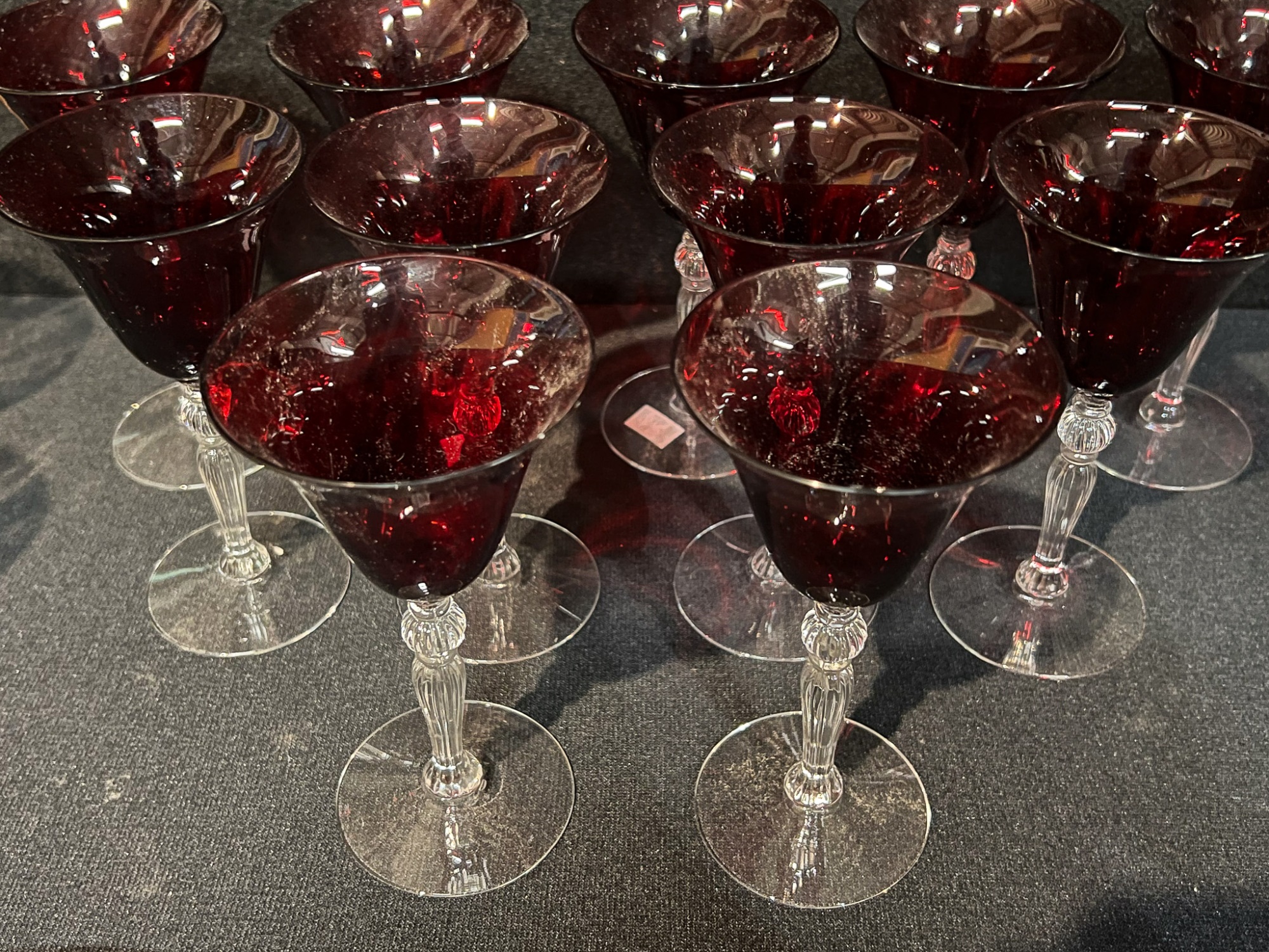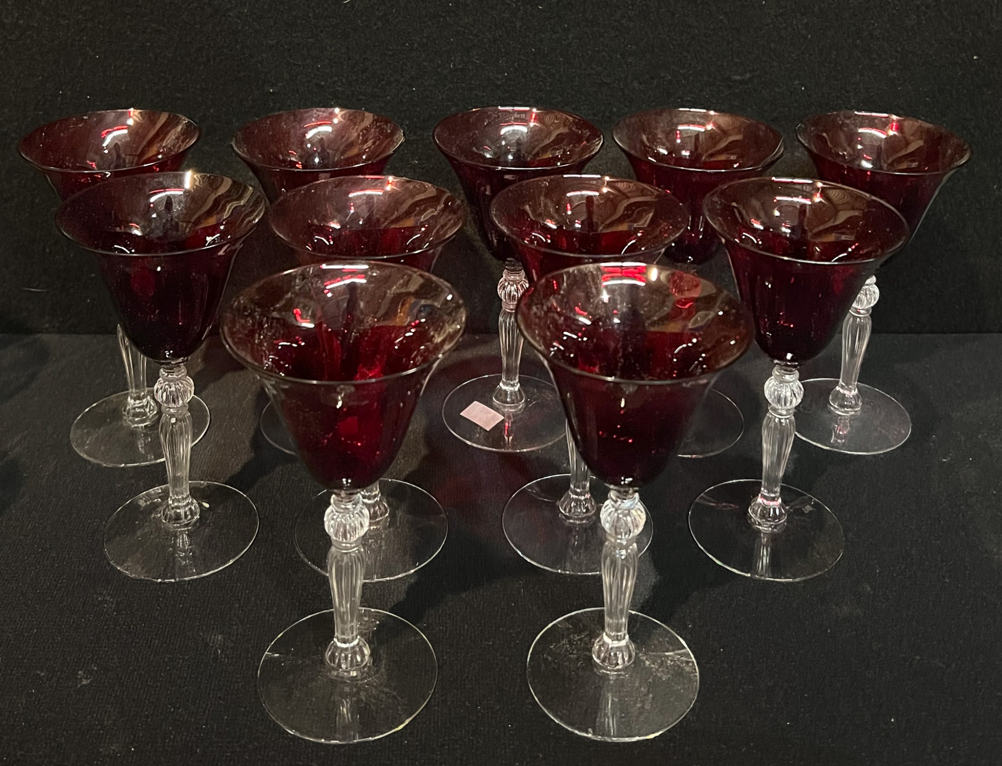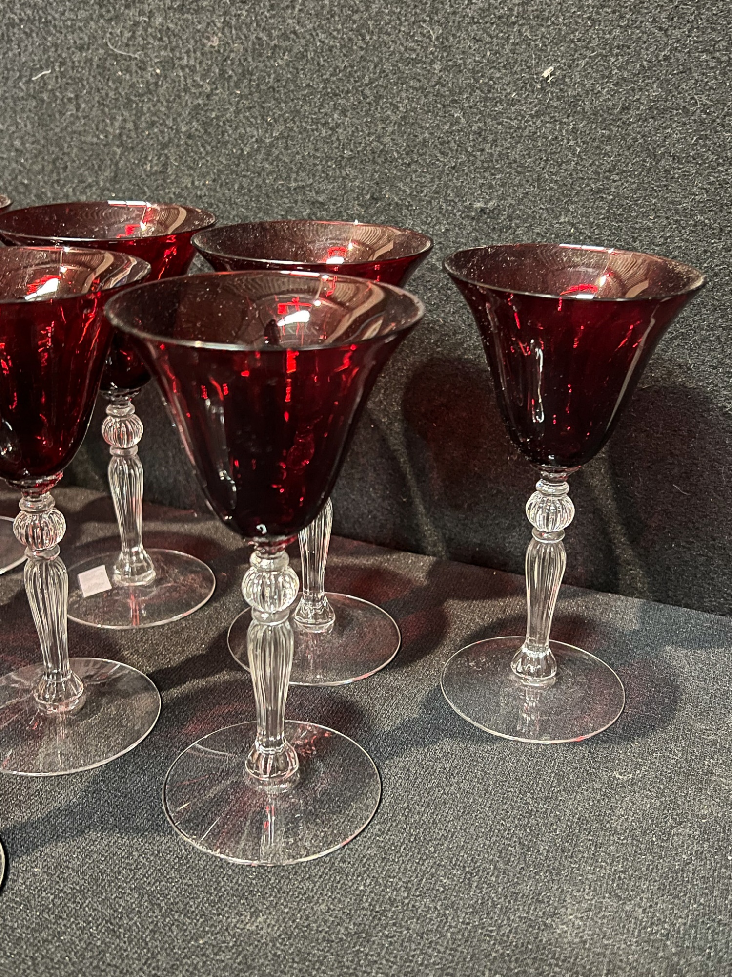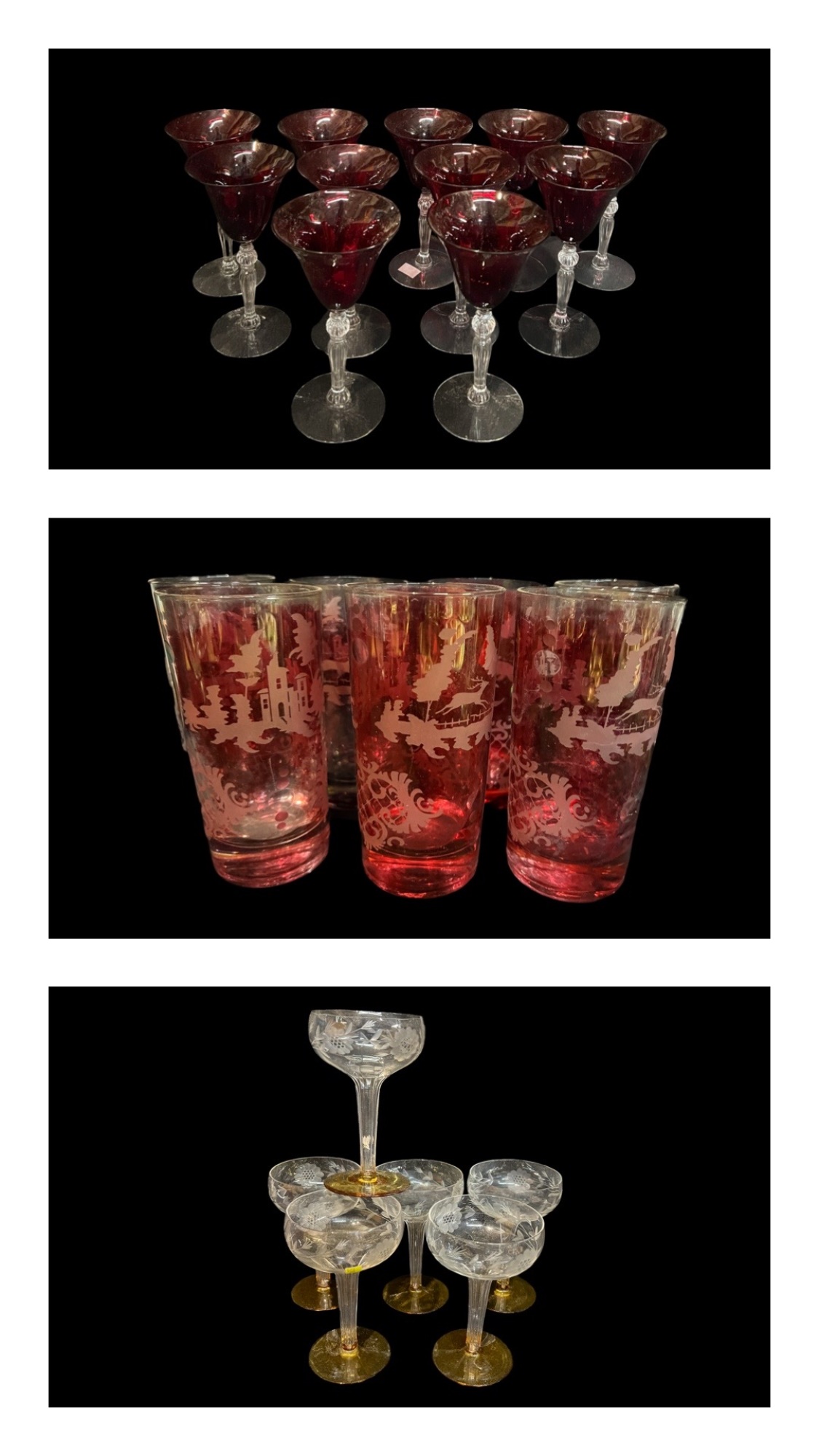 Including (11) ruby and clear stems, (6) clear with yellow base champagnes and (7) ruby flask glasses (worn). Tallest 6"