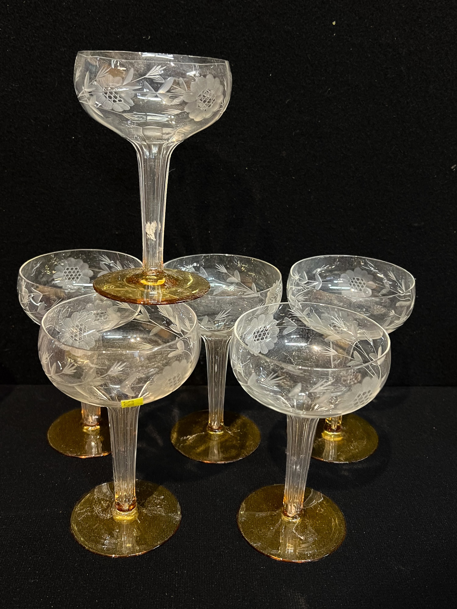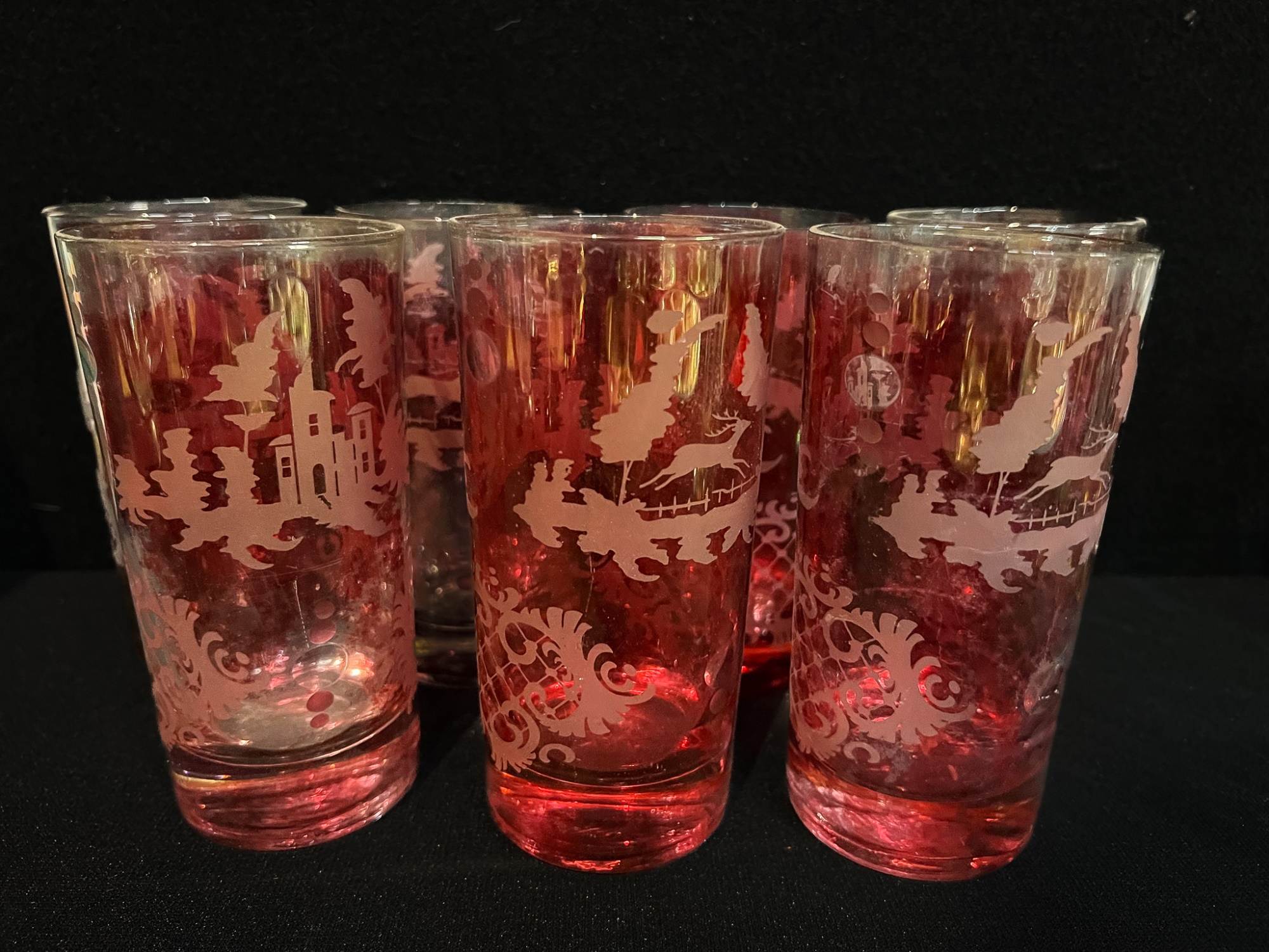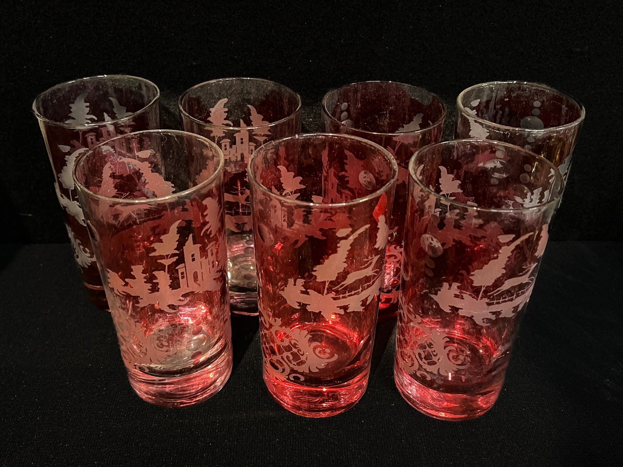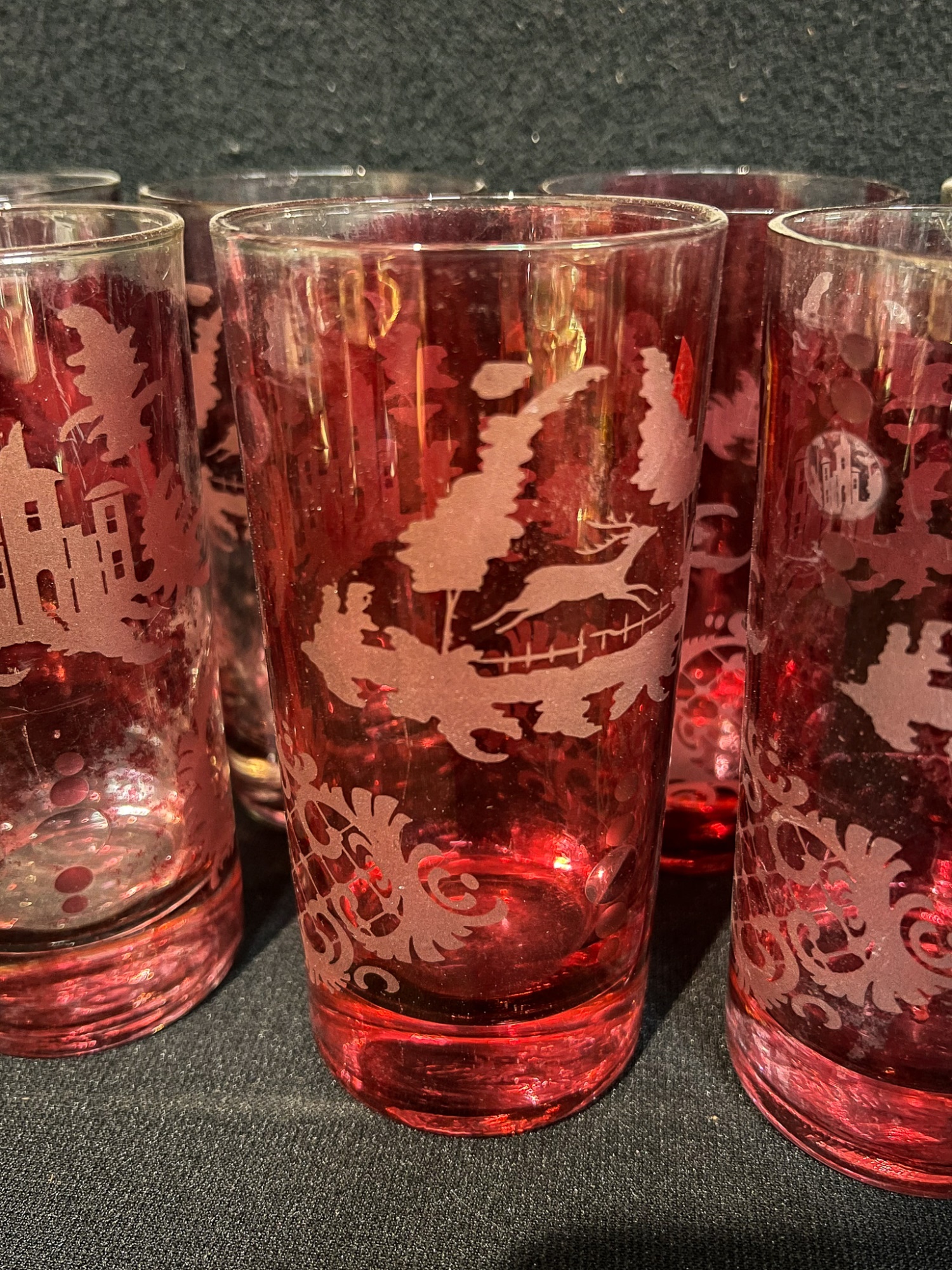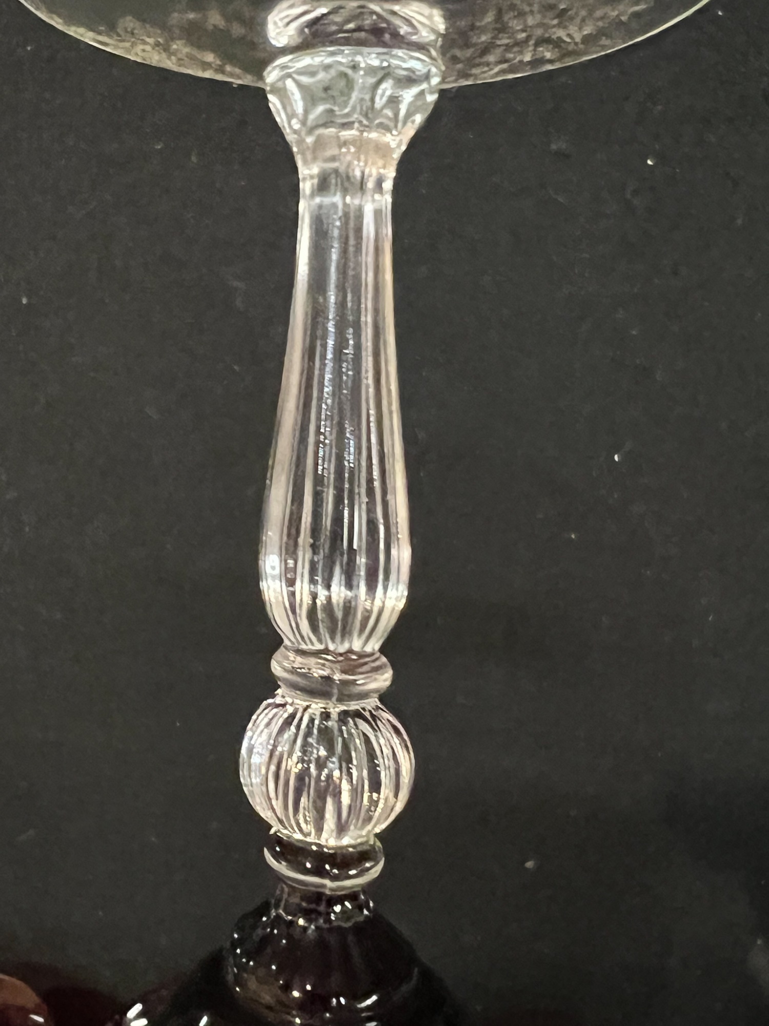 Including (11) ruby and clear stems, (6) clear with yellow base champagnes and (7) ruby flask glasses (worn). Tallest 6"