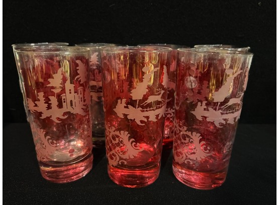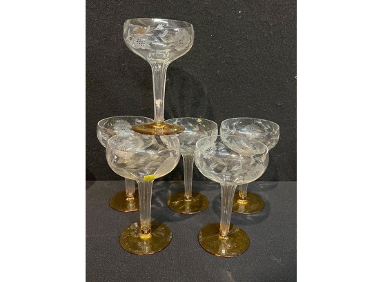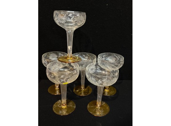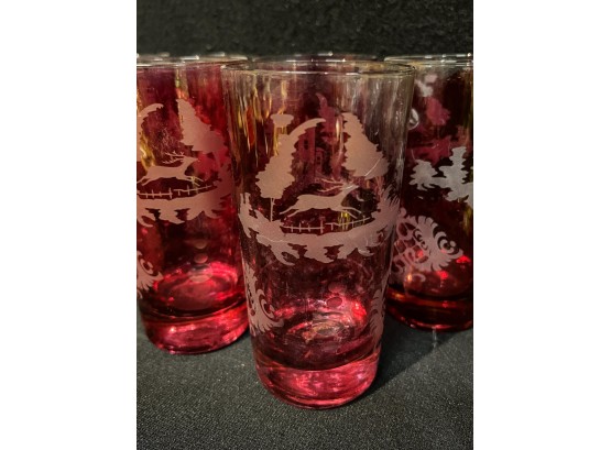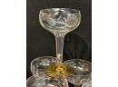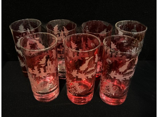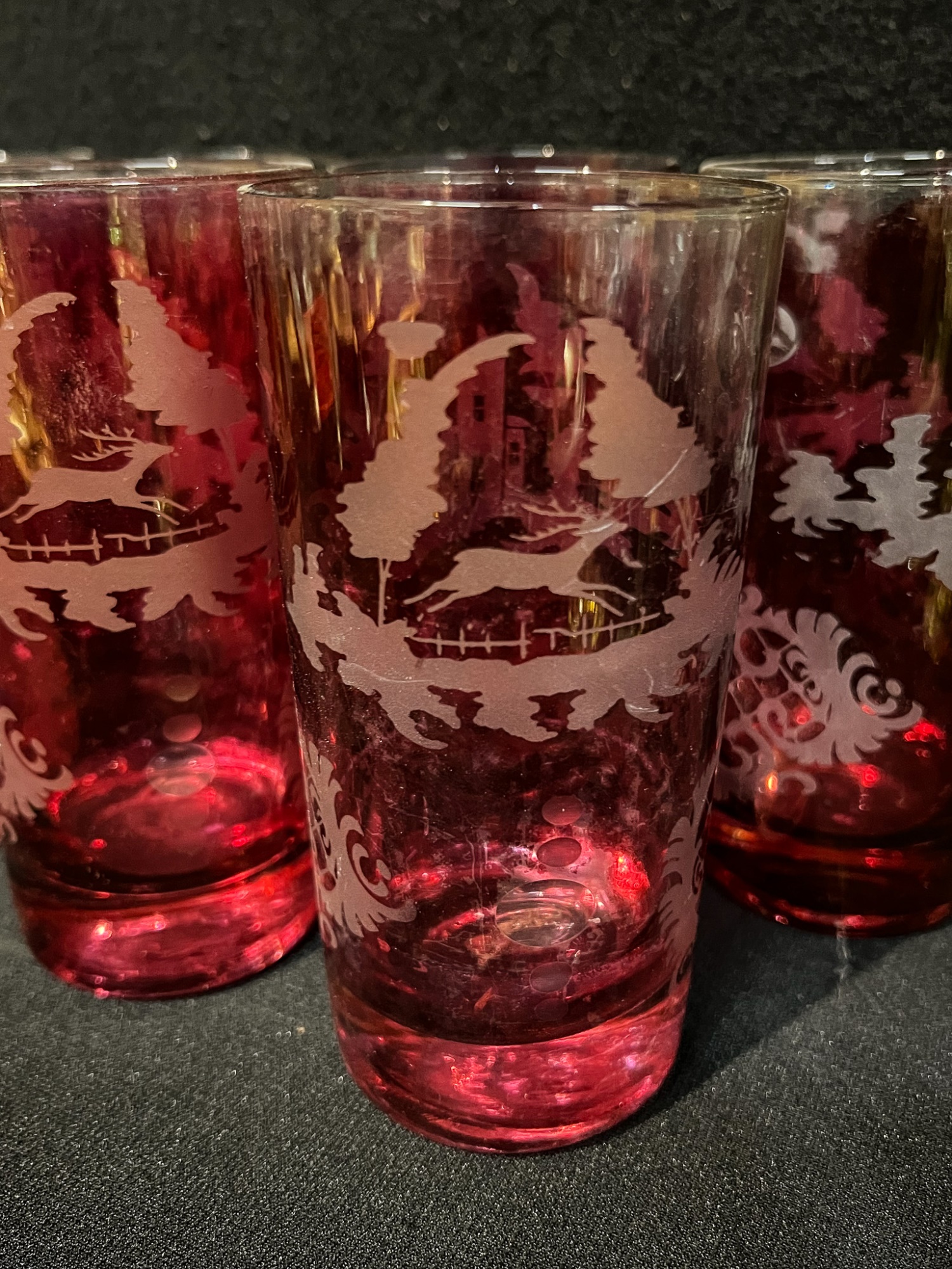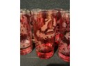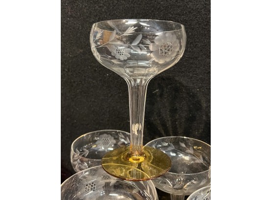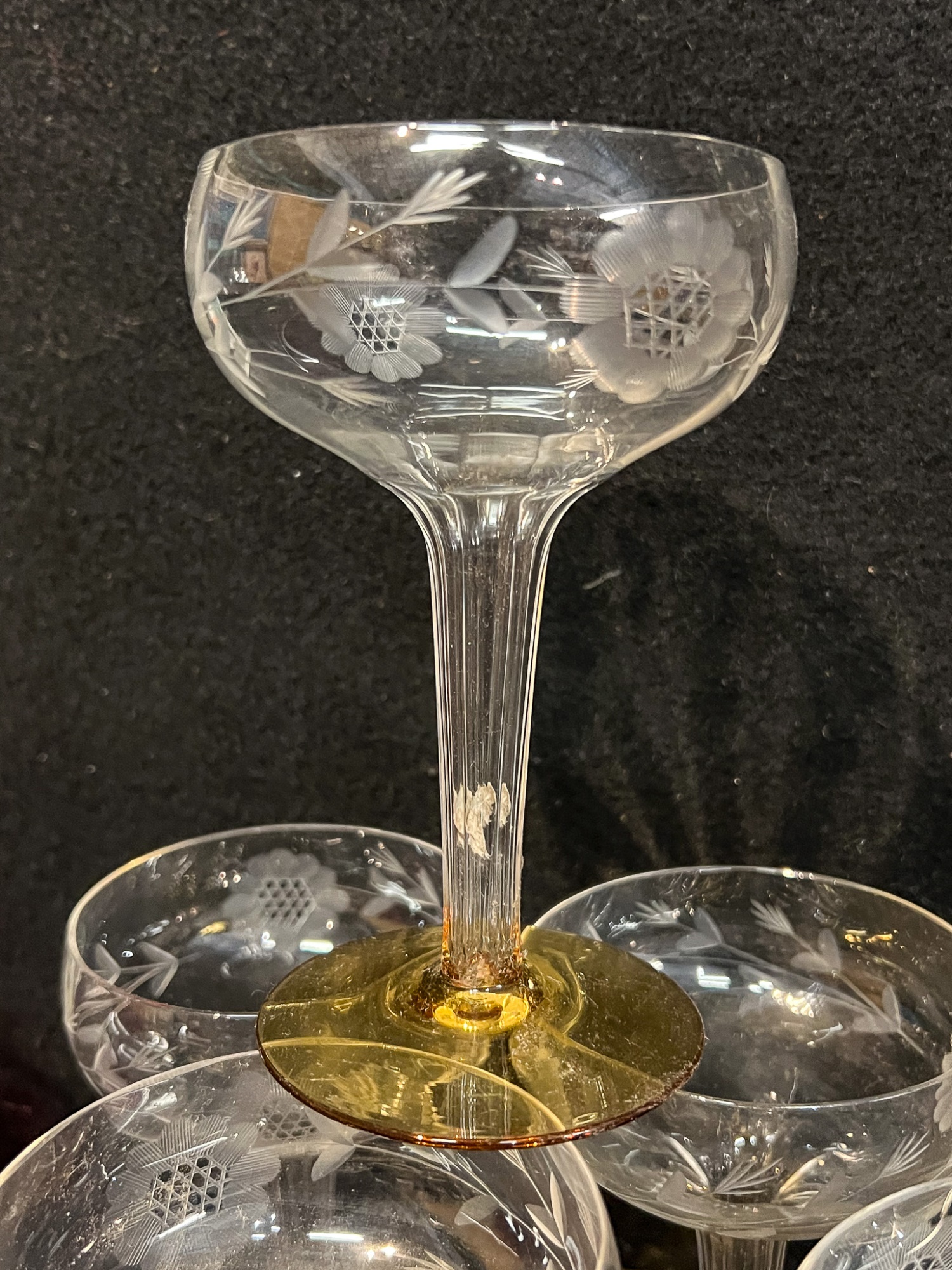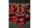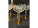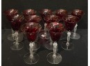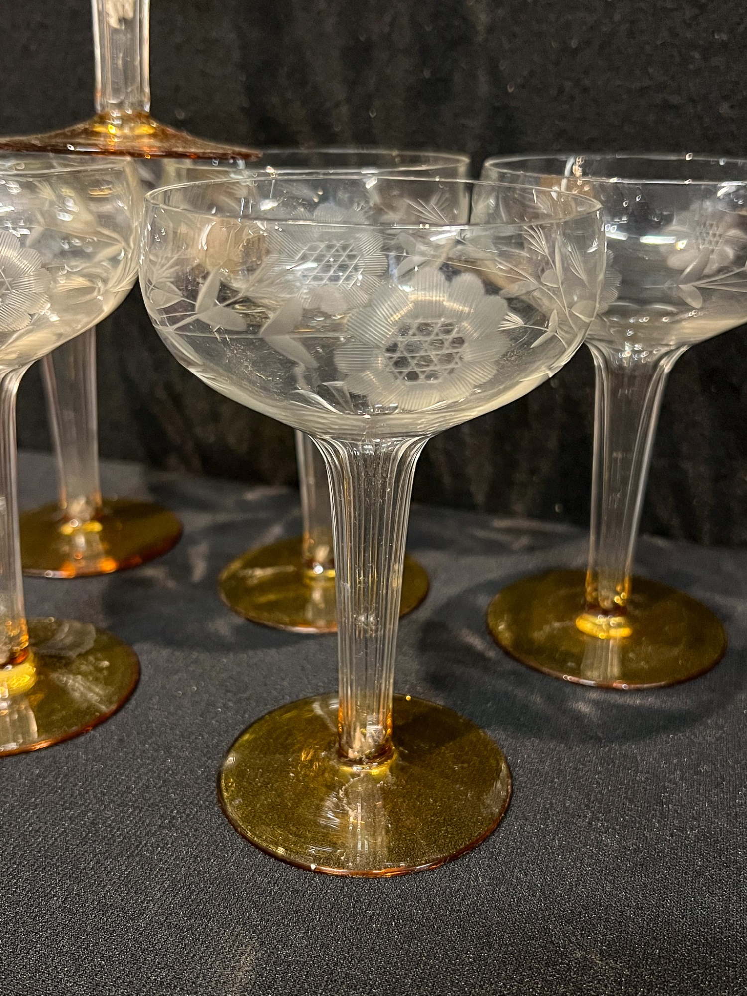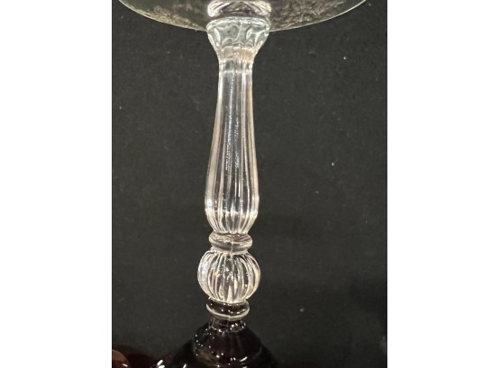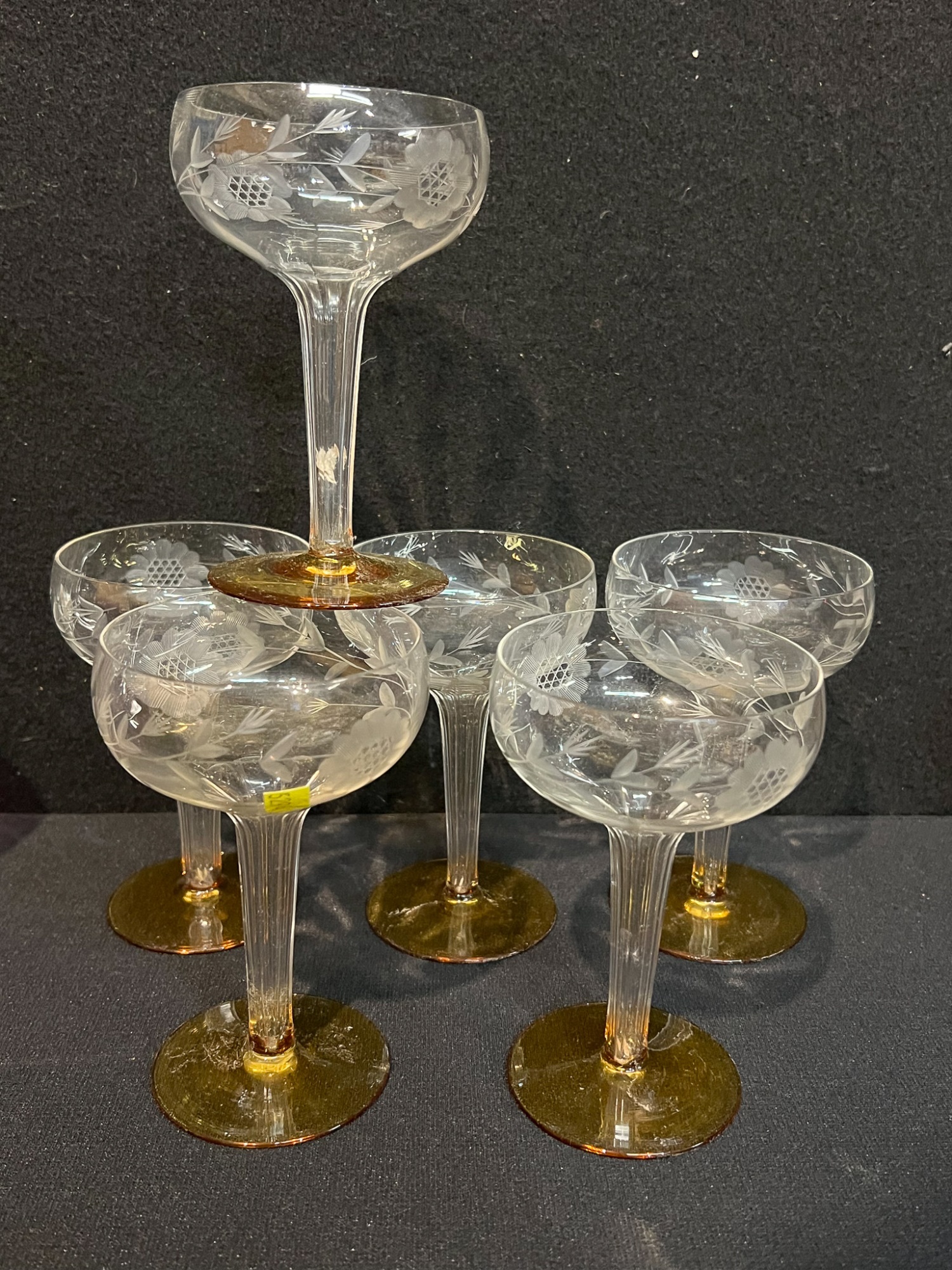 Including (11) ruby and clear stems, (6) clear with yellow base champagnes and (7) ruby flask glasses (worn). Tallest 6"