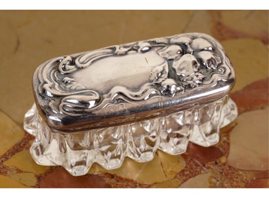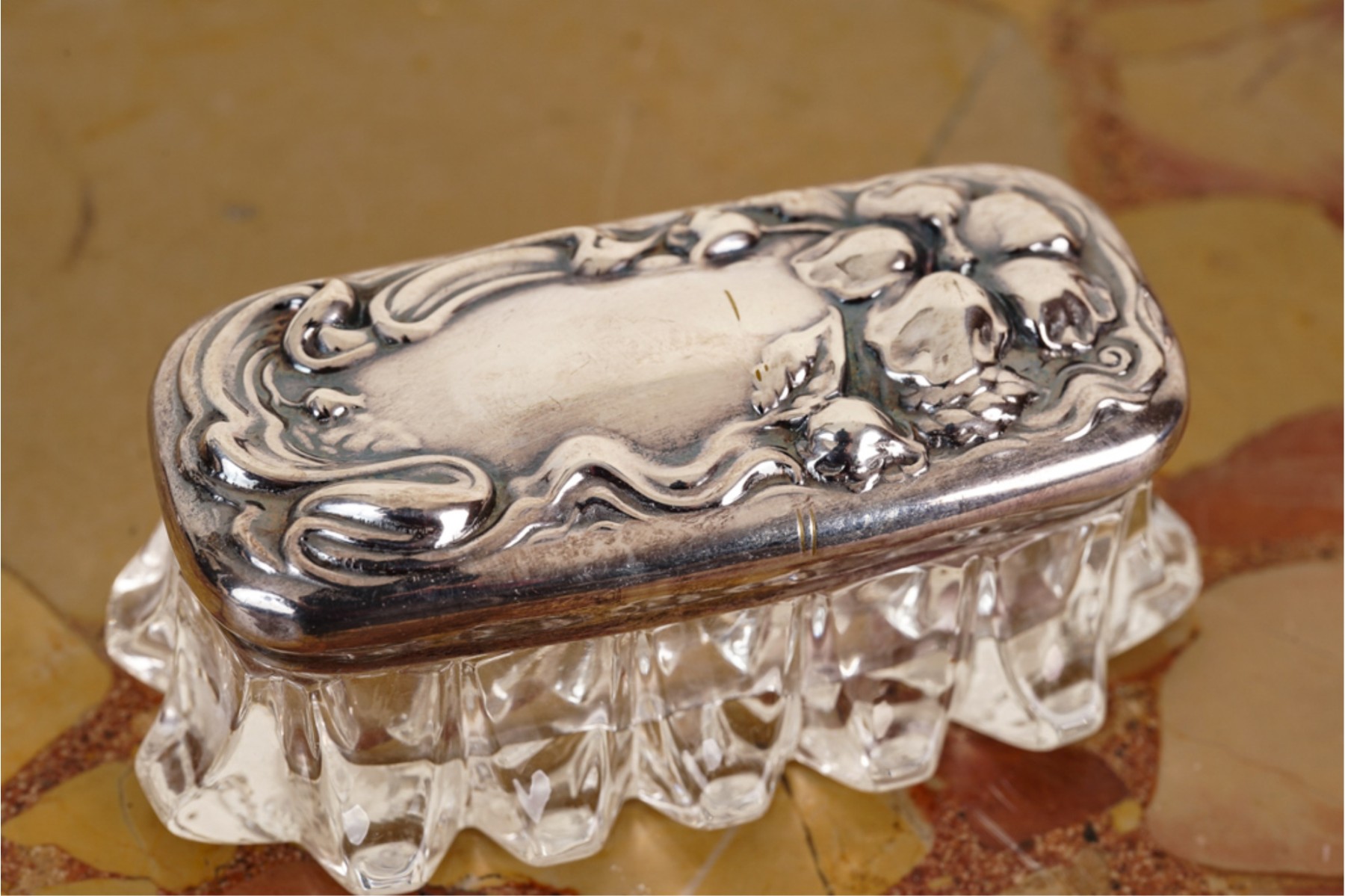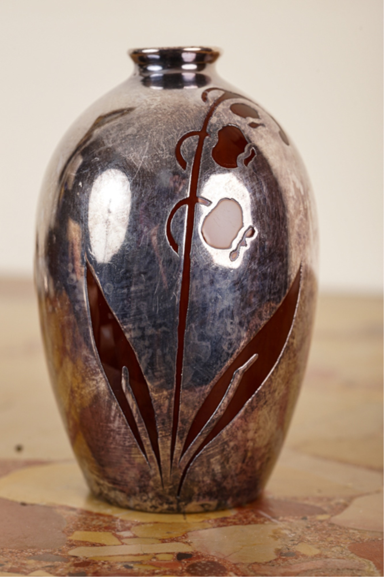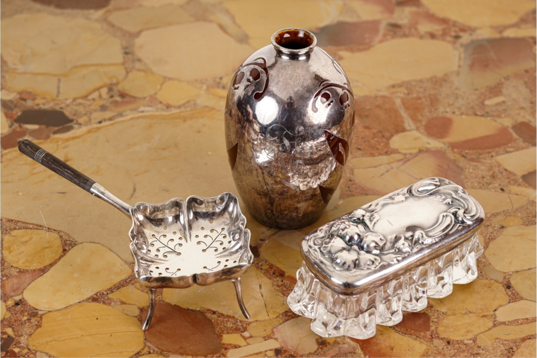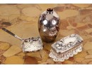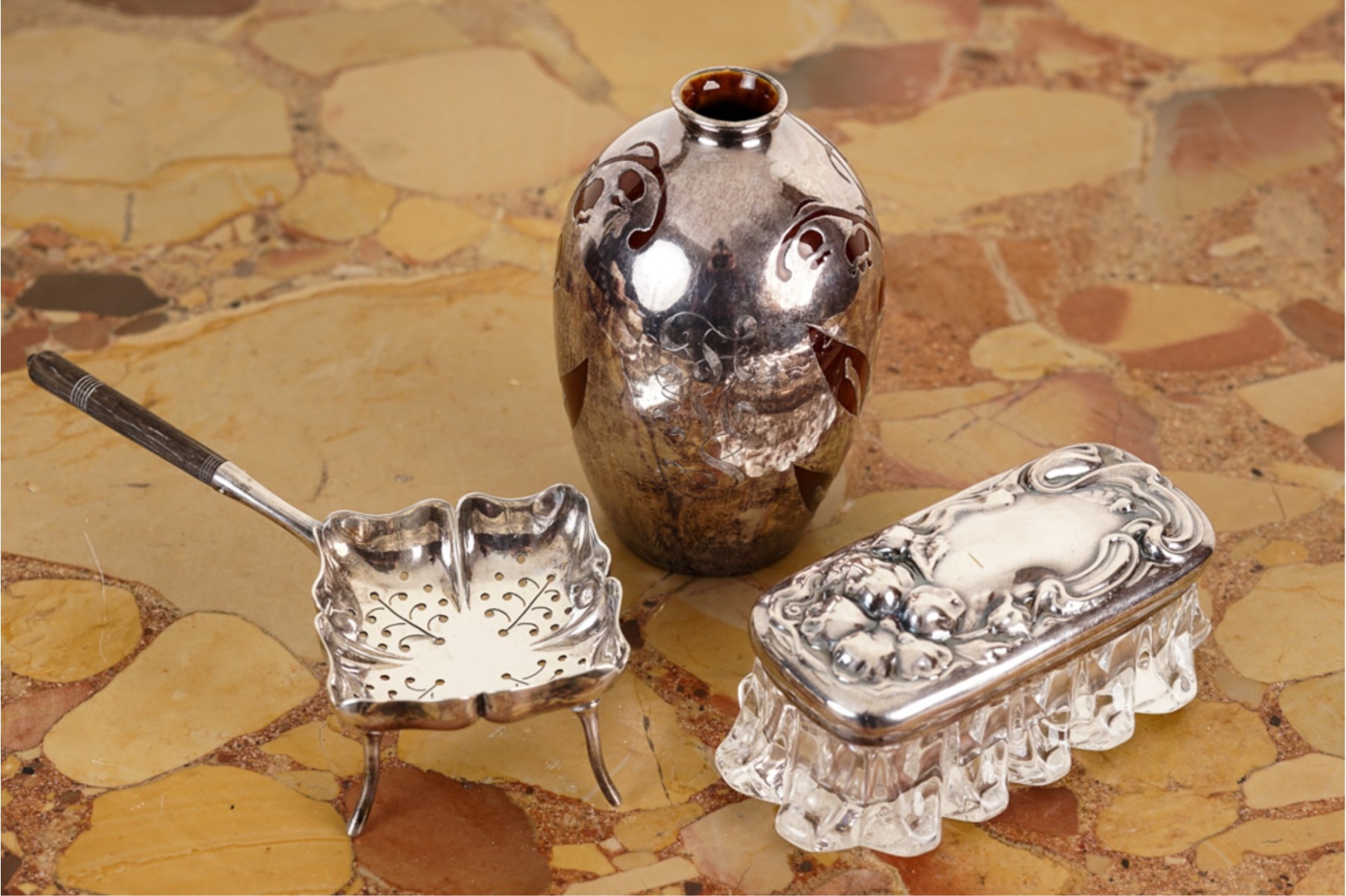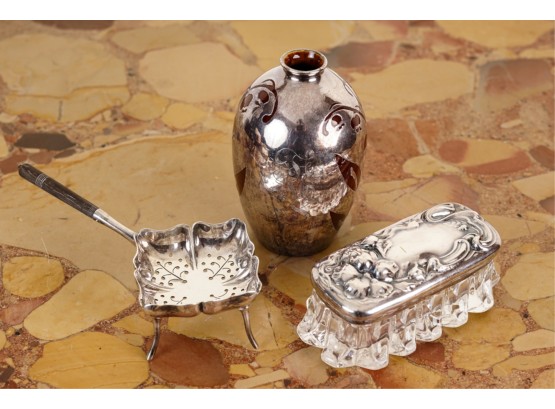 Art nouveau glass box with sterling lid, Tea strainer with turned handle and English pottery vase with sterling overlay. Tallest measures 4 inches.