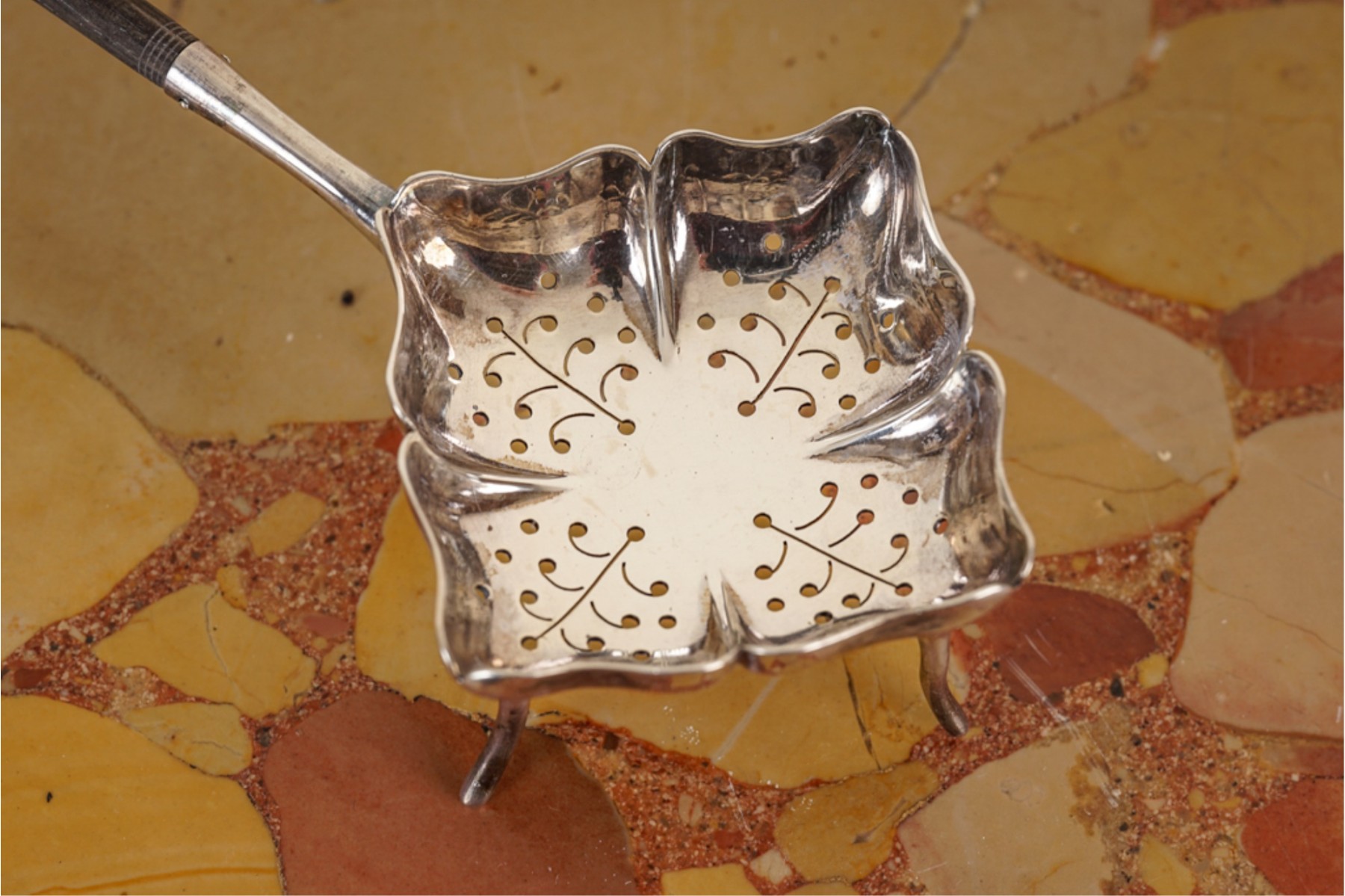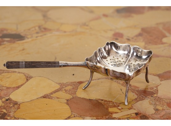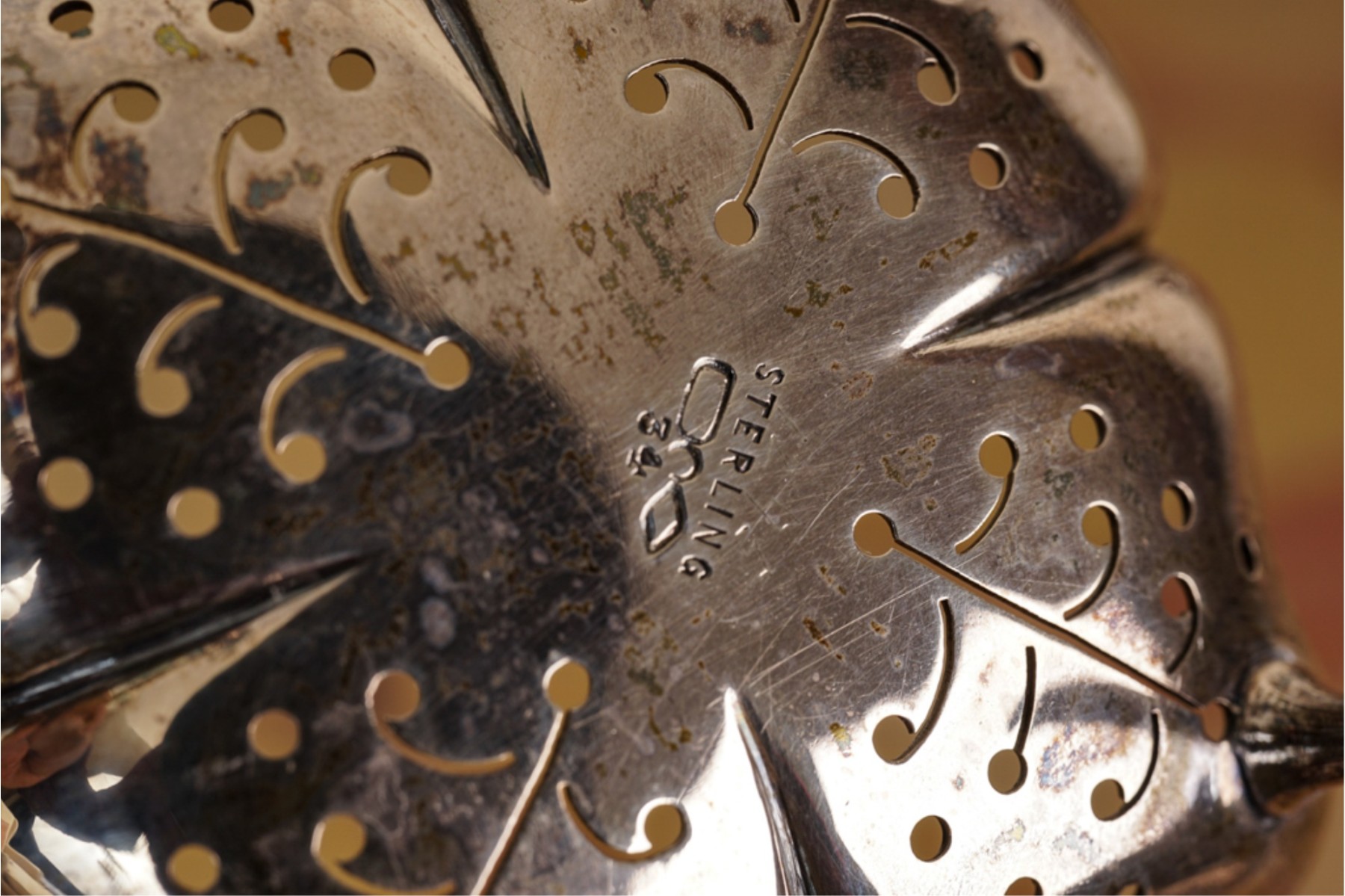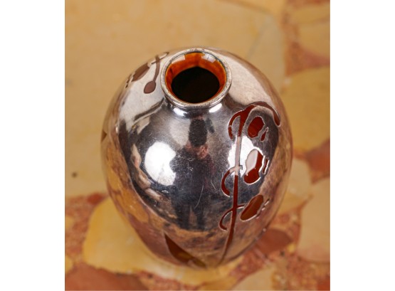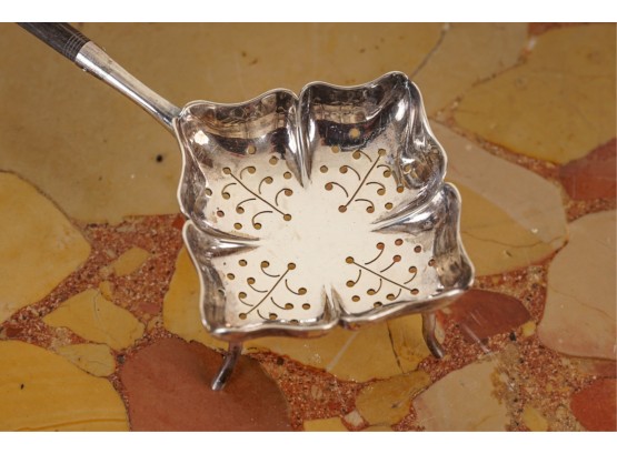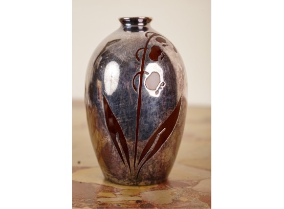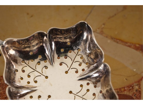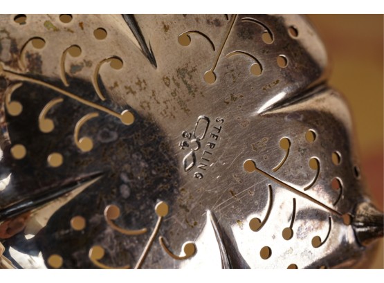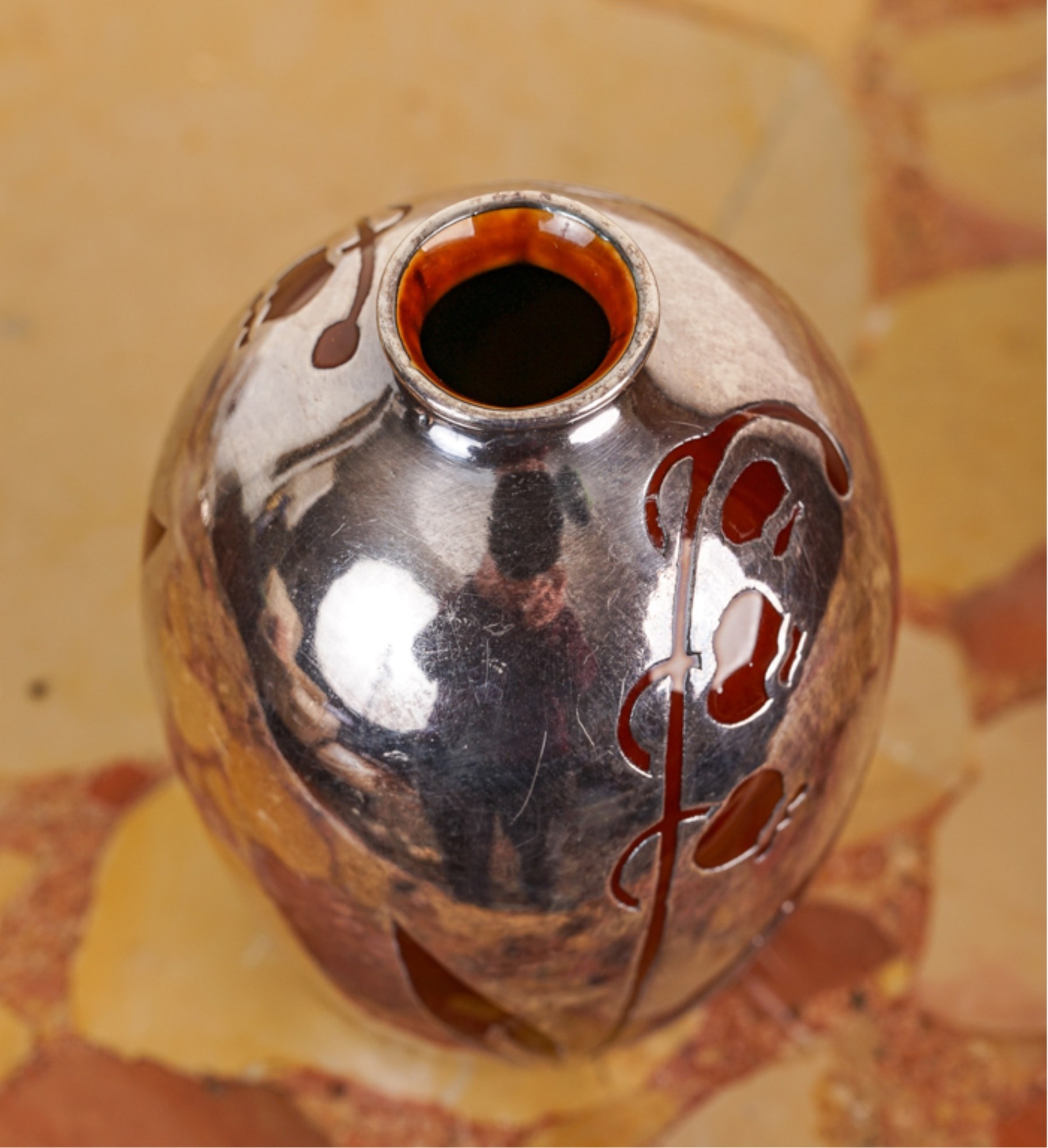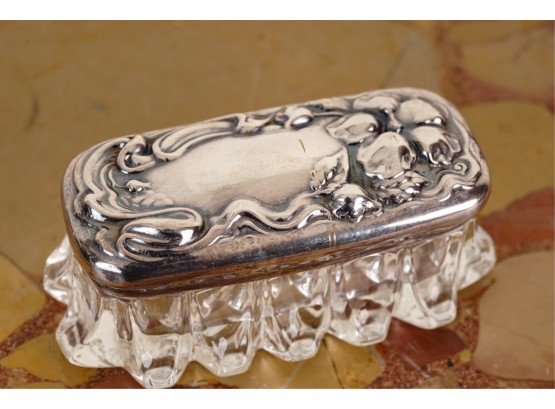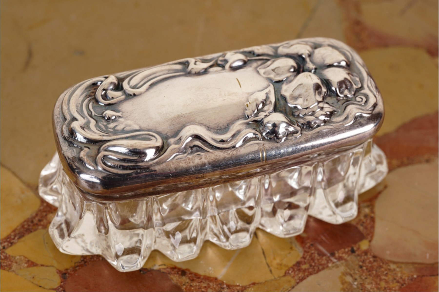 Art nouveau glass box with sterling lid, Tea strainer with turned handle and English pottery vase with sterling overlay. Tallest measures 4 inches.