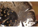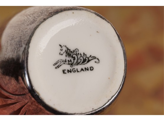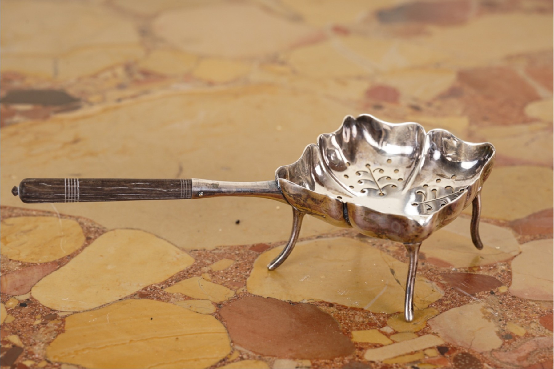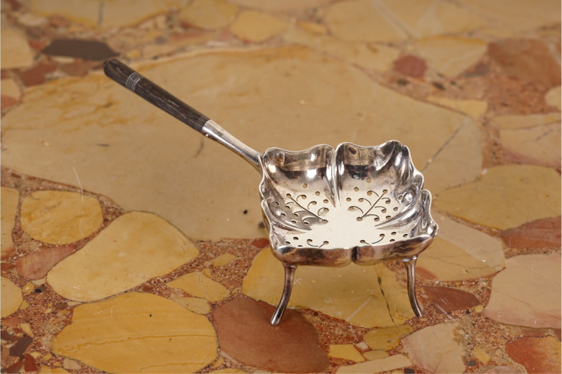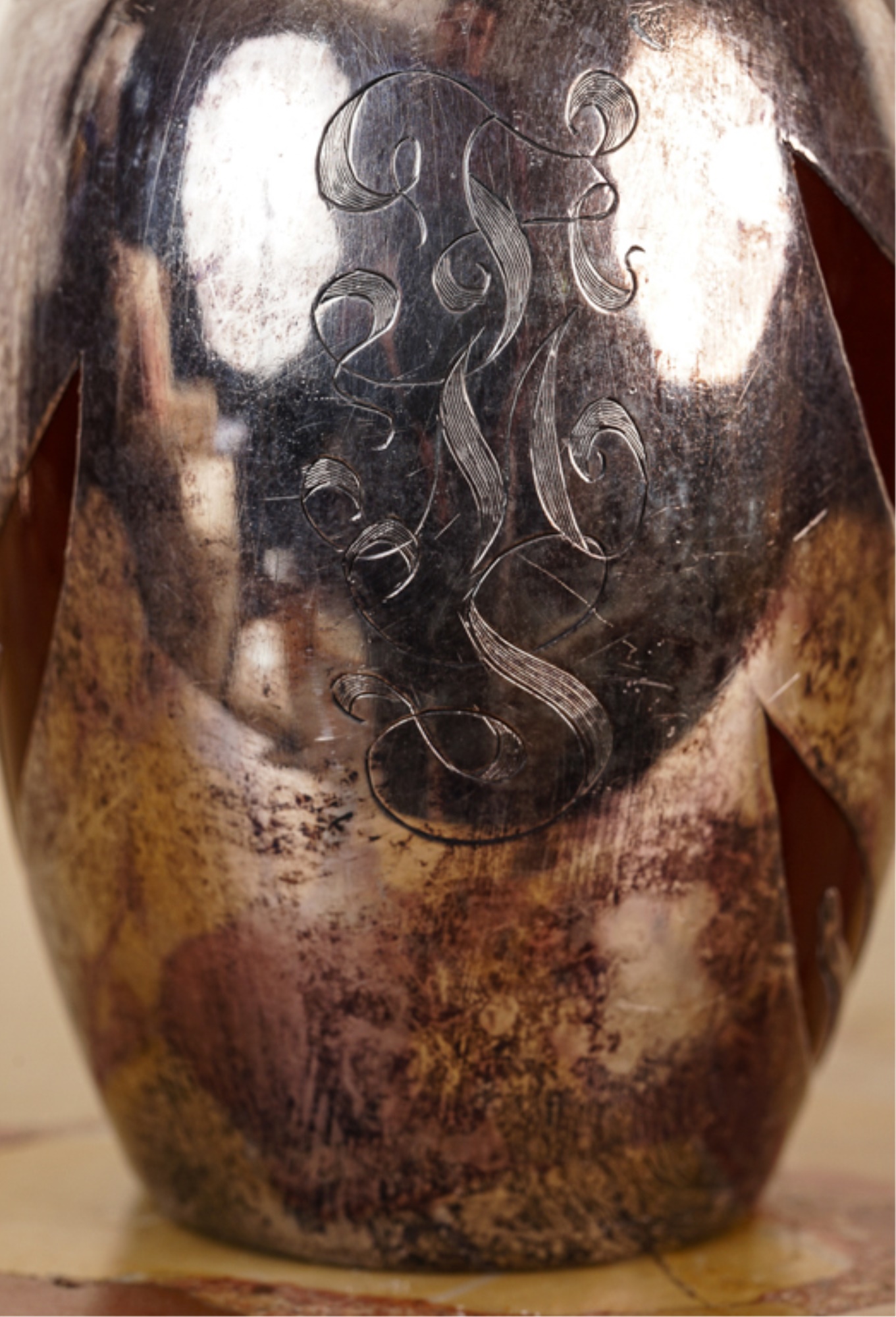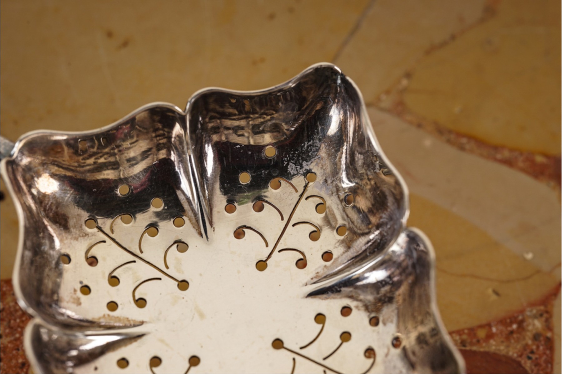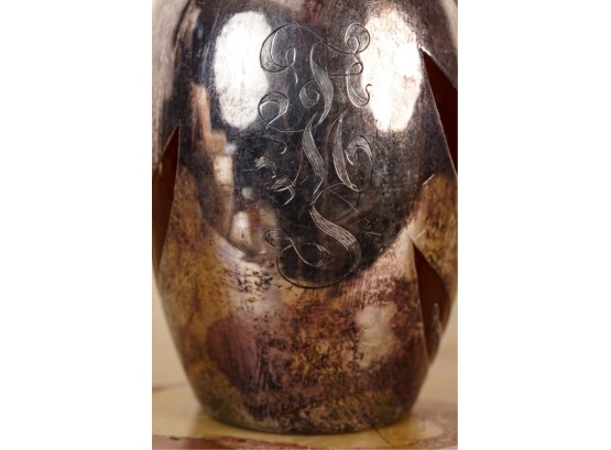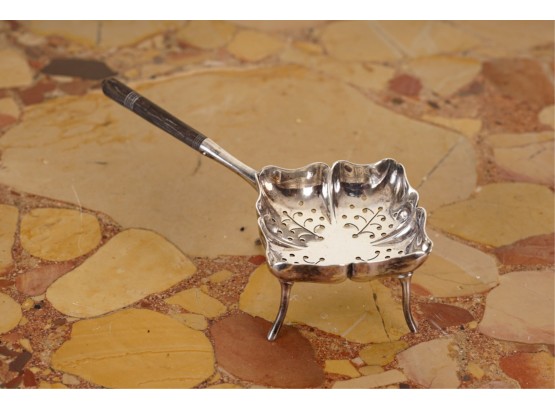 Art nouveau glass box with sterling lid, Tea strainer with turned handle and English pottery vase with sterling overlay. Tallest measures 4 inches.