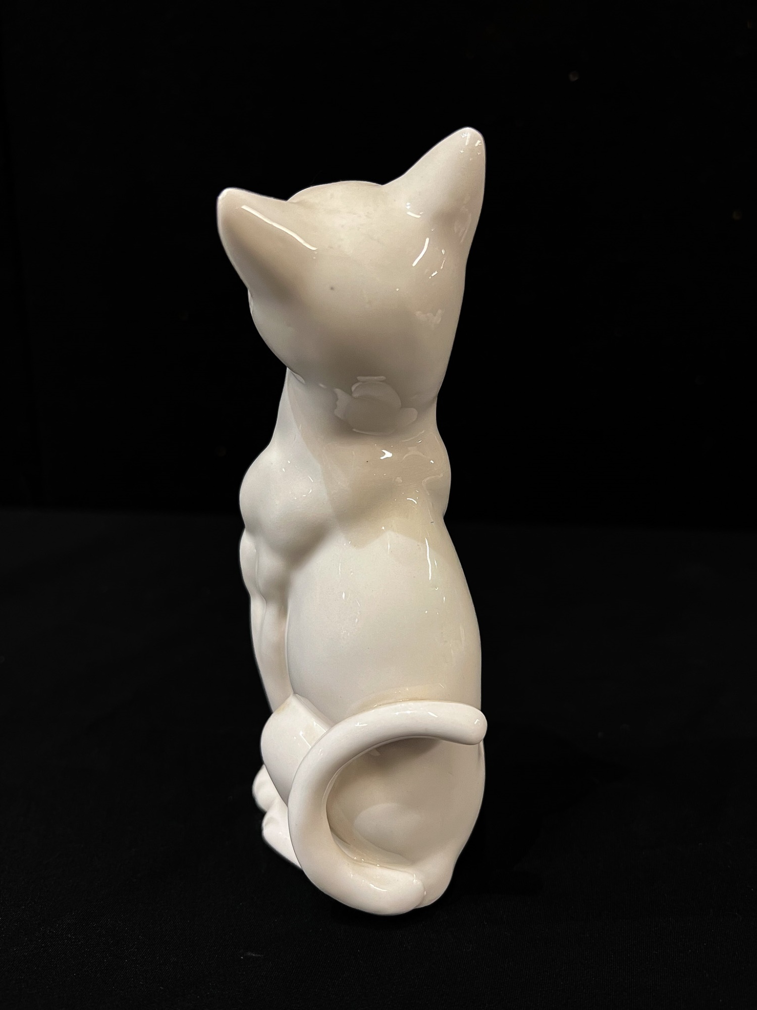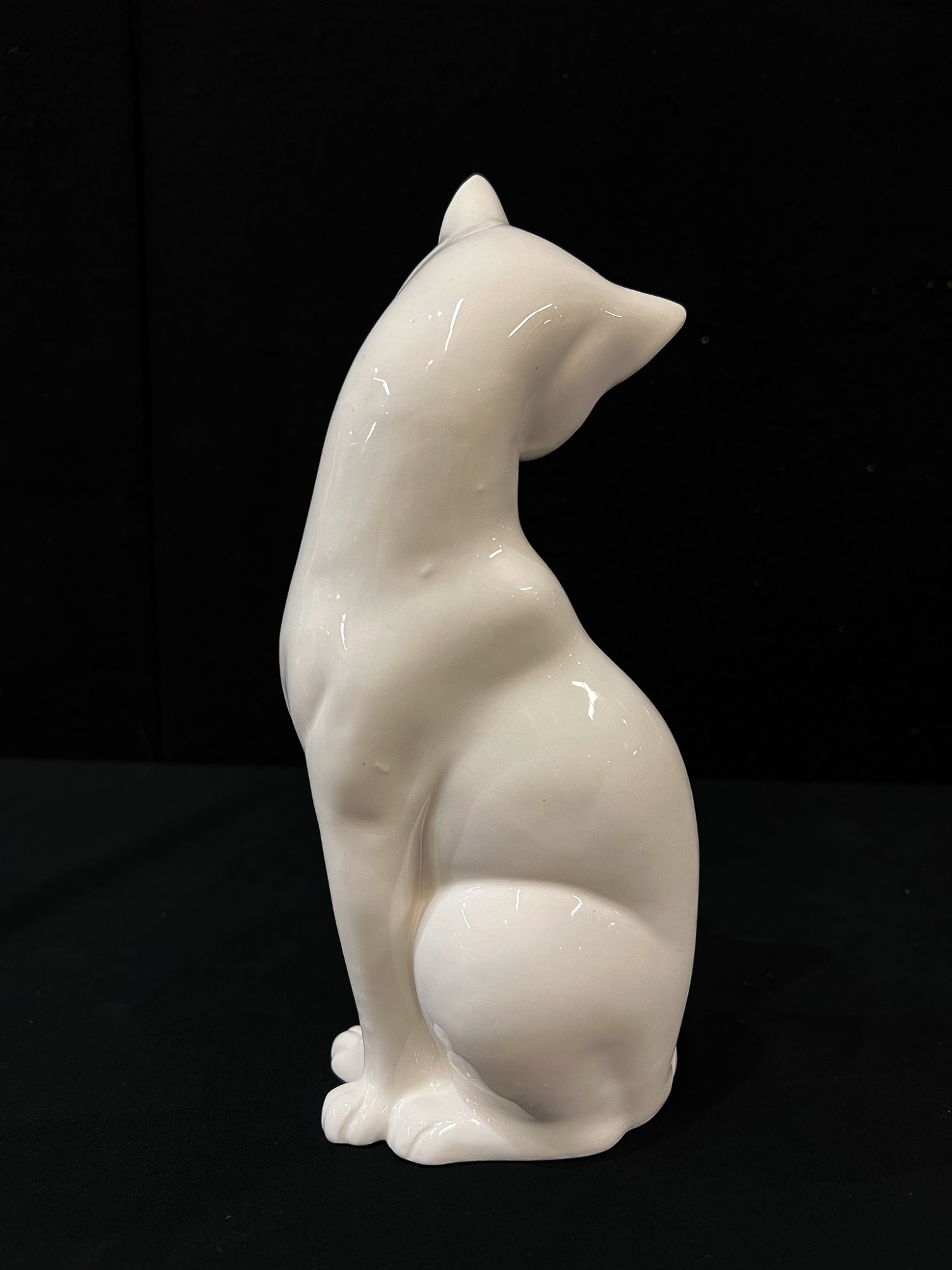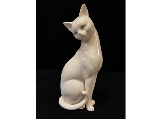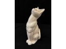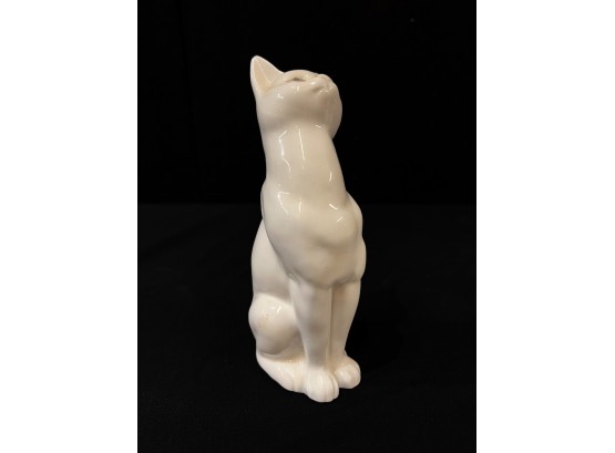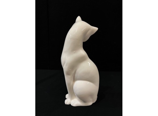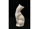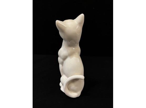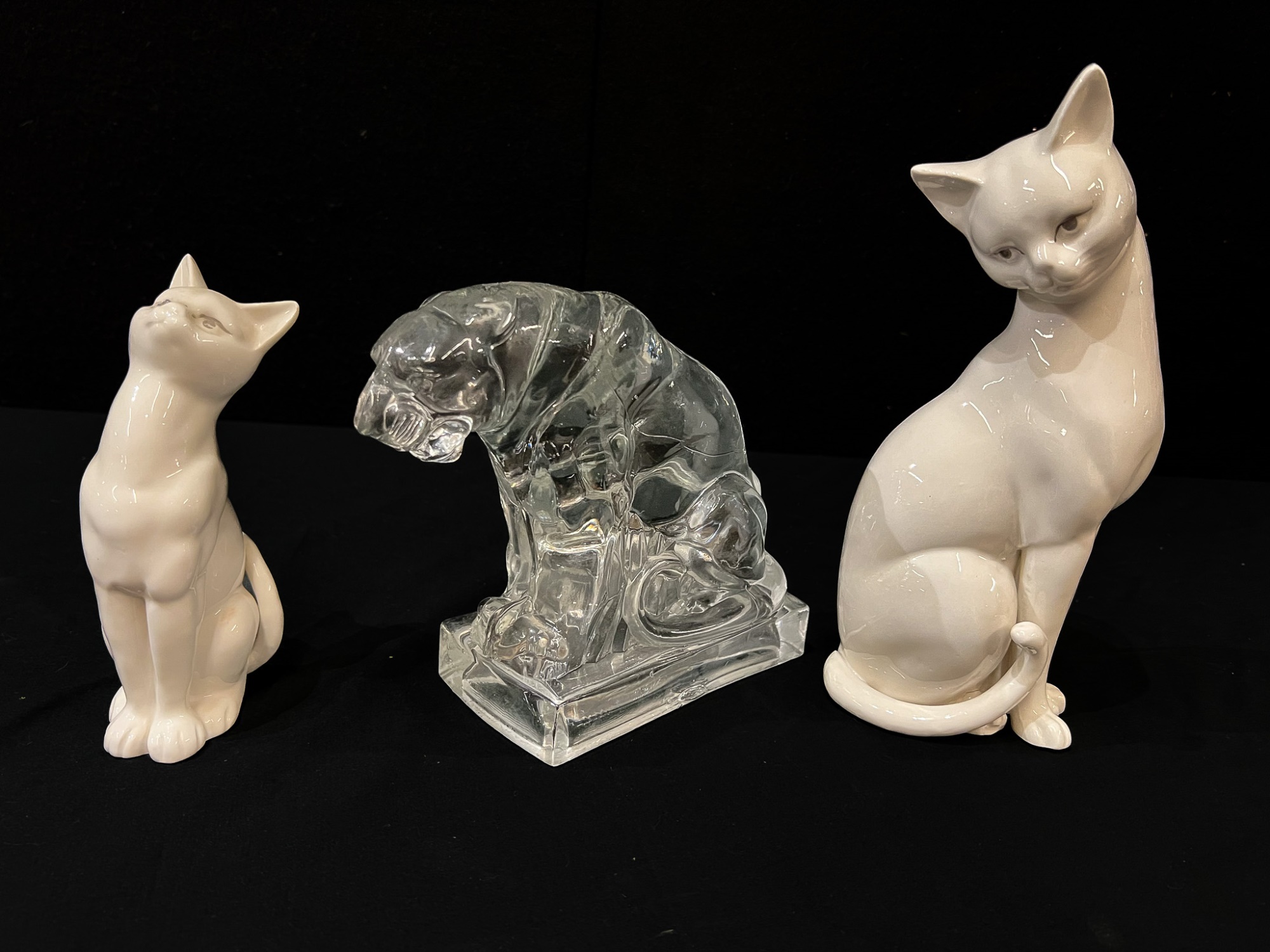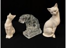 (2) white ceramic cats and a glass lion. Tallest cat 10"