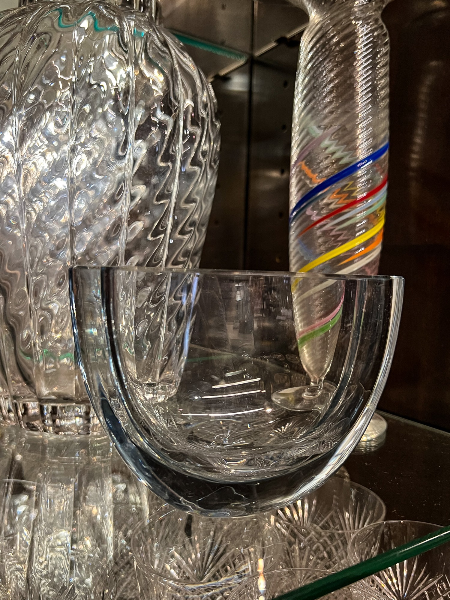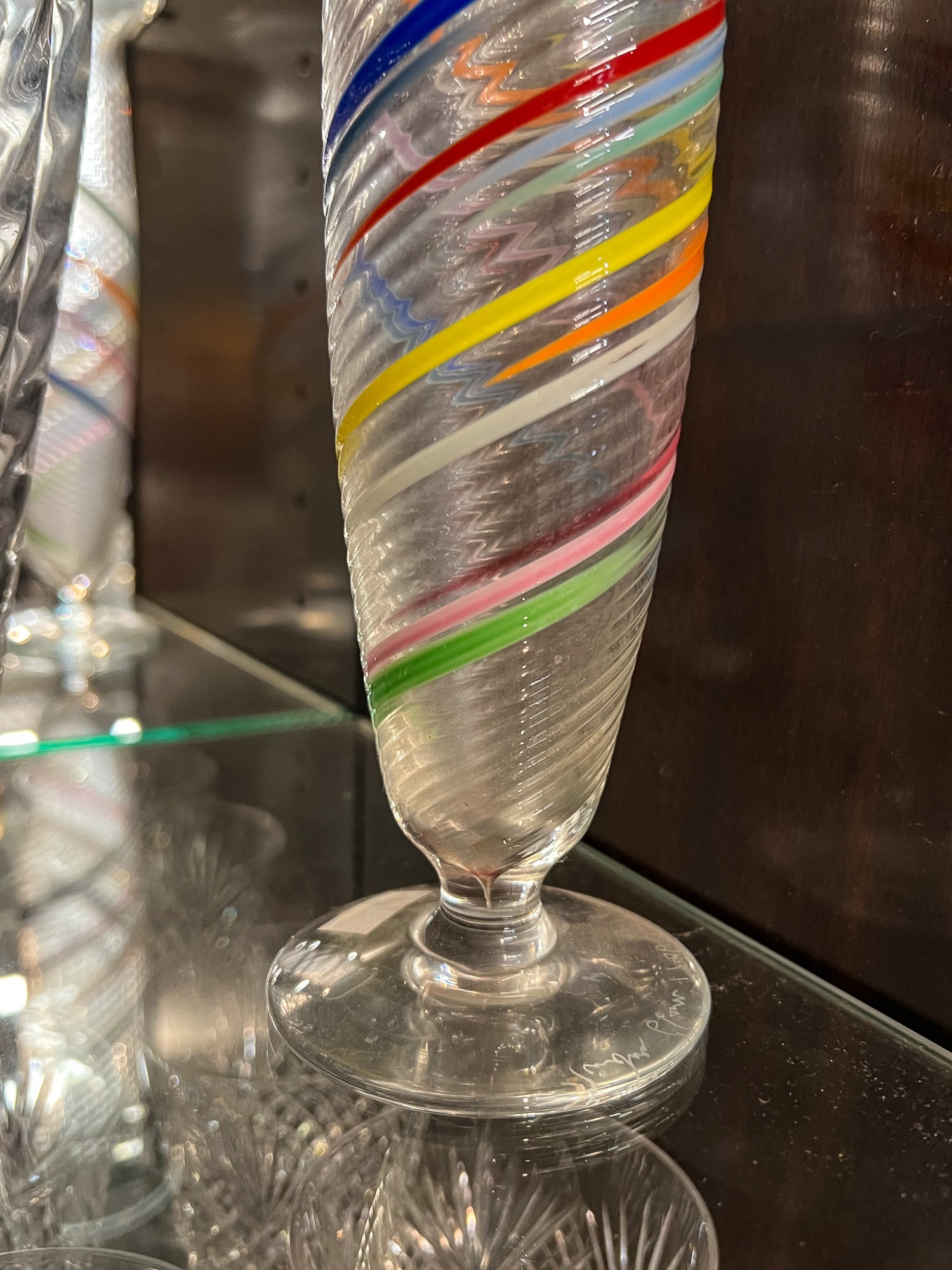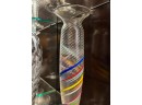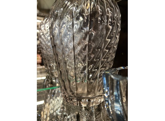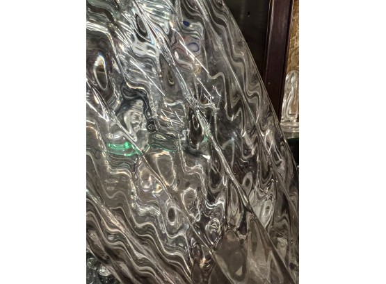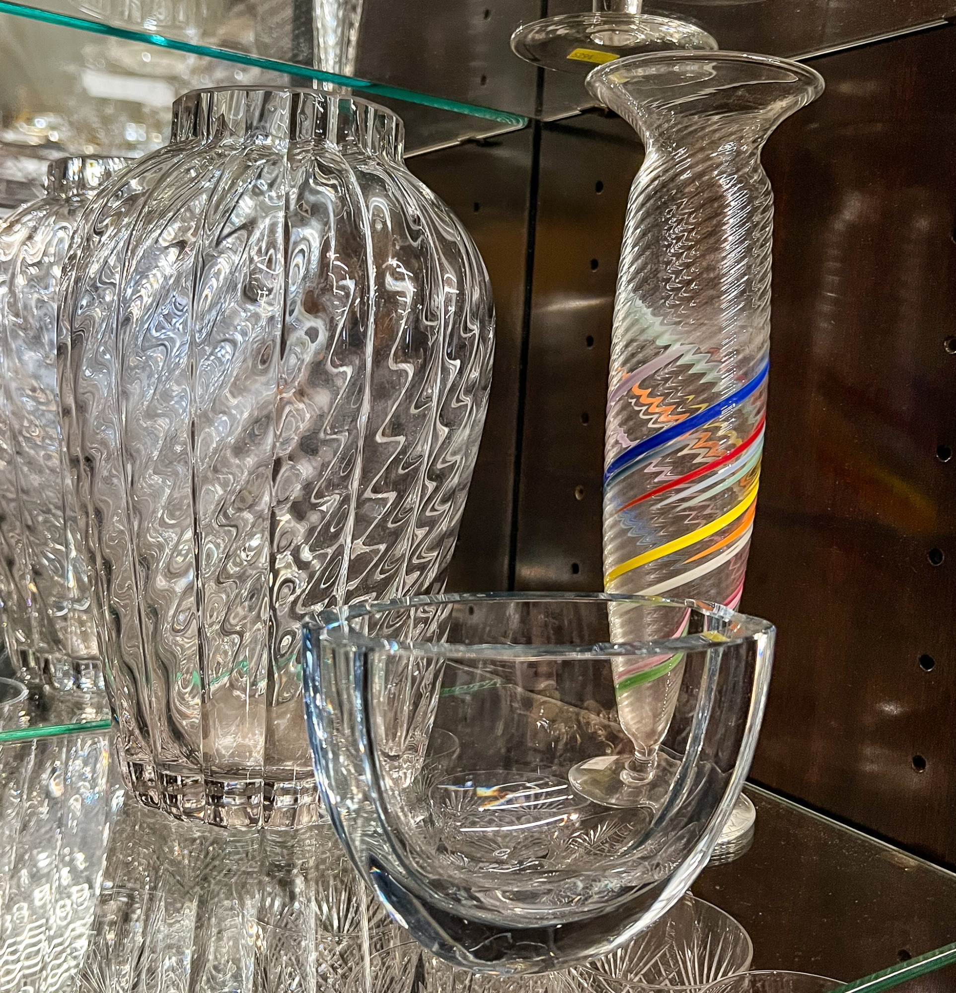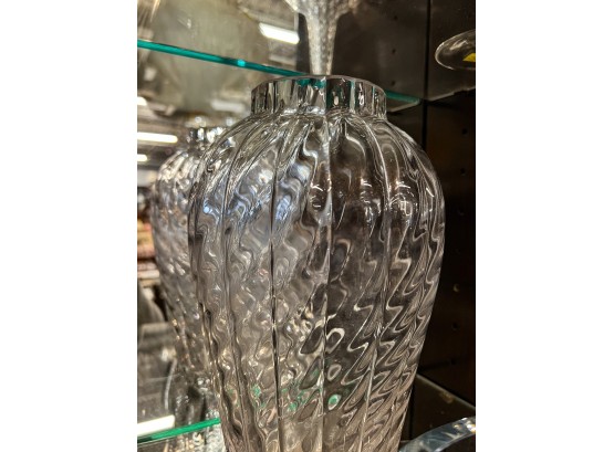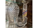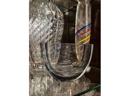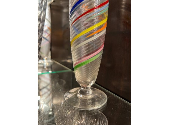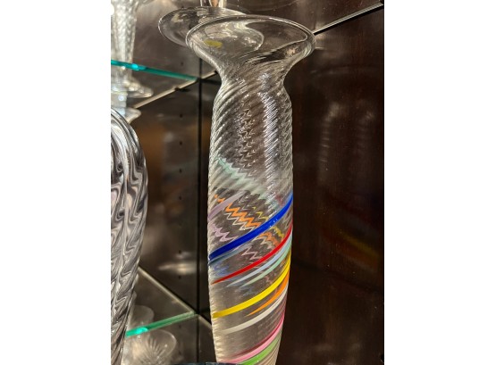 Including fine quality heavy molded tall vase 10" x 6" dia, low blue tinted unsigned vase and multi color signed and dated 1986 vase 11" x 3 1/2" dia