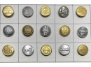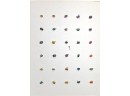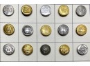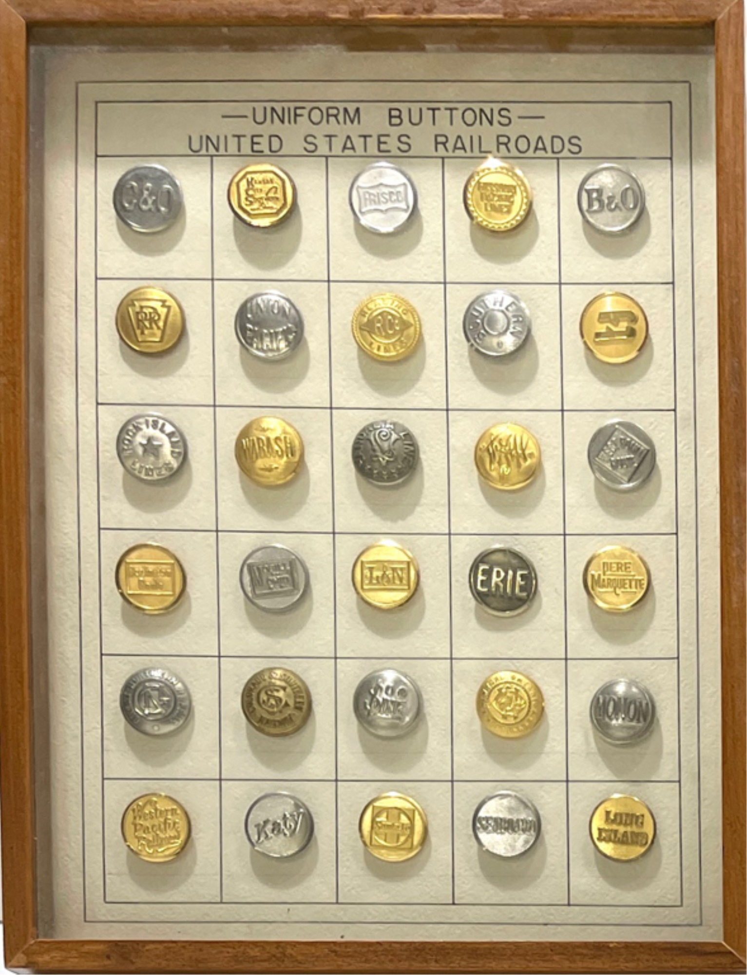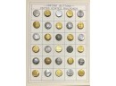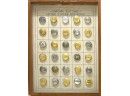 Metal buttons housed in a carved wooden shadow box frame. 12 1/2" x 9 1/2" x 1 1/4"