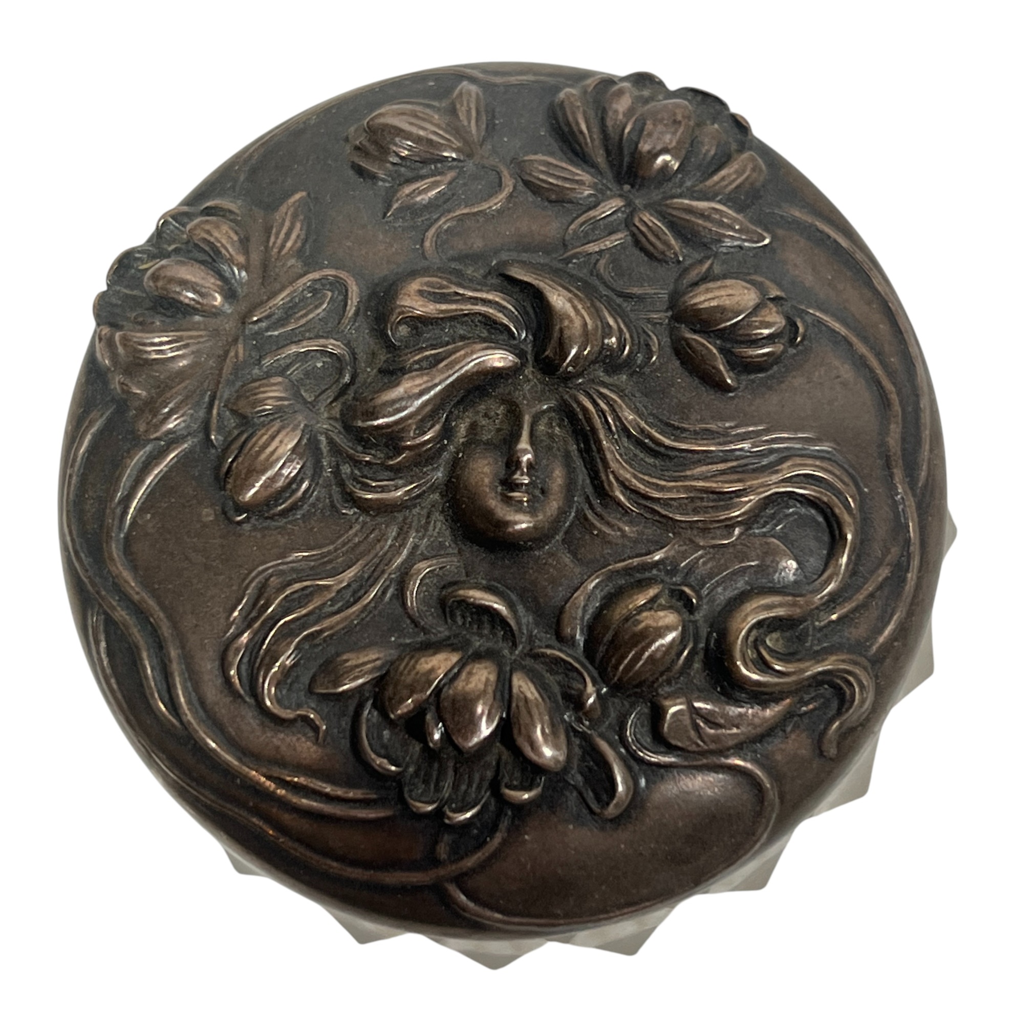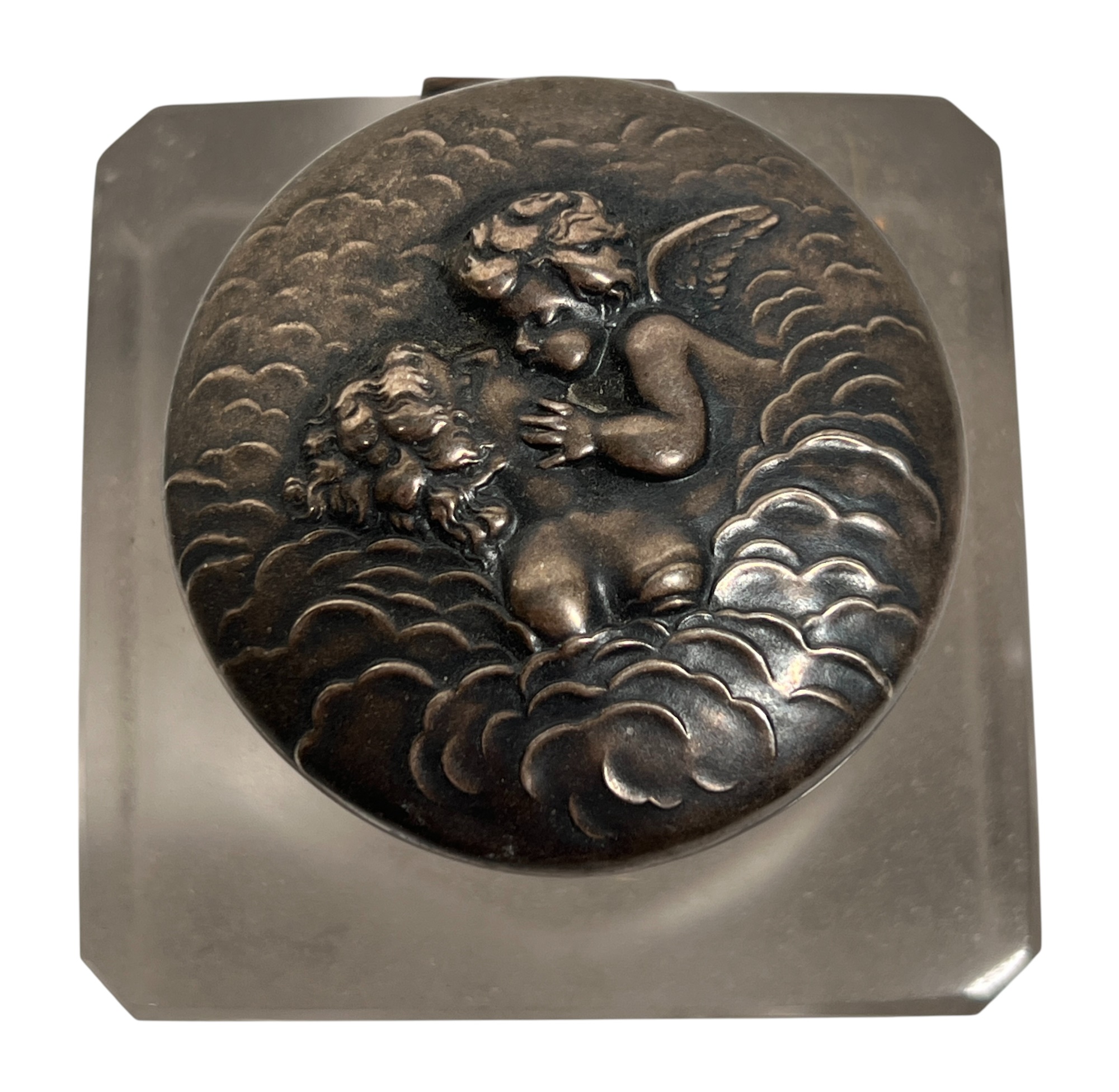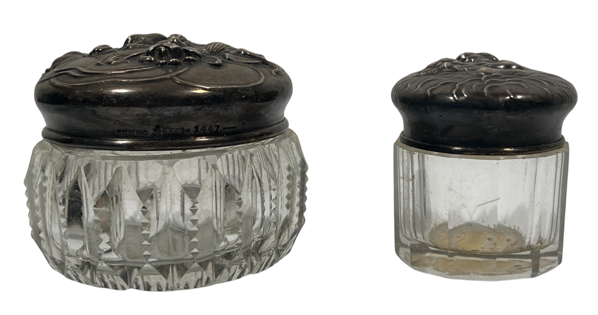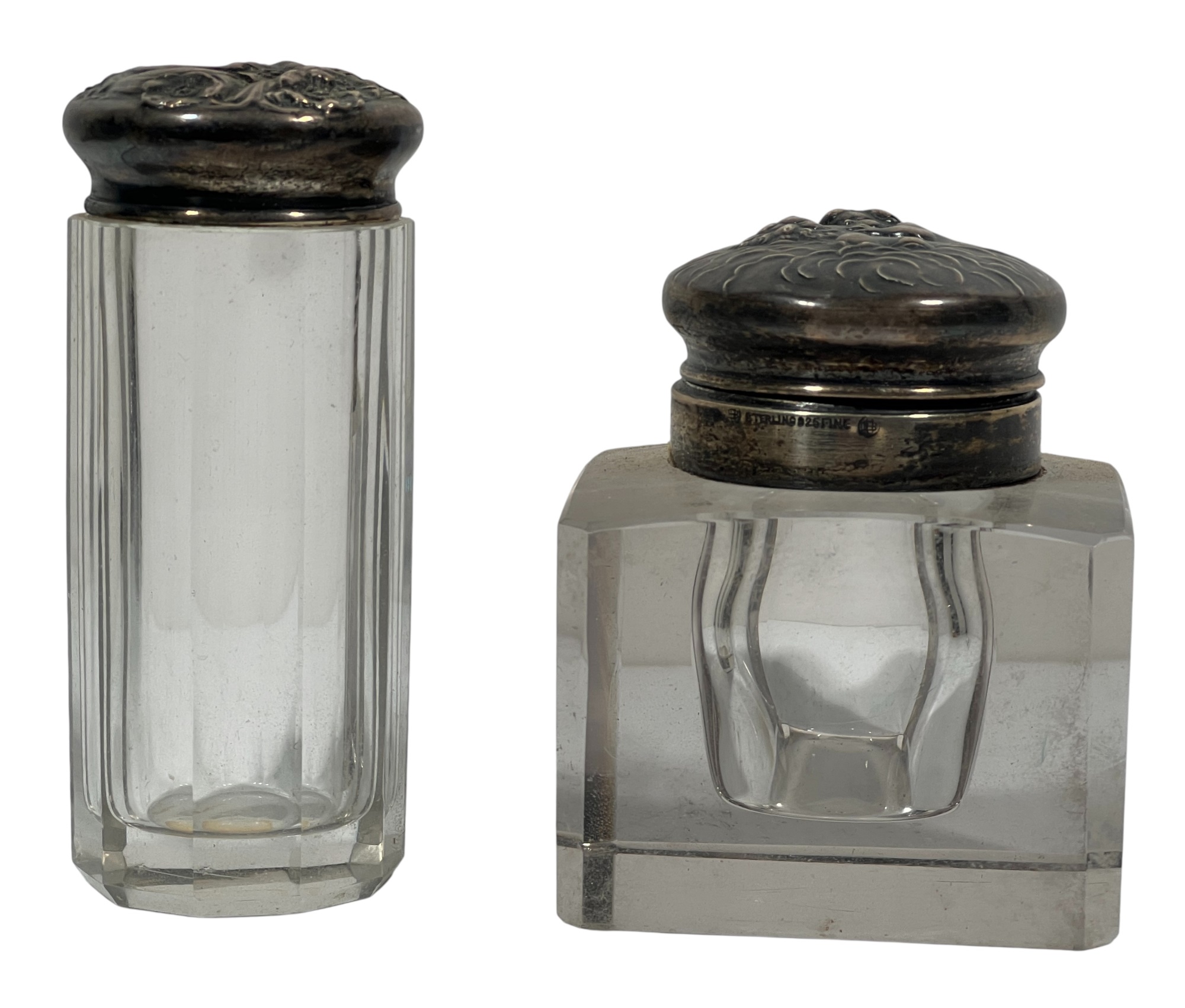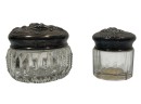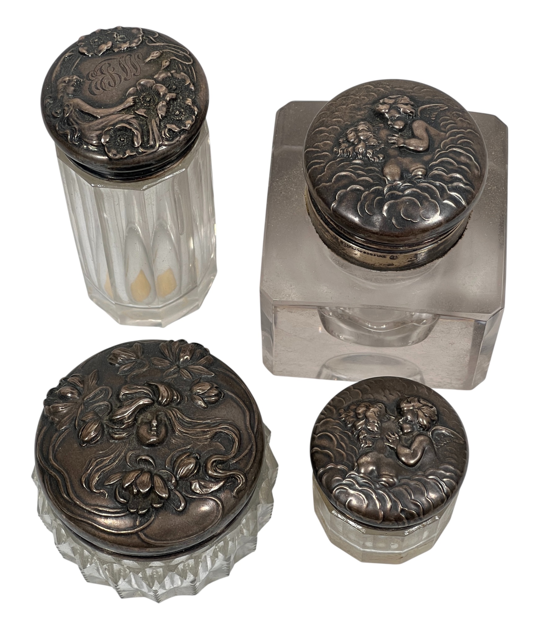 Inkwell and (3) jars with sterling covers featuring fair maidens, cherubs, and other Art Nouveau motifs. 3 1/2 inches. 1.22 ozt weighable silver (sterling inkwell cover fixed to crystal base). Condition: Good.