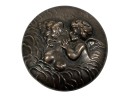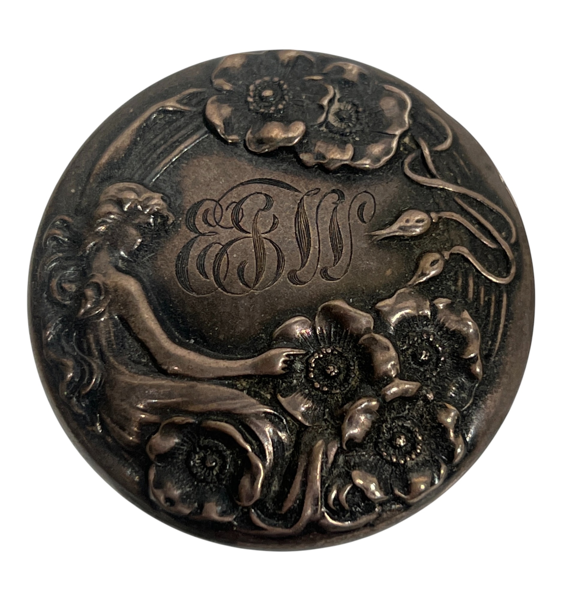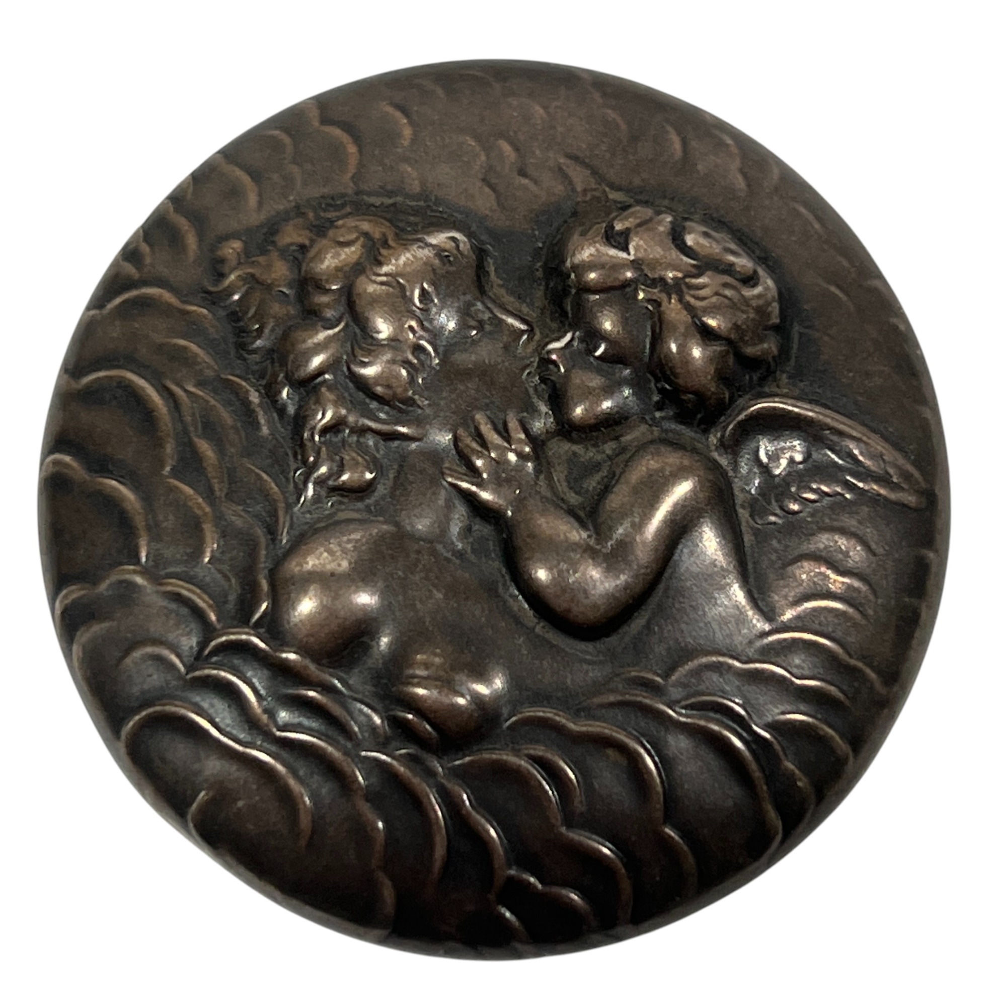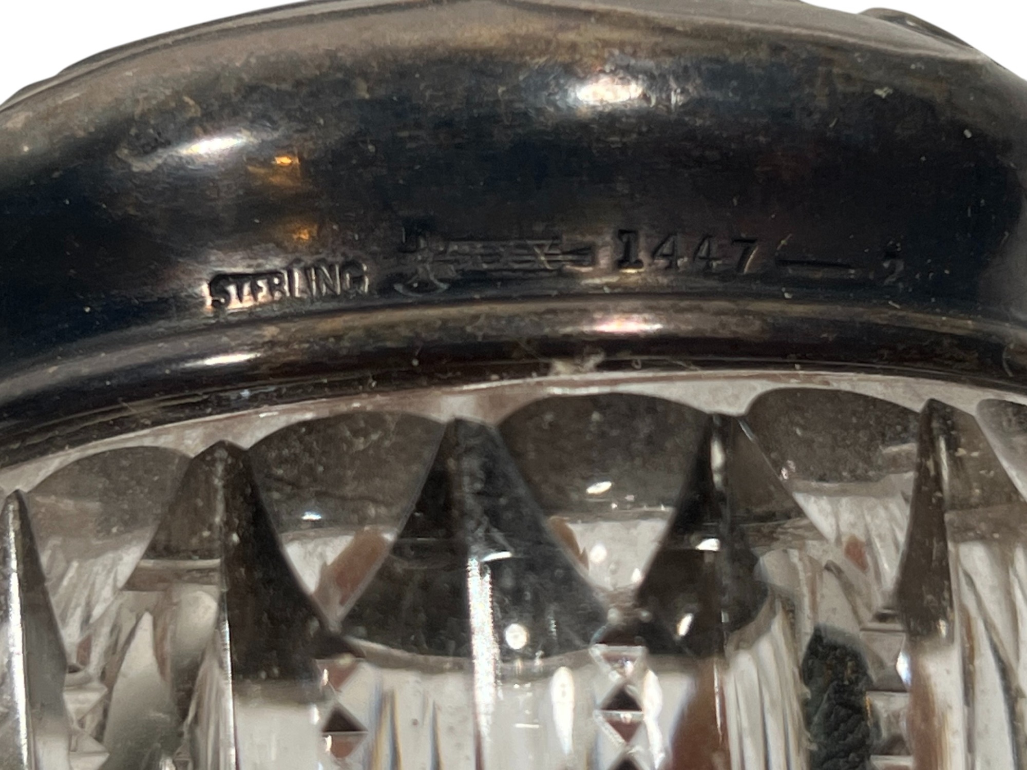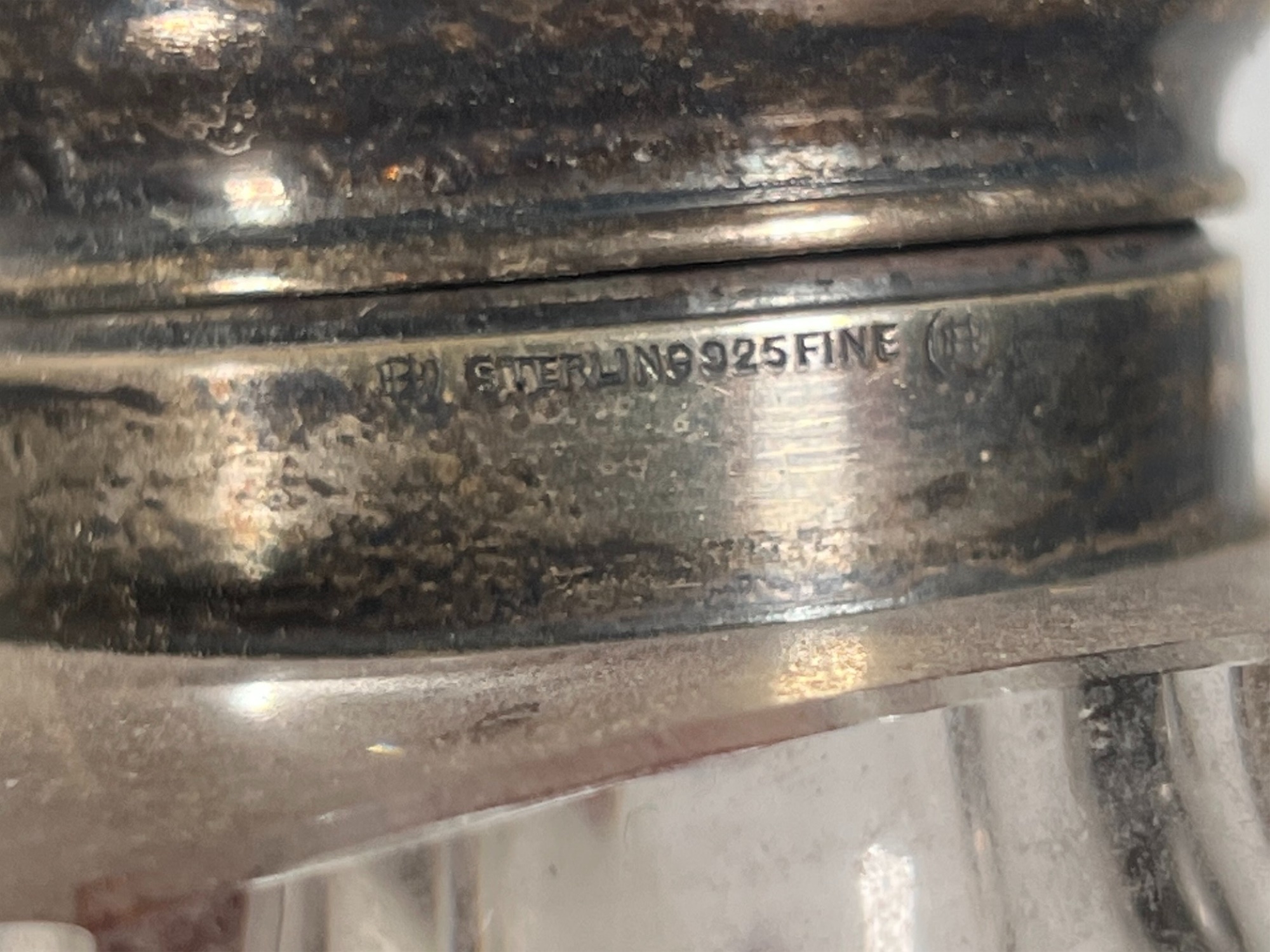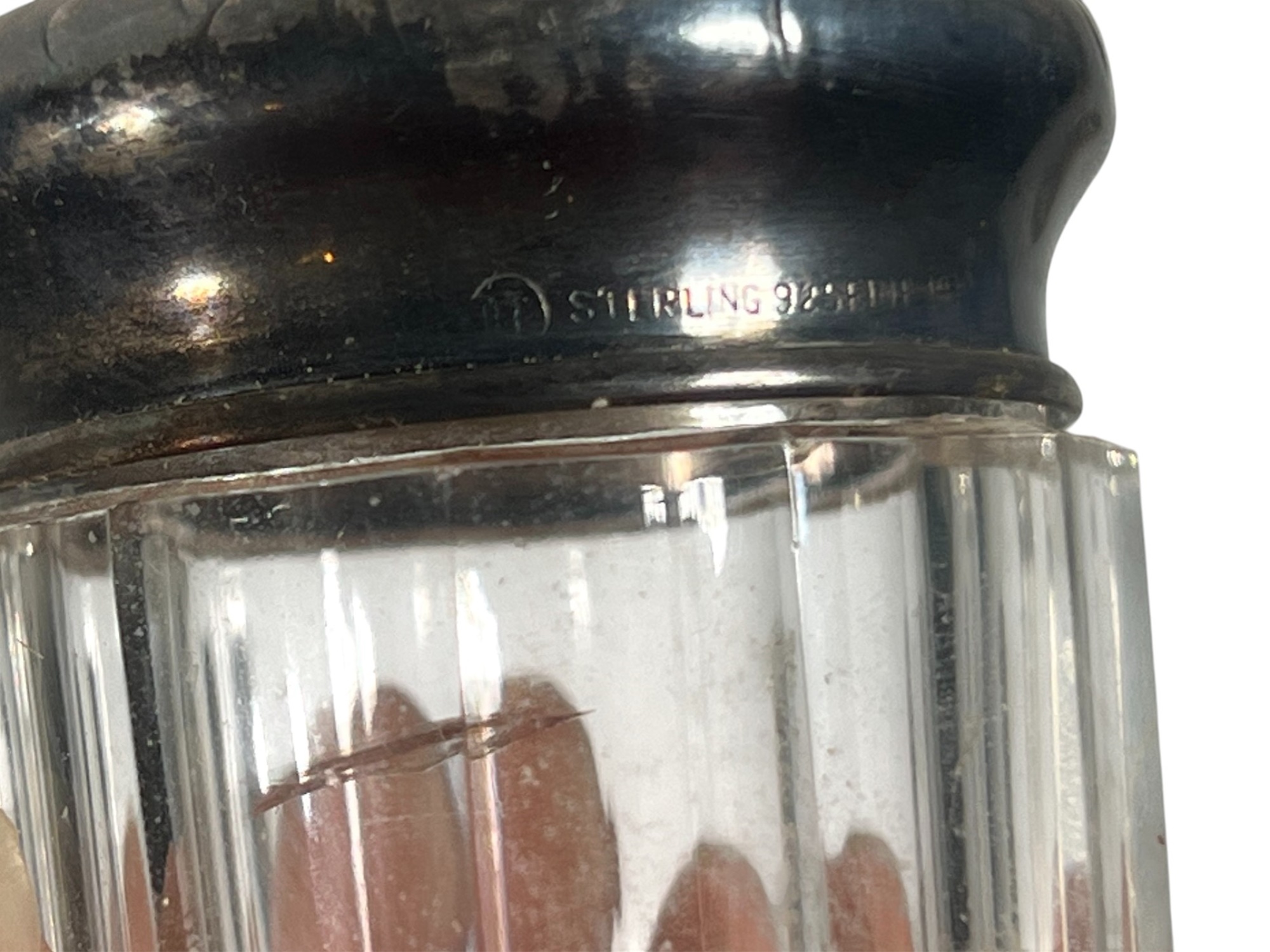 Inkwell and (3) jars with sterling covers featuring fair maidens, cherubs, and other Art Nouveau motifs. 3 1/2 inches. 1.22 ozt weighable silver (sterling inkwell cover fixed to crystal base). Condition: Good.