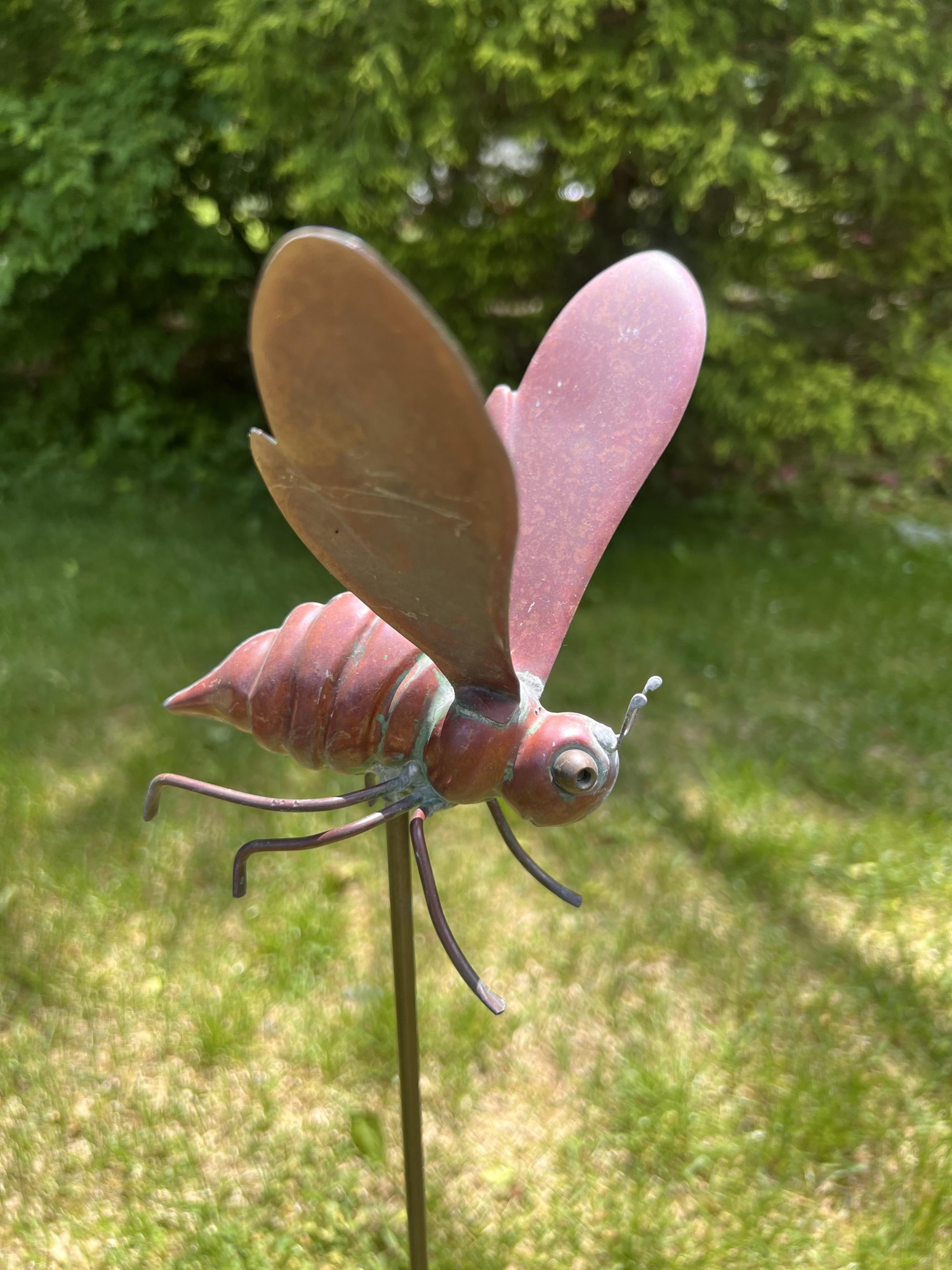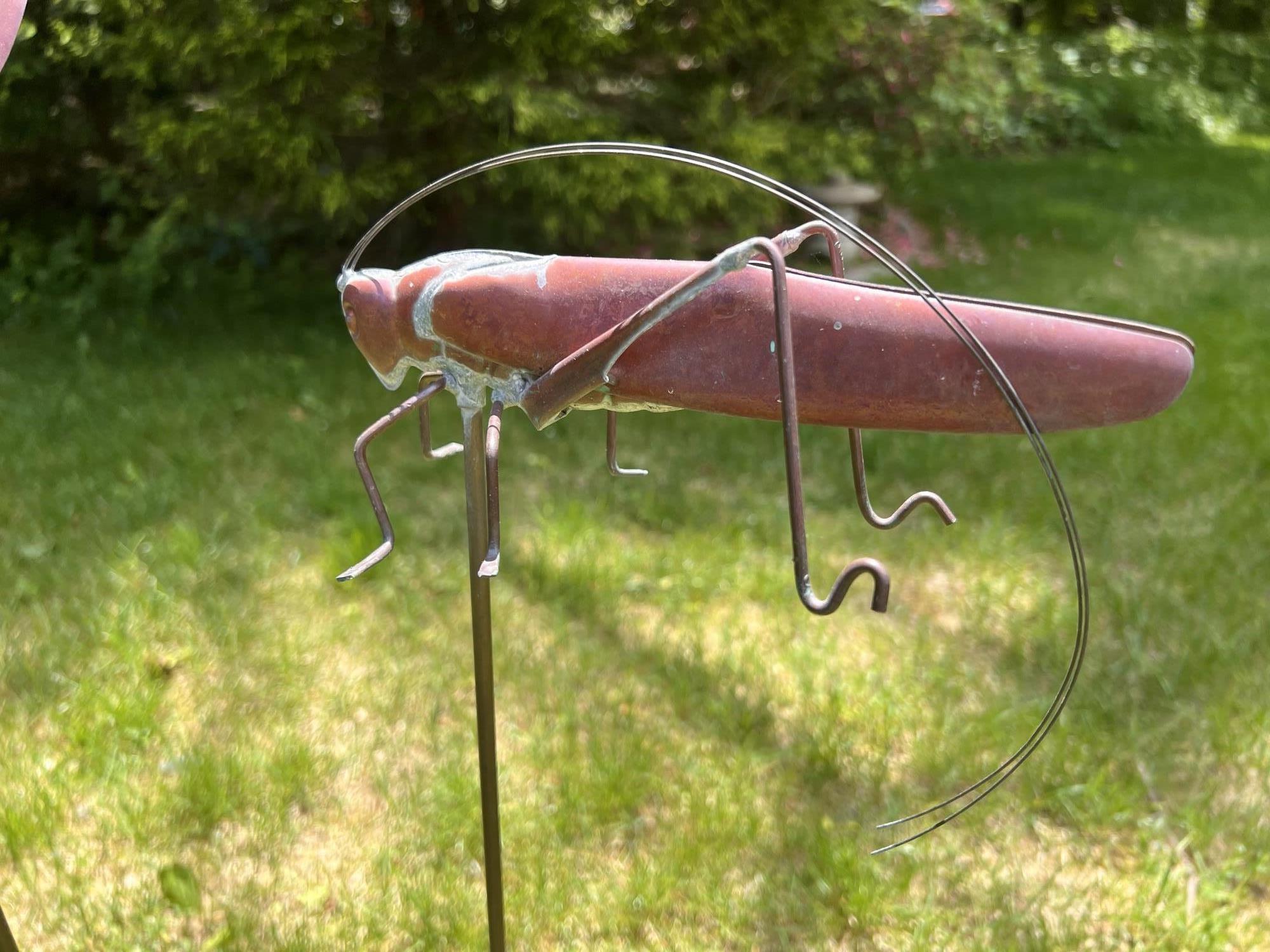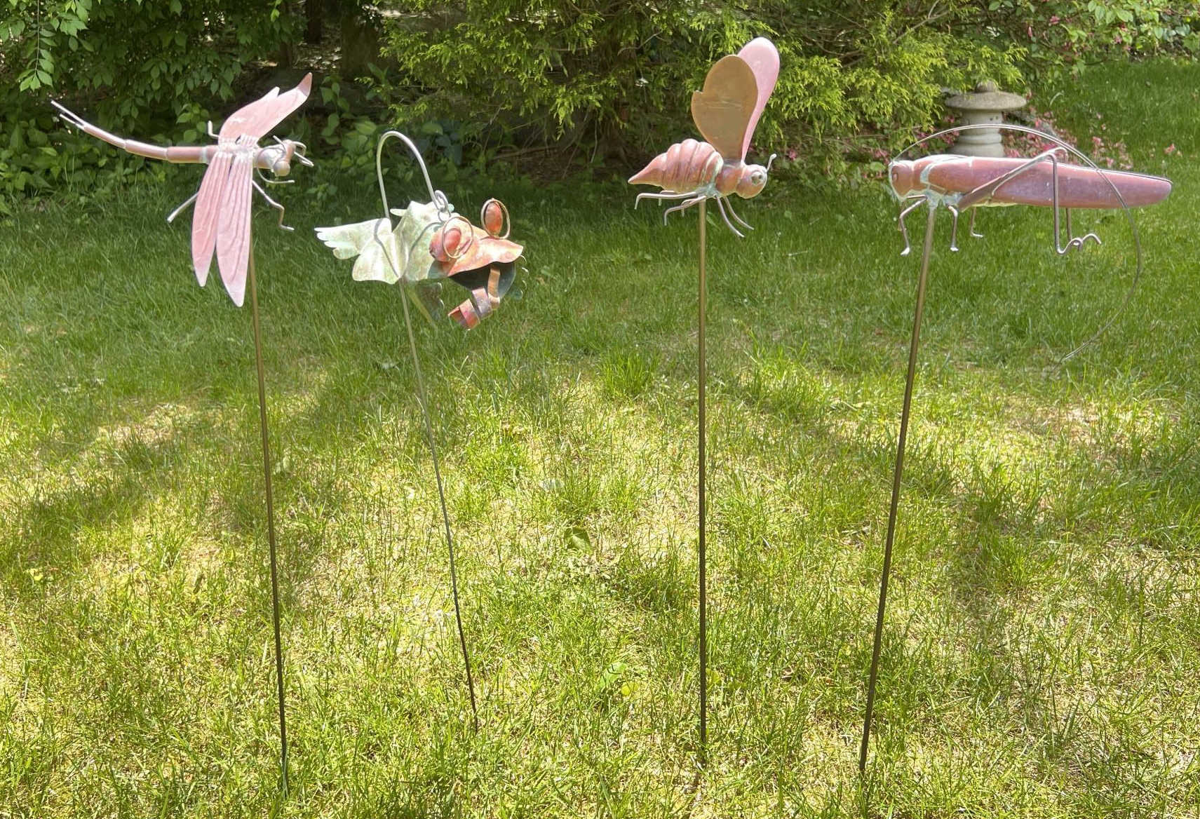 Frog, Bee, Dragonfly, Cricket. 6 to 8.5 inches on 30 inch stakes Condition: Good, weathering