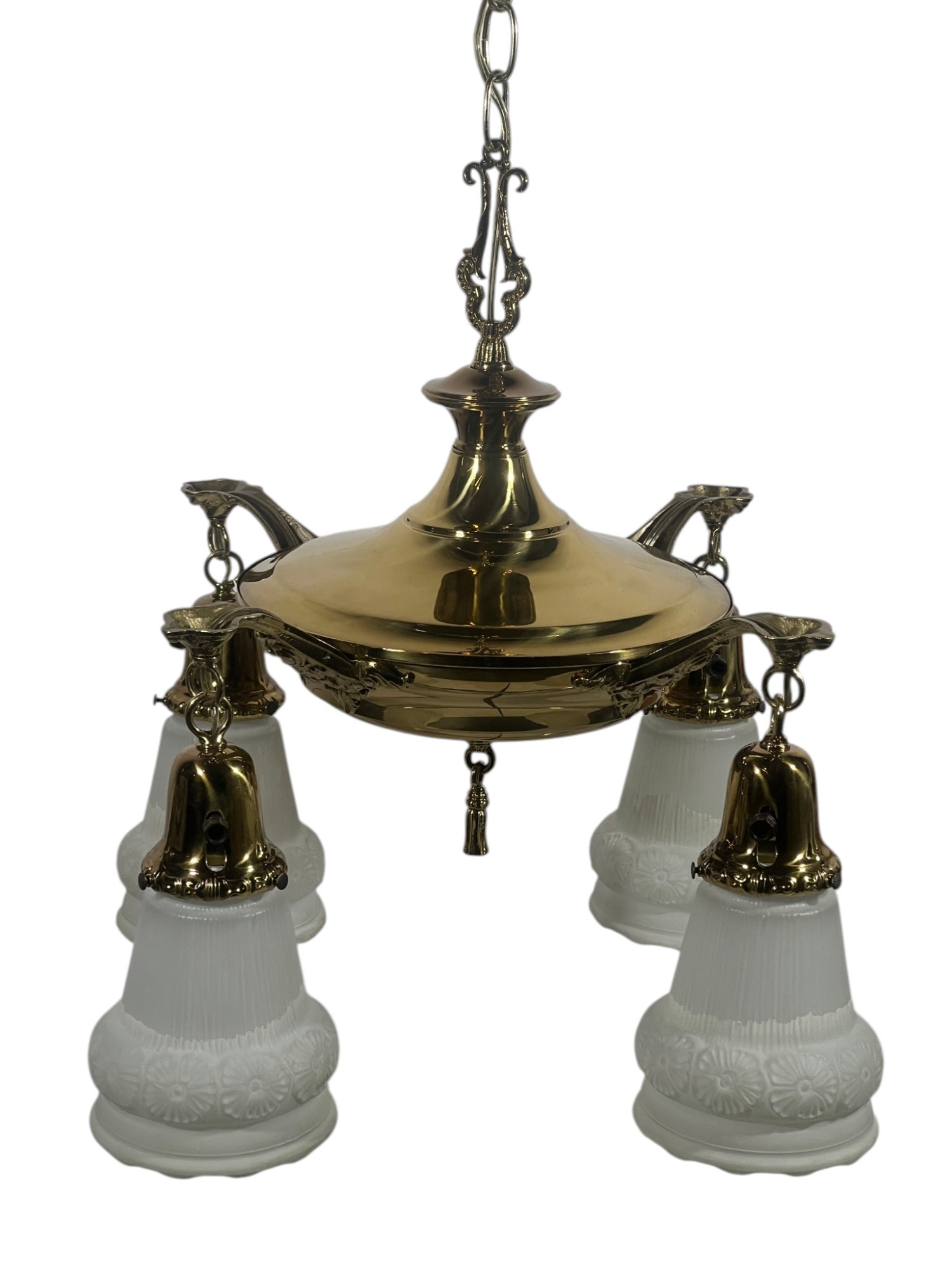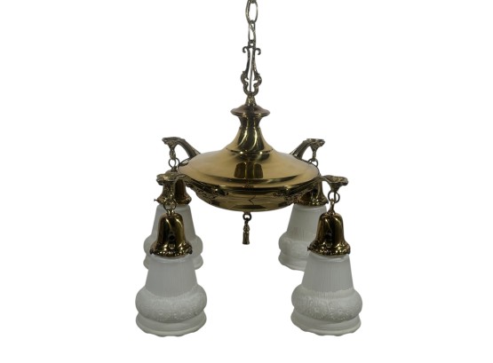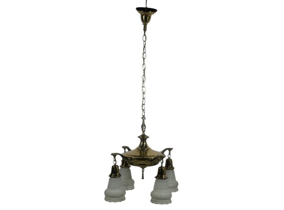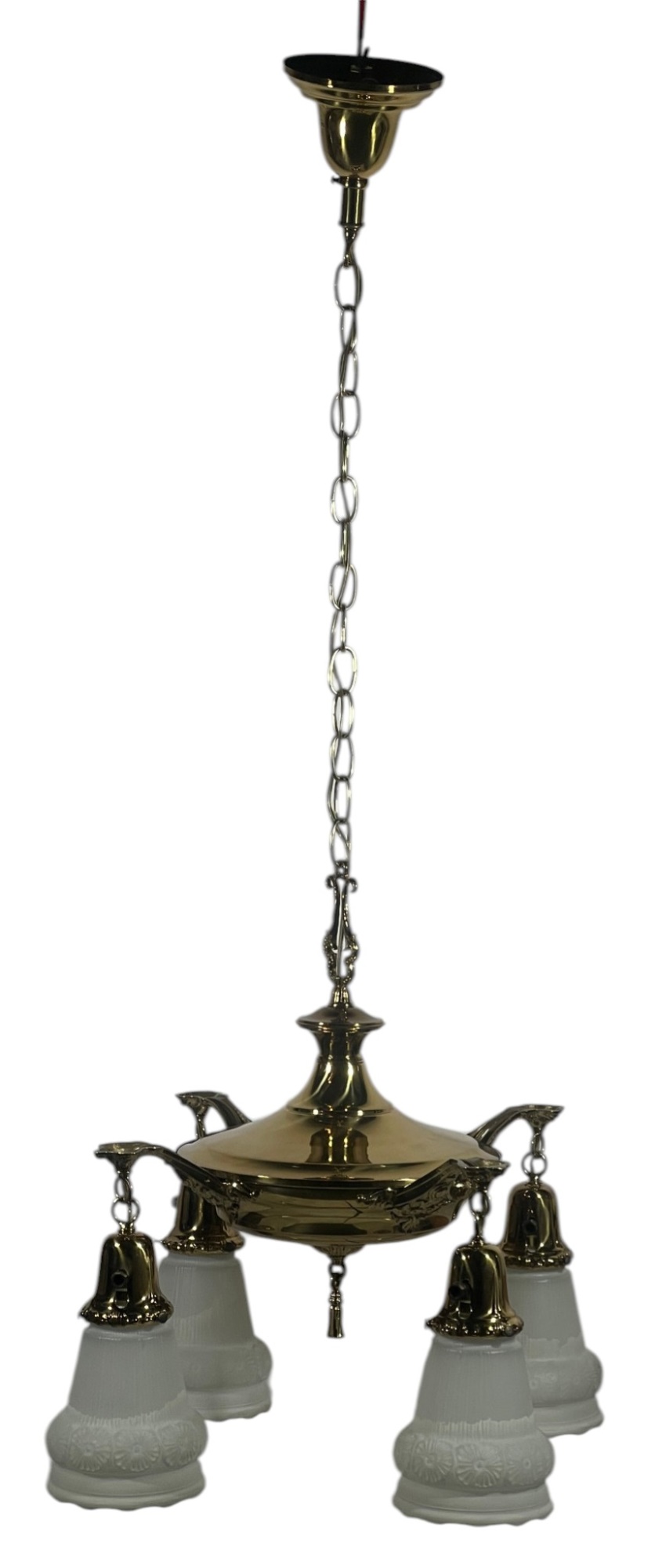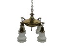 With nicely cast brass arms and frosted pressed glass floral shades. 41 x 17 inches. Condition: Untested, flaking to finish/paint on shades. Temp No 8735