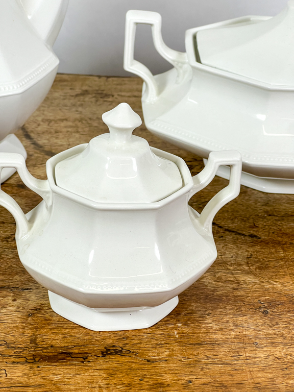 Tureen, Chocolate pot, teapot, and sugar. Tallest measures 10 3/8 inches.