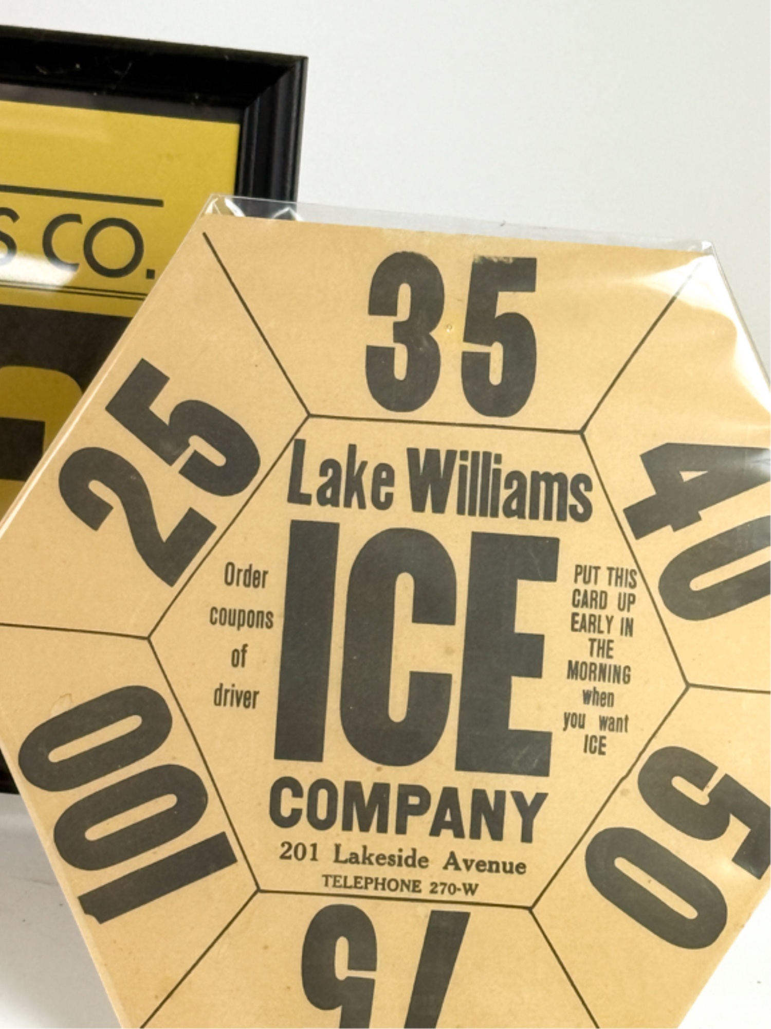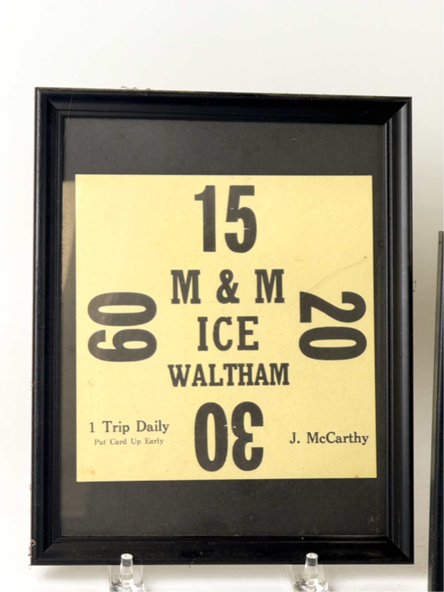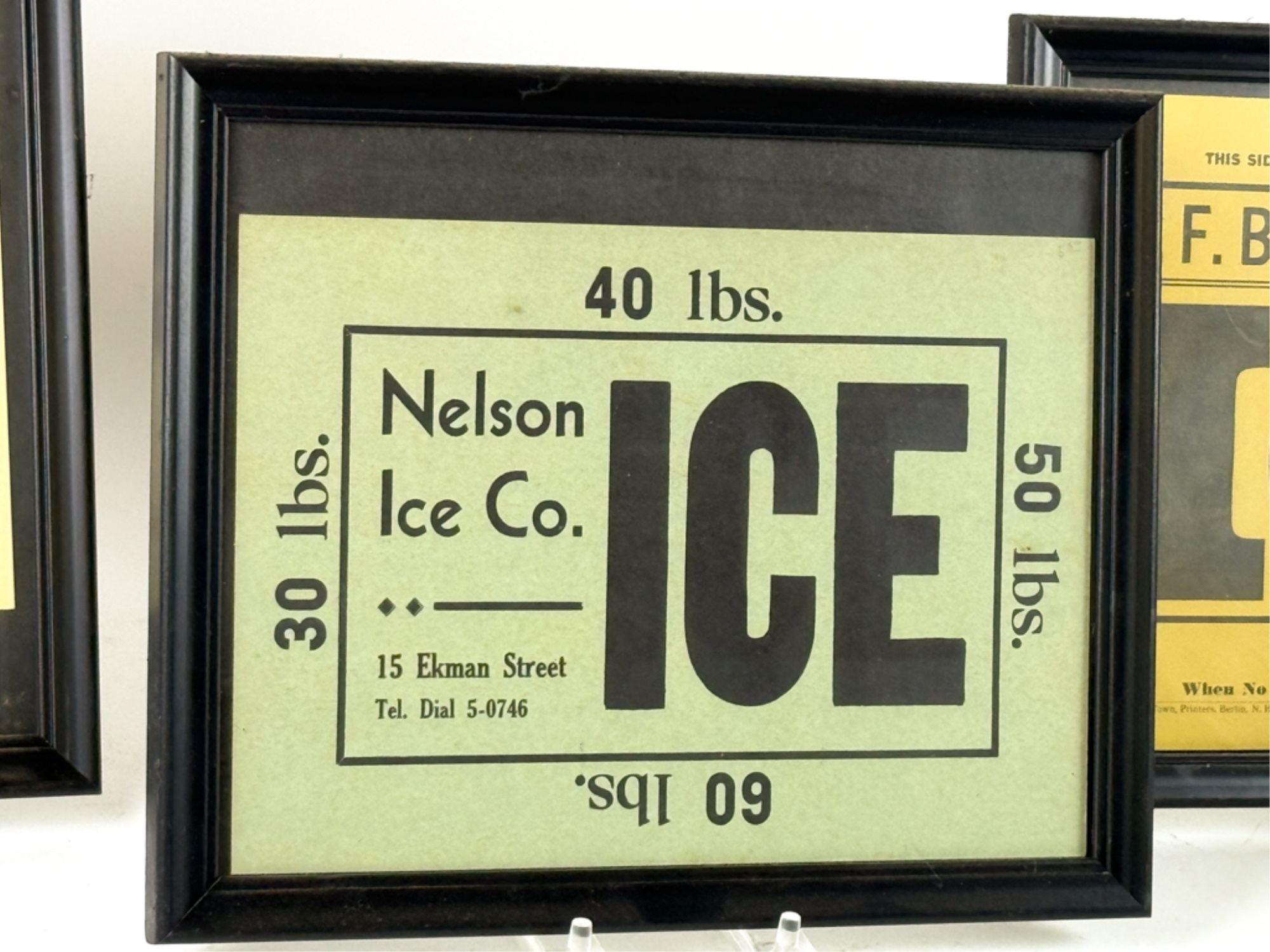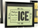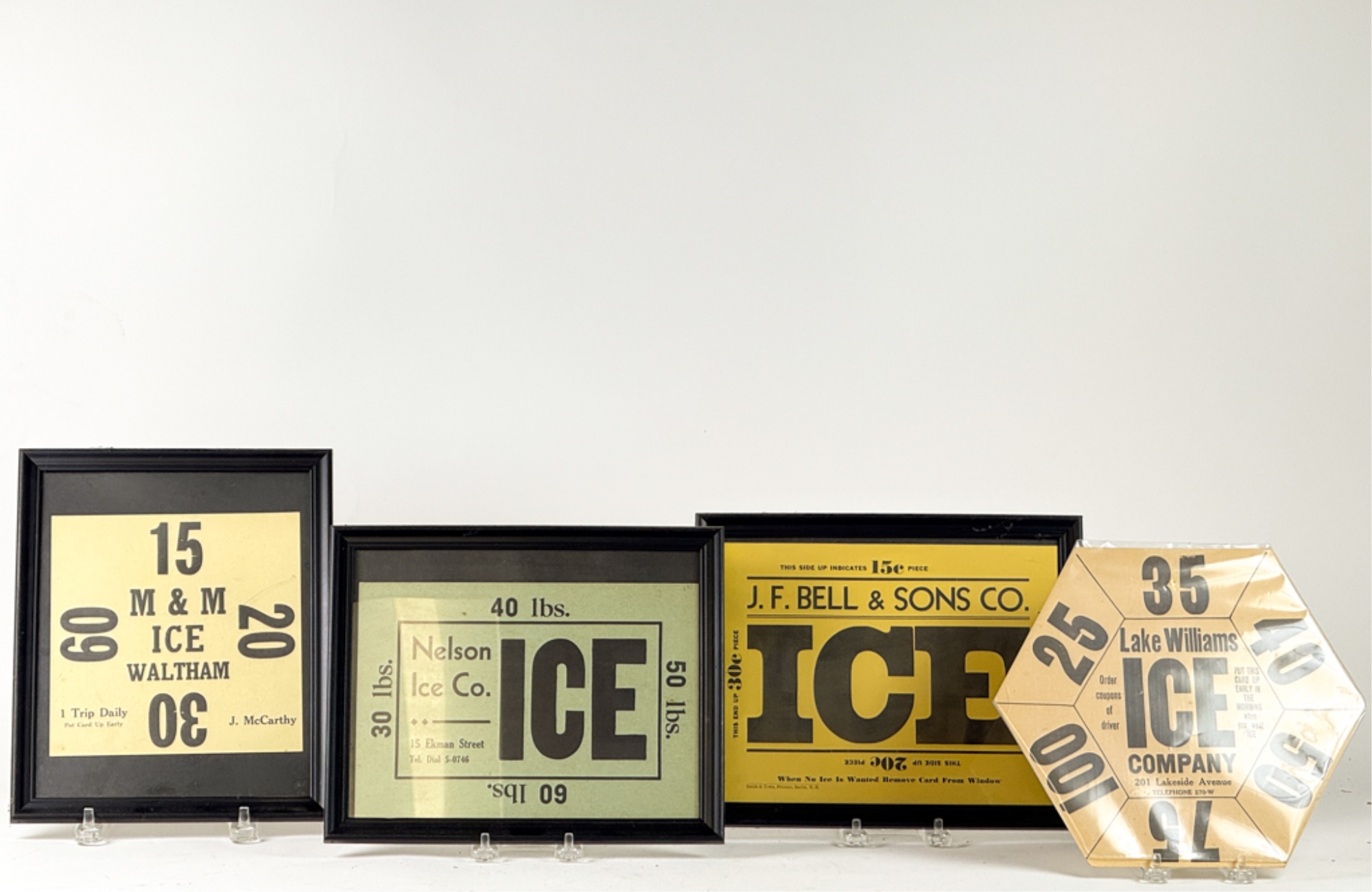 J.F. Bell and Sons of Berlin NH, Nelson Ice Co of Waltham MA, Lake Williams Ice of Marlborough MA and M & M Ice, also of Waltham MA. (3) Framed. 10 3/4 x 8 3/4 inches. Temp No 4104
