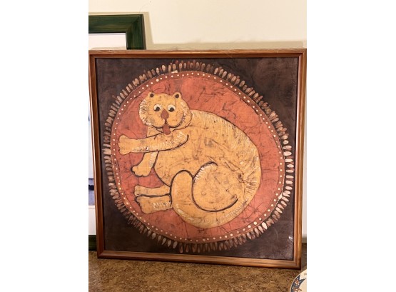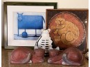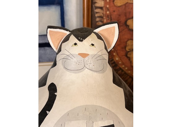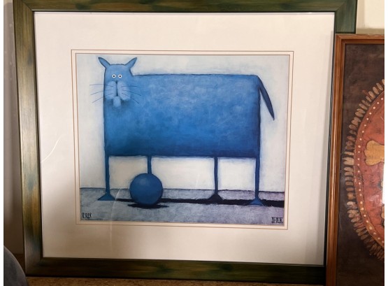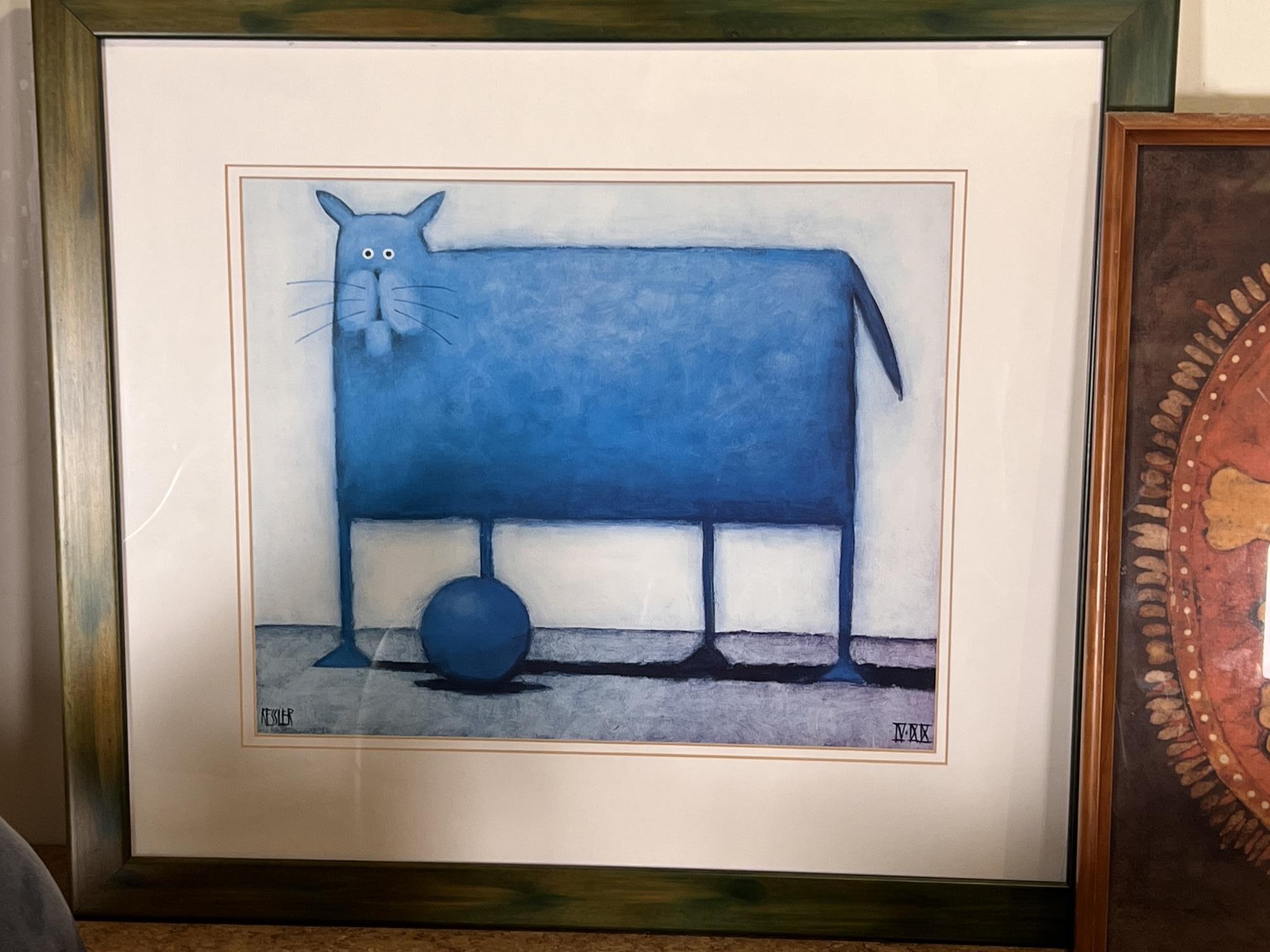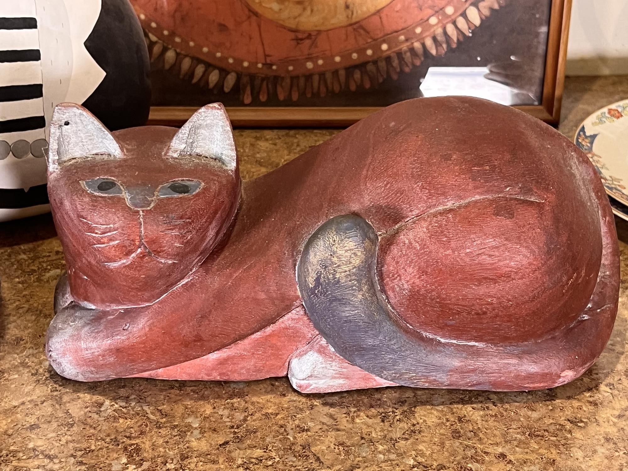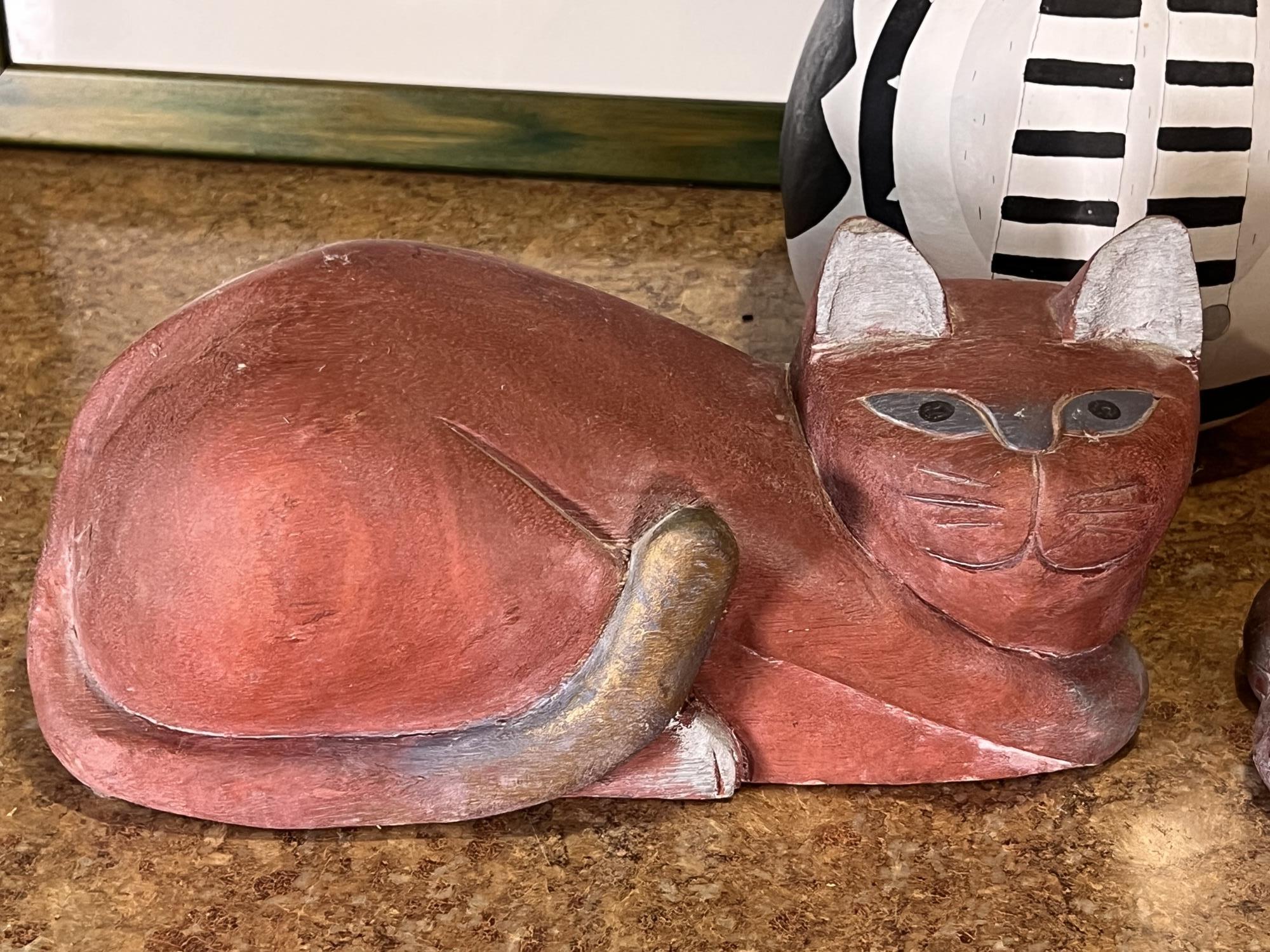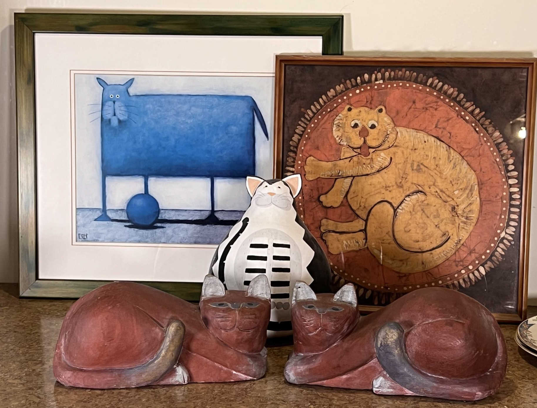 (2) Carved wood matching cats, painted gourd cat, signed and (2) framed prints. Largest print 21 x 23 1/2 inches Condition: Good used condition