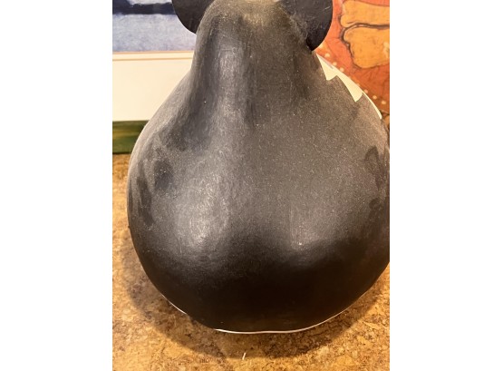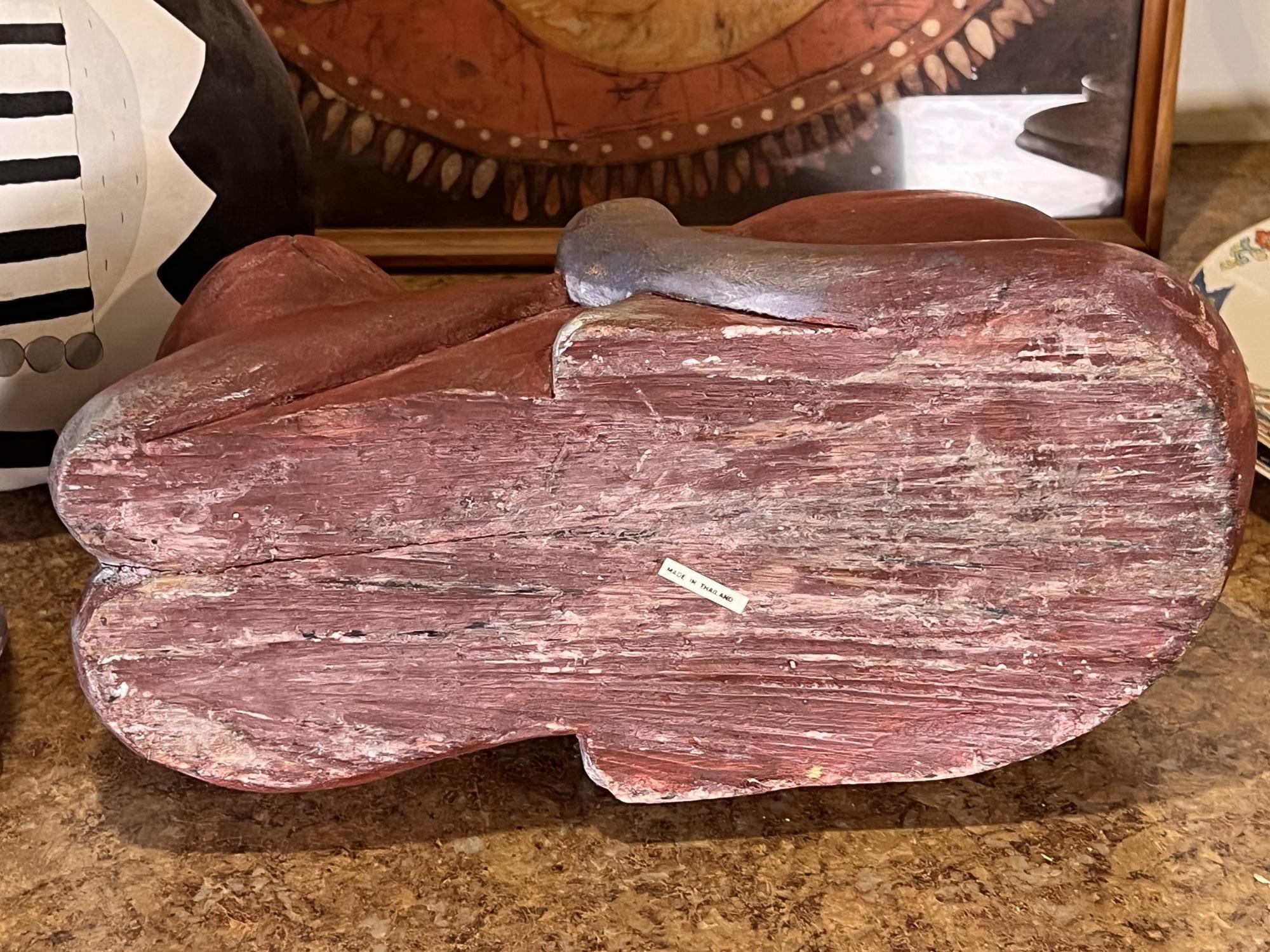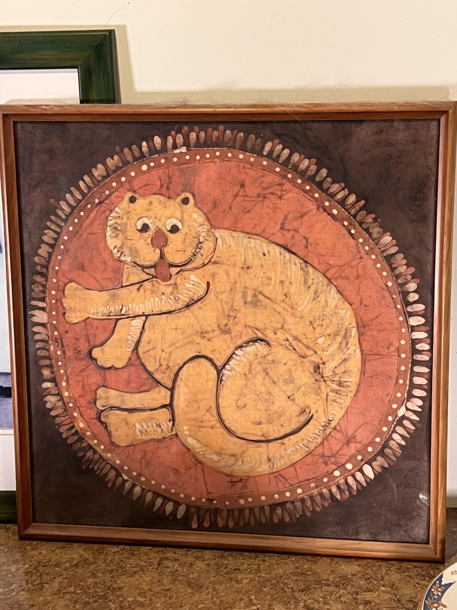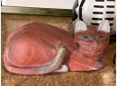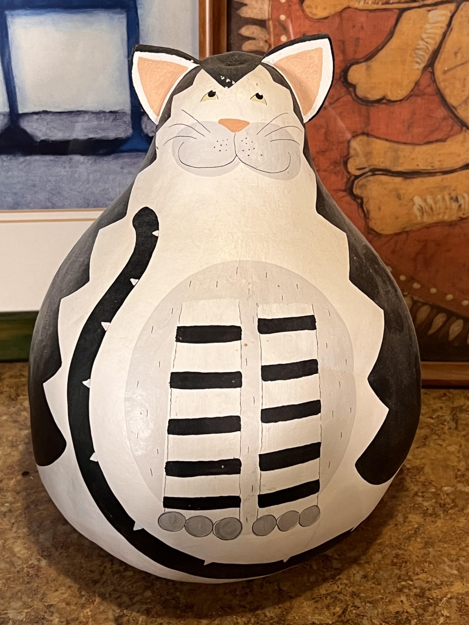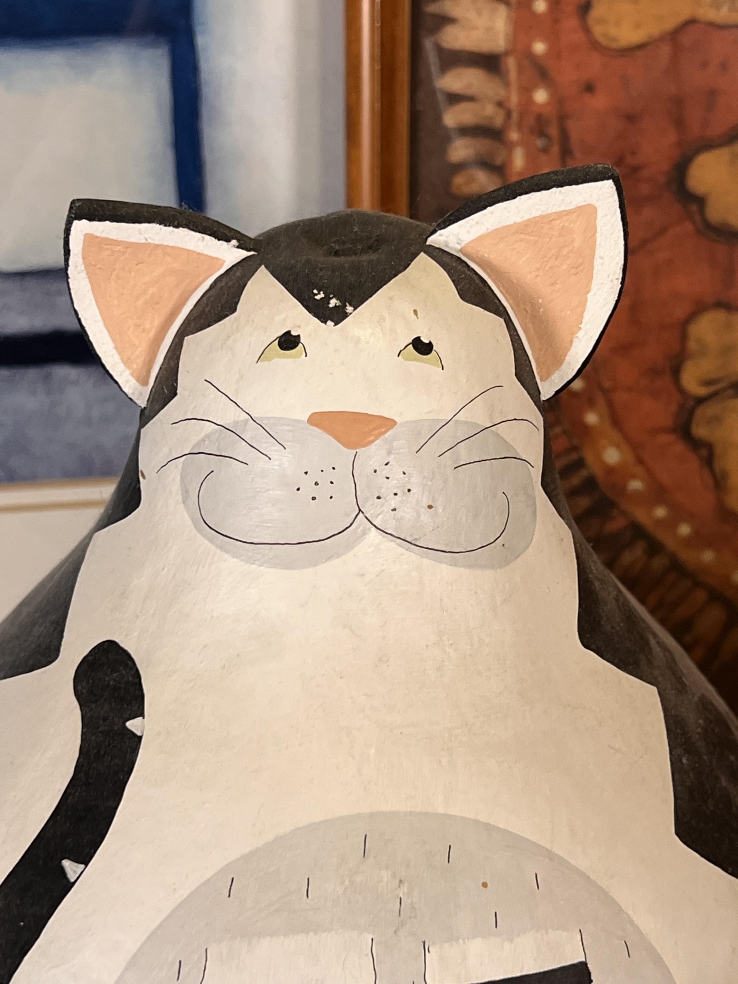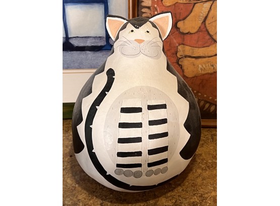 (2) Carved wood matching cats, painted gourd cat, signed and (2) framed prints. Largest print 21 x 23 1/2 inches Condition: Good used condition