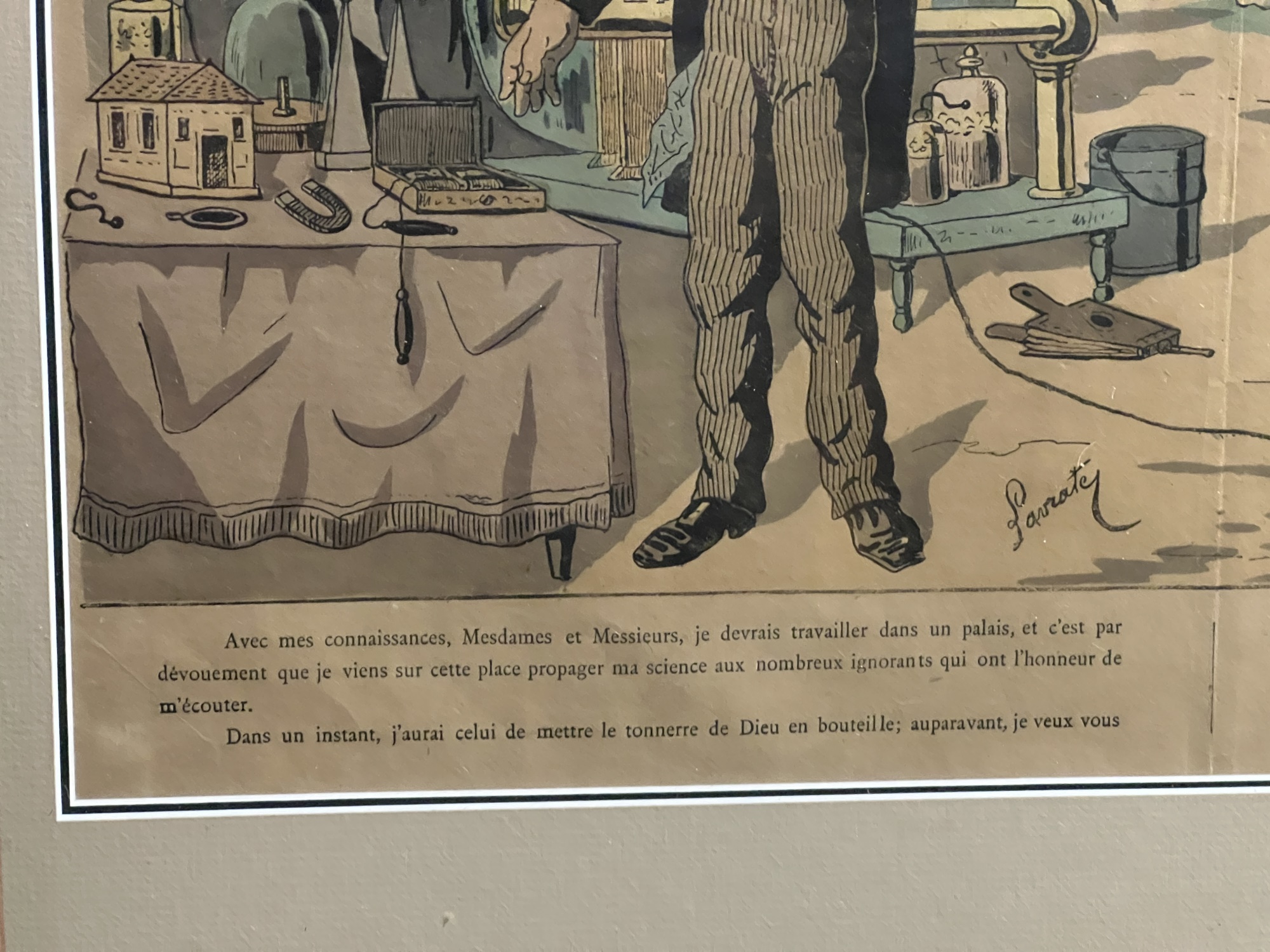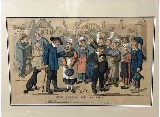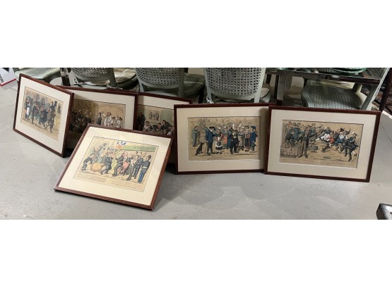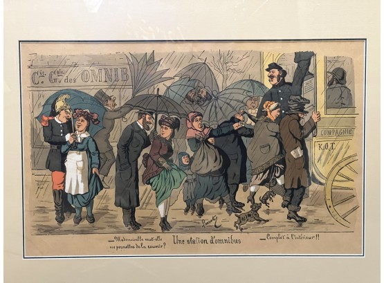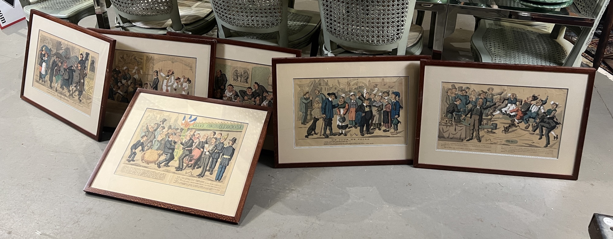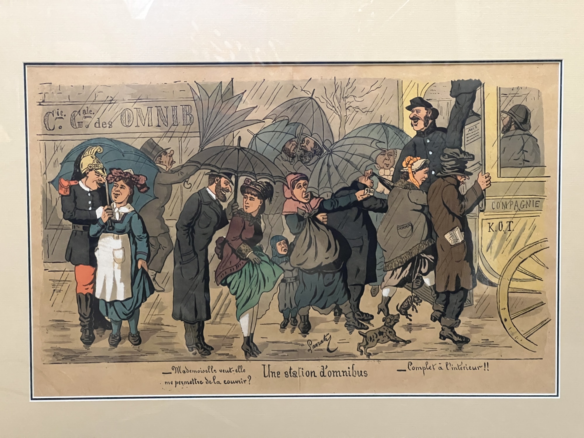 Framed colored prints. Including "Une Station D'omnibus", "Unjour De Faire", etc. In contemporary frames. 19" x 26" framed