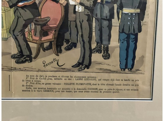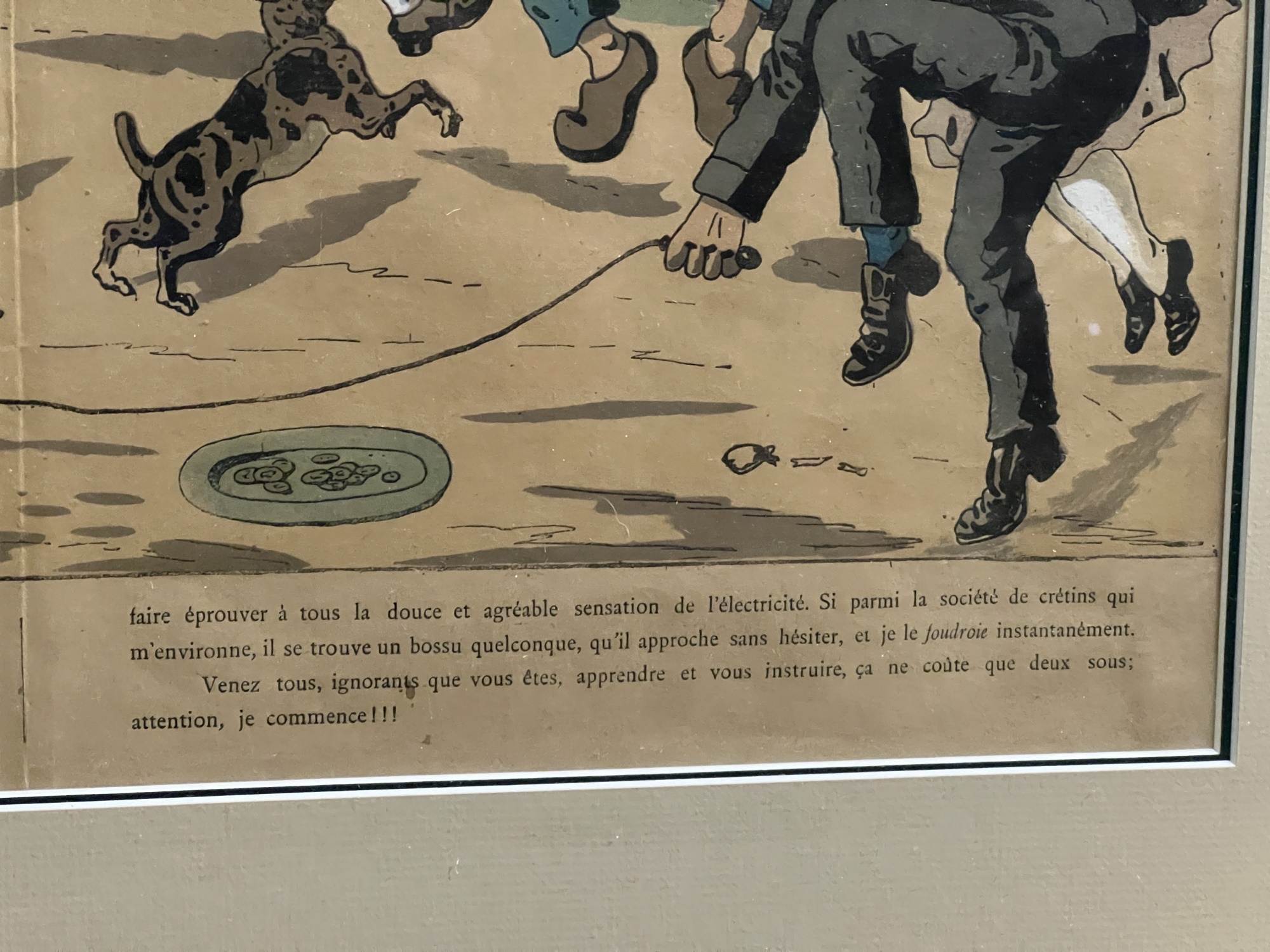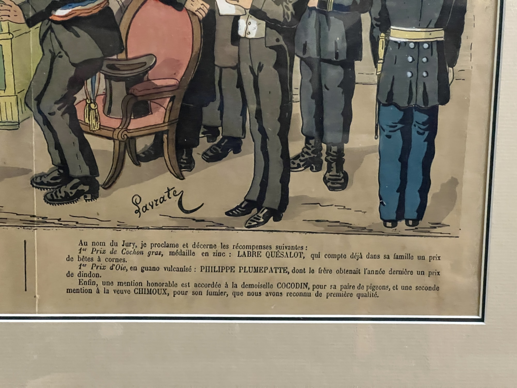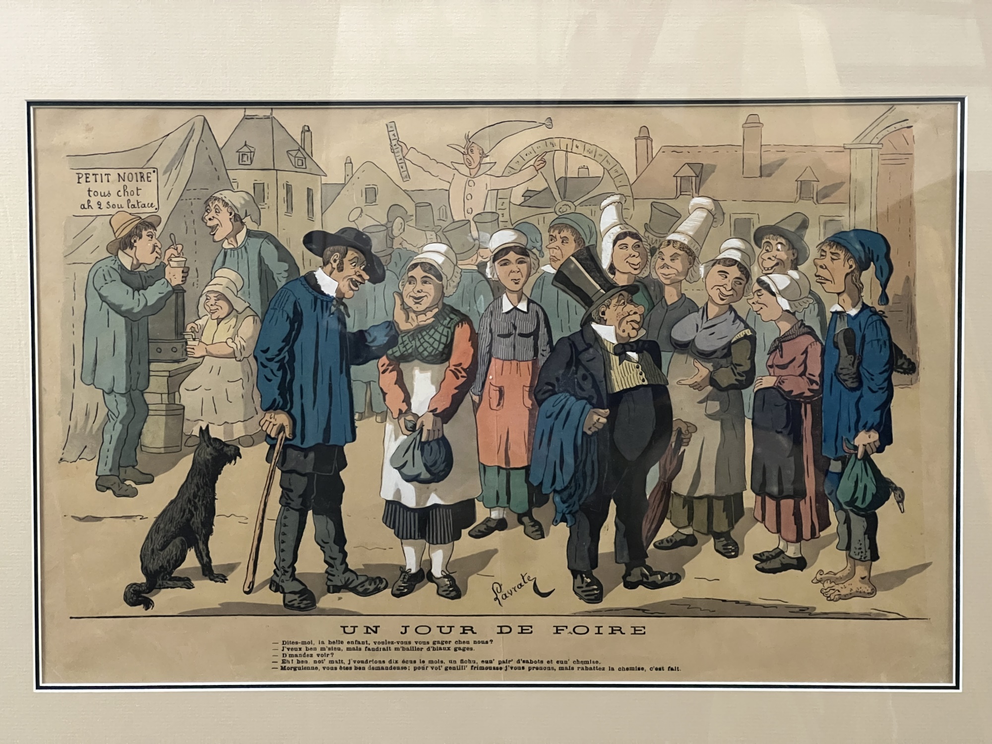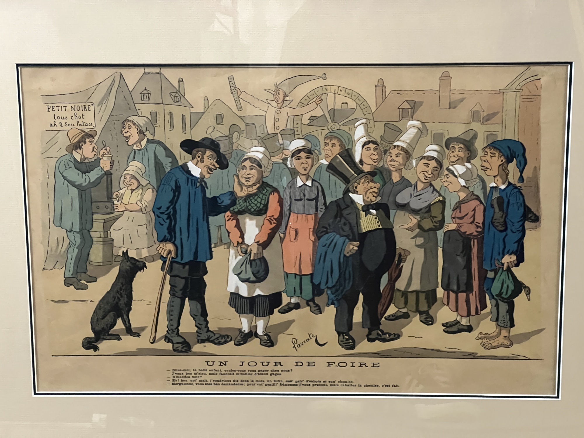 Framed colored prints. Including "Une Station D'omnibus", "Unjour De Faire", etc. In contemporary frames. 19" x 26" framed