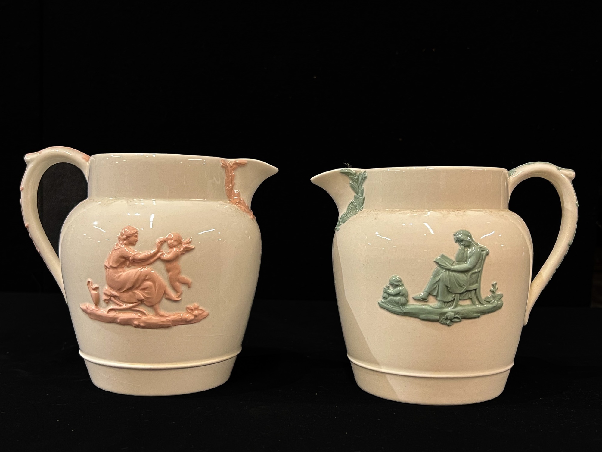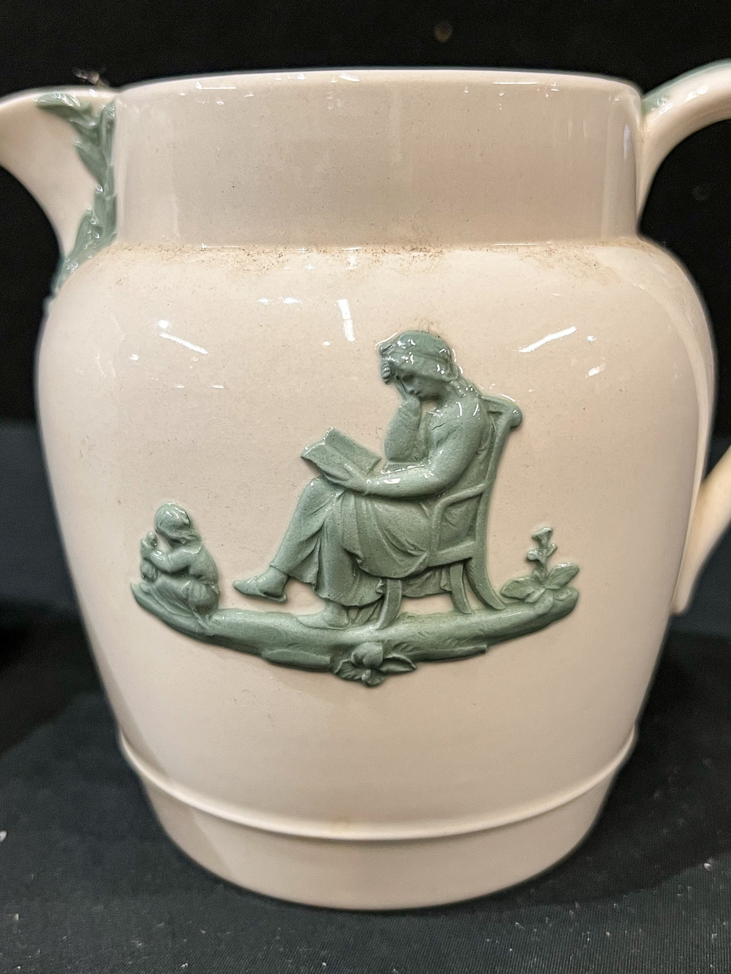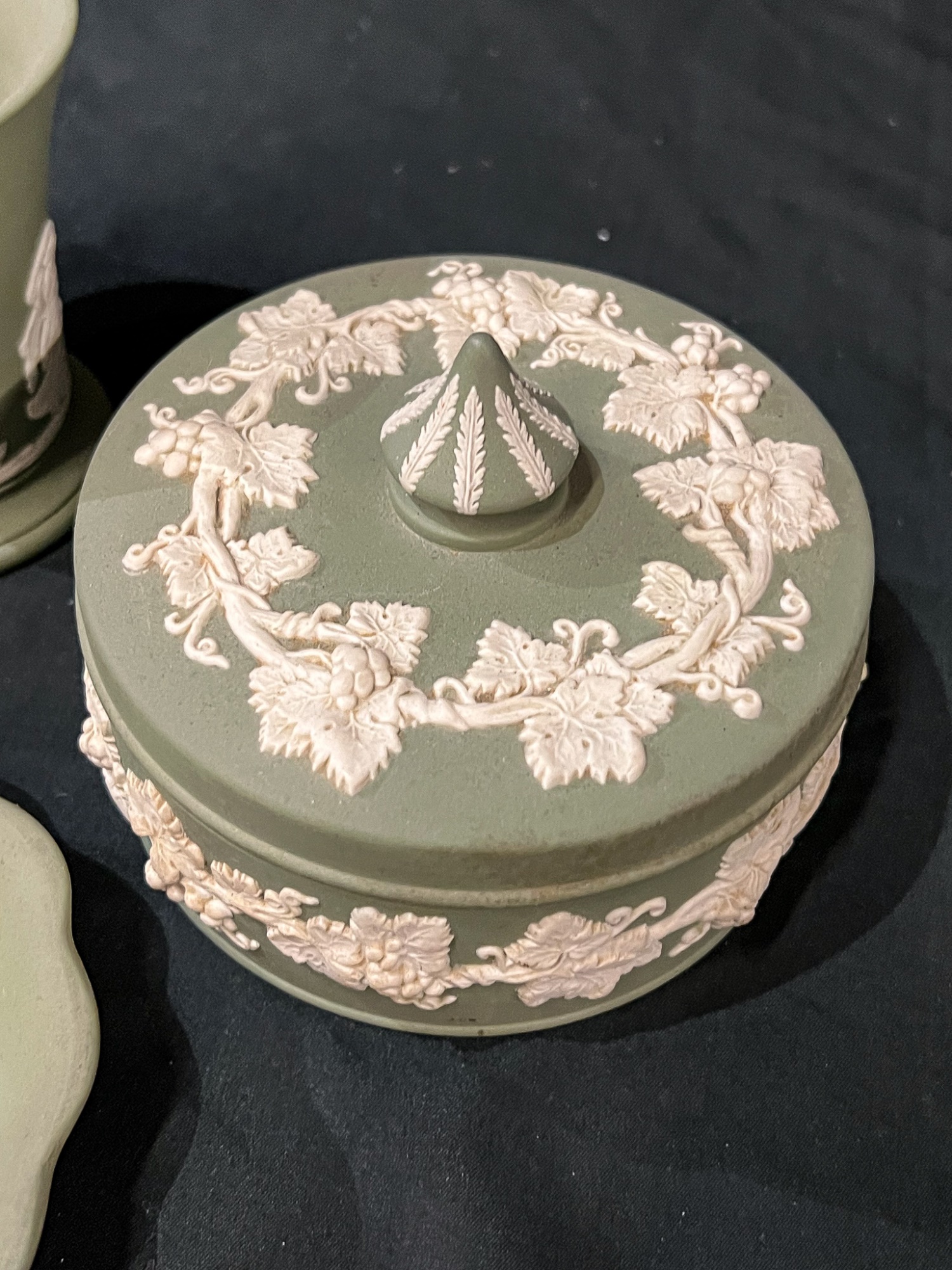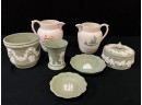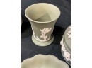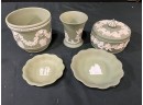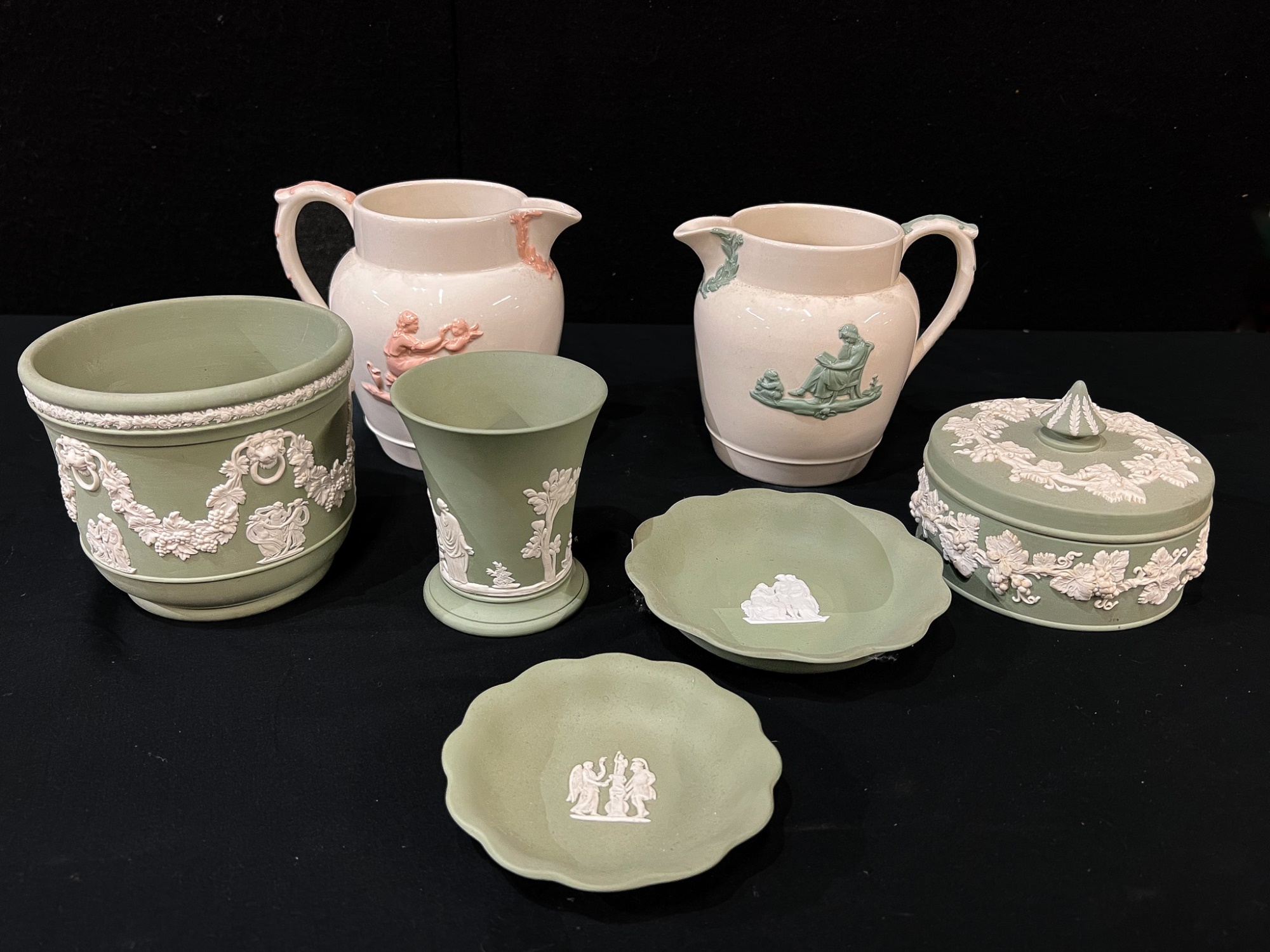 Including (2) pitchers, covered box, vases and saucers. Pitchers 5 1/2" h