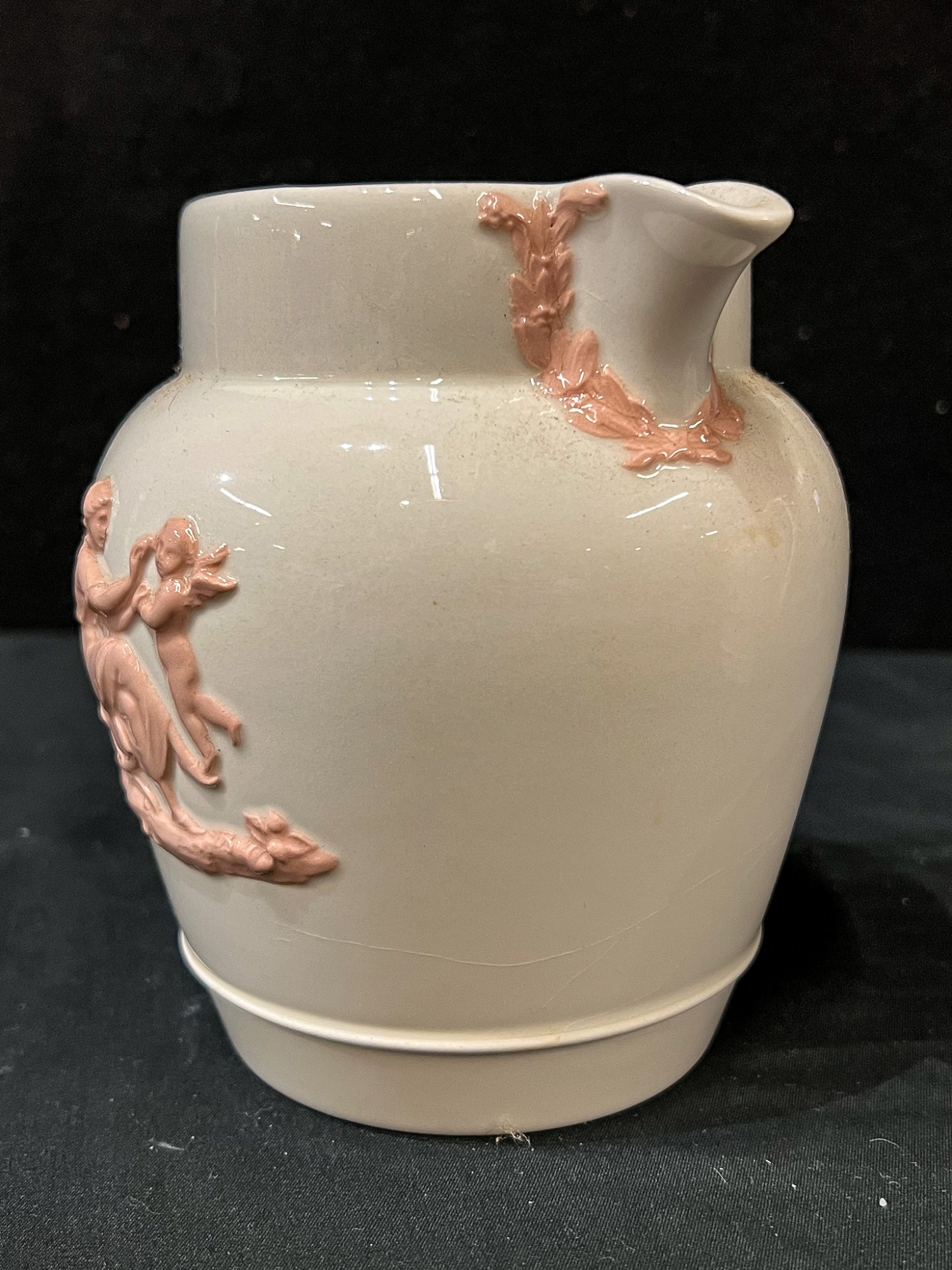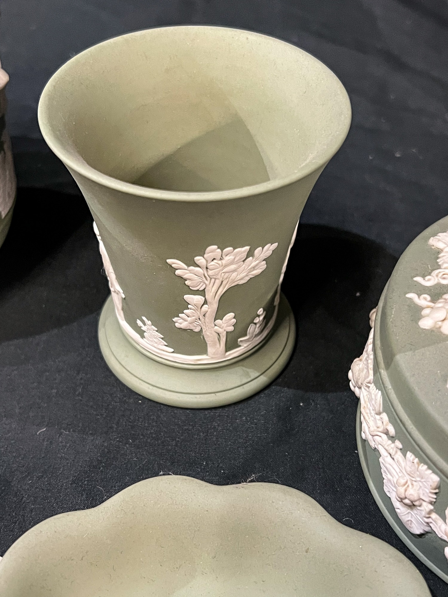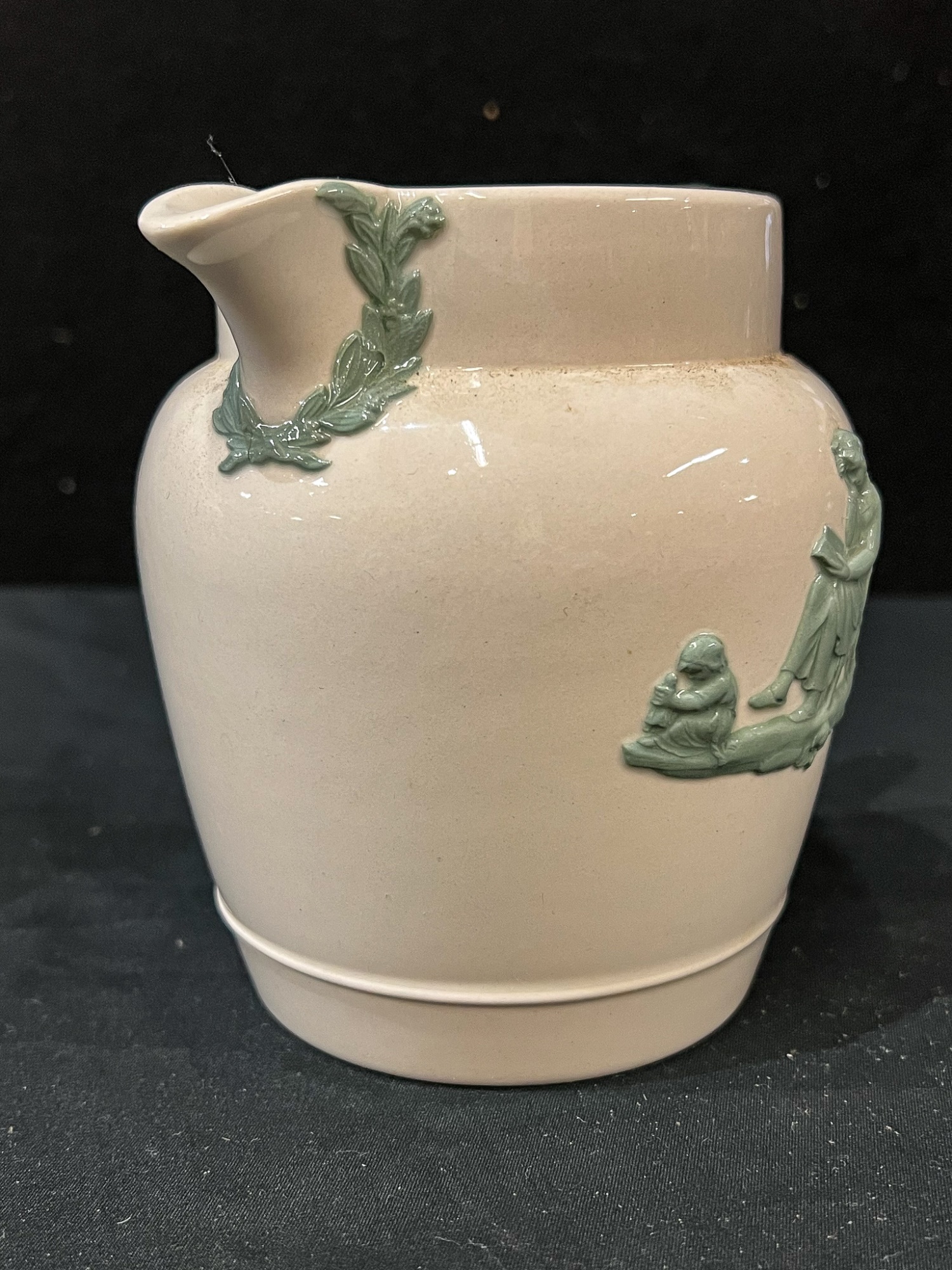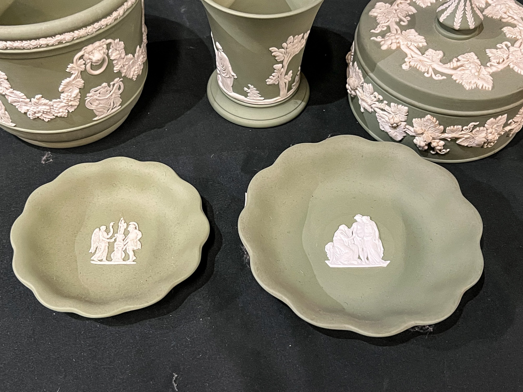 Including (2) pitchers, covered box, vases and saucers. Pitchers 5 1/2" h