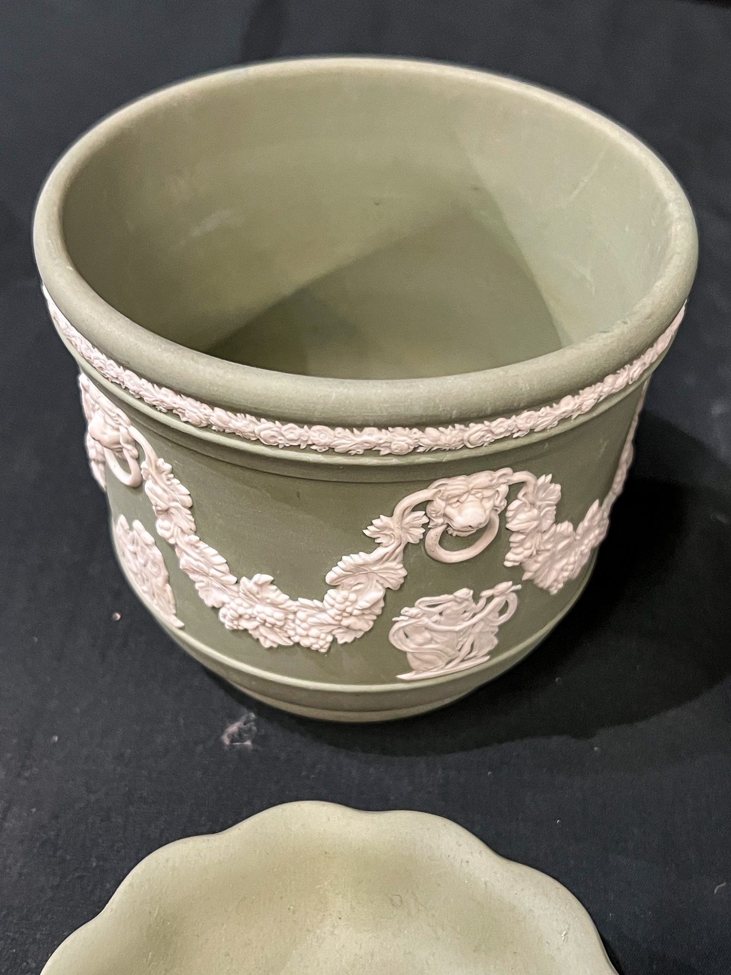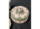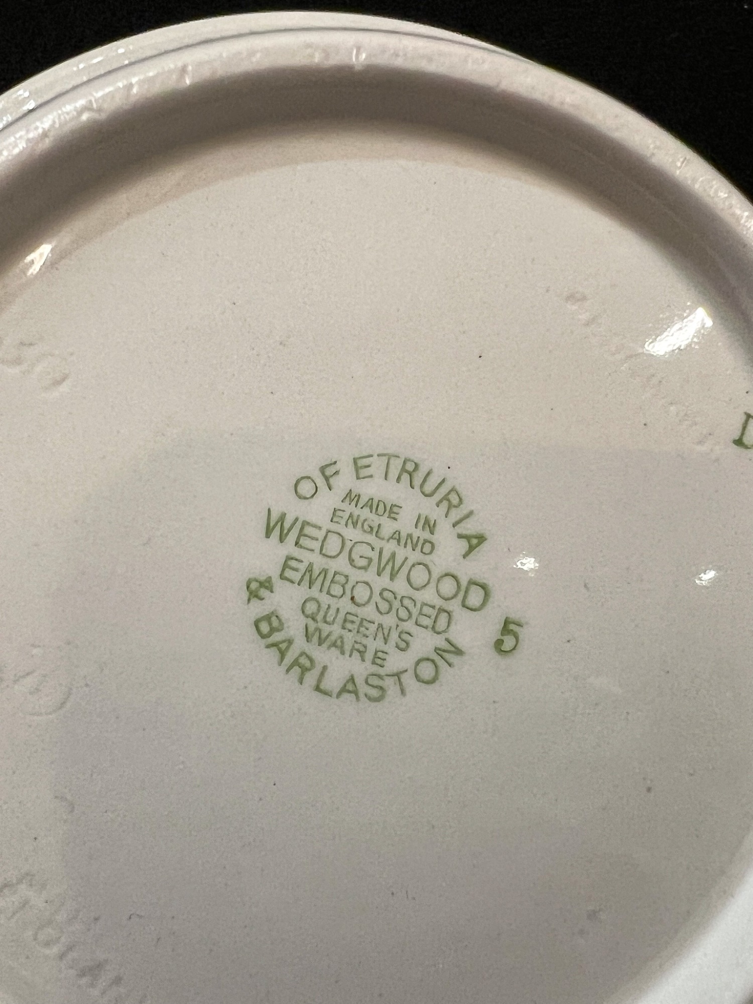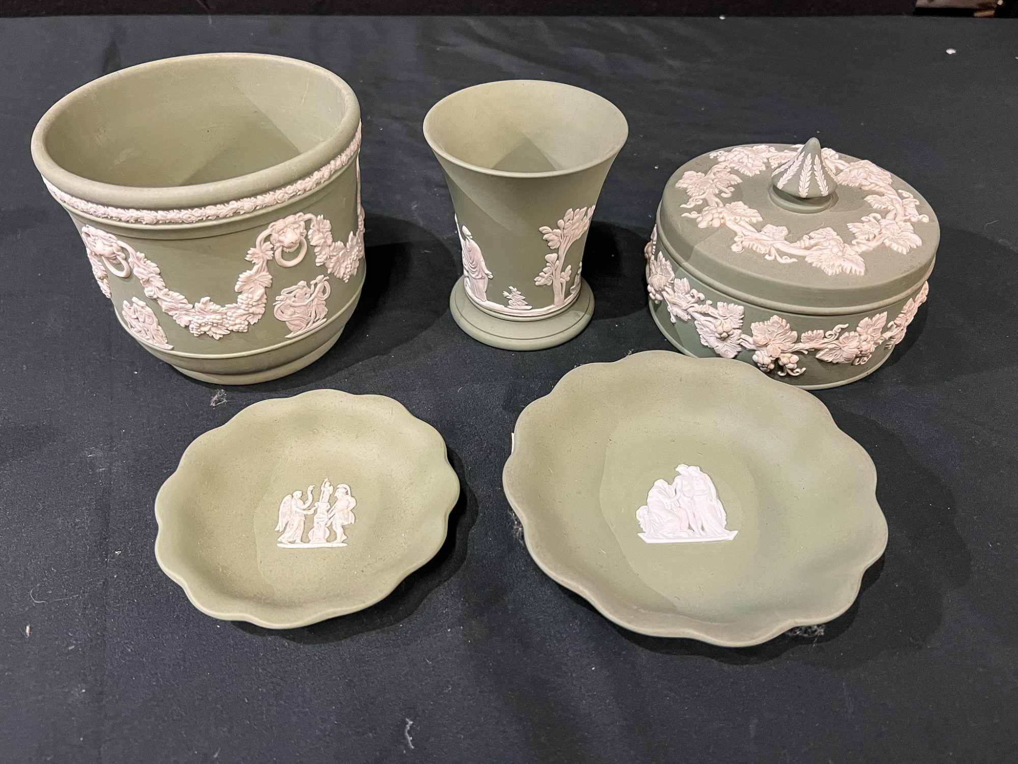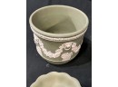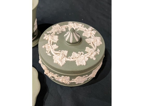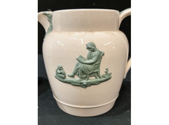 Including (2) pitchers, covered box, vases and saucers. Pitchers 5 1/2" h