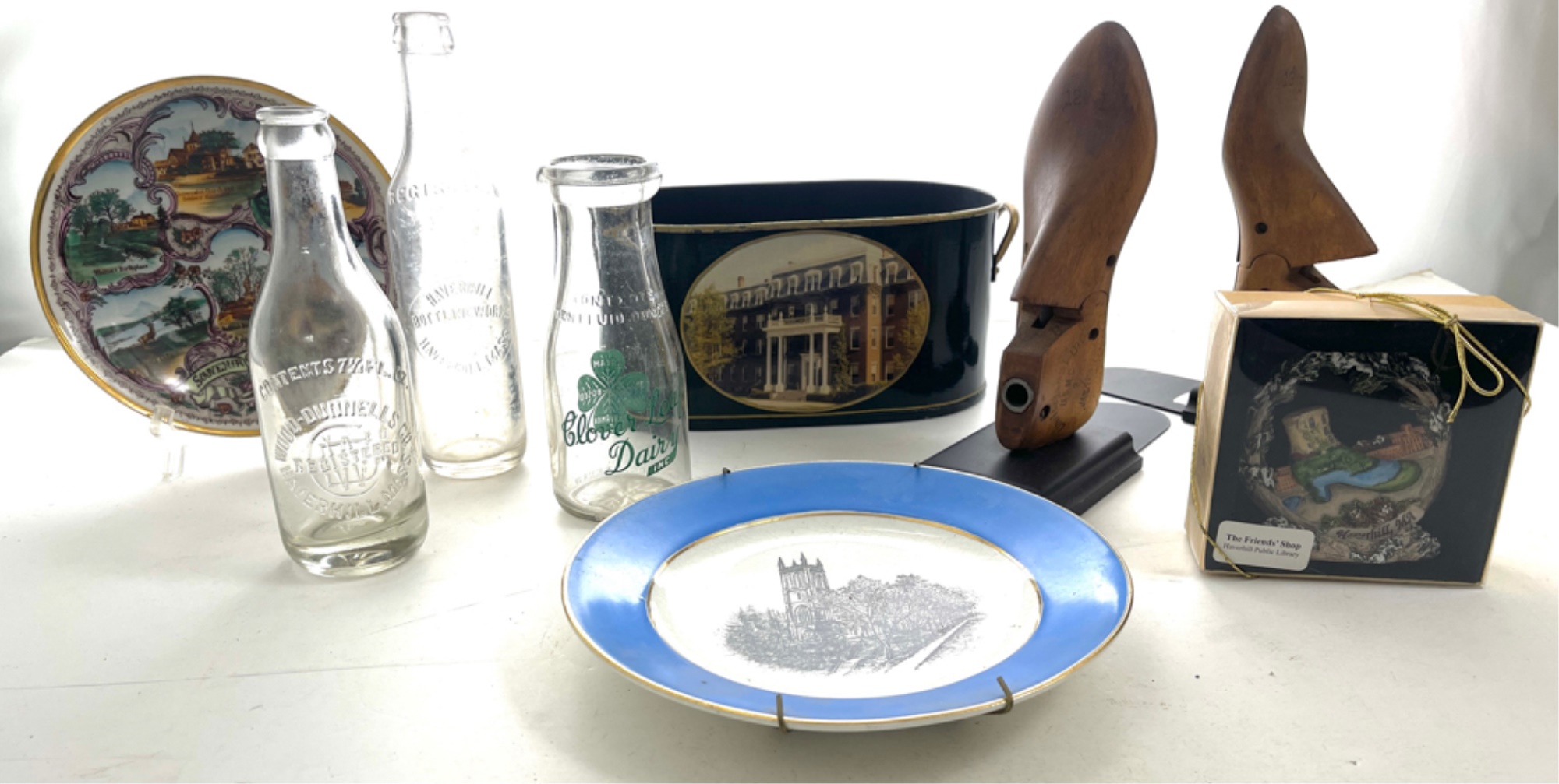 Including (3) bottles, (2) plates, pair shoe last bookends, etc. Tallest bottle 8 3/4" x 2" dia