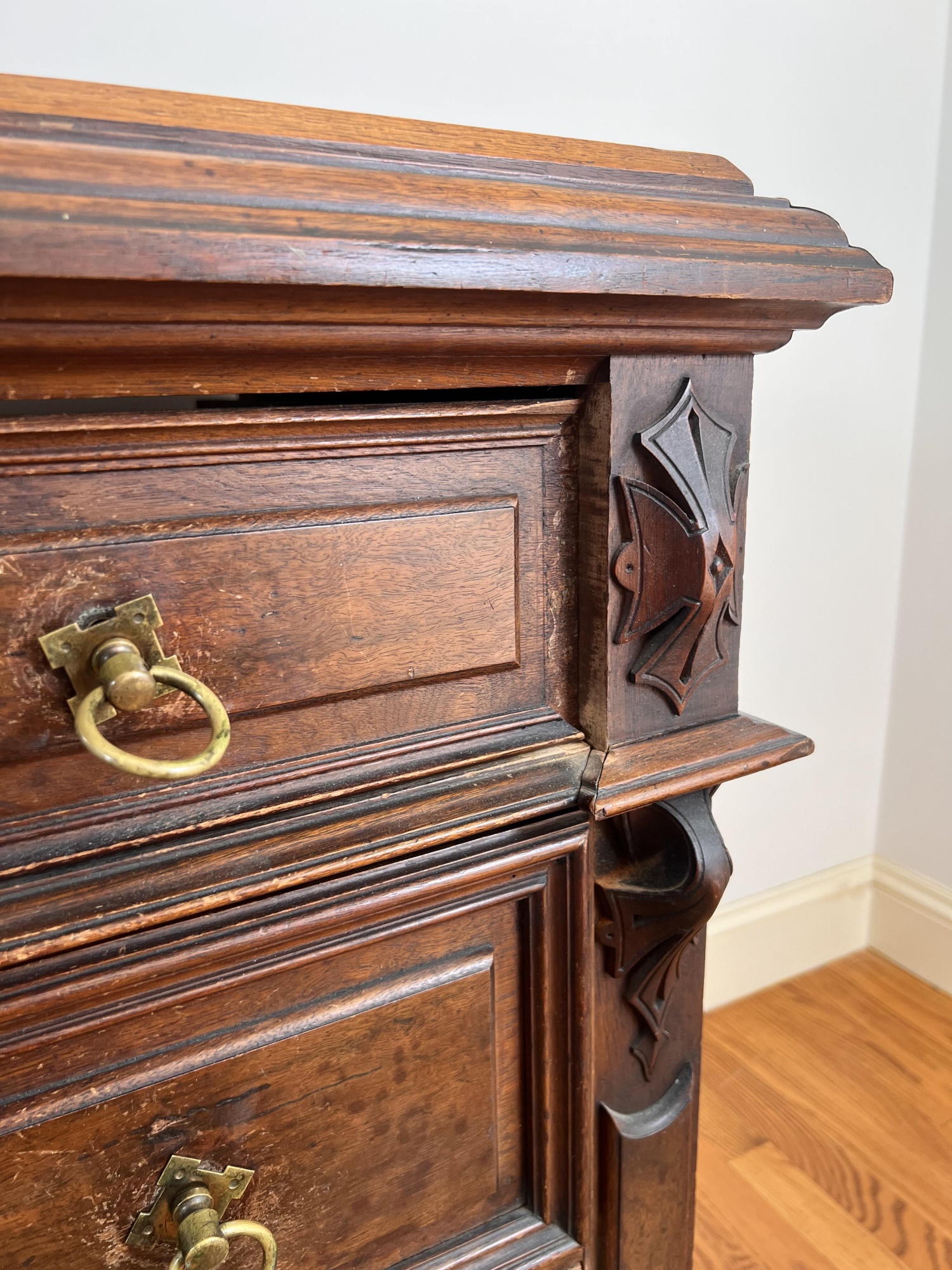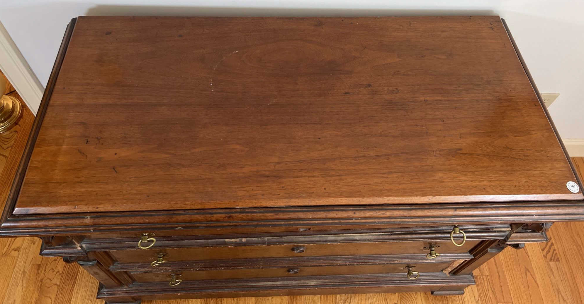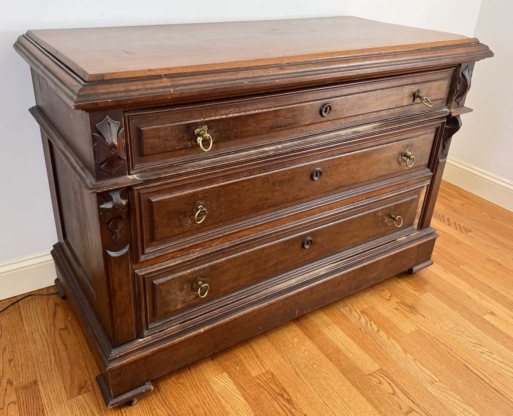 Molded top over (3) molded and paneled drawers flanked by carved stylized elements customary of the 1870-1890 period. 33 x 48 x 22.5 inches
