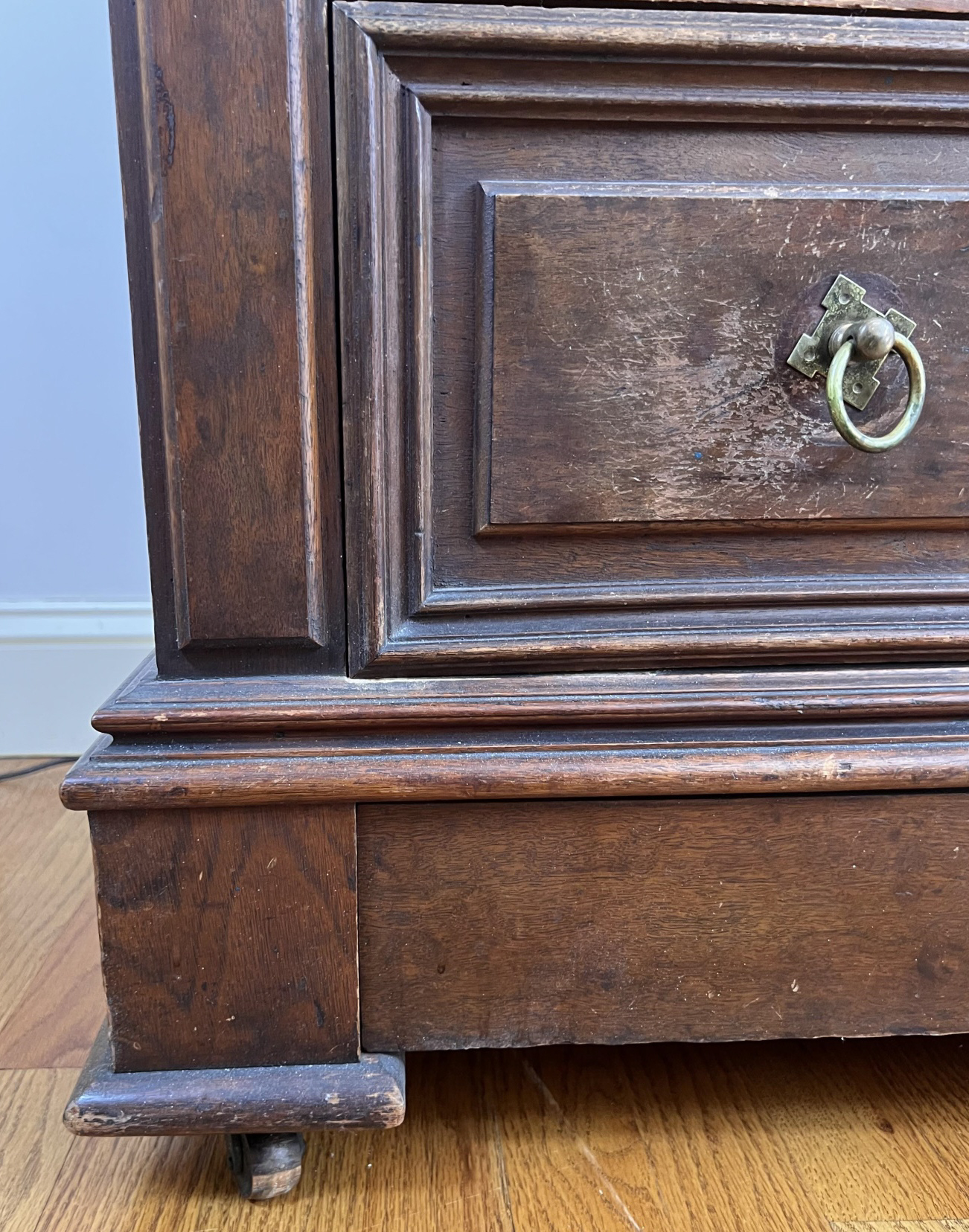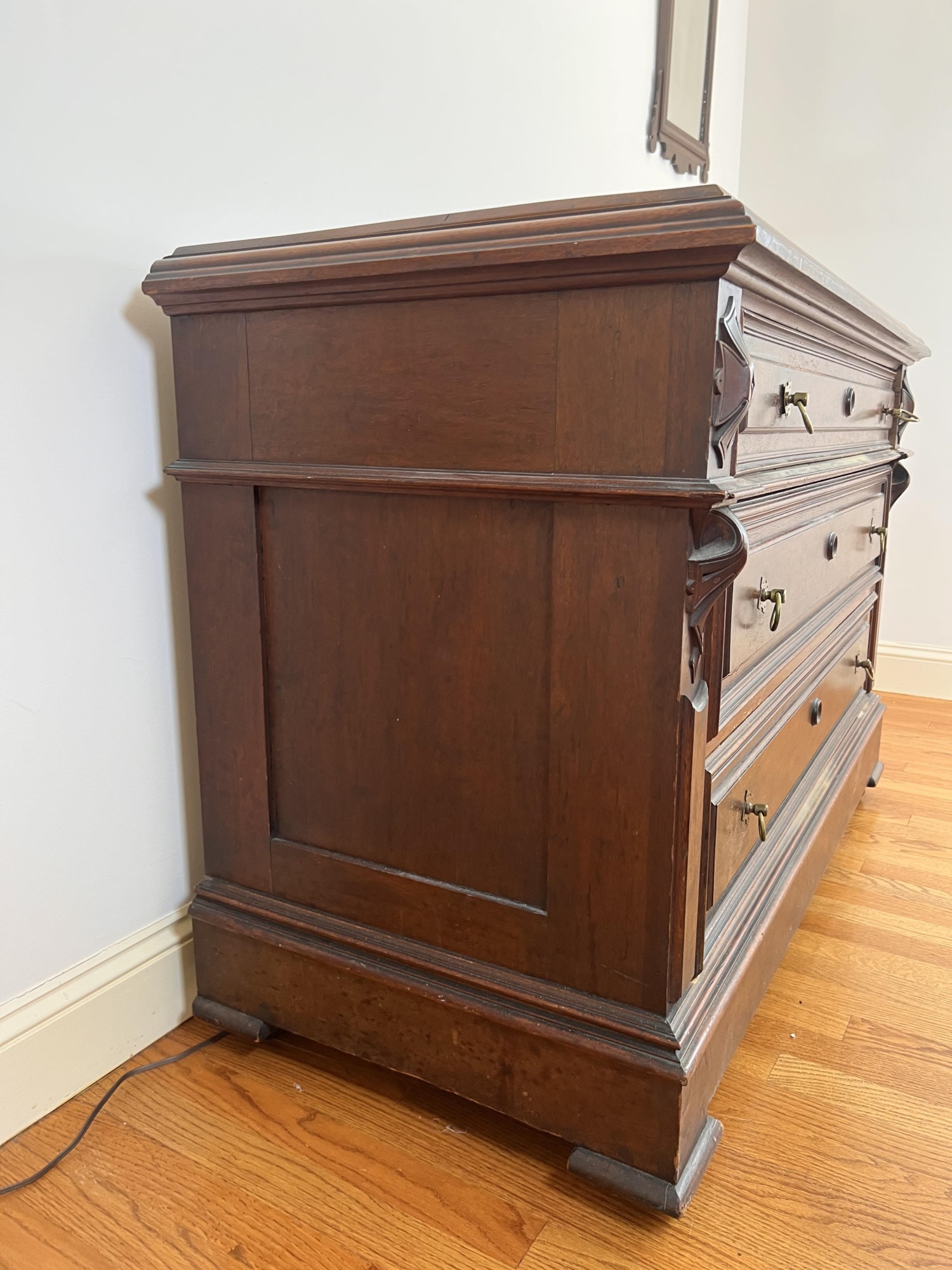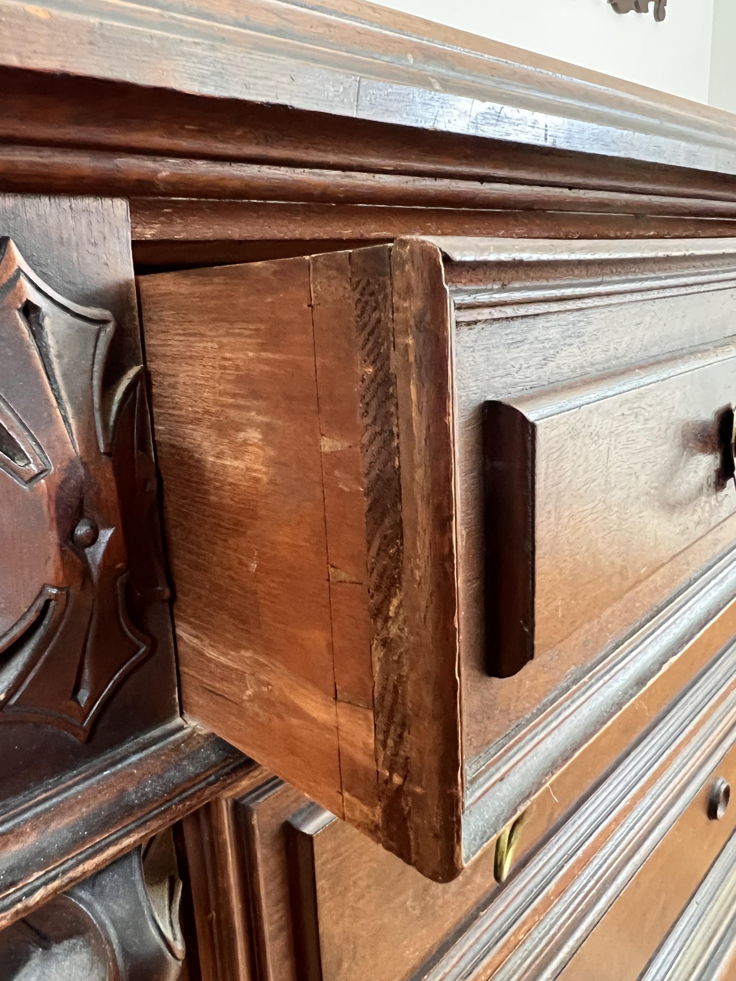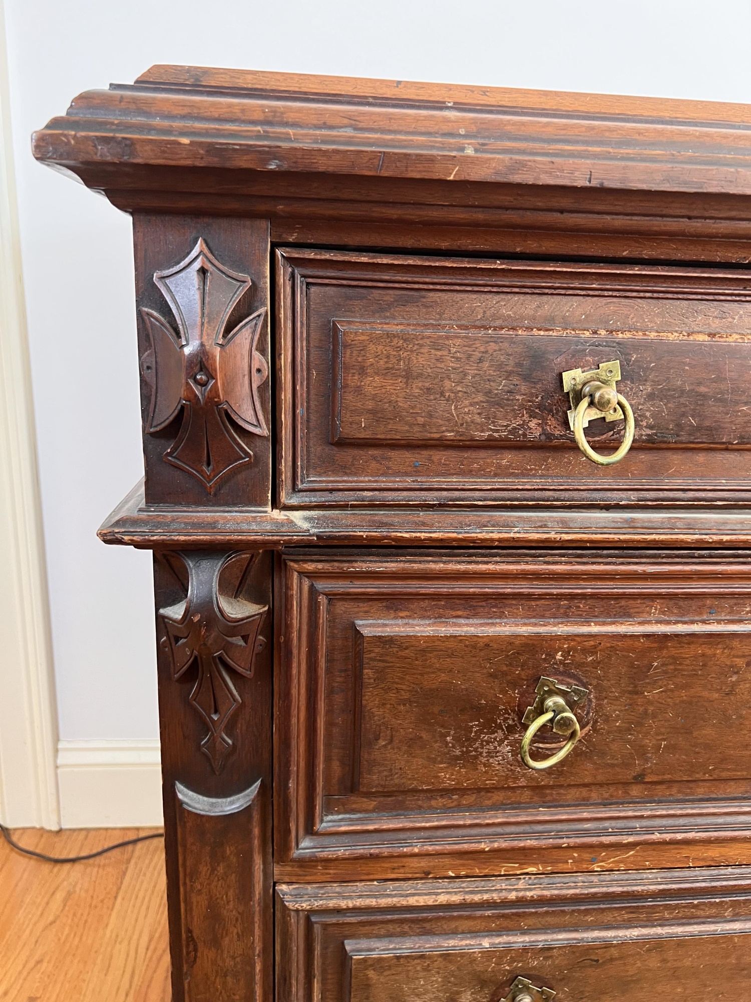 Molded top over (3) molded and paneled drawers flanked by carved stylized elements customary of the 1870-1890 period. 33 x 48 x 22.5 inches