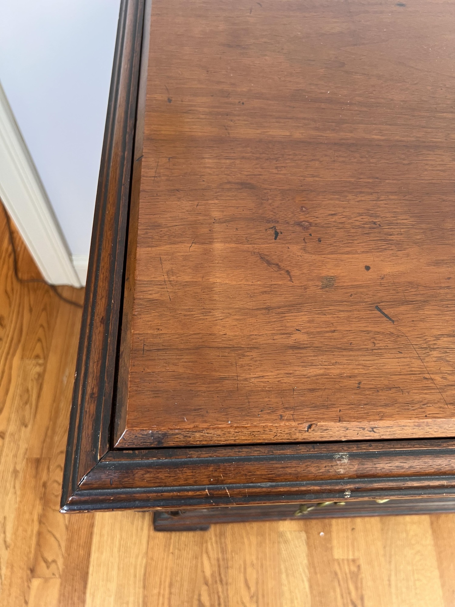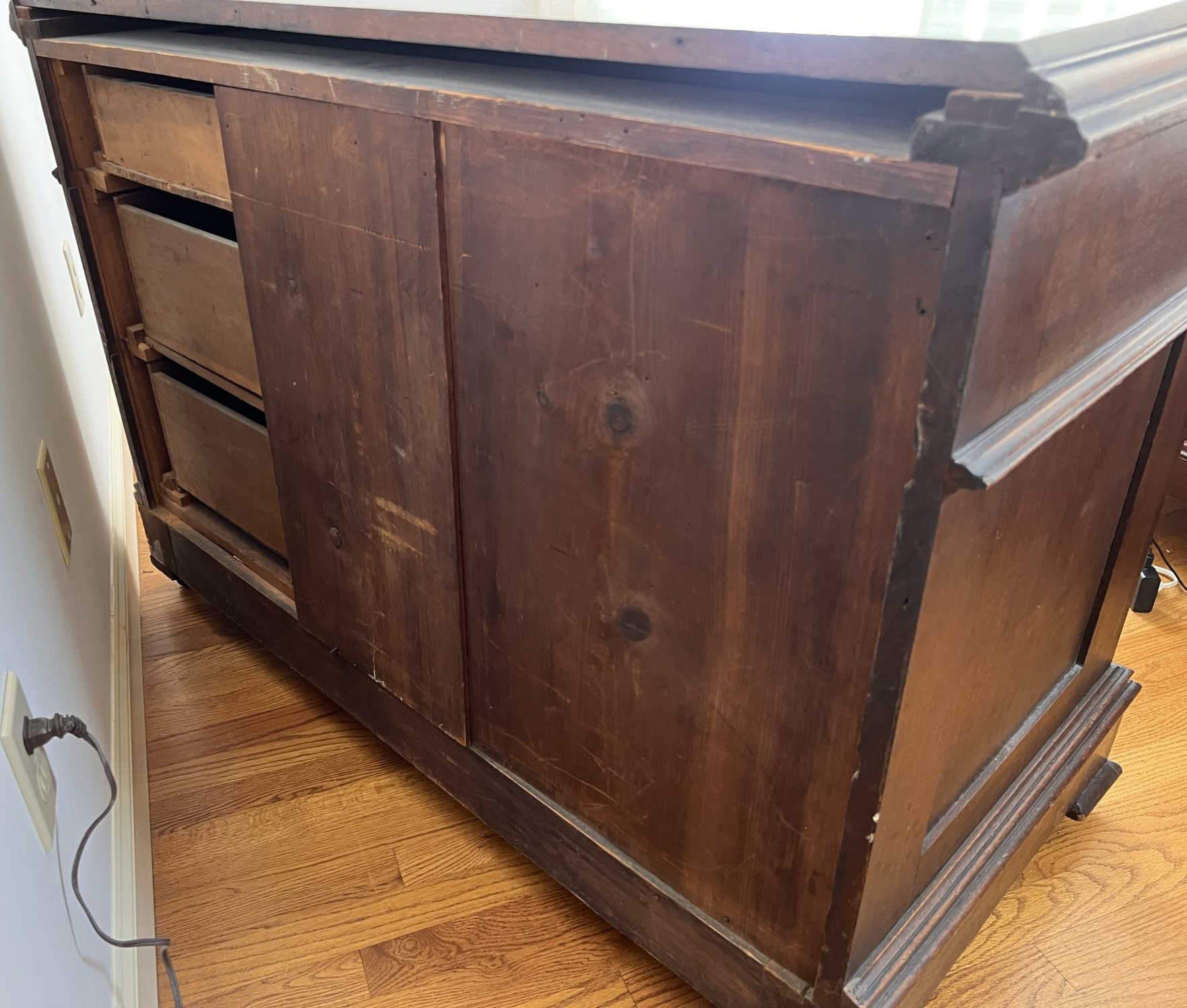 Notes: Marble top has been replaced by a single piece of mahogany. Small strip of molding absent to the left end of the top drawer. Bottom molding needs to be glued but is present.