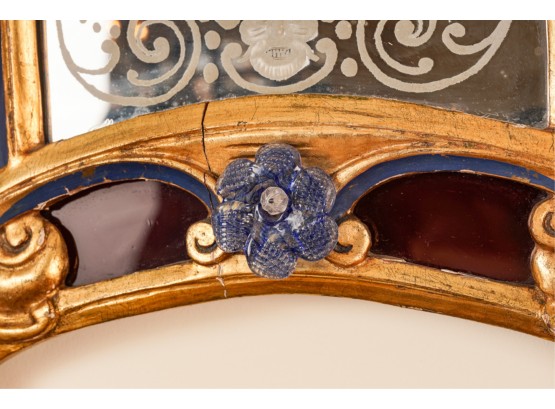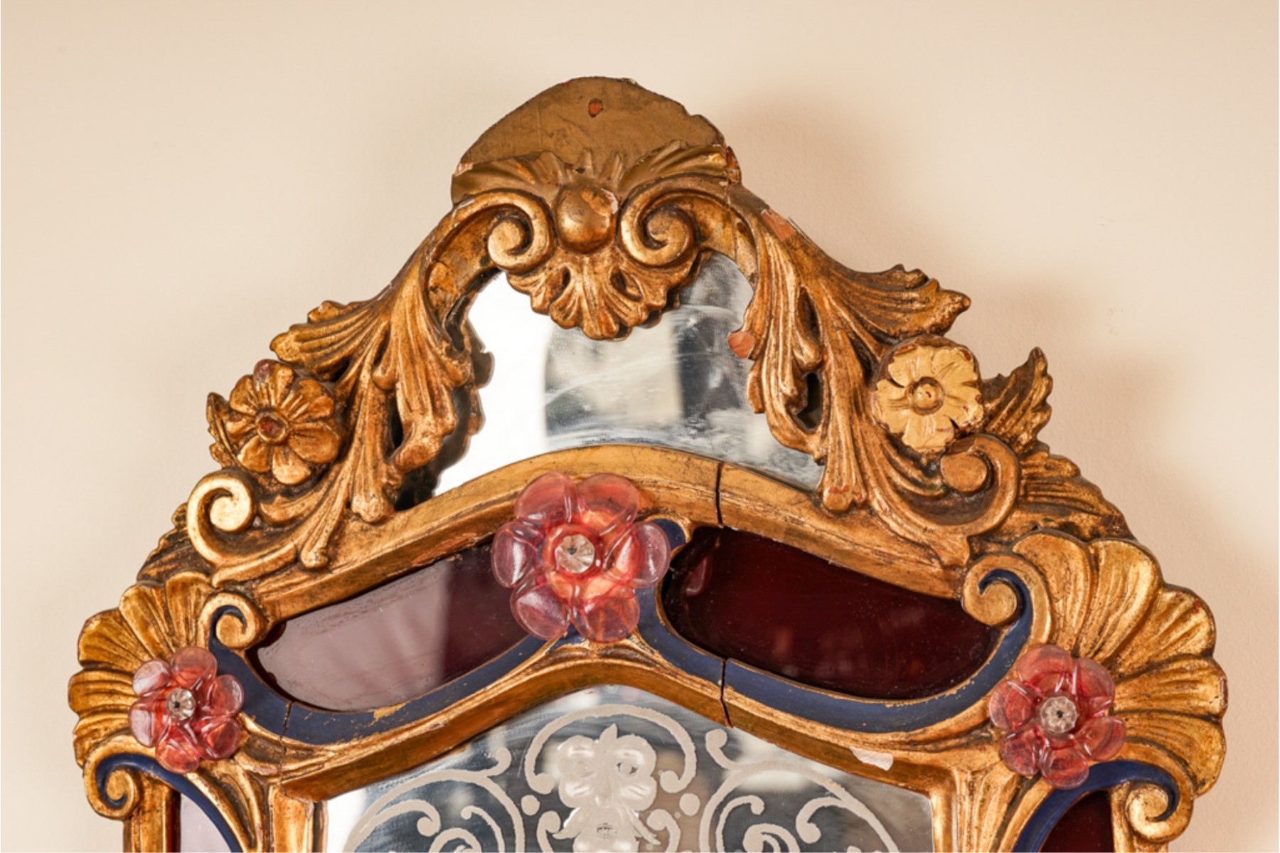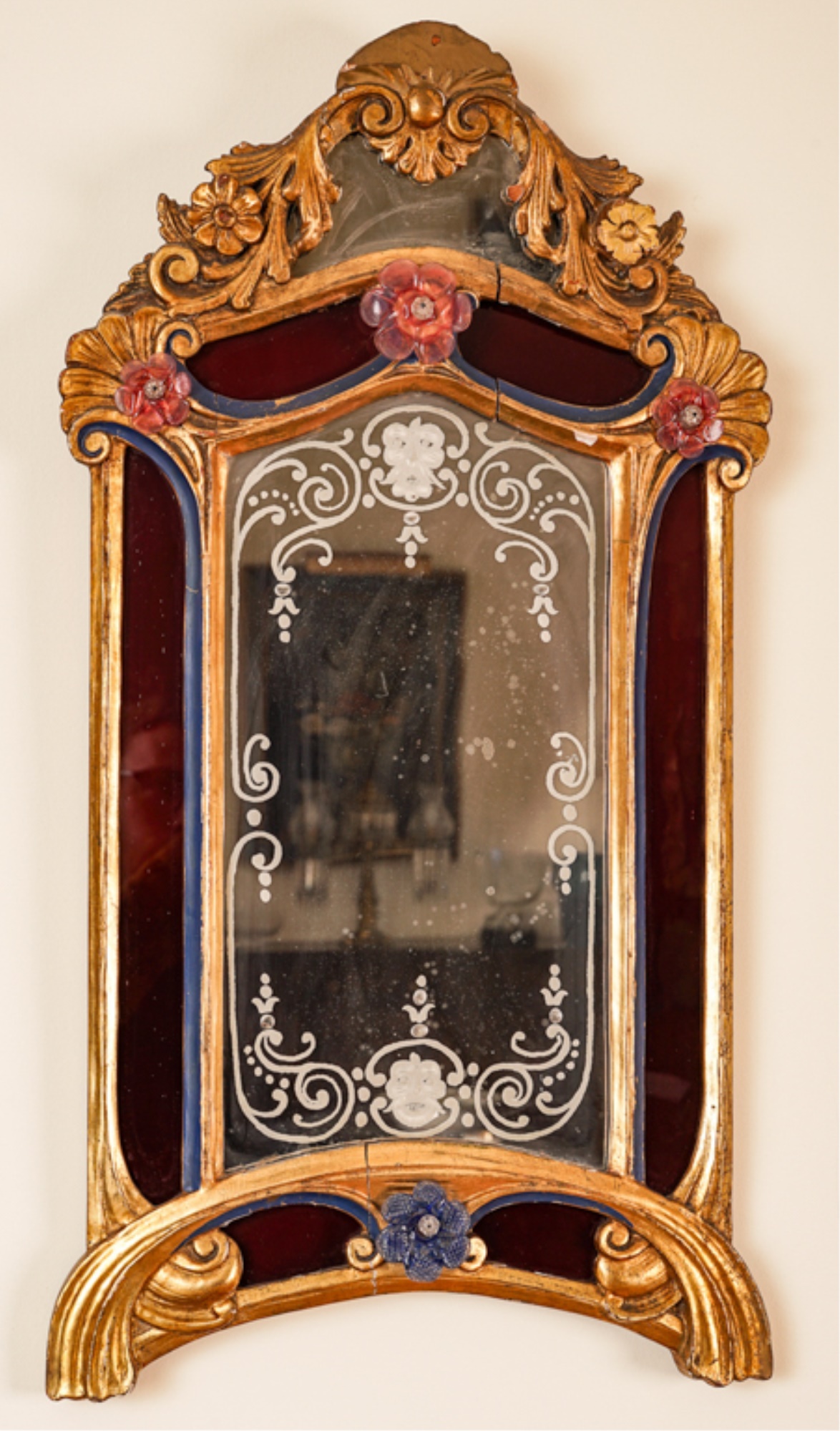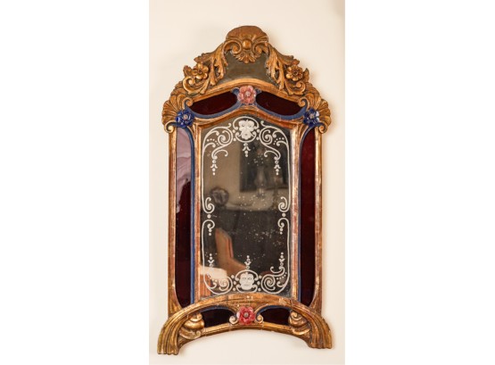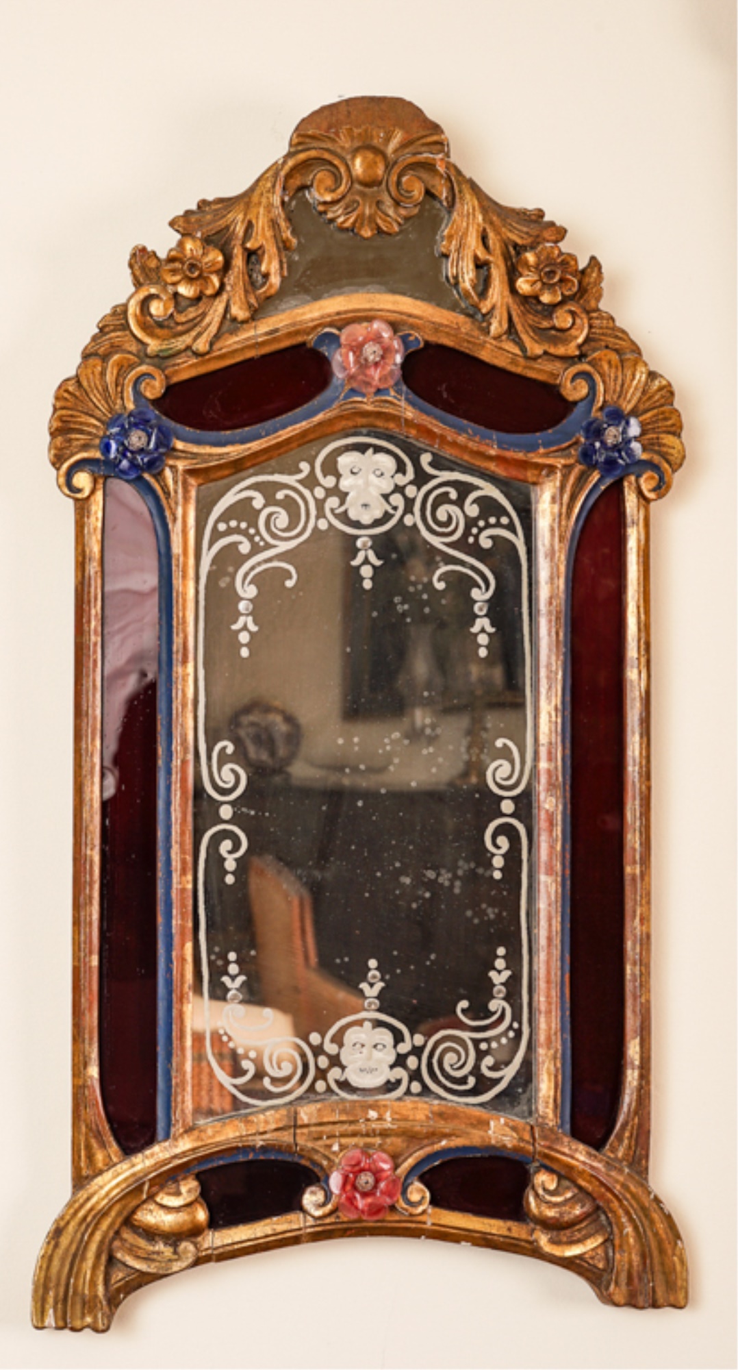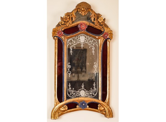 Frosted center panel bordered by ruby glass with venetian floral accents. Heavily carved crest with shells. 30 x 16 inches.