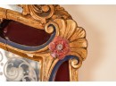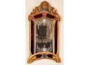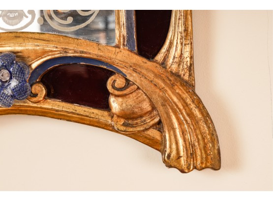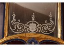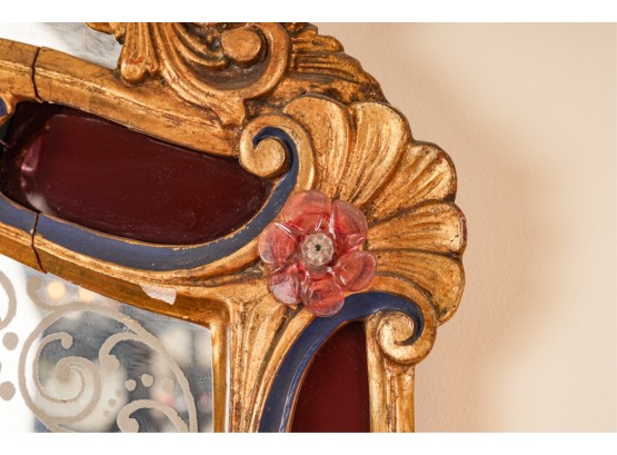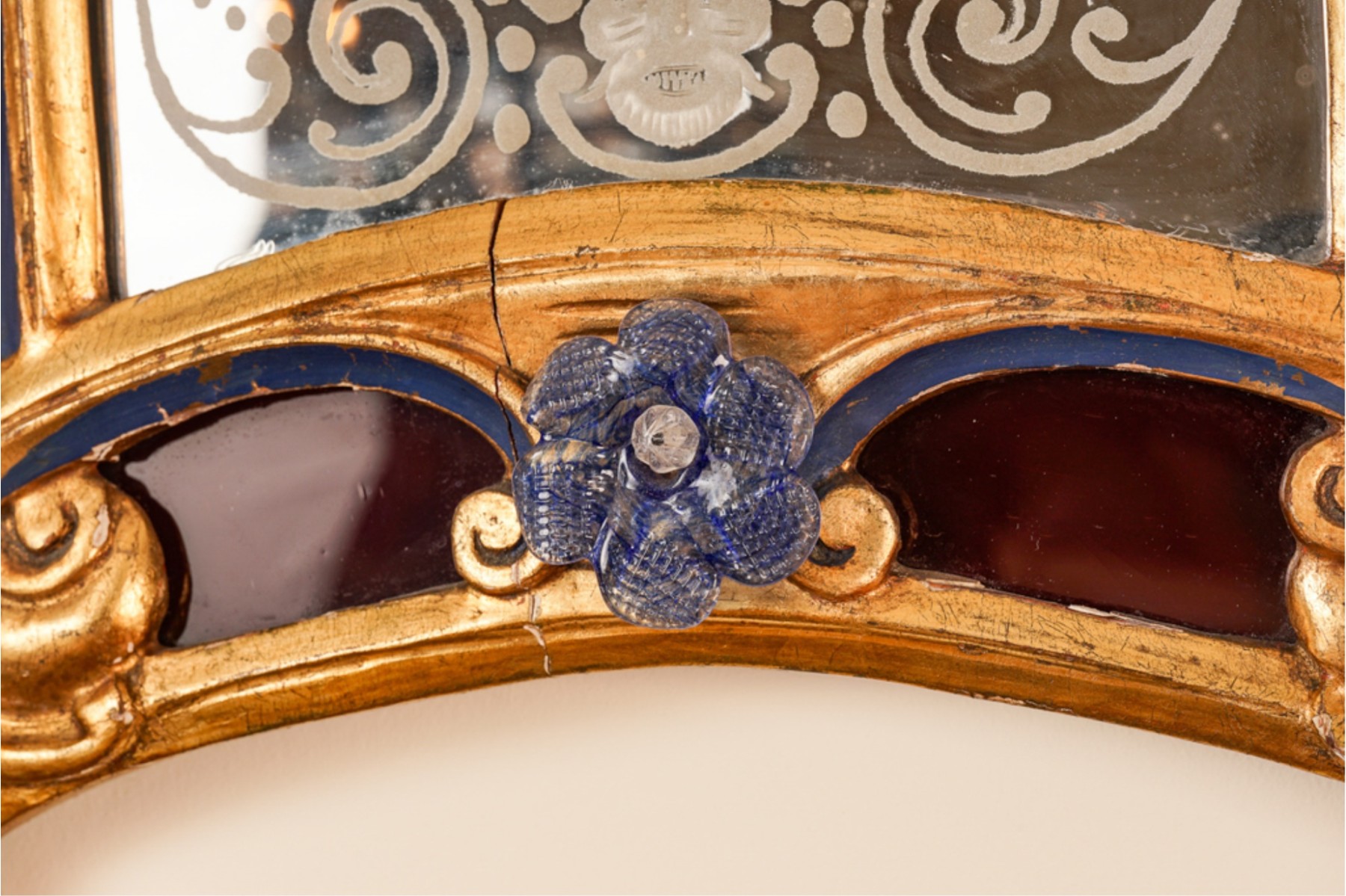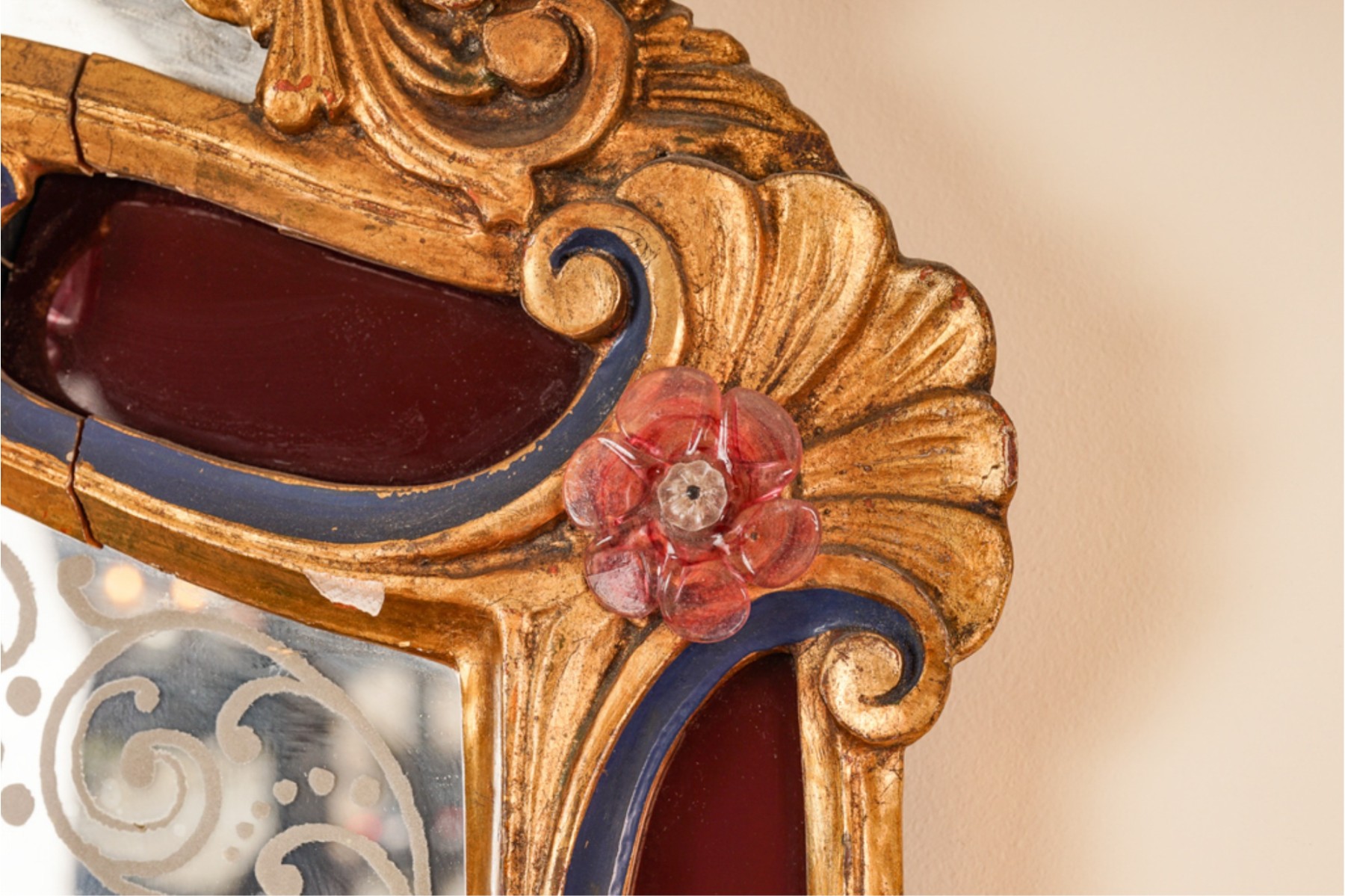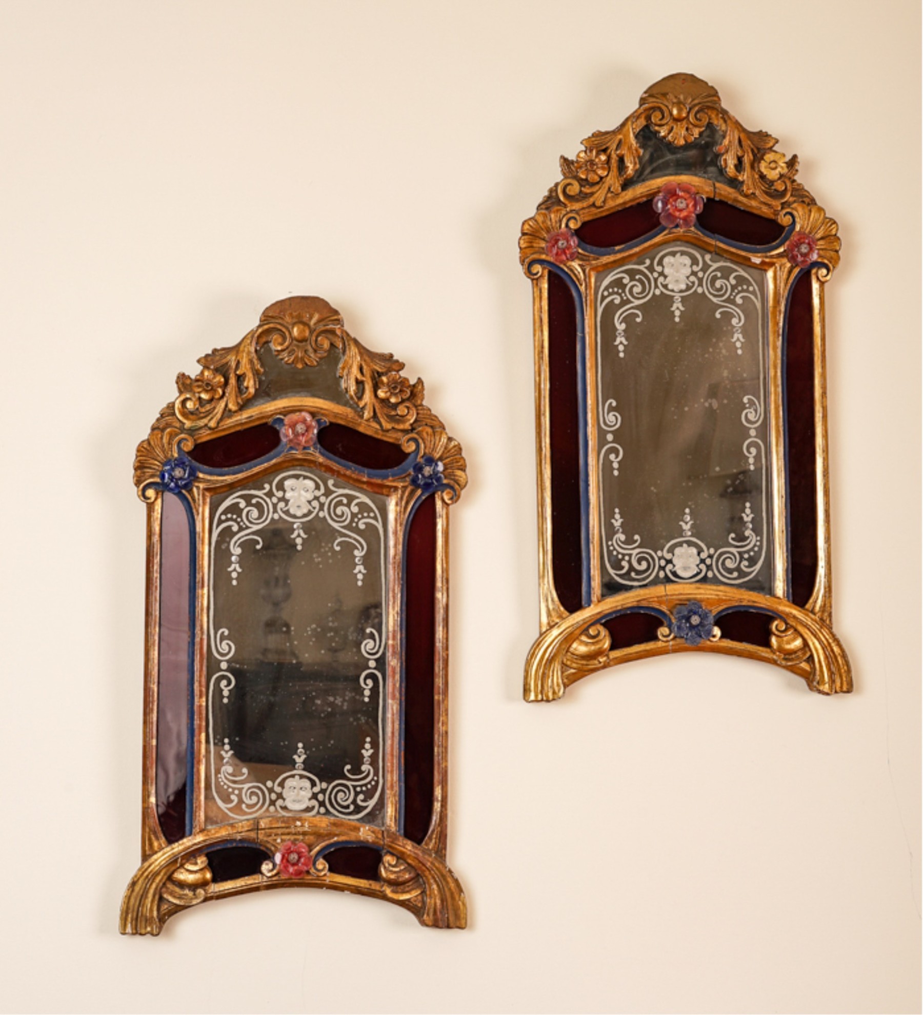 Frosted center panel bordered by ruby glass with venetian floral accents. Heavily carved crest with shells. 30 x 16 inches.
