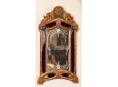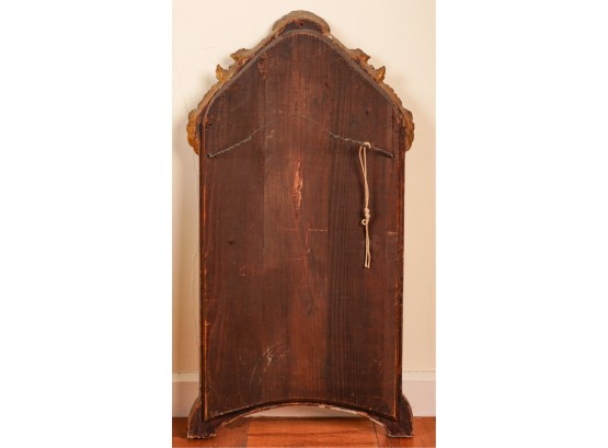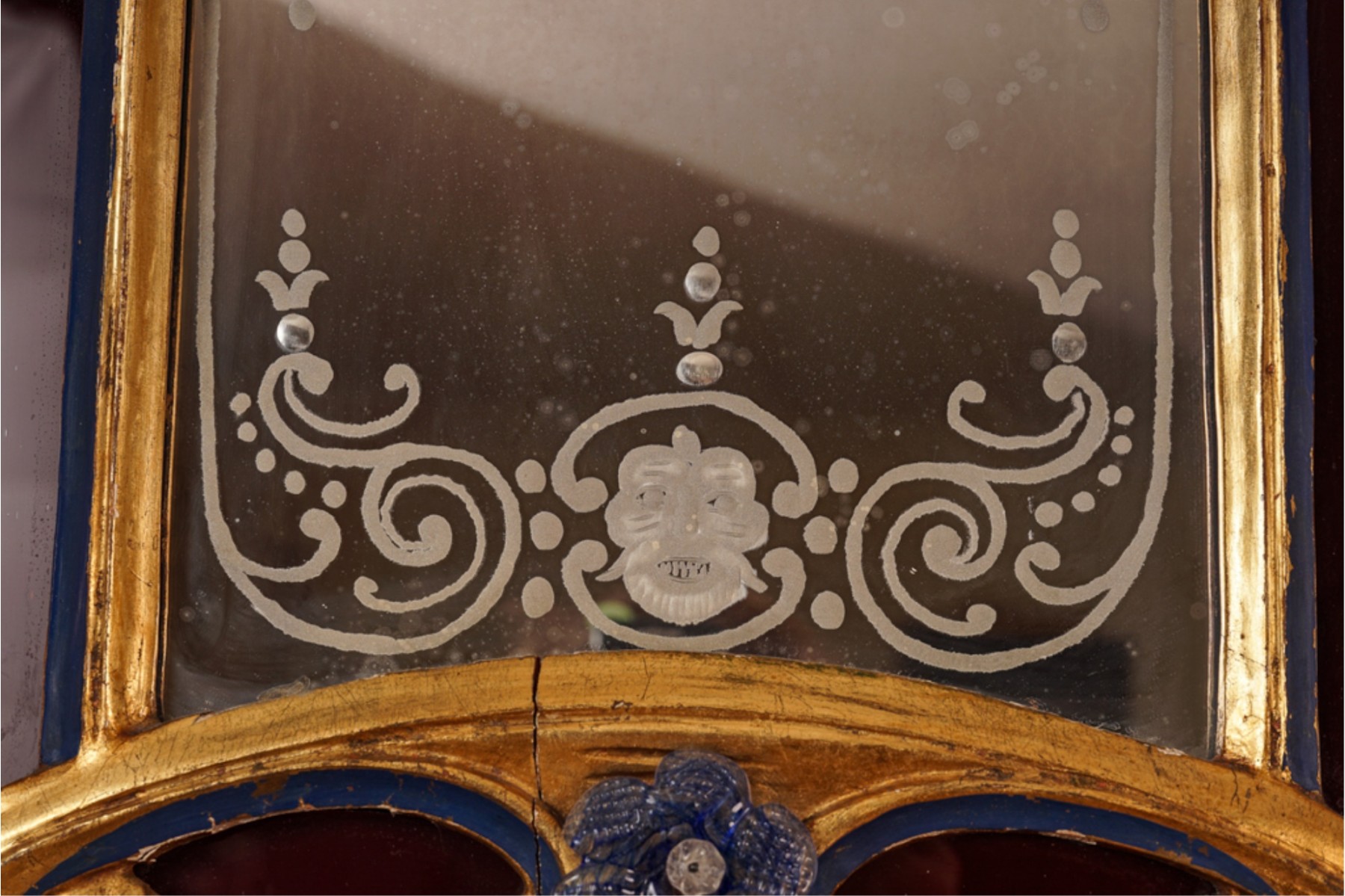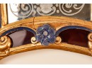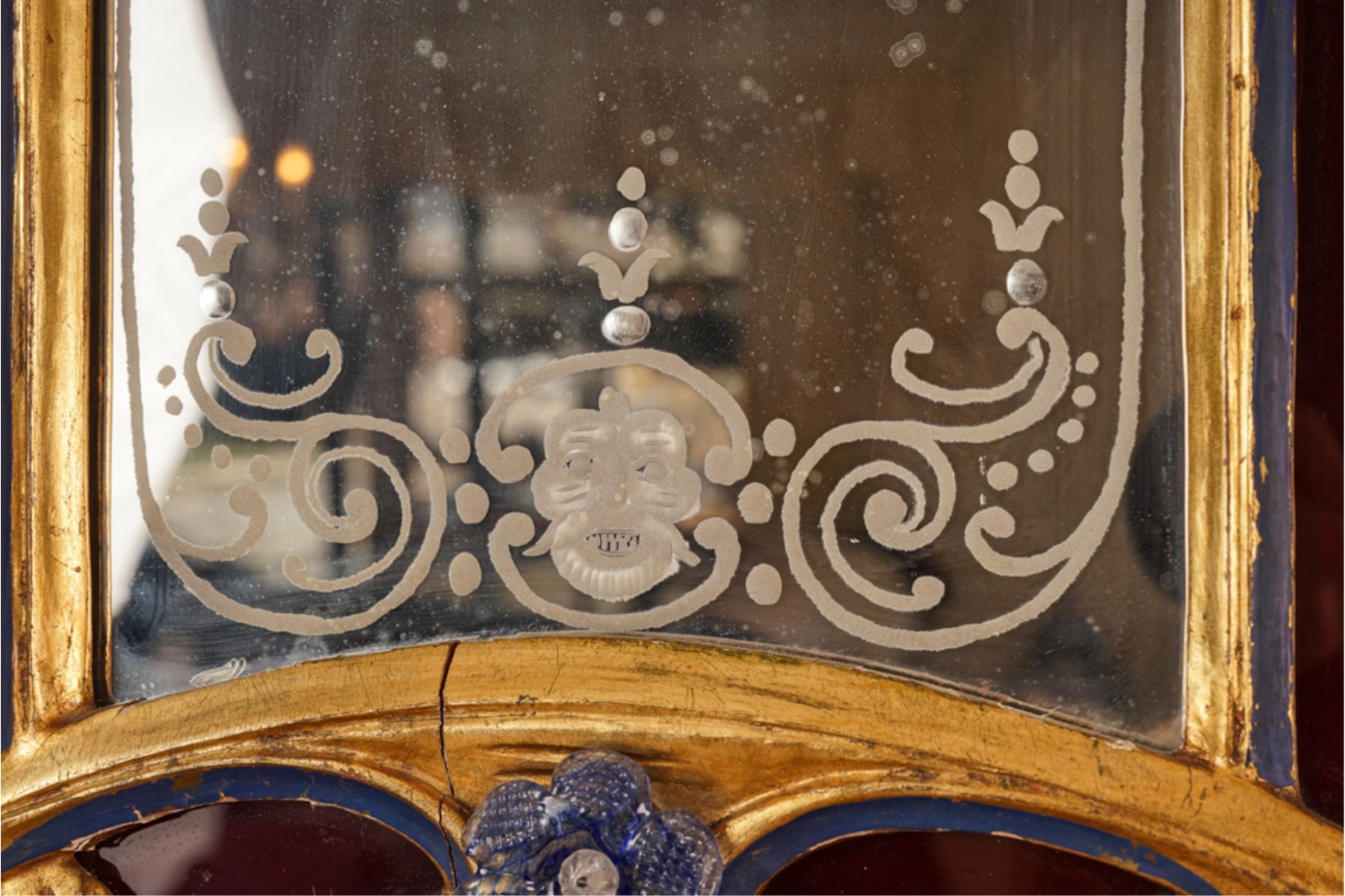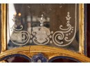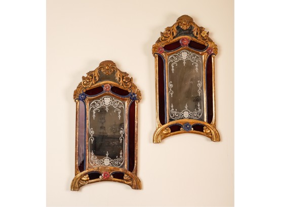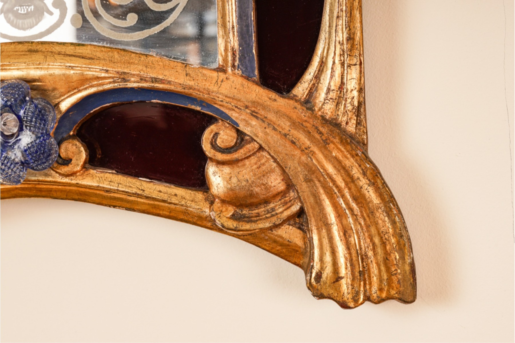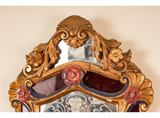 Frosted center panel bordered by ruby glass with venetian floral accents. Heavily carved crest with shells. 30 x 16 inches.