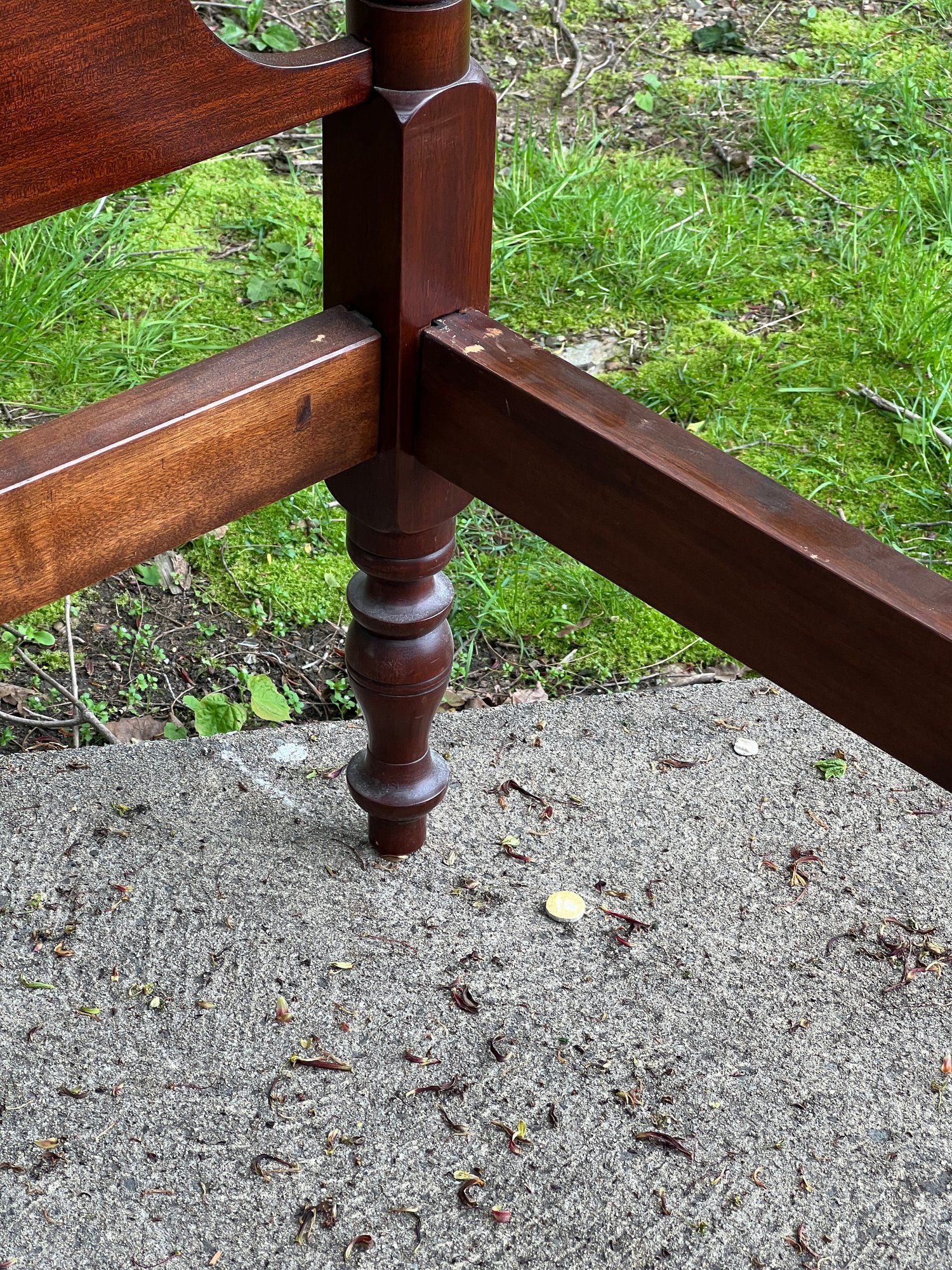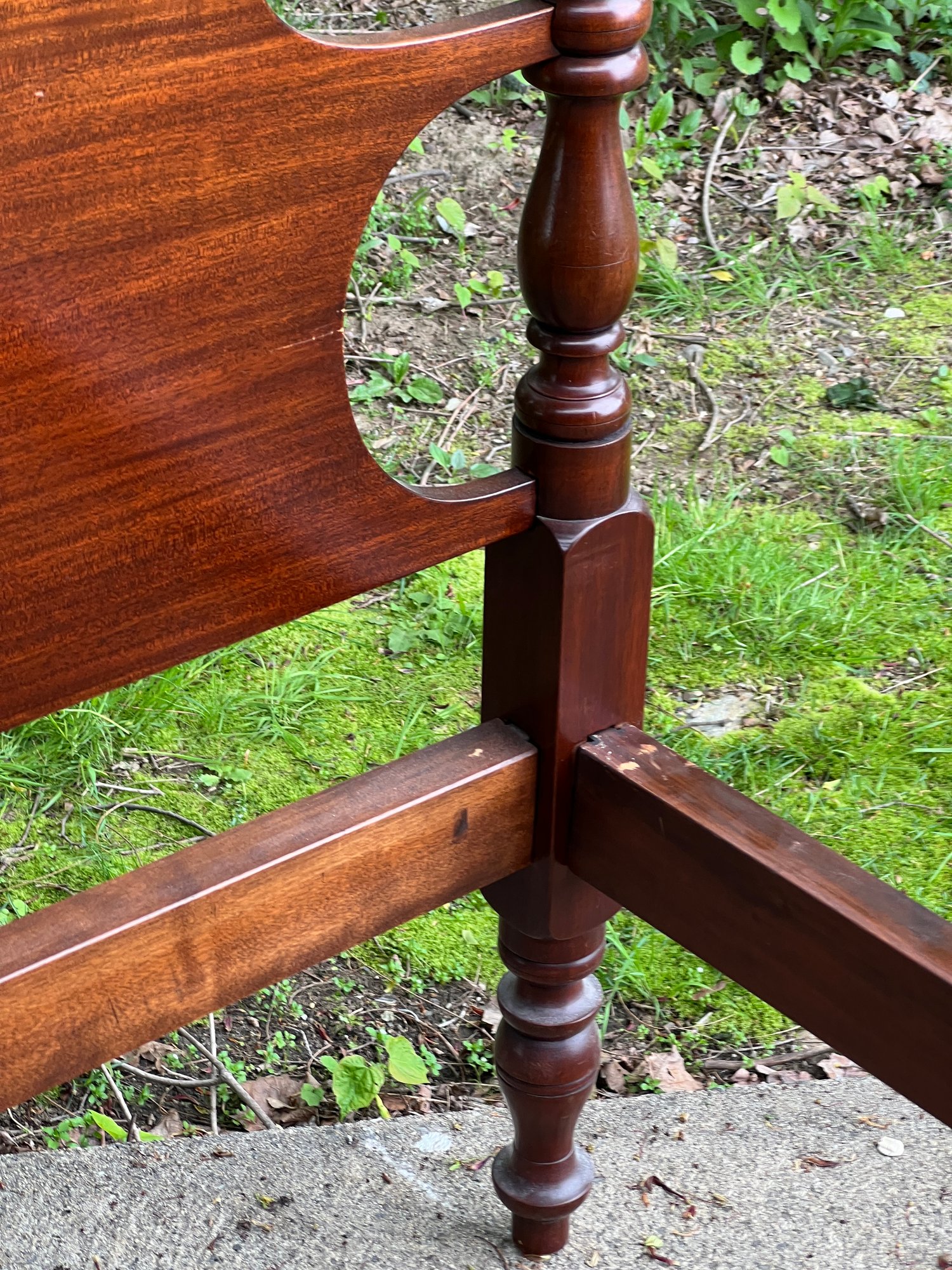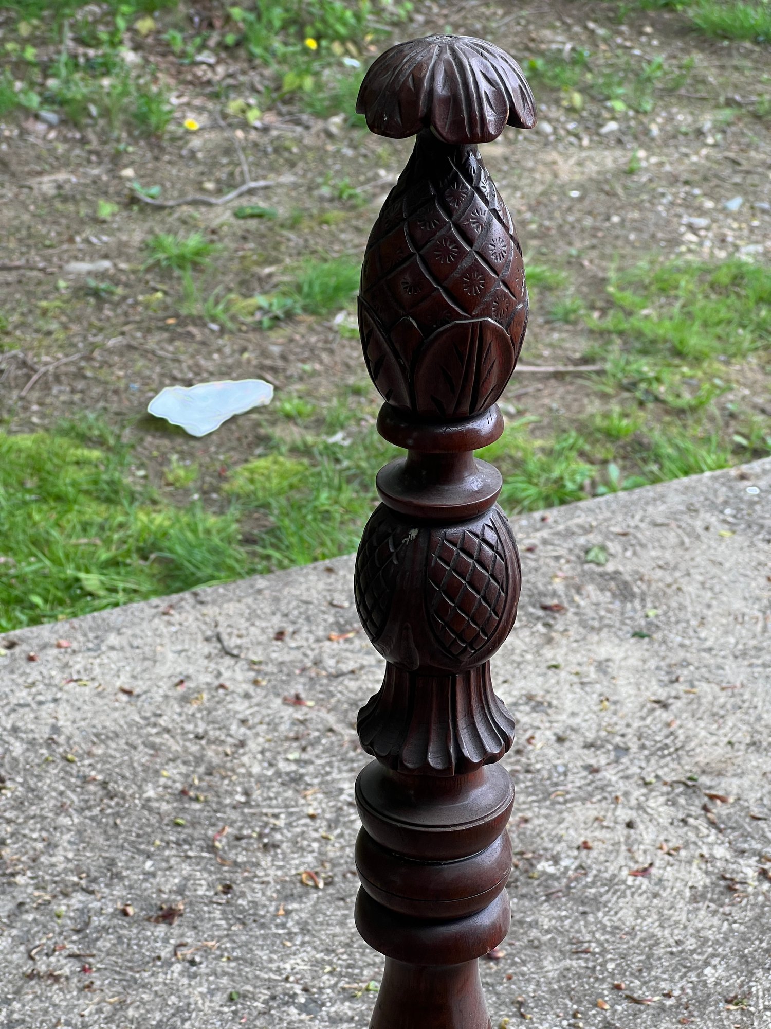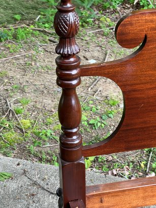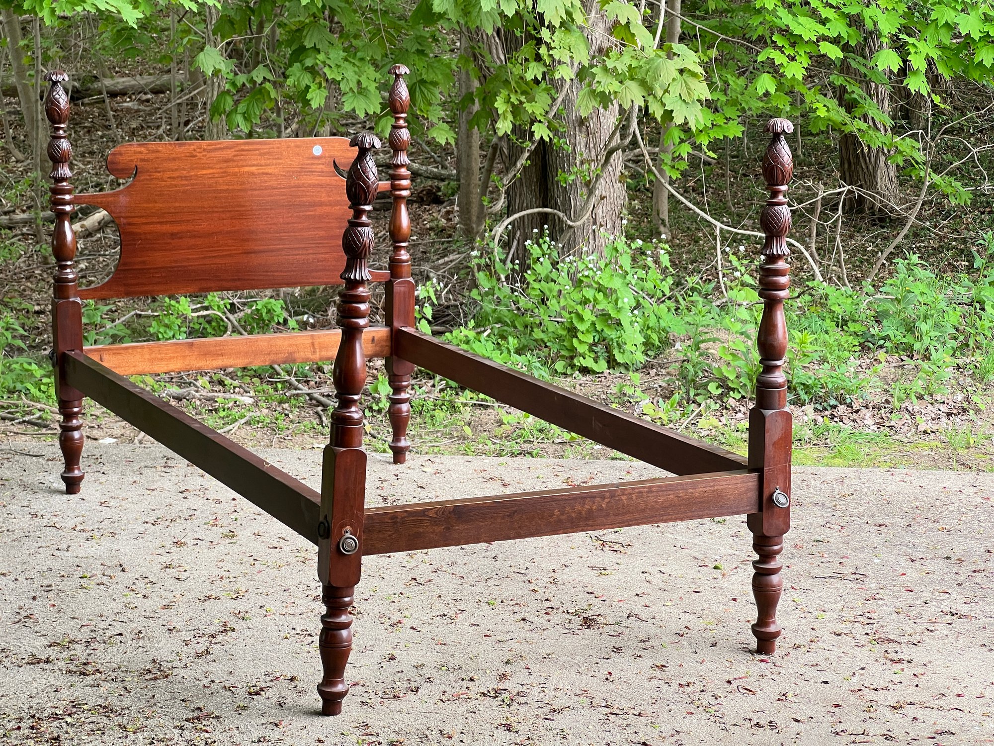 With carved pineapple finials. Height of post 48 inches. Note: Second pair not pictured has a clean break to post on headboard. Could easily be repaired.