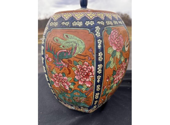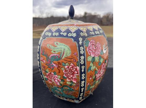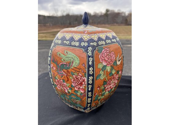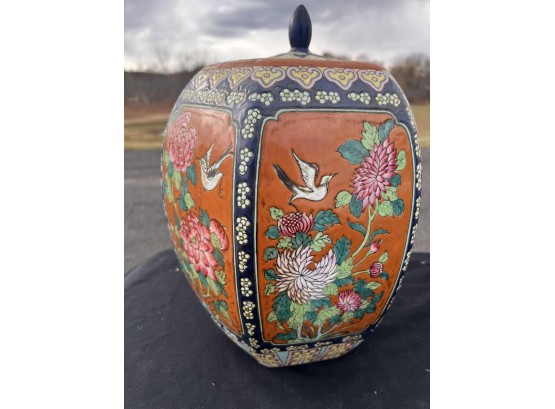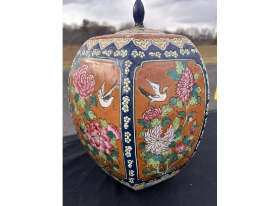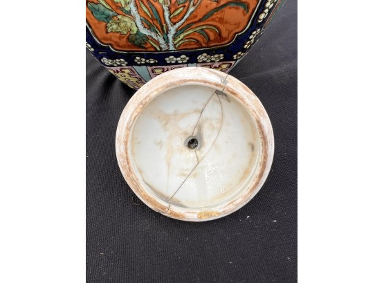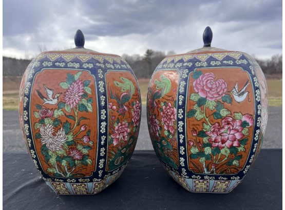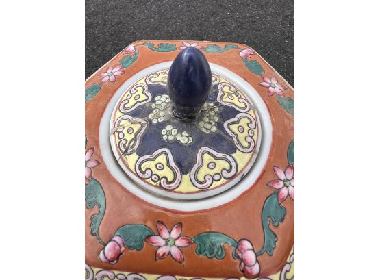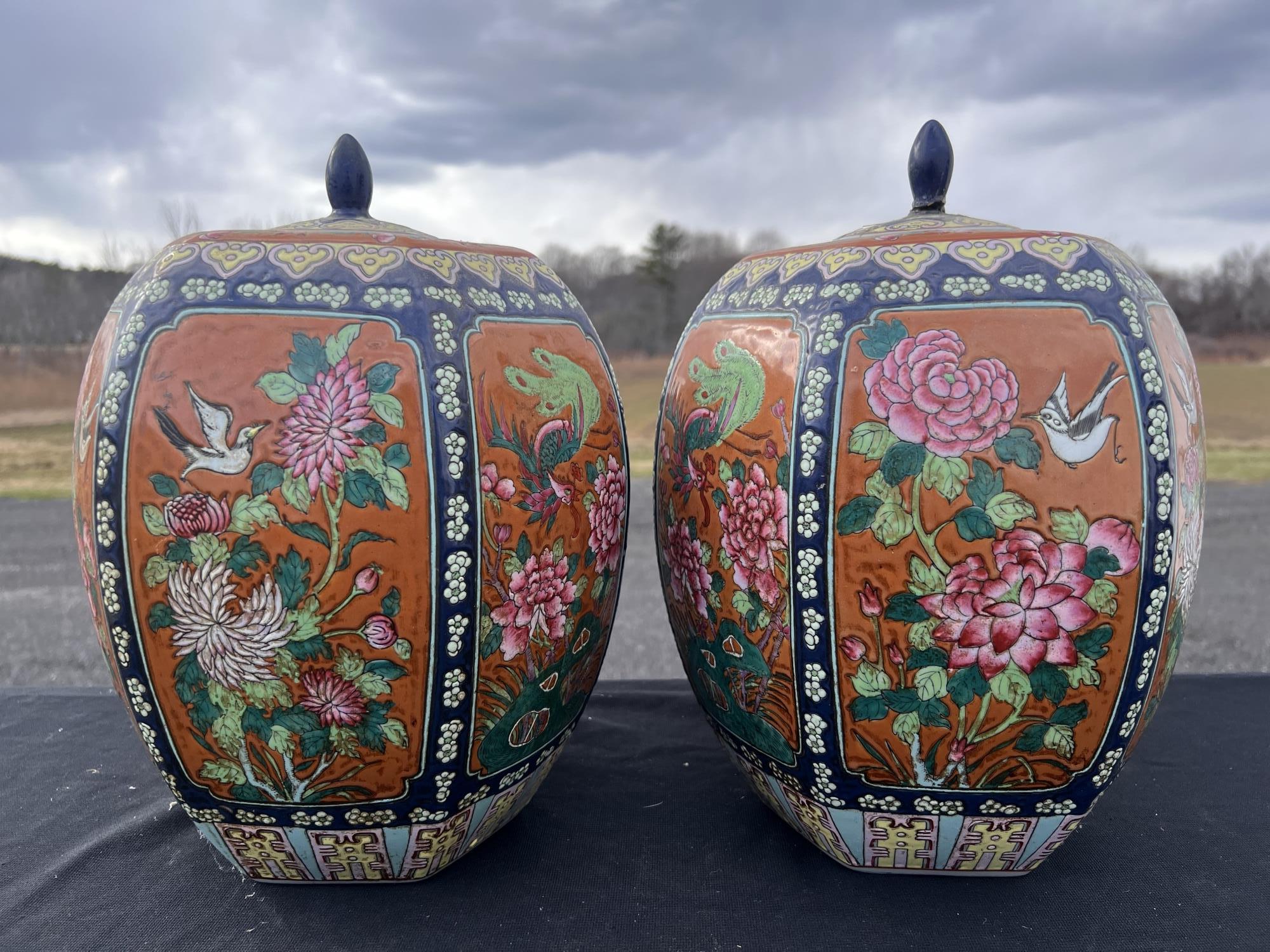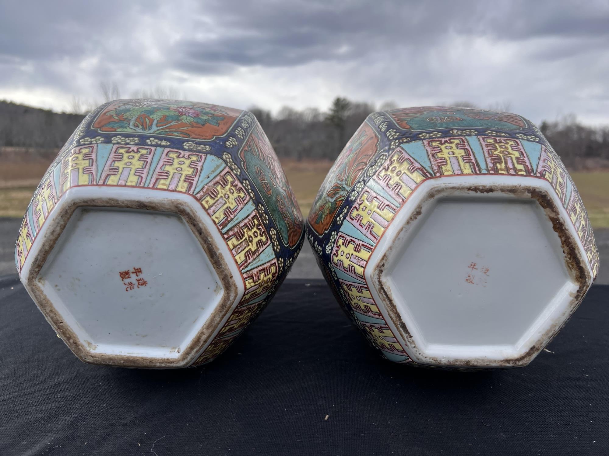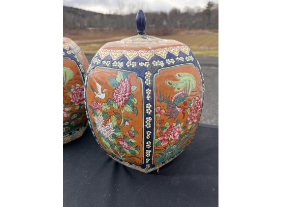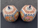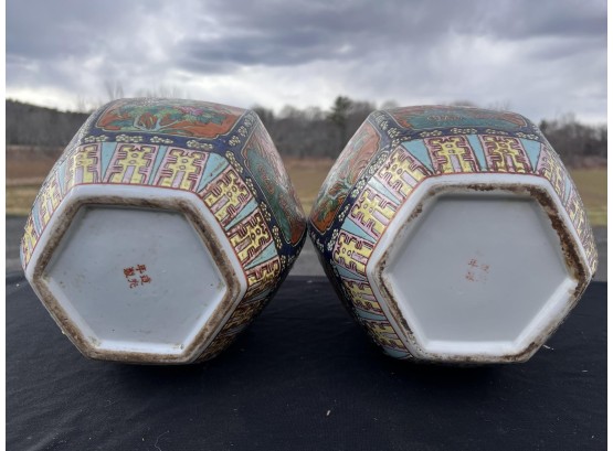 Signed in characters on bottoms. Each 13" to top of lid Condition: Cracks and repair to one lid Temp No 6644