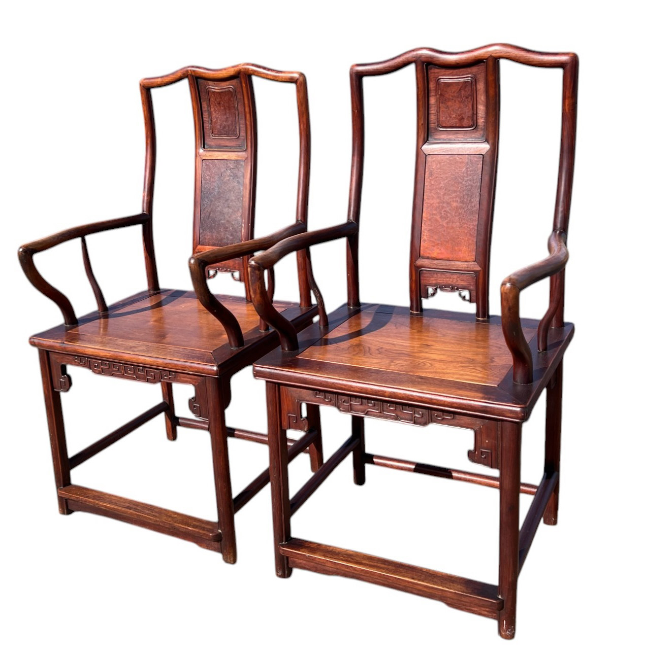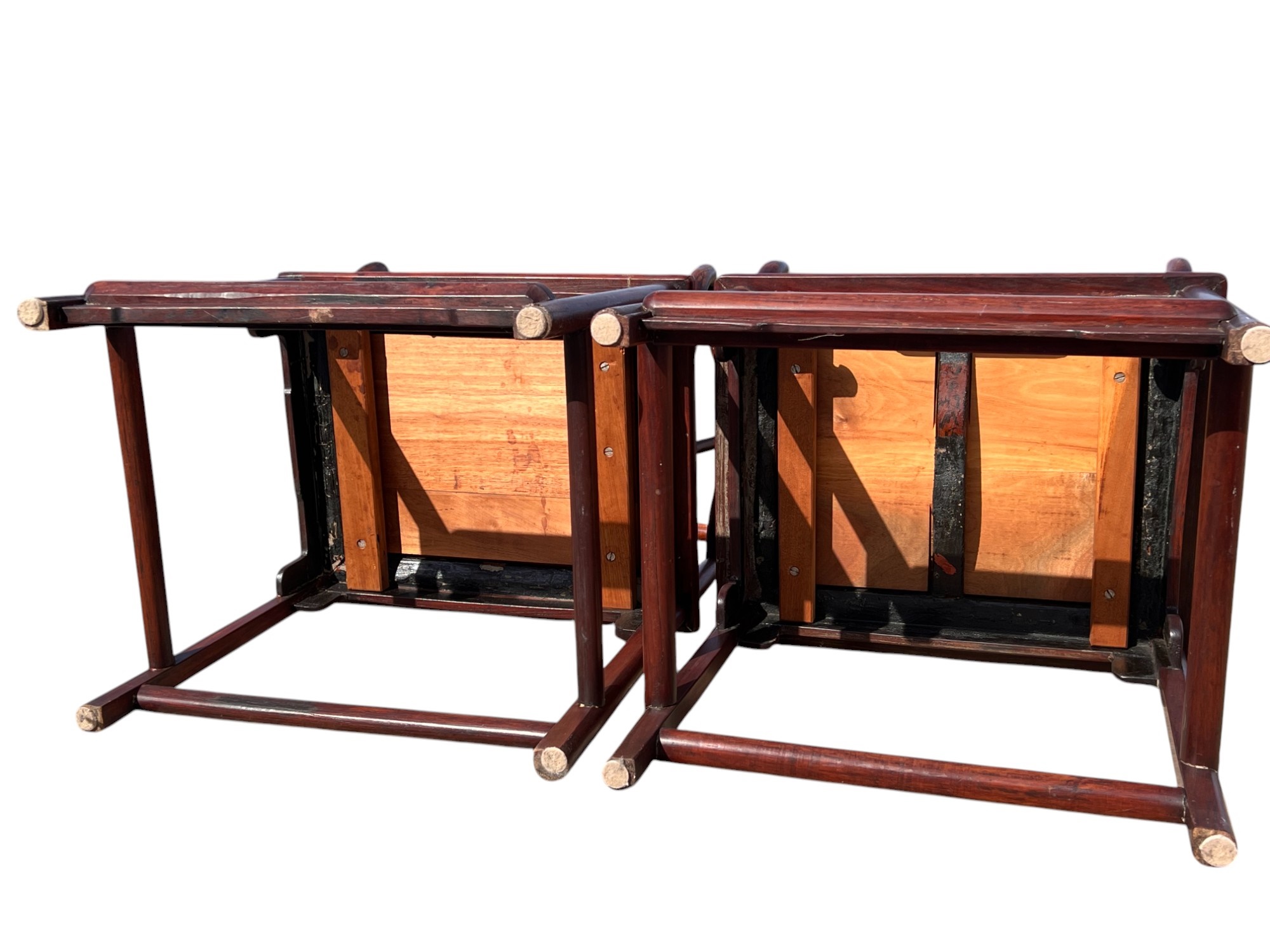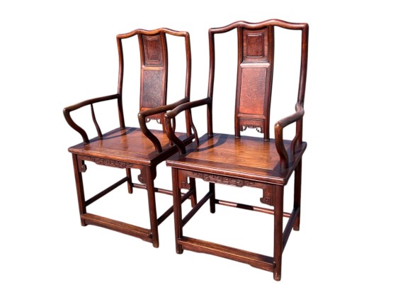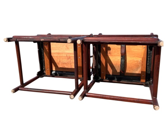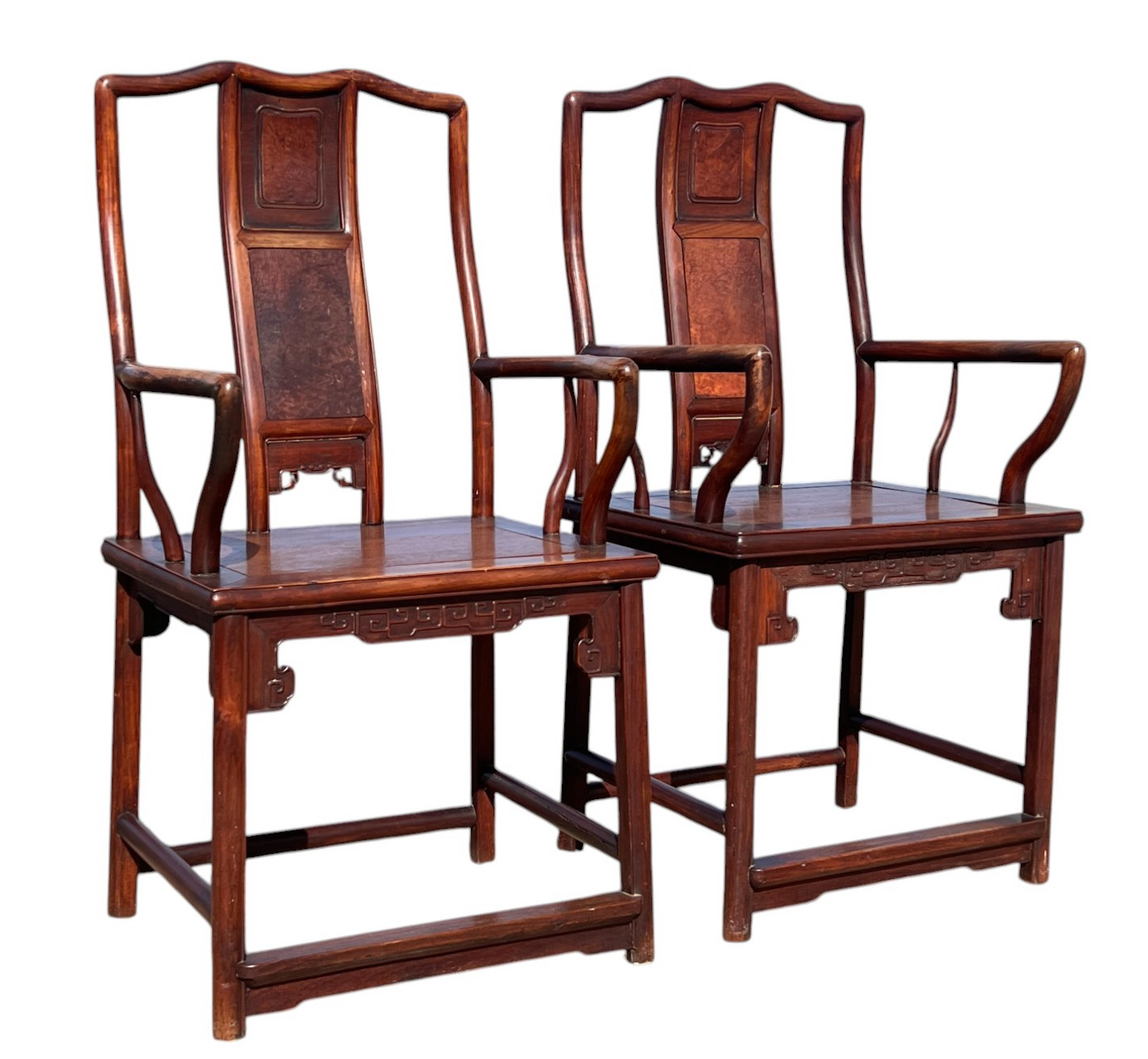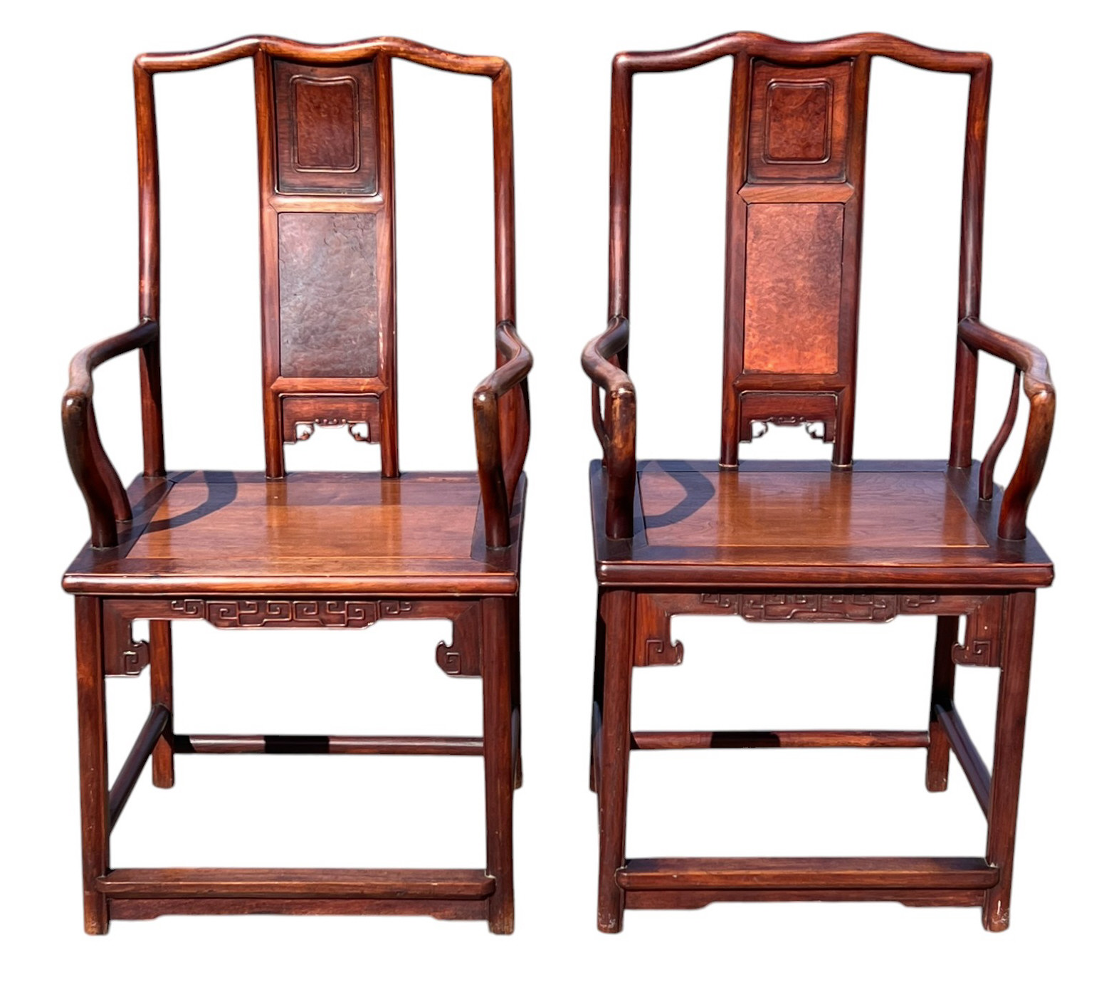 With burl wood panel backs. 42" x 21" x 17 1/2" Condition: Repairs to arm on one. Fortified seats, see photos Temp No 6514