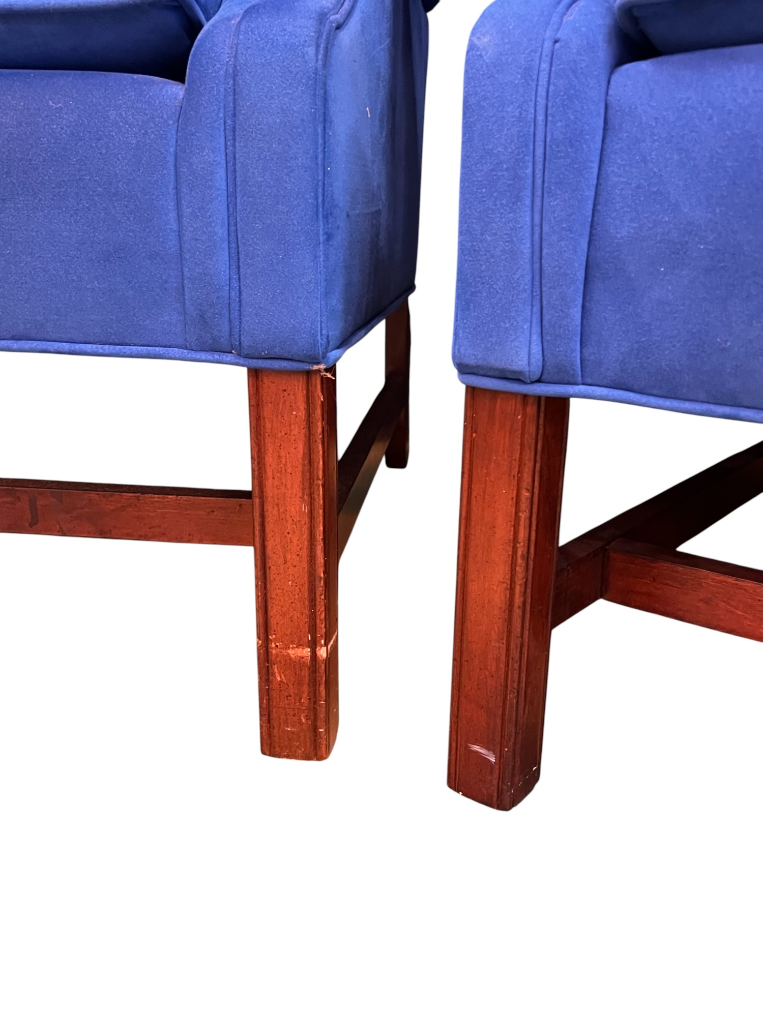Each 42" x 32" x 30" Condition: Wear to wooden finish, wear to upholstery consistent with use. Would benefit from cleaning