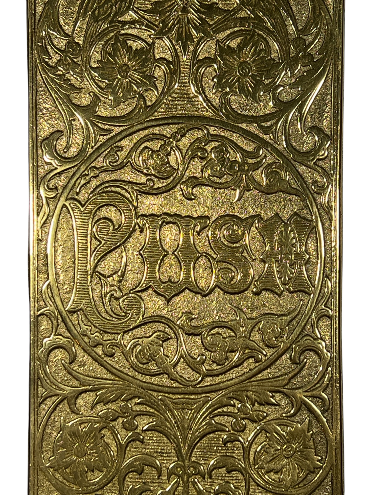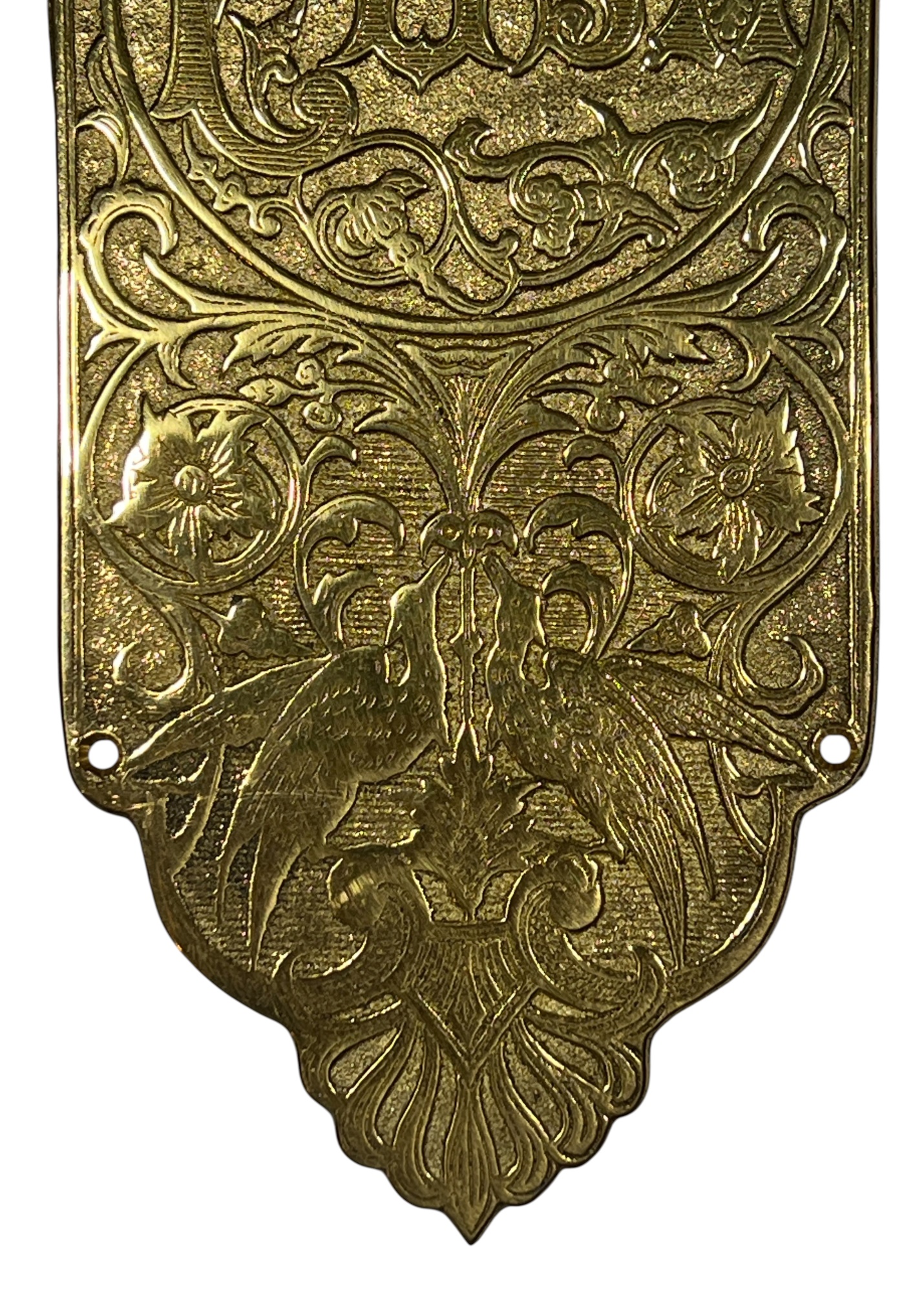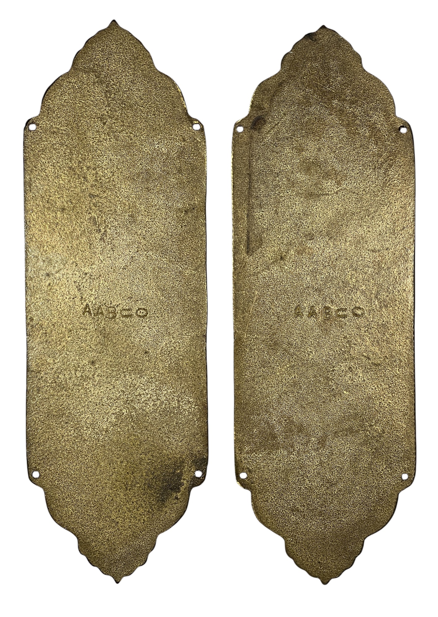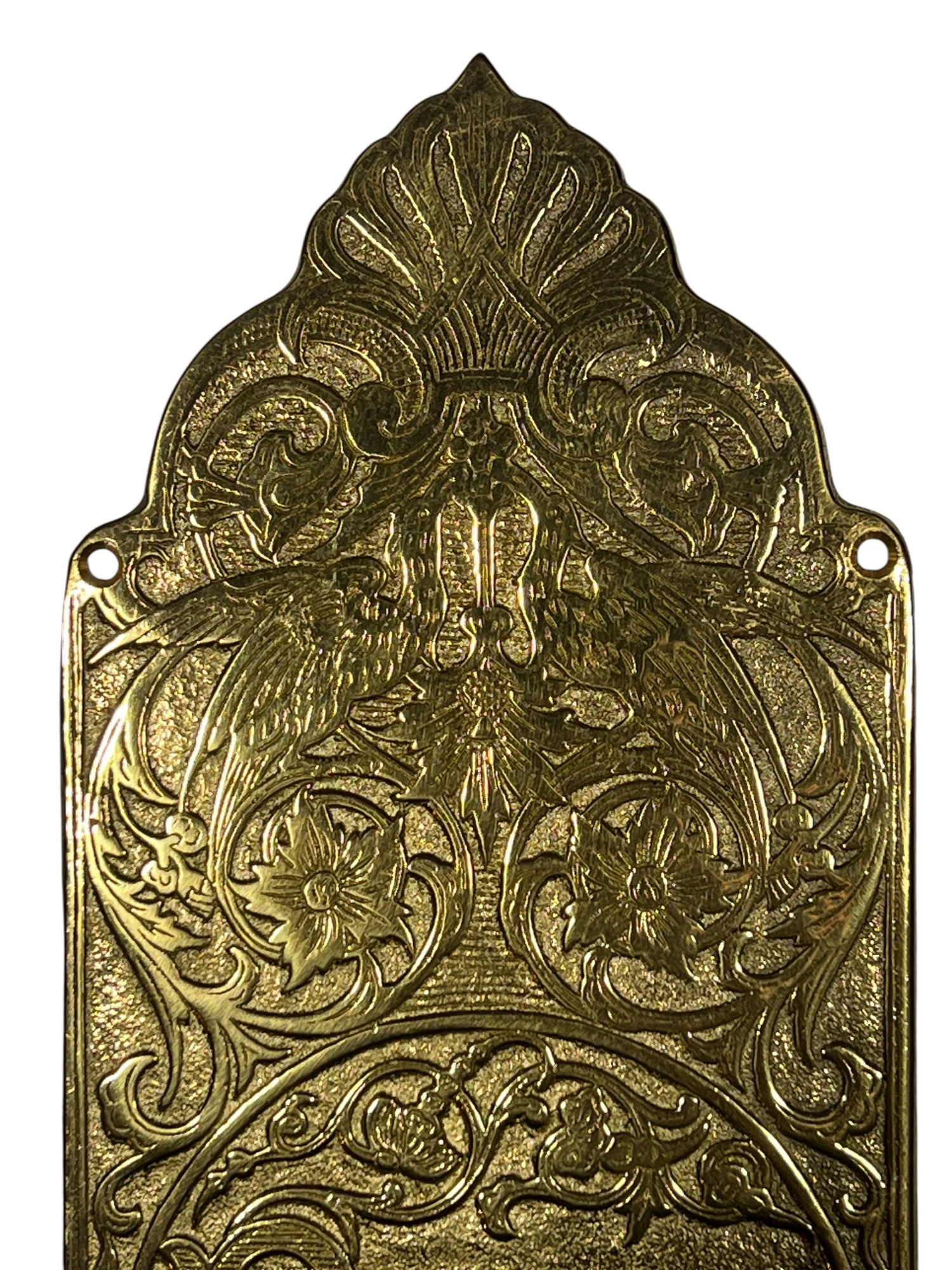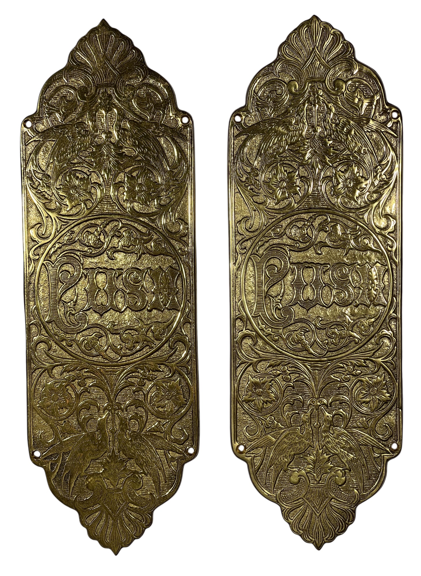Pair of finely cast AAB Co. Victorian brass door pull plaques with anthemions, birds, and floral scrolling. 12 x 4 inches. Condition: Good. Temp No 8635
