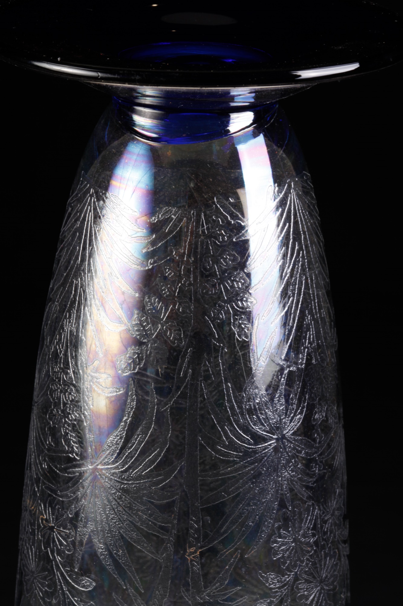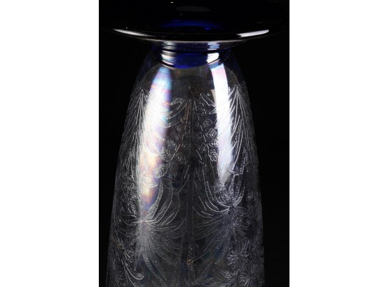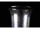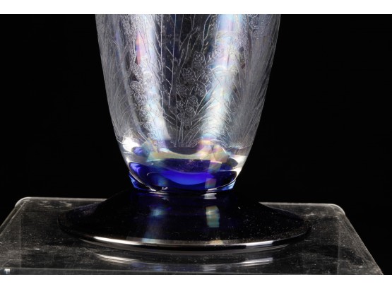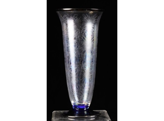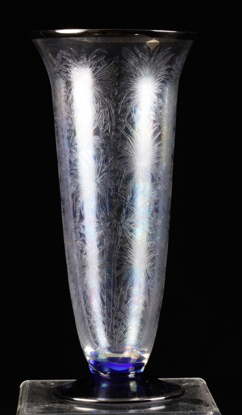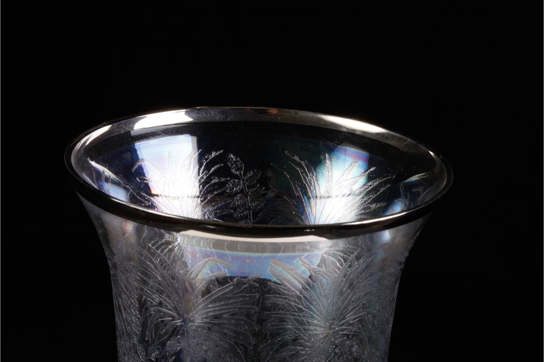 Clear glass is etched with ferns; top and base are silver trimmed.