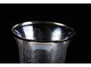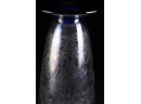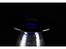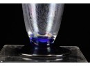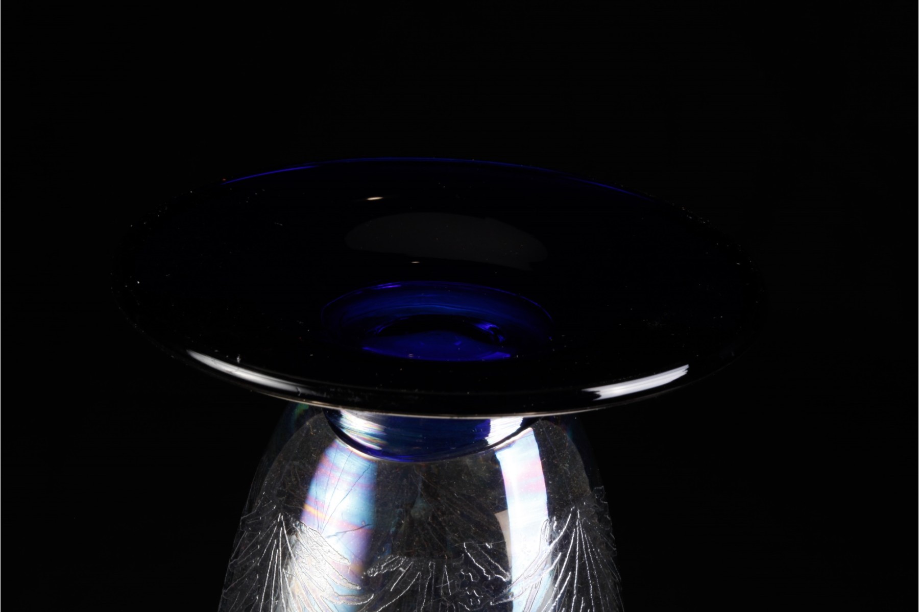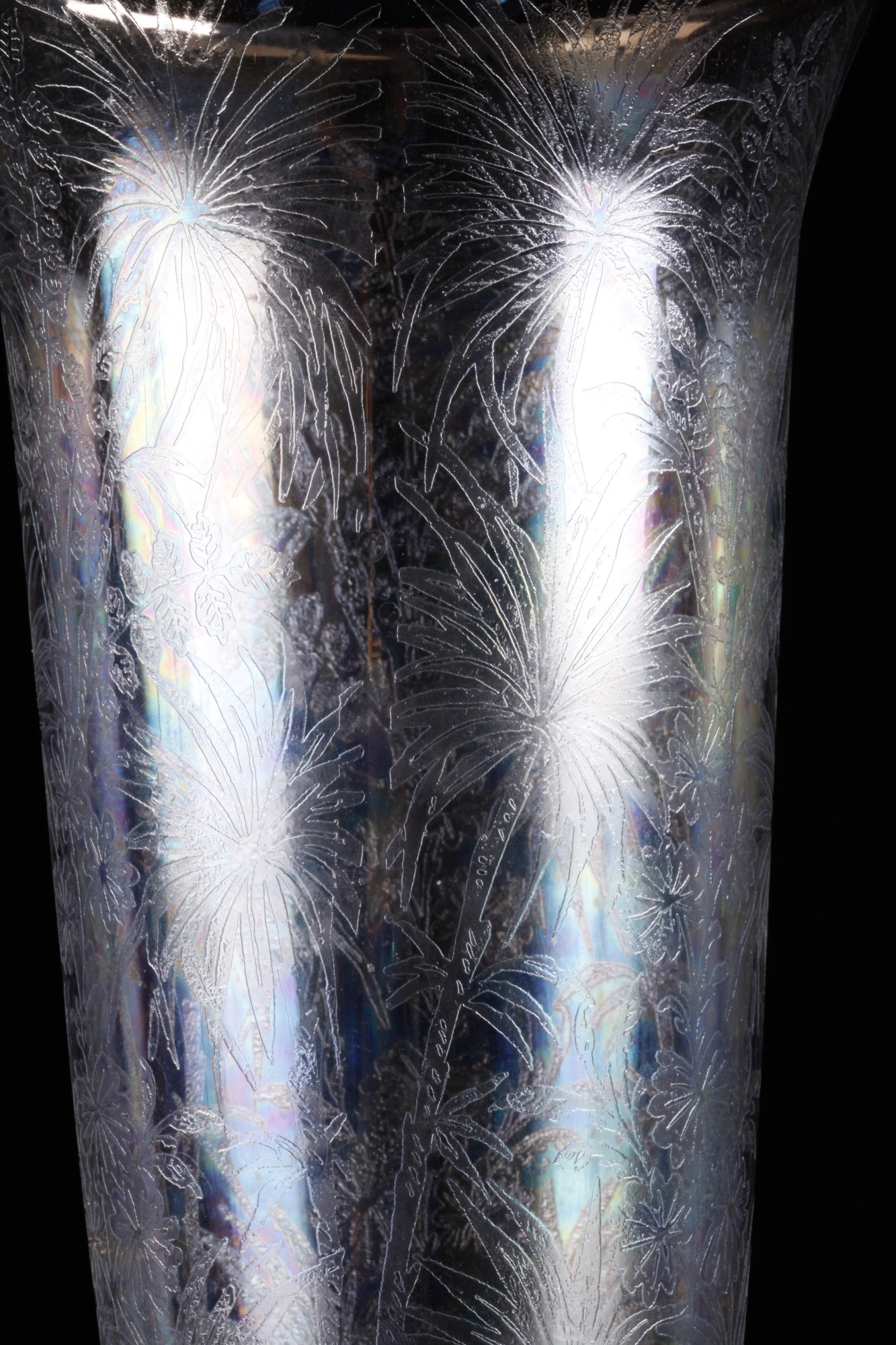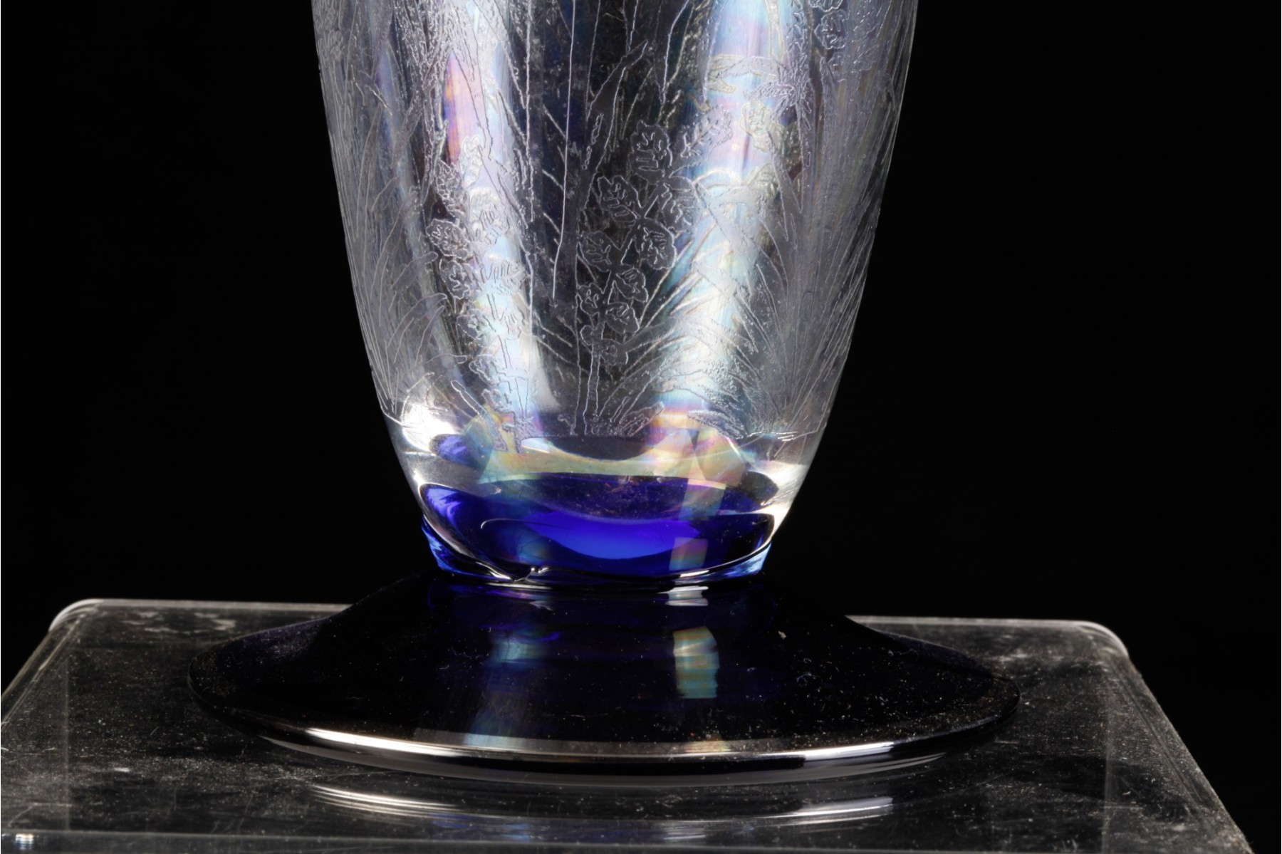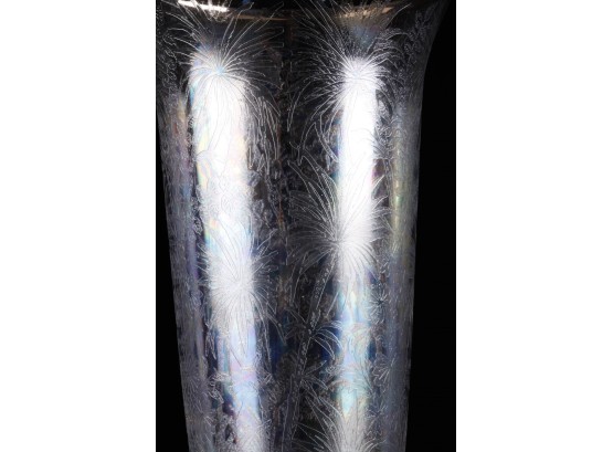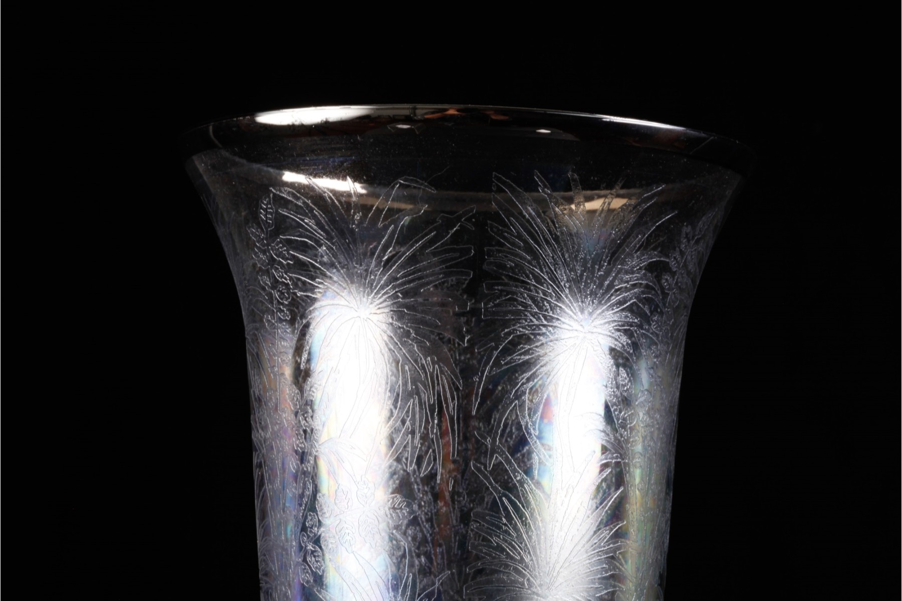 Clear glass is etched with ferns; top and base are silver trimmed.