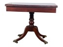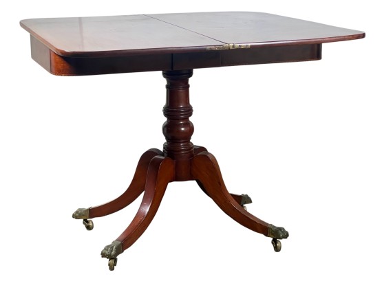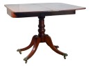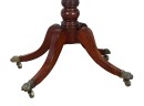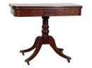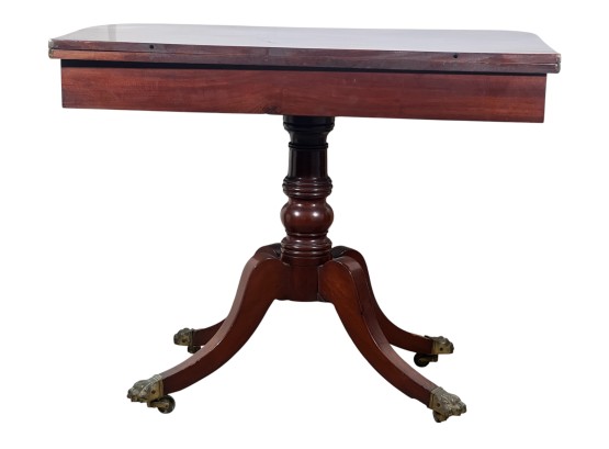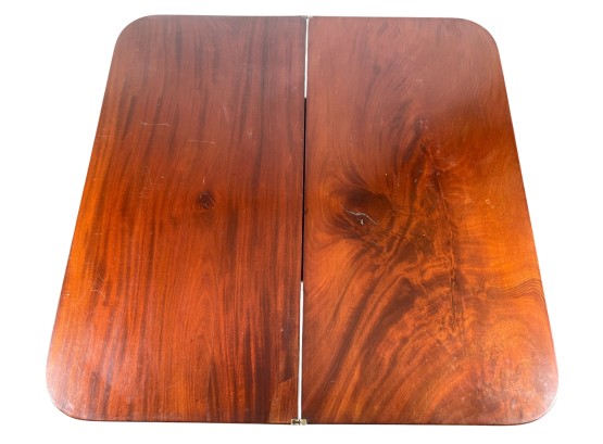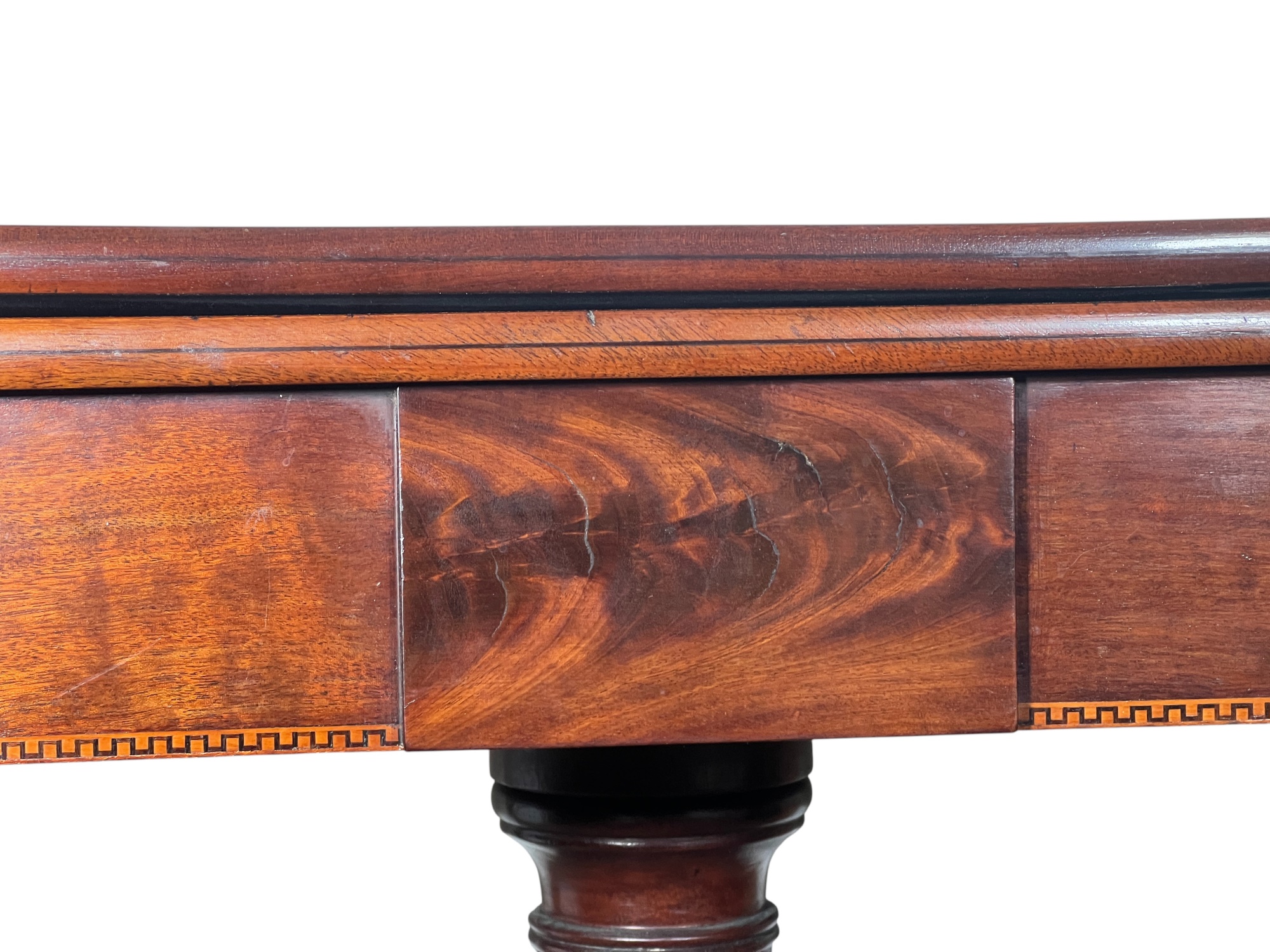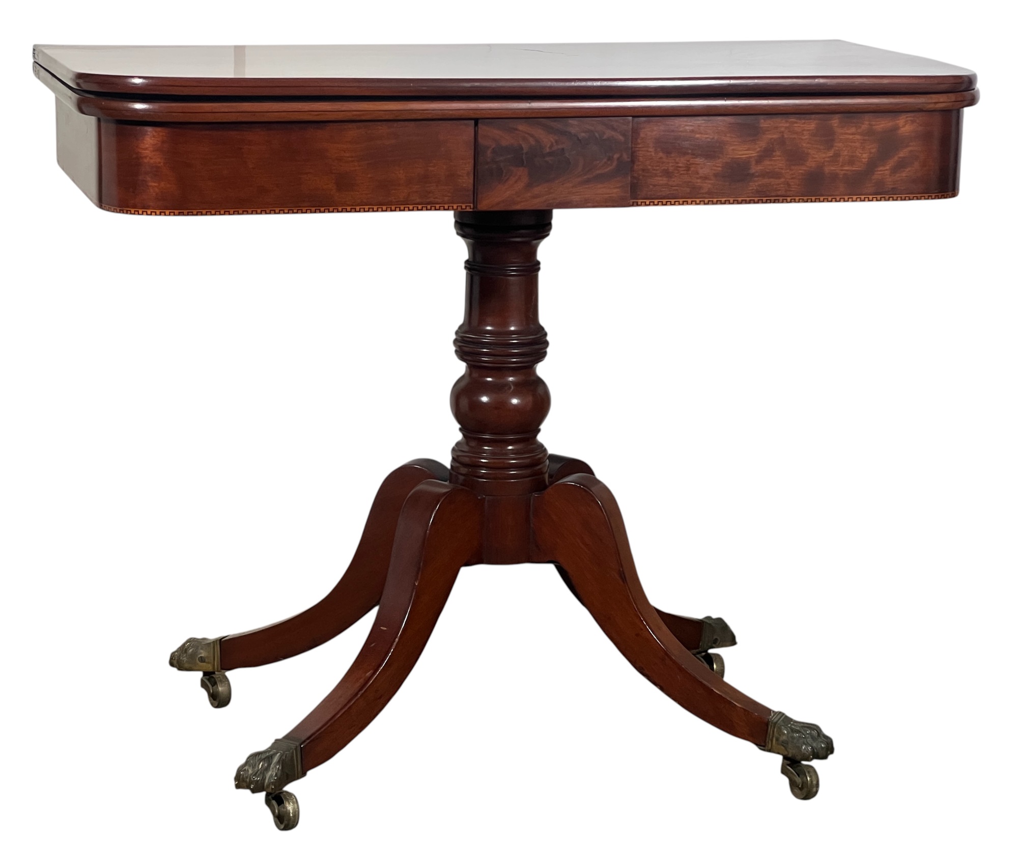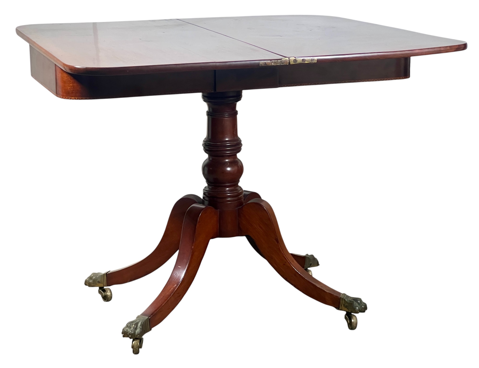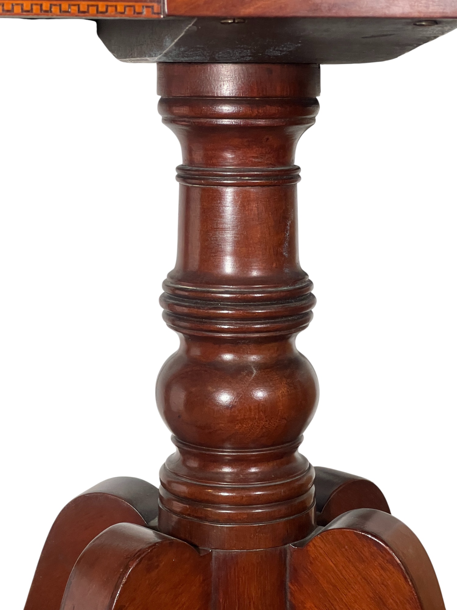 Crotch mahogany flip top, nice contrasting Greek key inlay, crotch mahogany tablet, turned pedestal, brass lions paw sabots on casters. 28 1/2 x 35 3/4 x 17 3/4 inches closed; 27 3/4 x 35 3/4 x 35 3/4 inches open. Condition: Good.