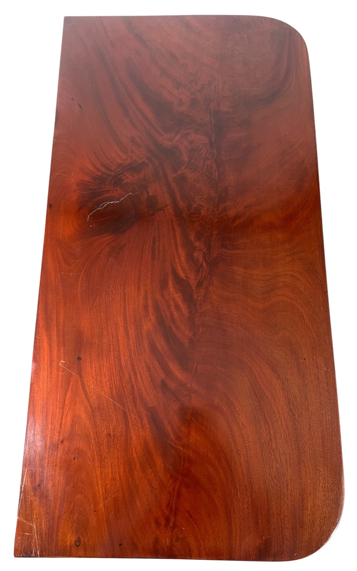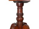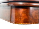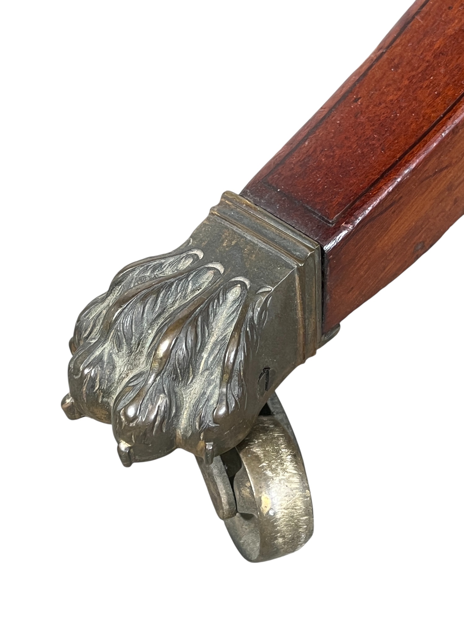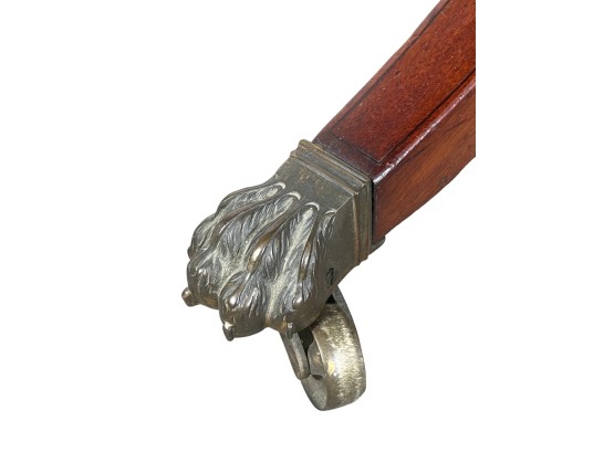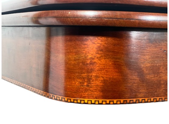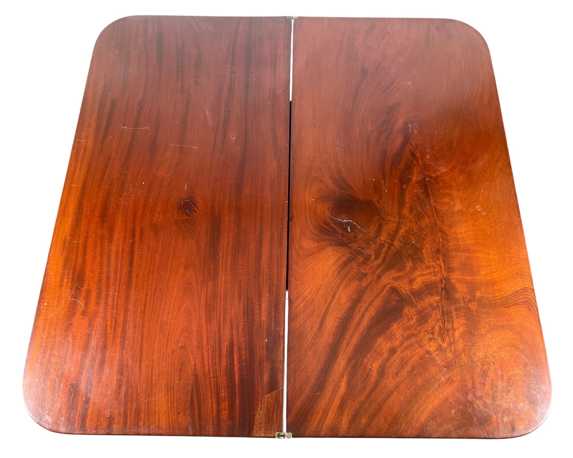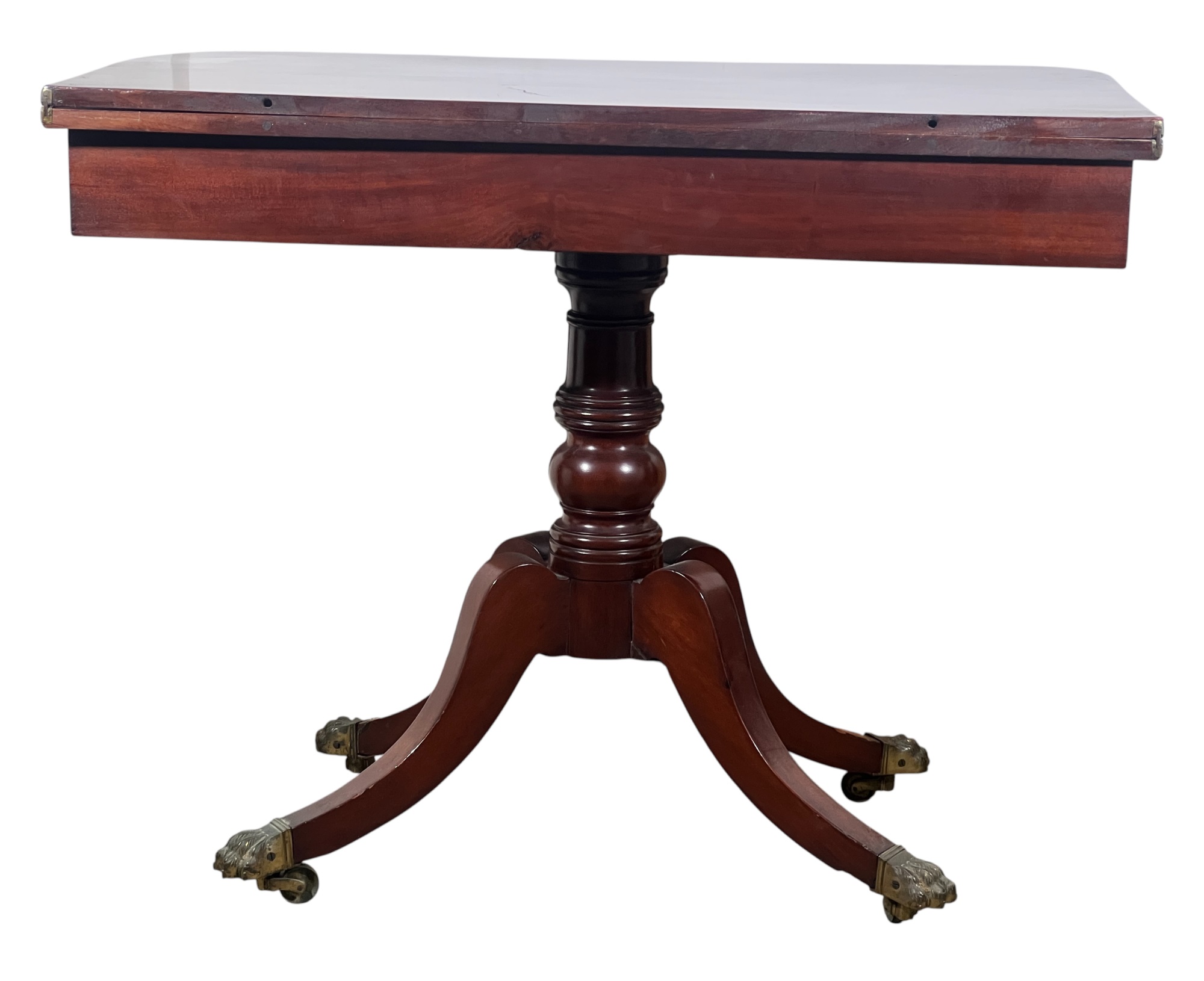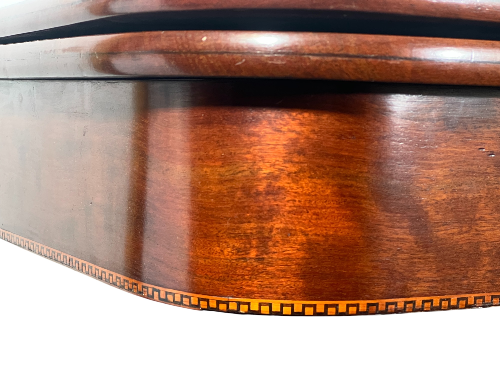 Crotch mahogany flip top, nice contrasting Greek key inlay, crotch mahogany tablet, turned pedestal, brass lions paw sabots on casters. 28 1/2 x 35 3/4 x 17 3/4 inches closed; 27 3/4 x 35 3/4 x 35 3/4 inches open. Condition: Good.