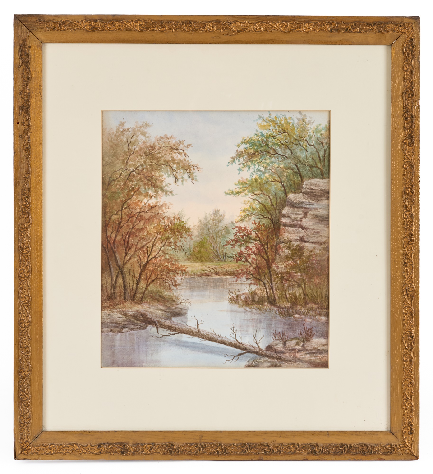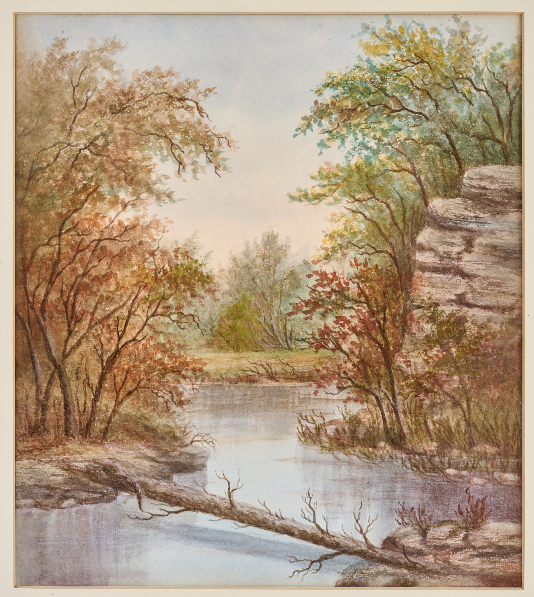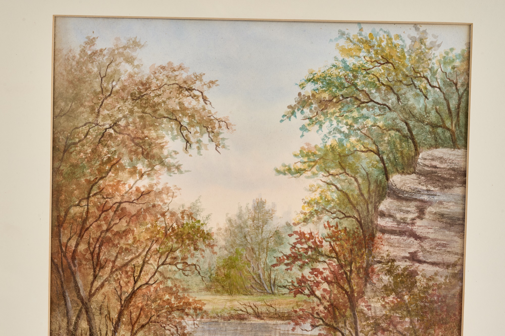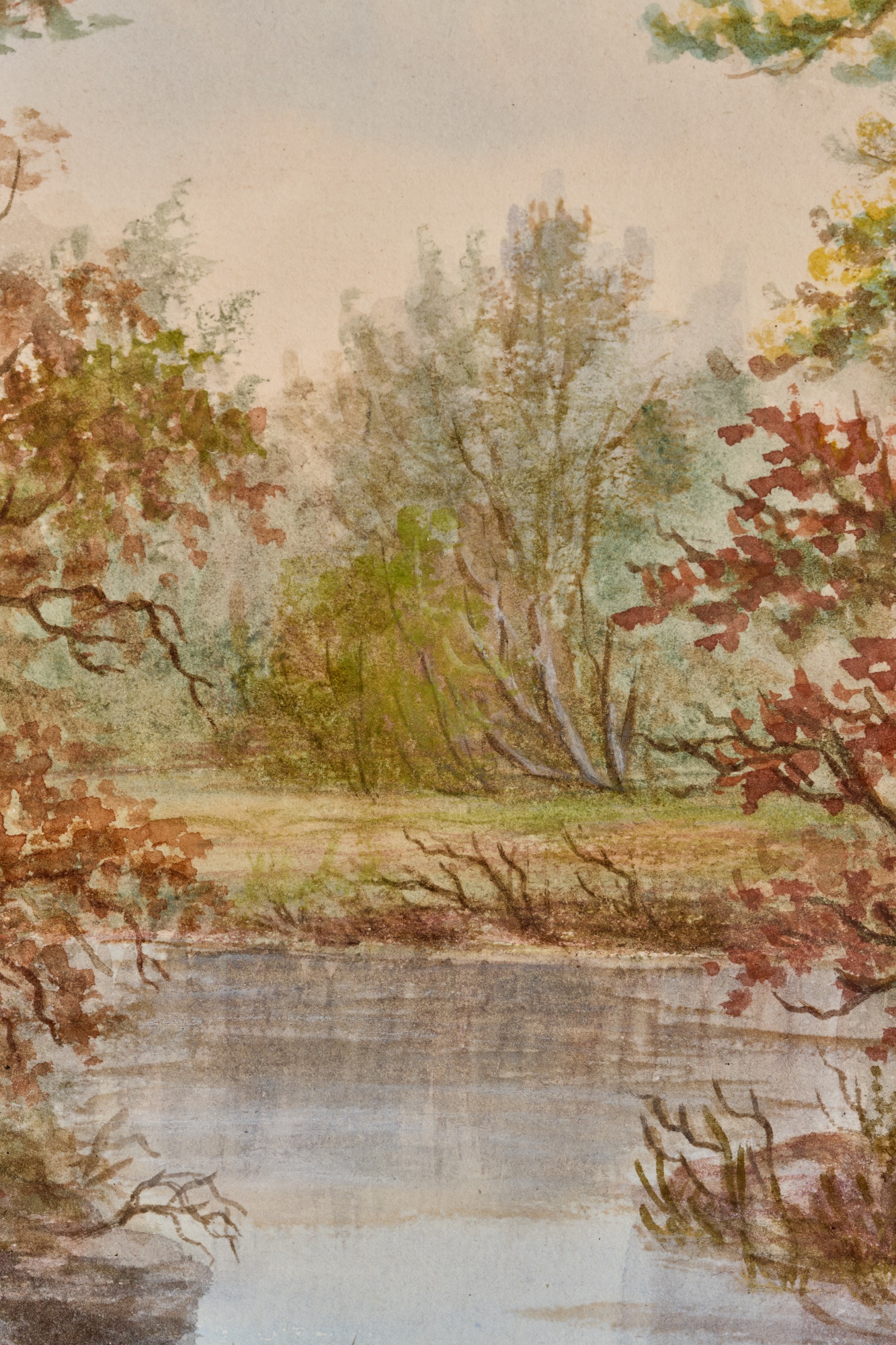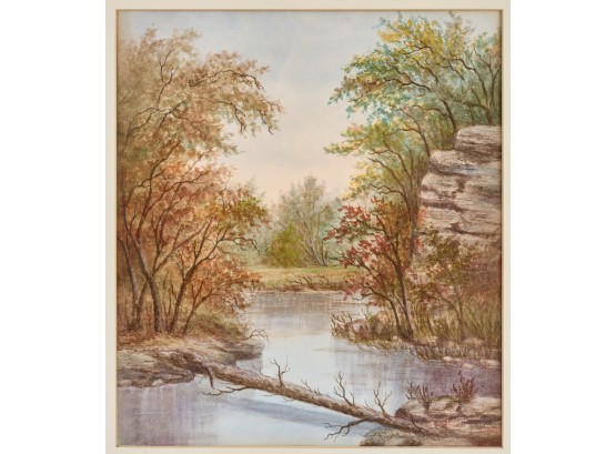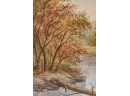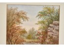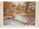 Autumnal Landscape with Boulder and Stream. 13 x 11.5 inches. unsigned. Framed 22 x 20 inches (overall) Condition: Good