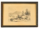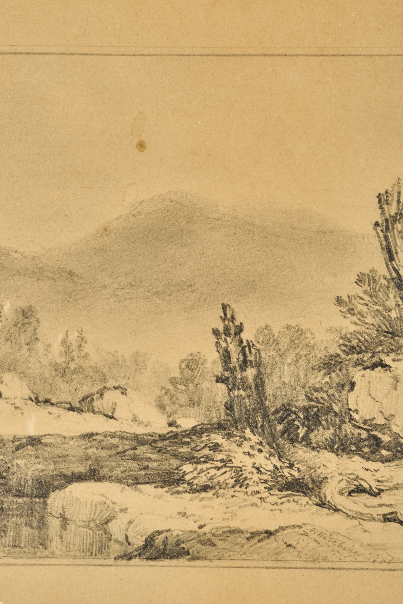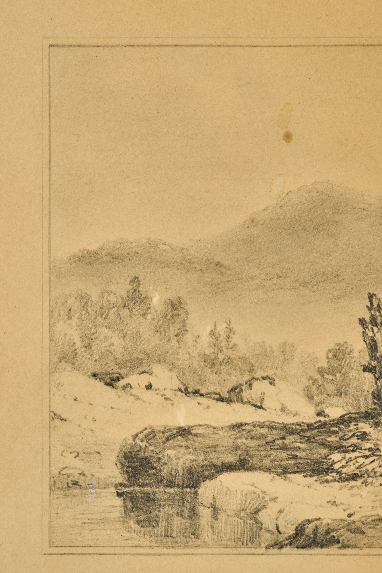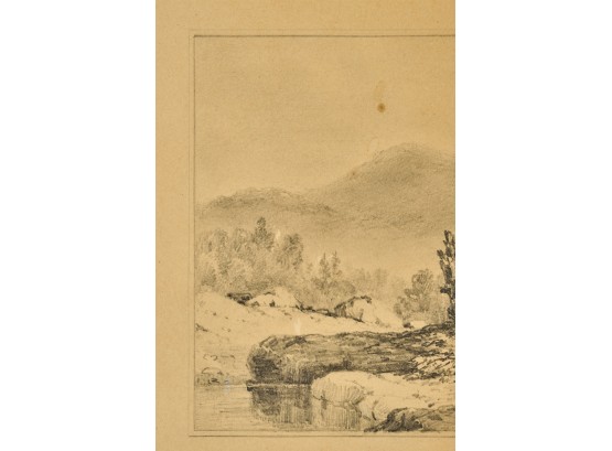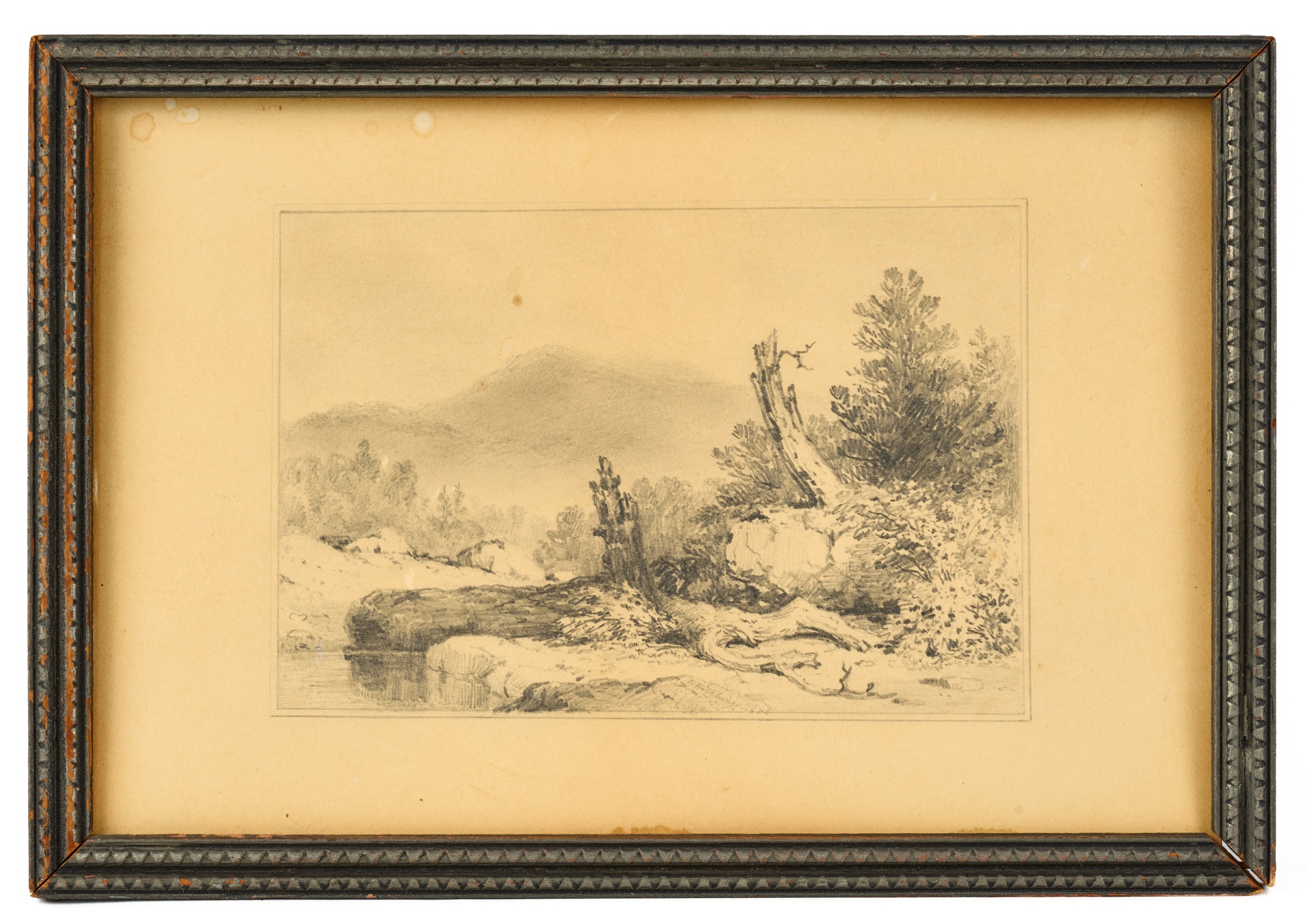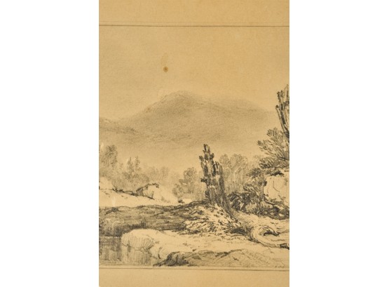 Mountain Landscape / graphite on paper. 7 x 9.5 inches (including frame) Condition: Toning, surface grime Temp No 6224