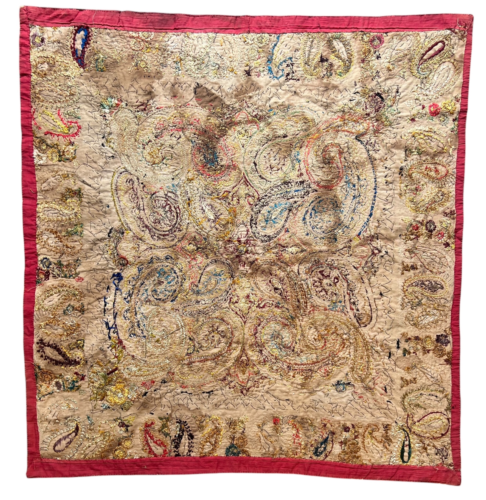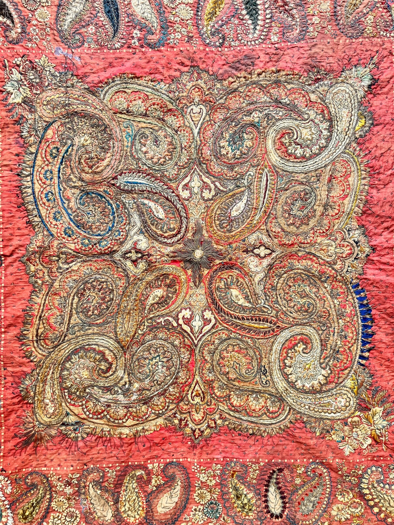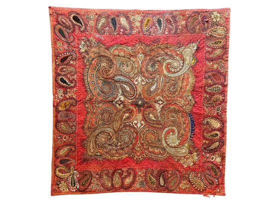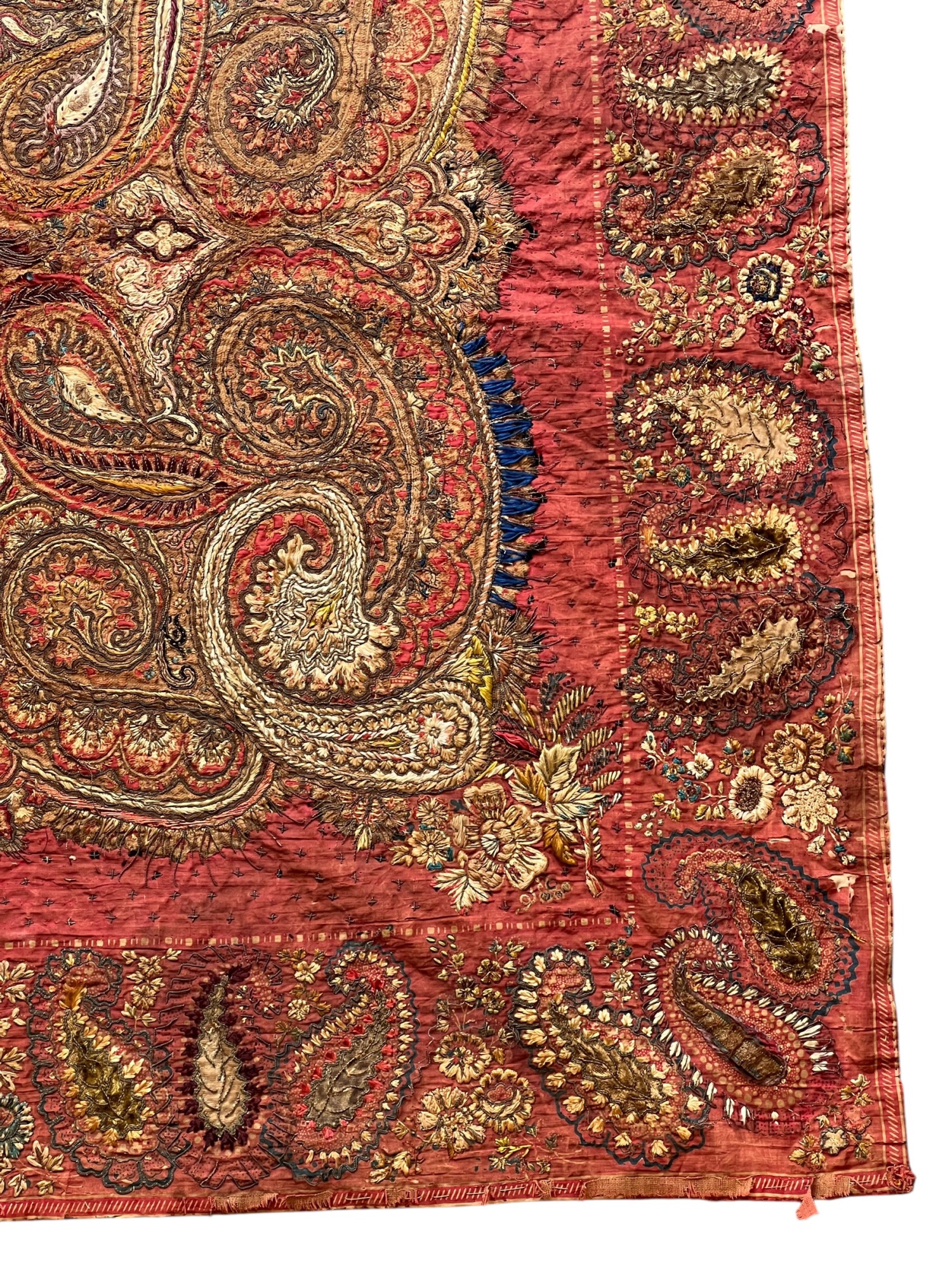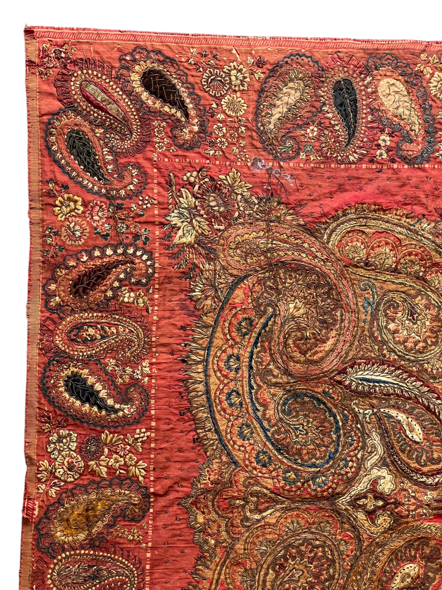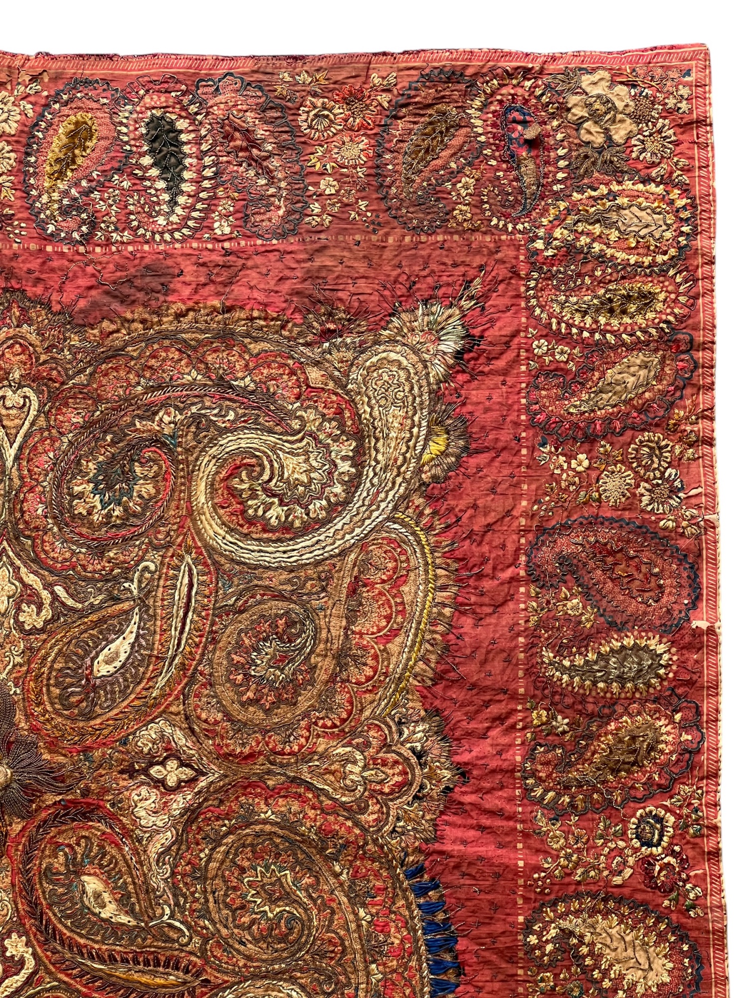 A beautifully intricate antique Persian paisley embroidery on red linen. 36 x 38 inches. Condition: Stains, some losses. Please see photos. Temp No 2568