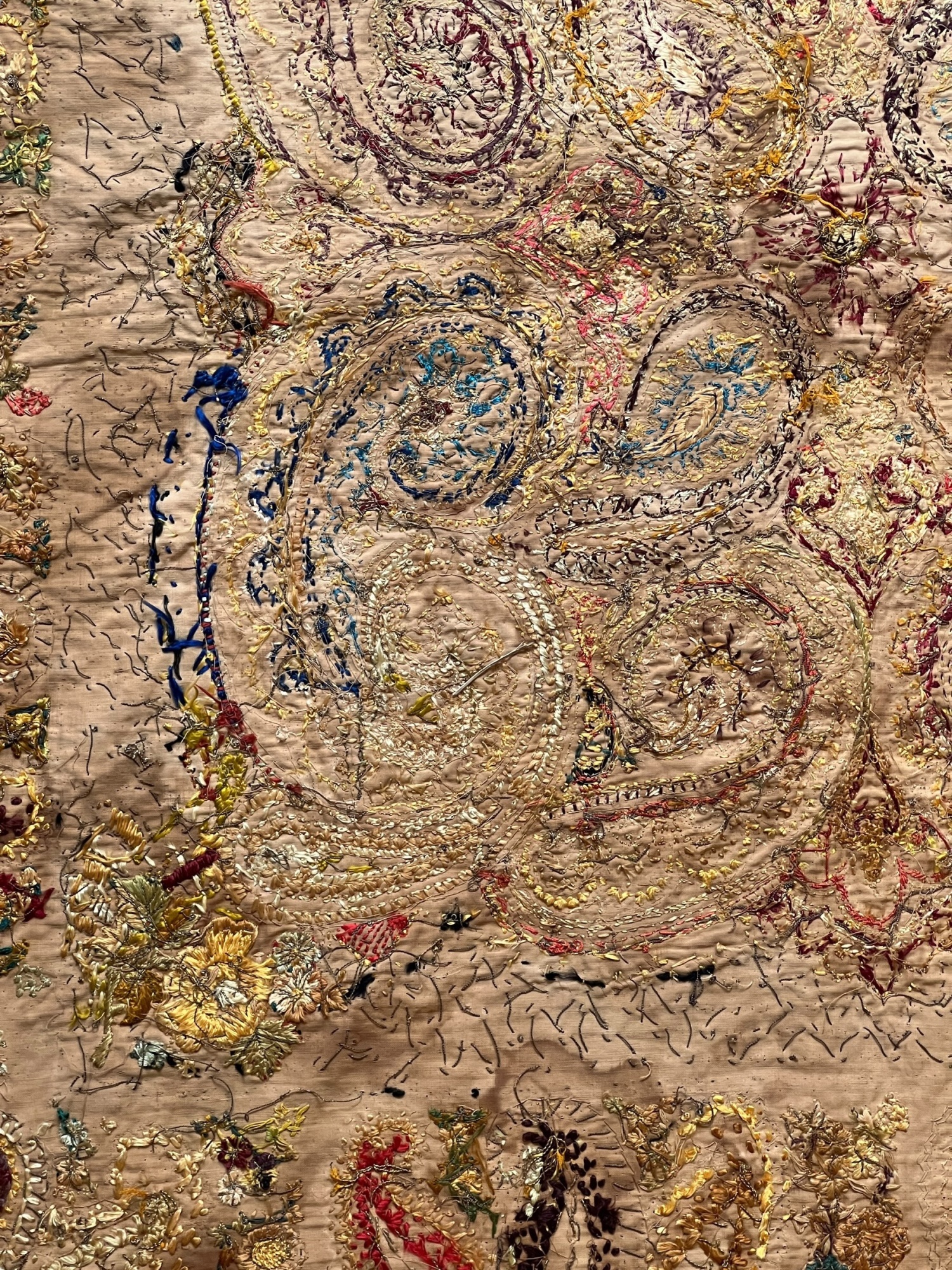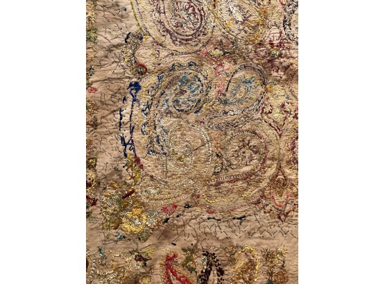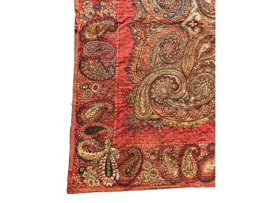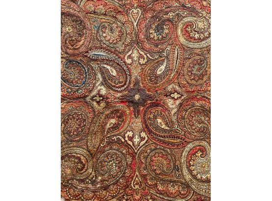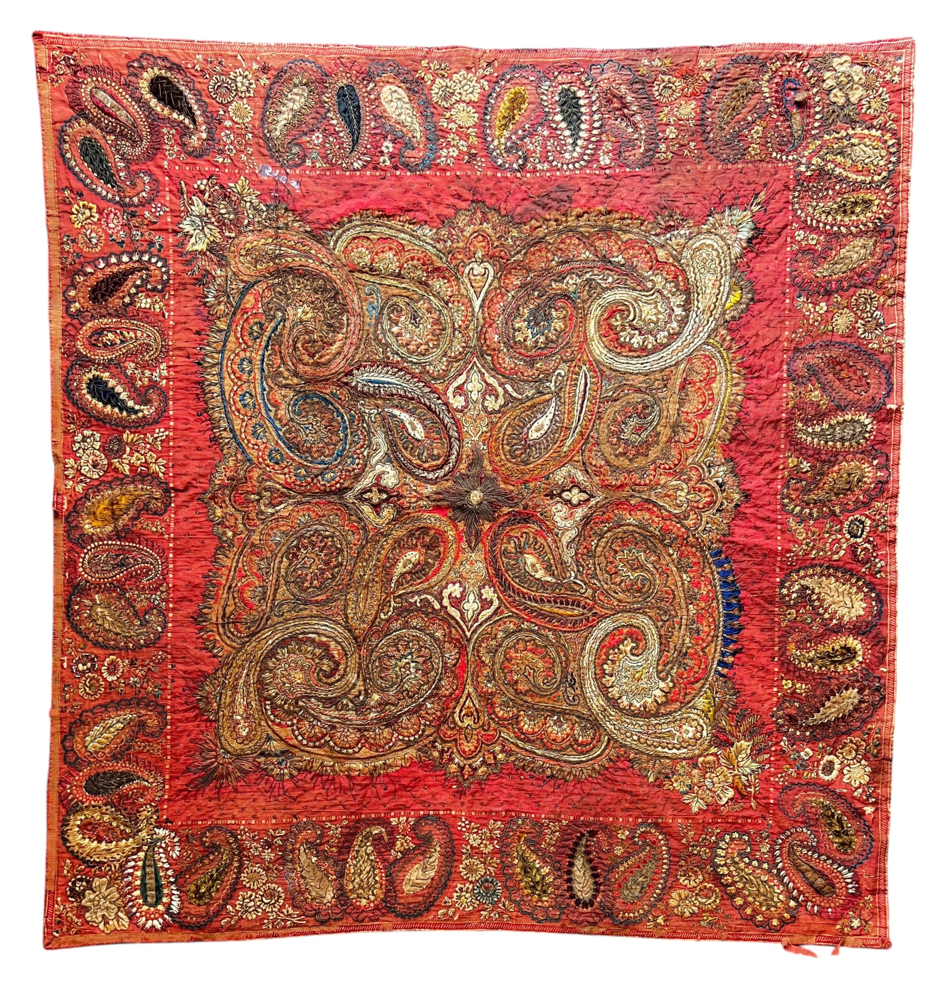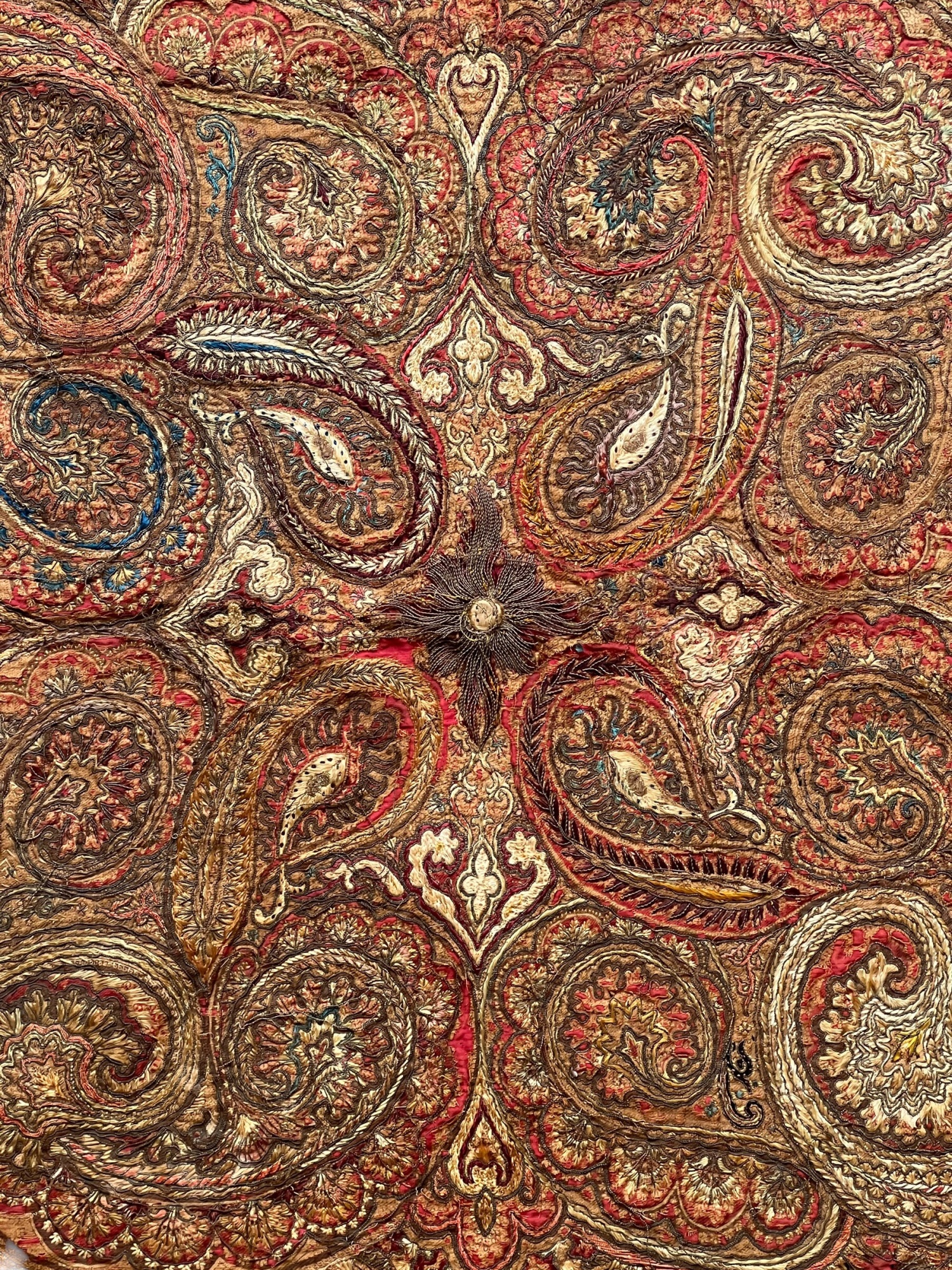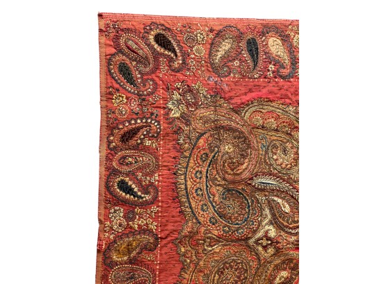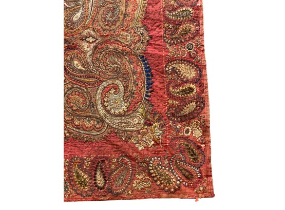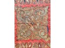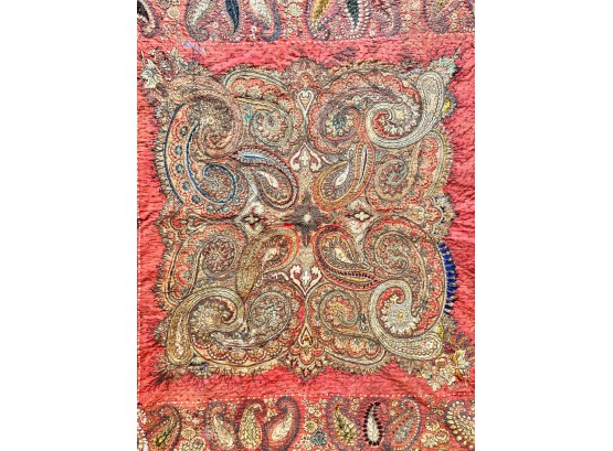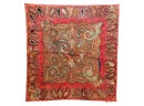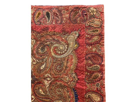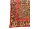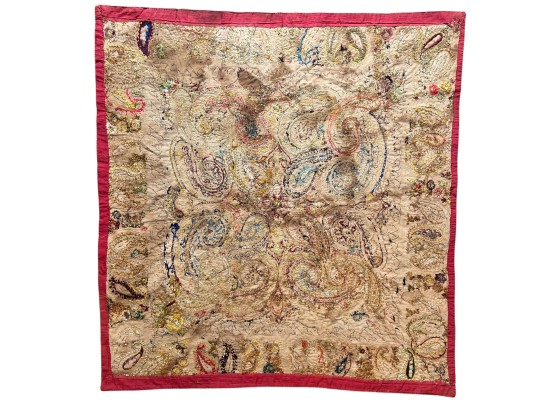 A beautifully intricate antique Persian paisley embroidery on red linen. 36 x 38 inches. Condition: Stains, some losses. Please see photos. Temp No 2568