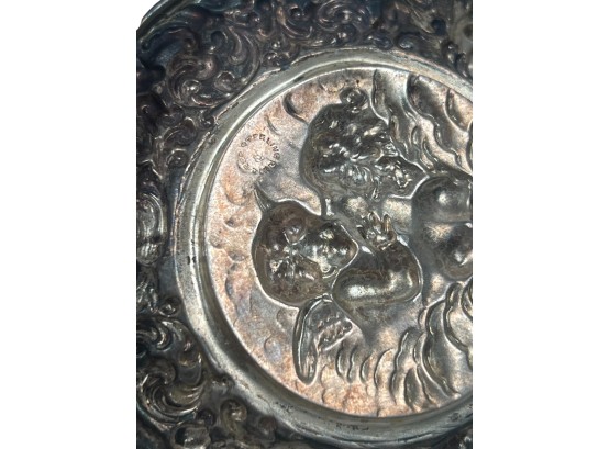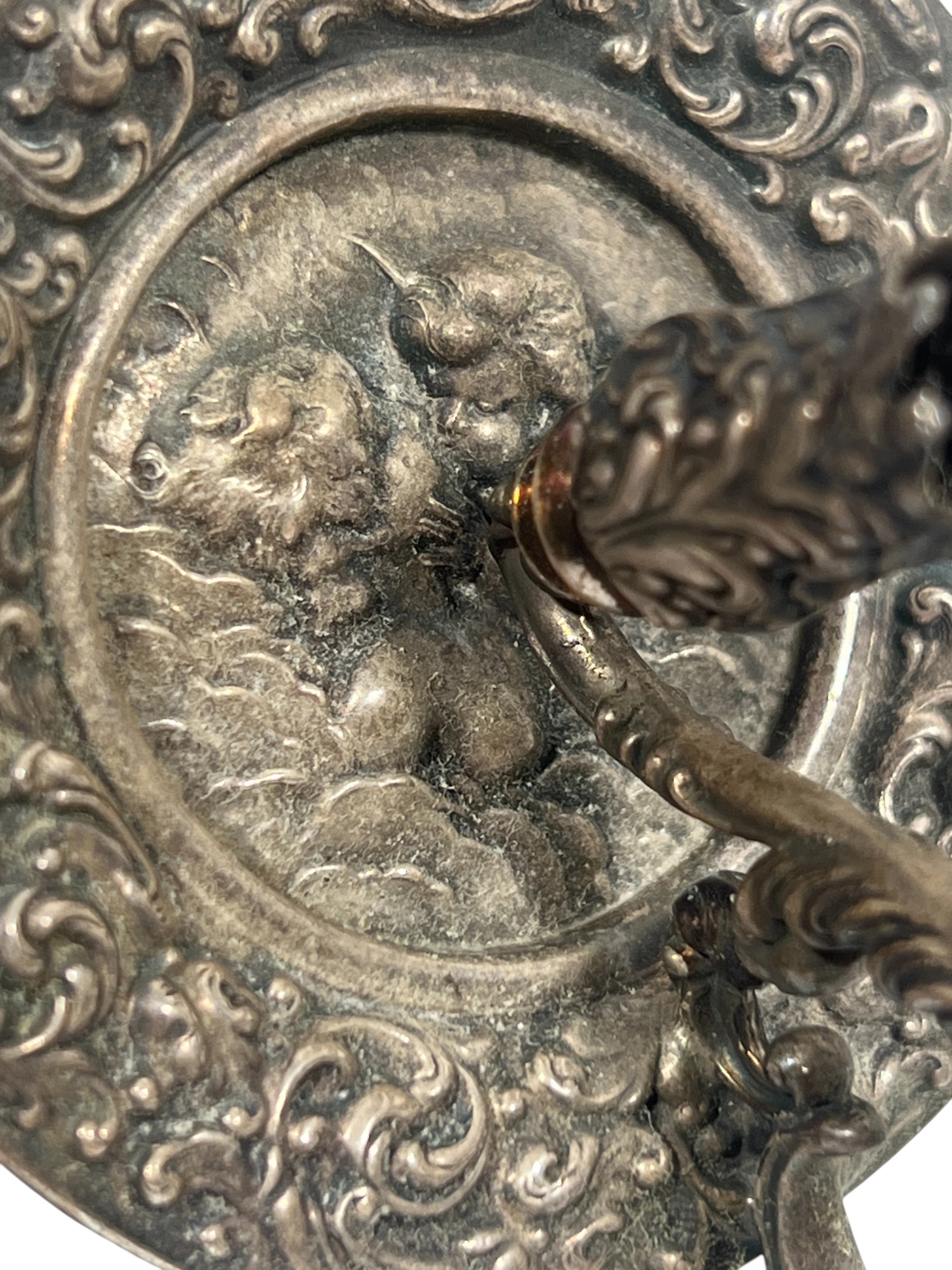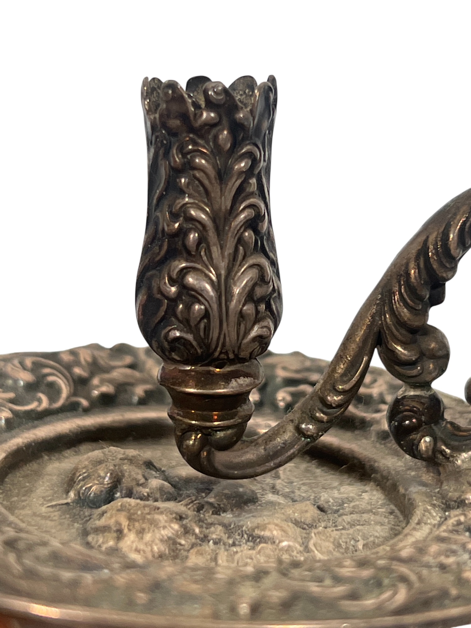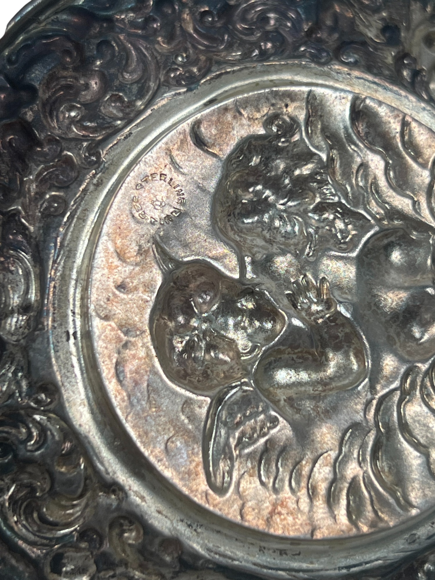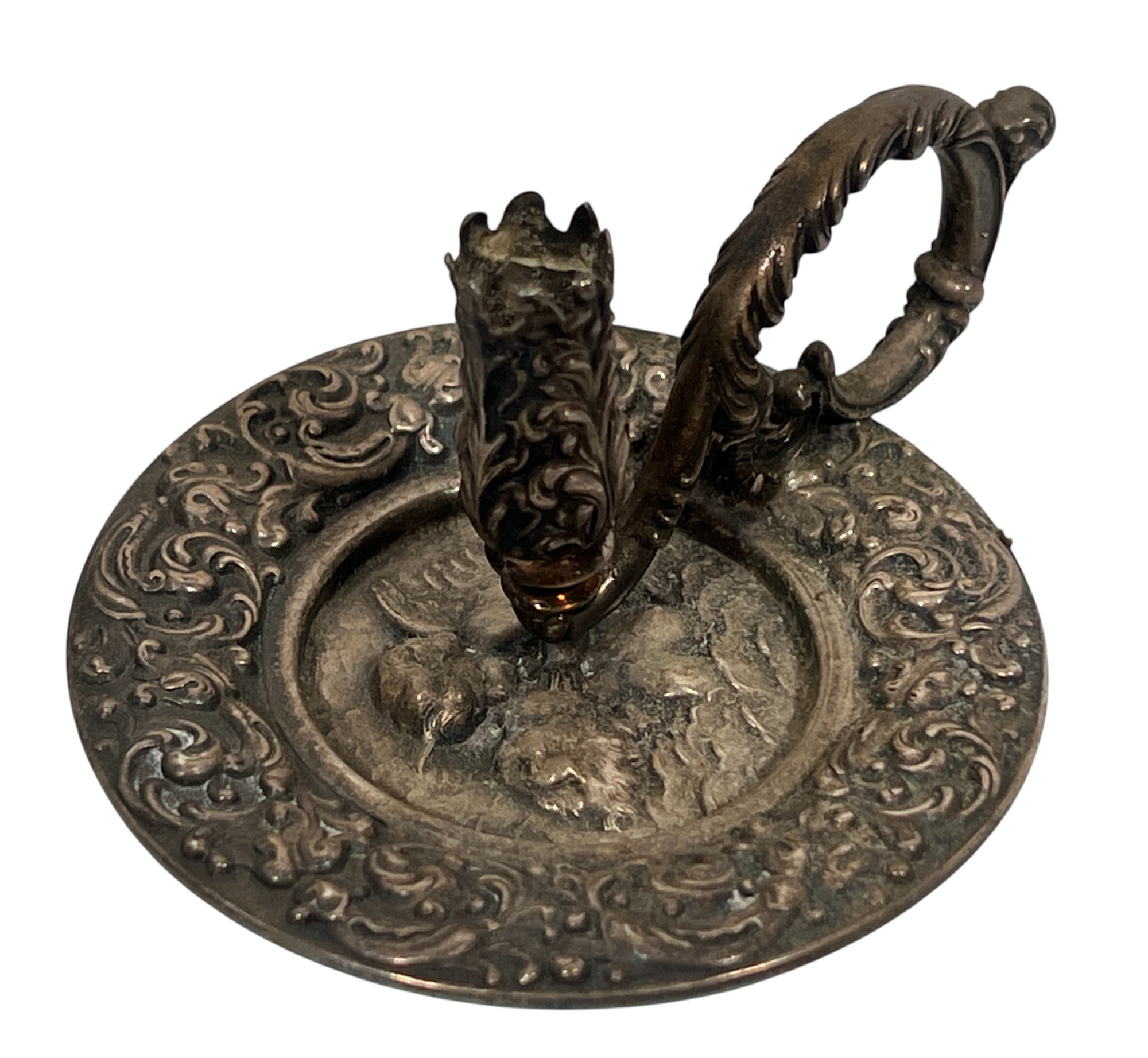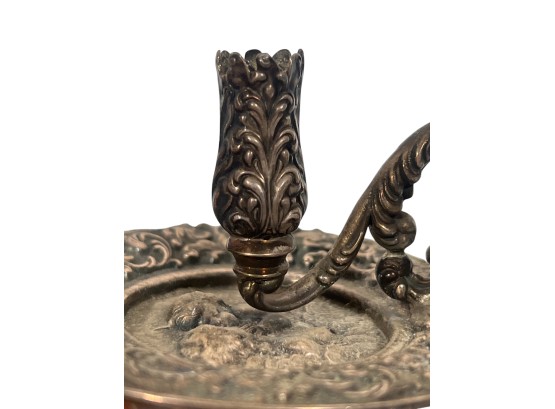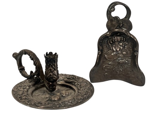 Miniature Art Nouveau sterling crumb tray with lotus motif and chamberstick with cherubs. 1 1/4 x 3 inches. 1.16 ozt. Condition: Good. Temp No 8590